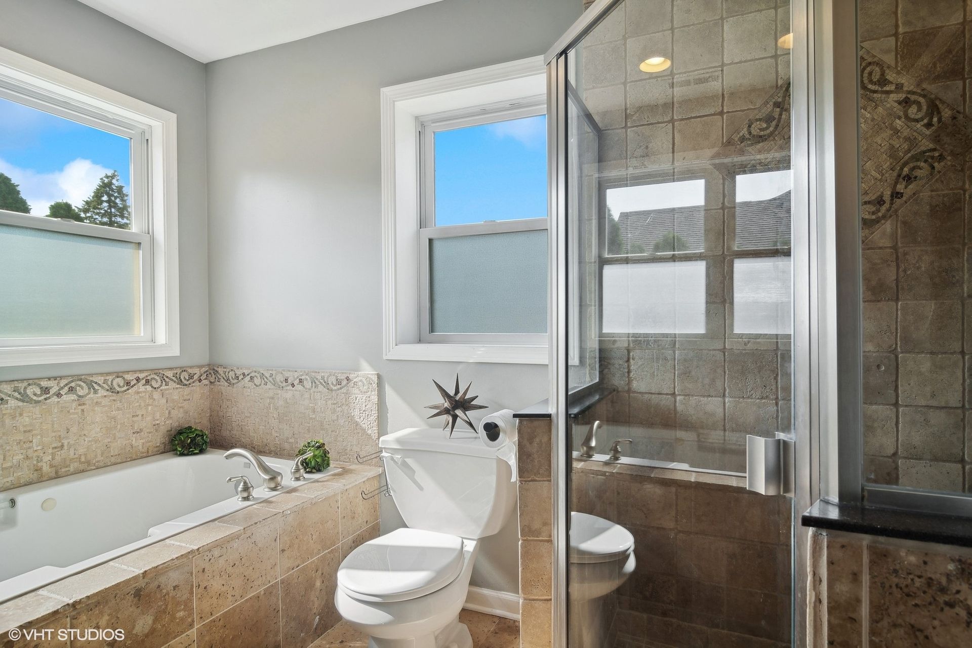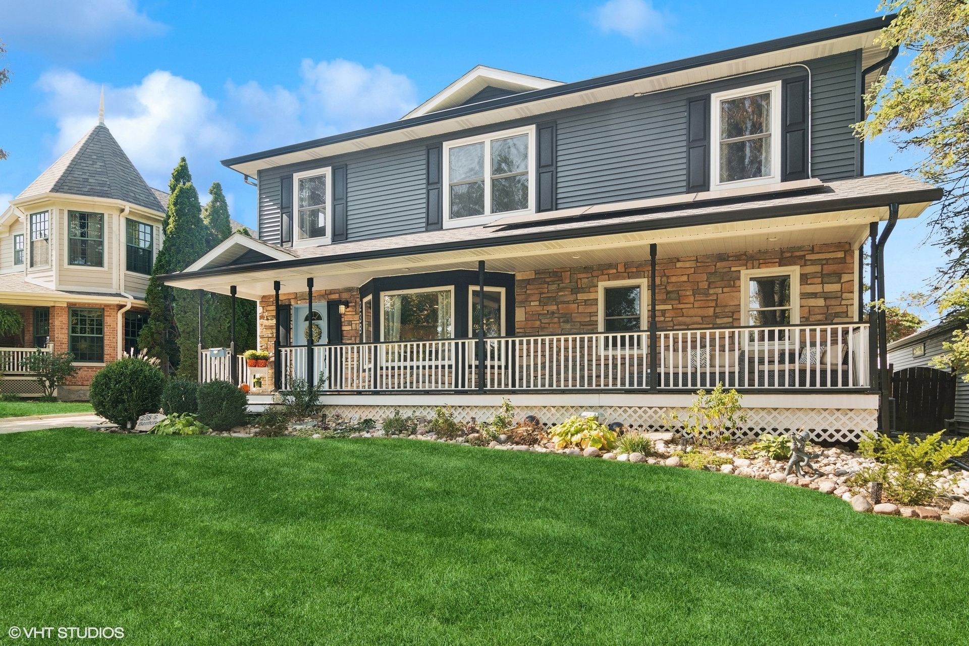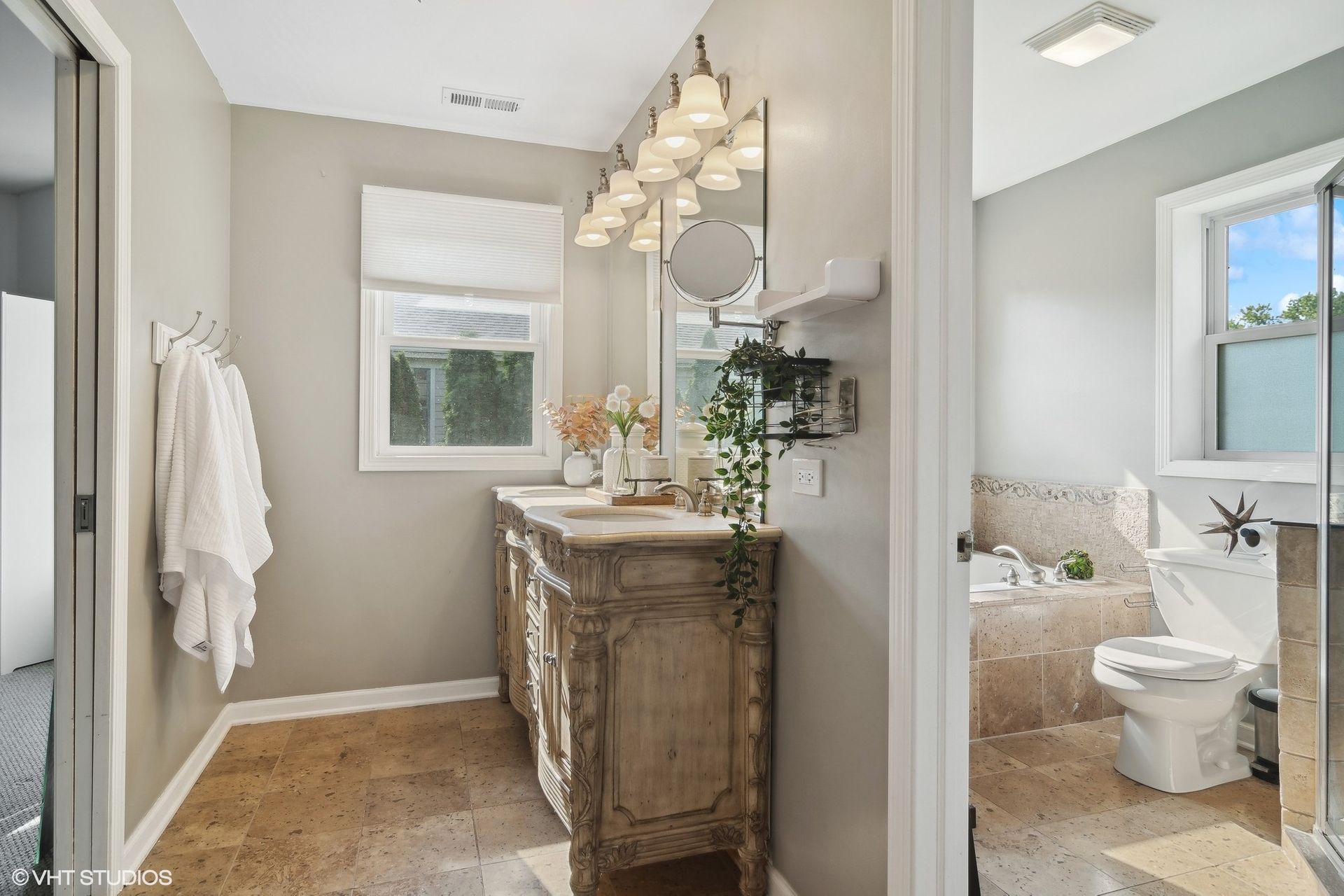 The three full bathrooms are fitted with modern fixtures and finishes. The half-bathroom provides additional convenience.