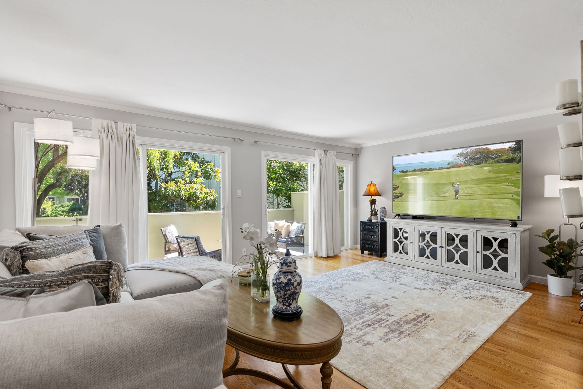 - Elongated, sunny patio with views of lush lawns and canopied trees and private access to park-likes setting