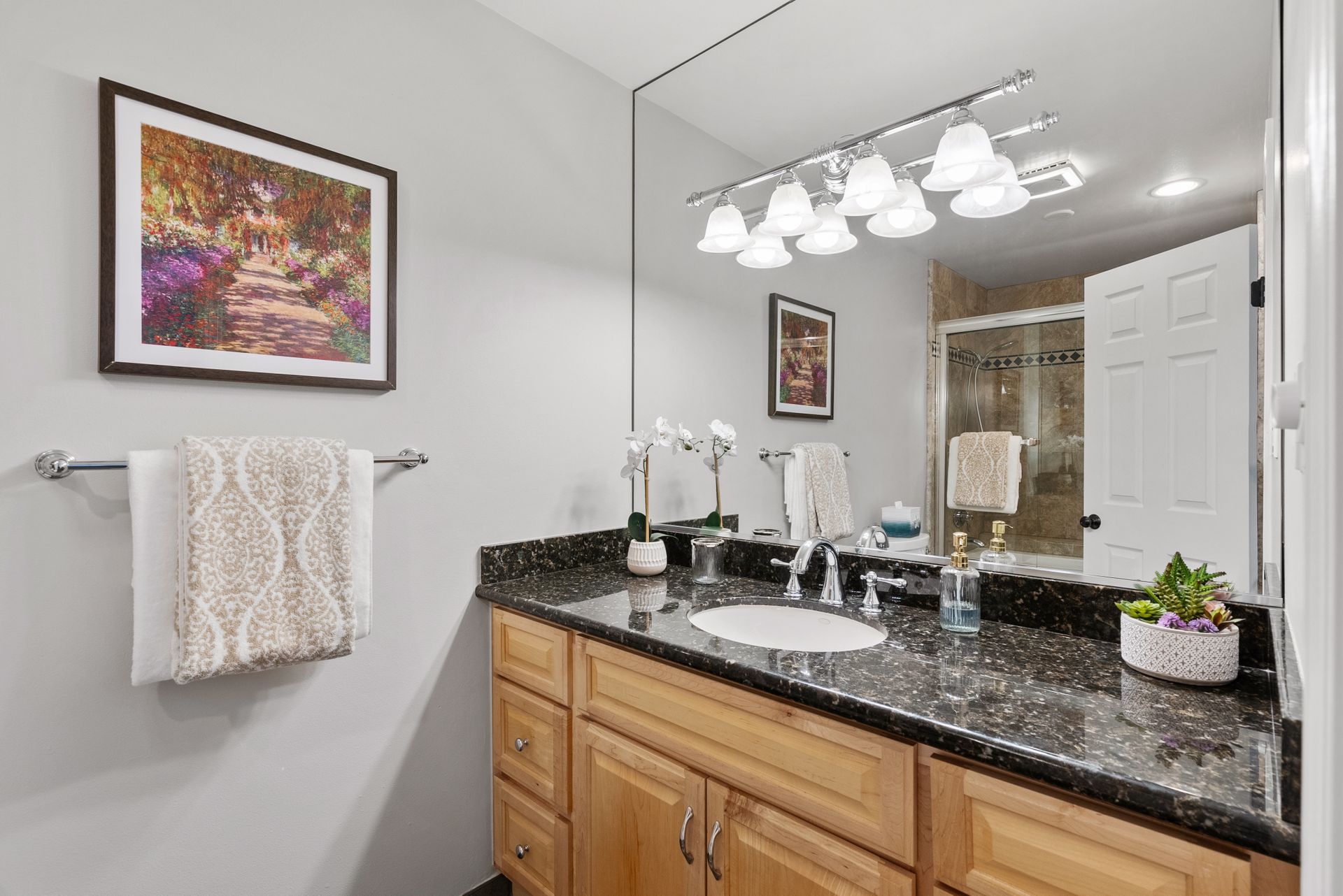 As you ascend to the upper level, a bright skylight illuminates the way to the 3 generously sized bedrooms. The primary suite features a private balcony overlooking the front of the complex and a luxurious jetted tub for indulging in moments of relaxation. Large windows in each room highlight the surrounding serenity the unit is nestled among and the lush community landscaping. A short distance is the community pool with endless opportunities for enjoyment during California’s gorgeous summer months.