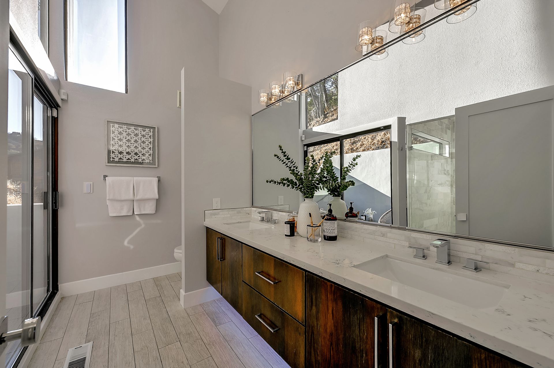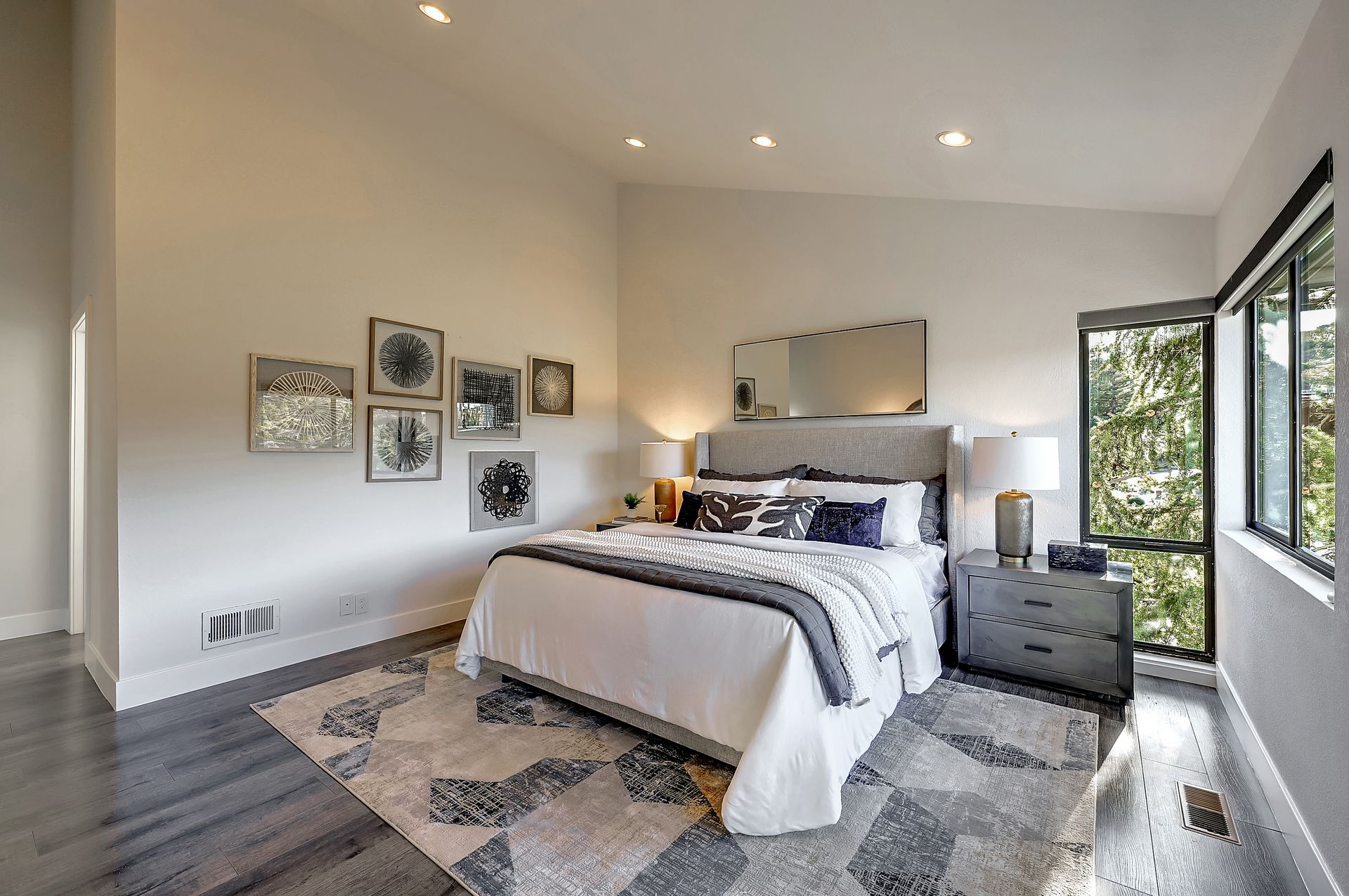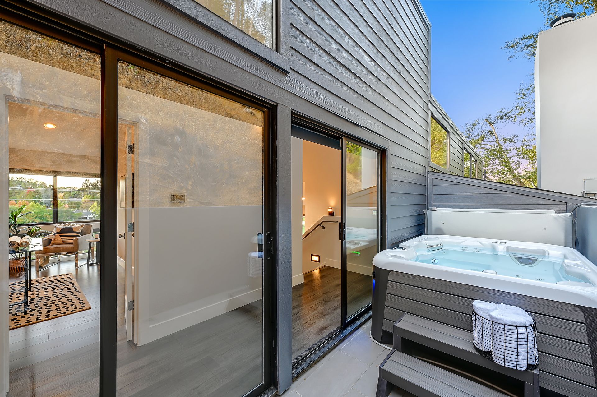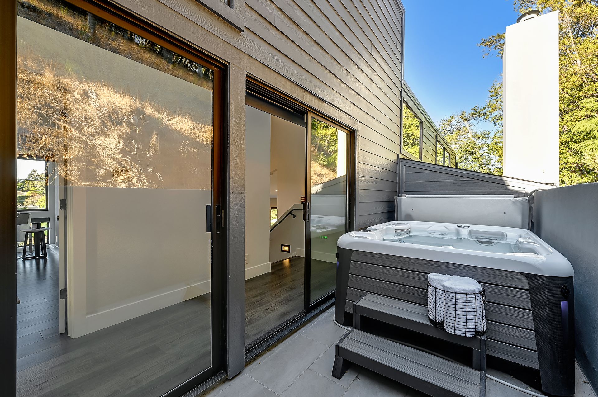 The open livable space, spacious deck and well-appointed gourmet kitchen is ideal for entertaining. The split-level configuration of the four bedrooms, with two bedrooms on each level, nicely separate the guest bedrooms from the upstairs owner's suite & office, effectively creating a private oasis which includes a walk-in closet, a large primary bath with an oversized shower, a private balcony and a Hotsprings saltwater hot tub. All three bathrooms have been updated with high-end finishes, under cabinet lighting and beautiful tile work.