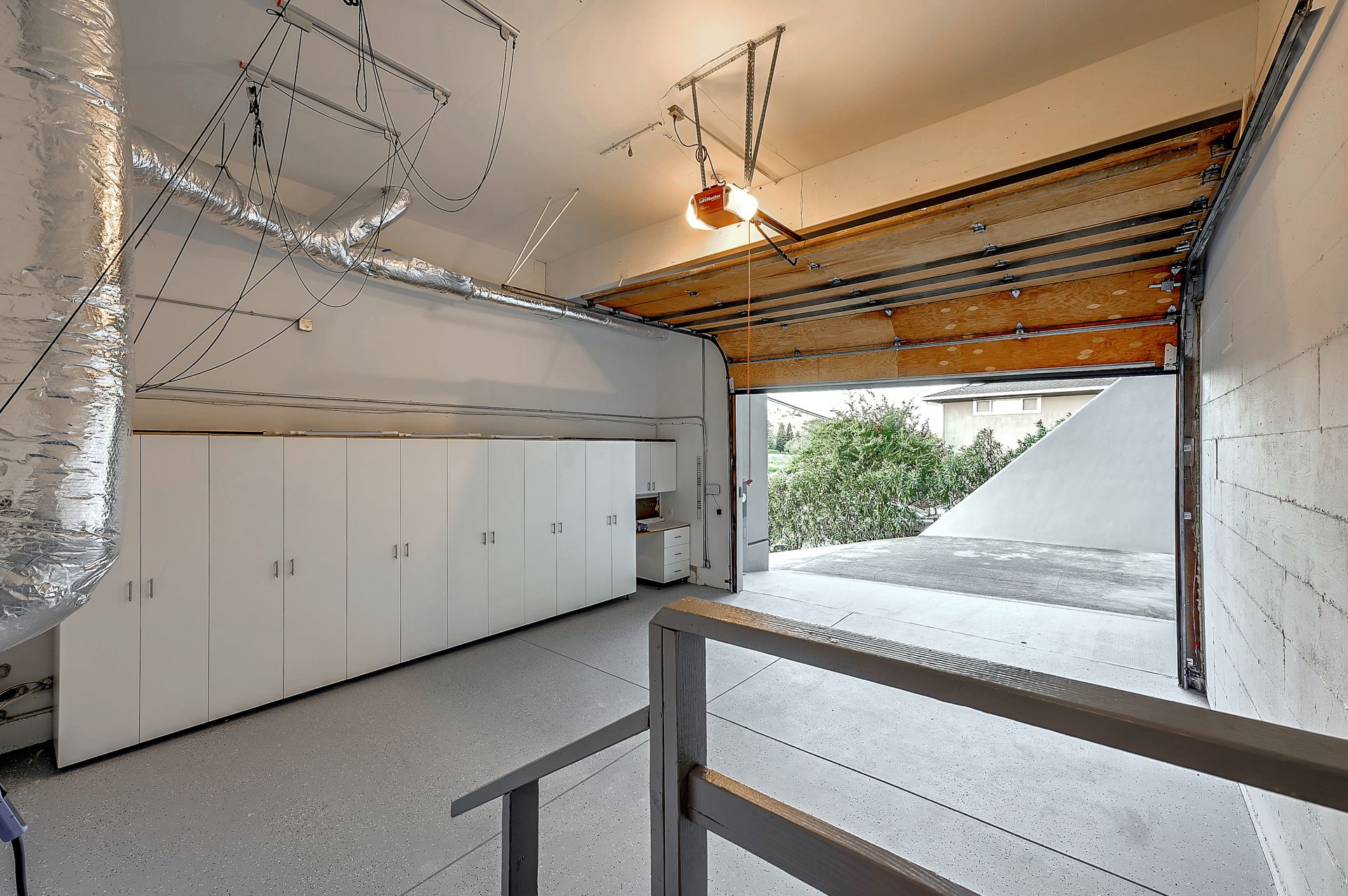 The oversized two-car garage has built-in cabinets, a work bench, three bike lifts, an E/V charger, extra storage and is well suited for either a golf simulator, a car lift, an indoor basketball hoop, home gym or work studio.