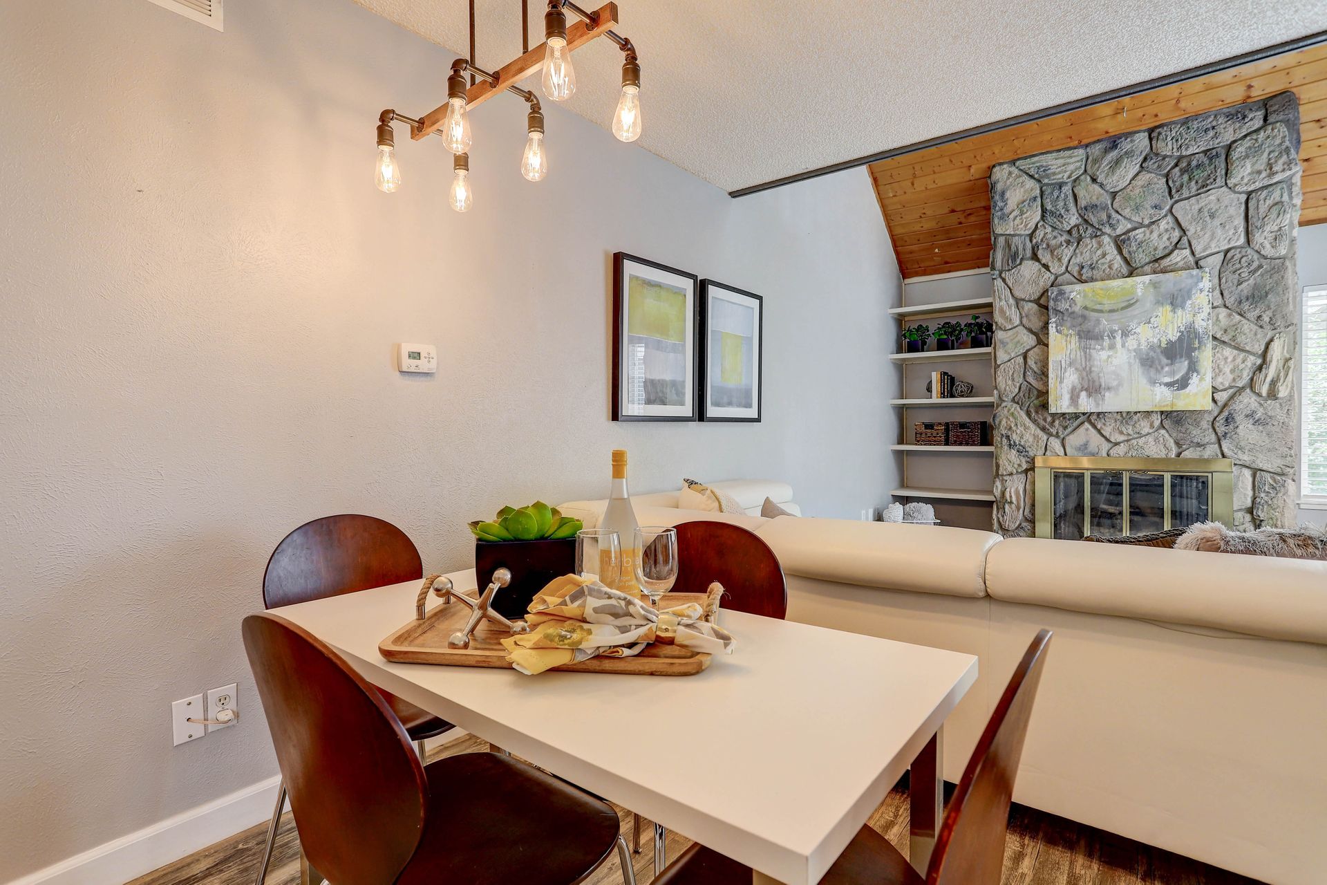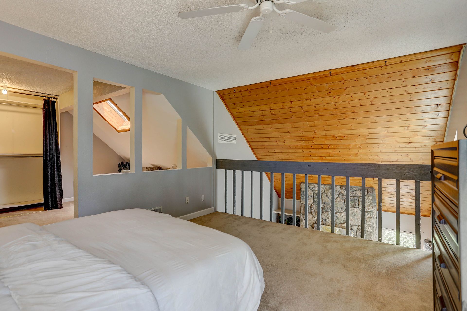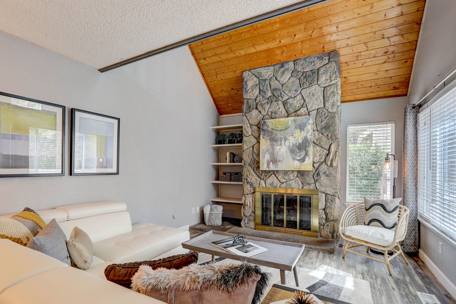 Upon entering, you immediately notice the open floor plan, wood tongue & groove vaulted ceiling, and floor to ceiling natural stone, gas fireplace. The kitchen is drenched in light with a sliding door that opens to a private patio. The main floor also features a bedroom with walk-in closet, a full bath, storage closets, and space for your stackable washer & dryer.