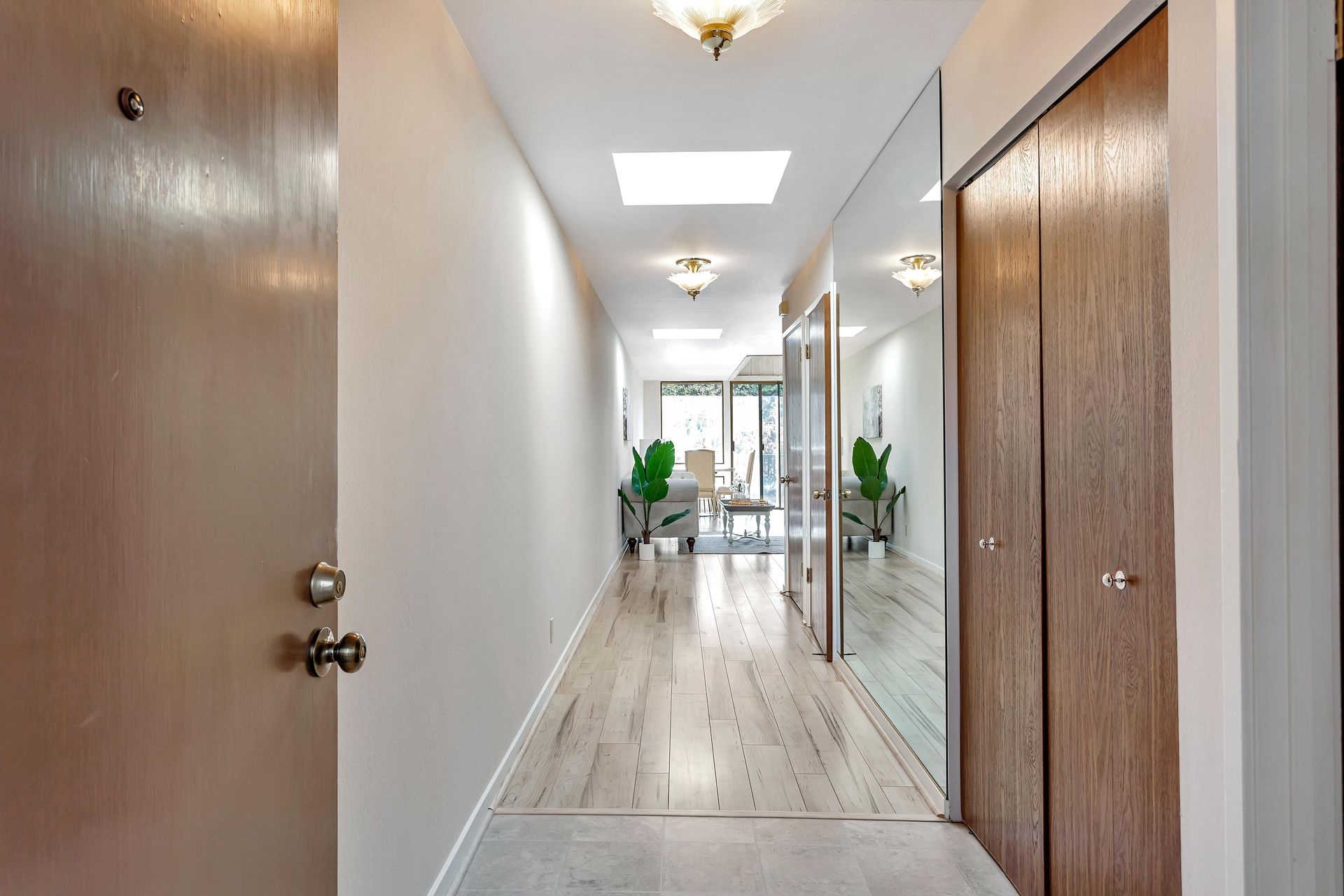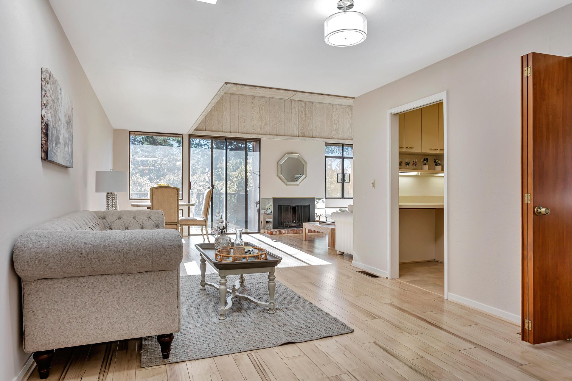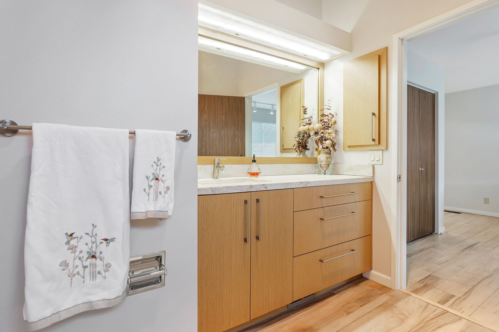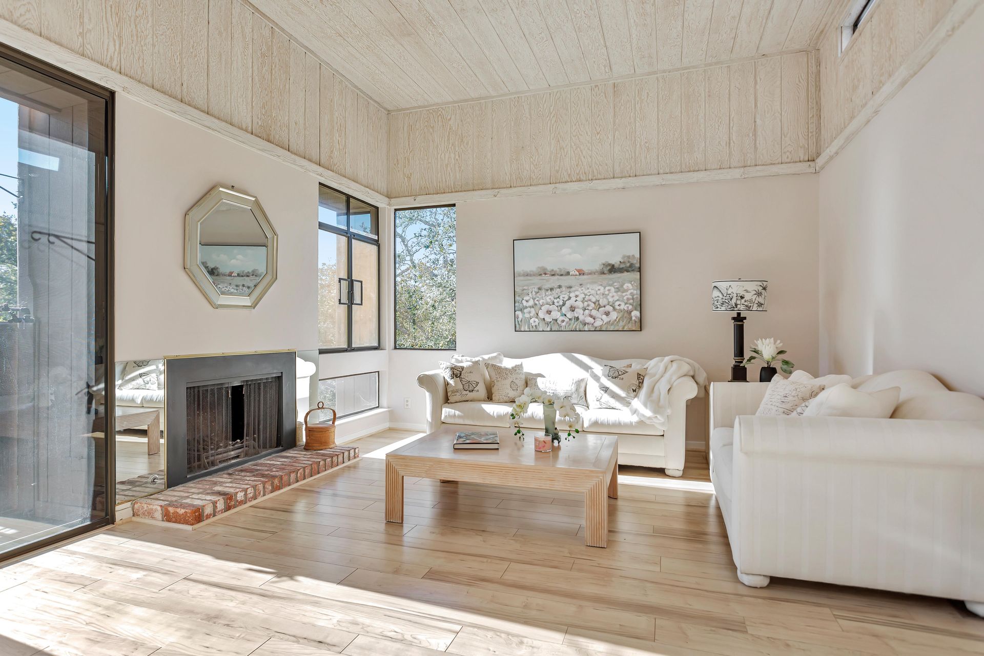 This highly desirable, end unit model in the High Meadow is conveniently located with easy access to Carmel, the South Coast and the commuter corridors to the north. Nestled in the forest, the freshly painted condo offers two generously sized bedrooms and two full baths. The primary suite has a huge walk-in closet, sink vanity and a second closet with convenient shelving for extra storage. The second bedroom, also a suite, is a versatile space which can ideally serve as a second bedroom, or a guest room/home office. The living room dining space is huge with high ceilings offering a sense of space. There is a brick wood-burning fireplace for those cozy Carmel nights. The deck overlooking the greenbelt is the ideal spot for a café in the mornings. This complex offers plenty of guest parking, a bank of three open spaces just outside the condo and has a detached single-car garage. There are inviting walking areas to explore, tennis courts/pickle ball courts and a lovely pool to relax and enjoy. Welcome home to The Ridge a PUD in the High Meadows.