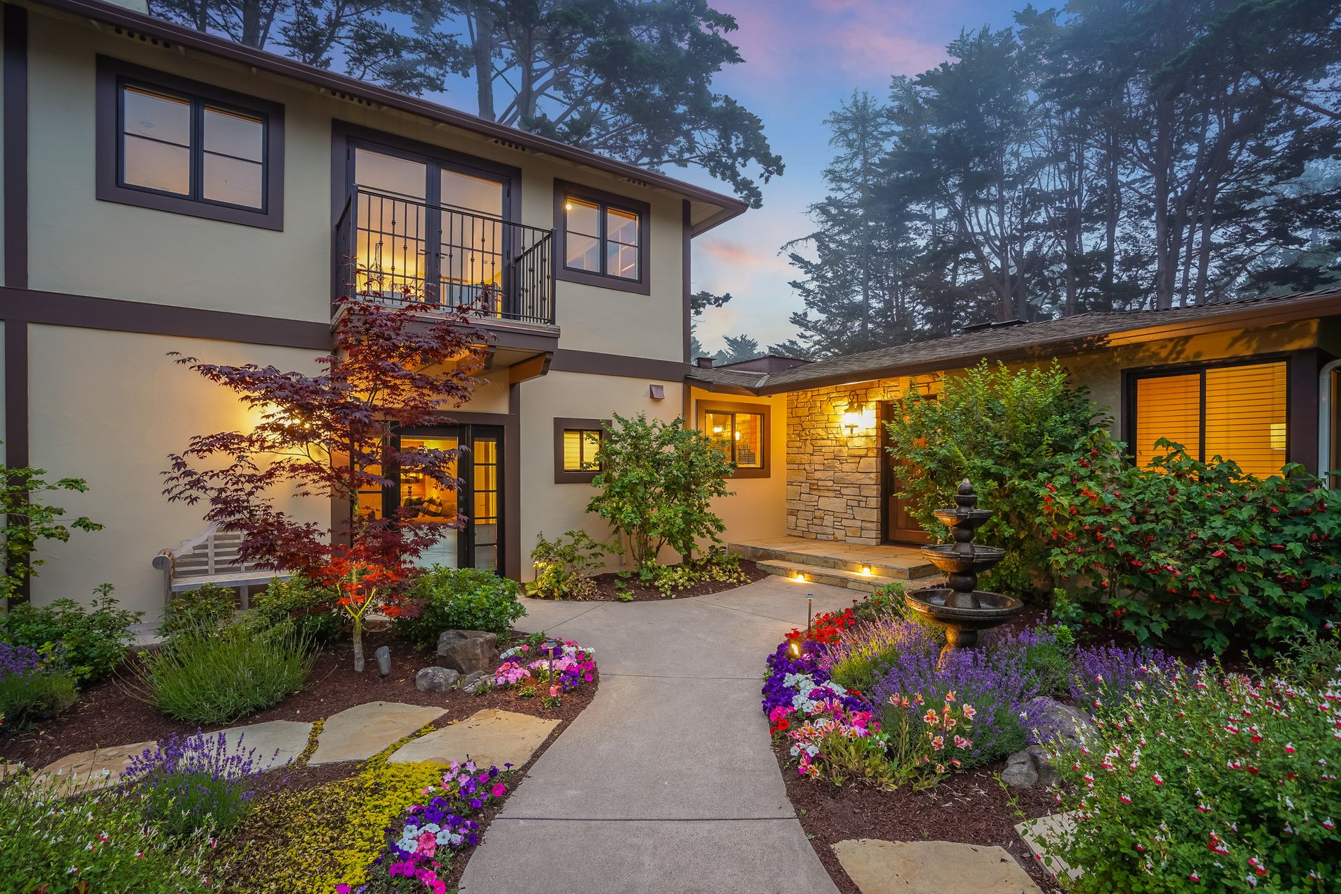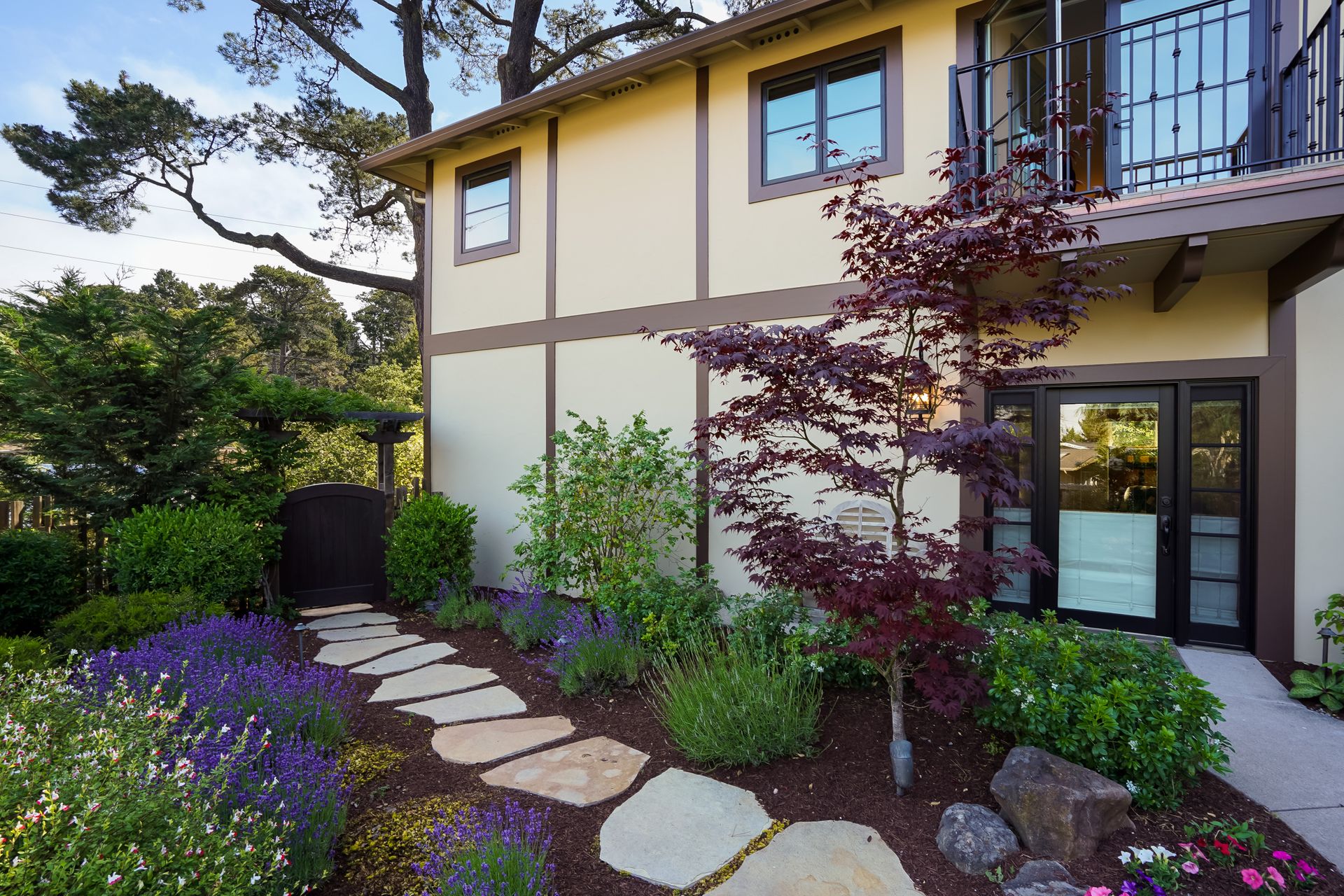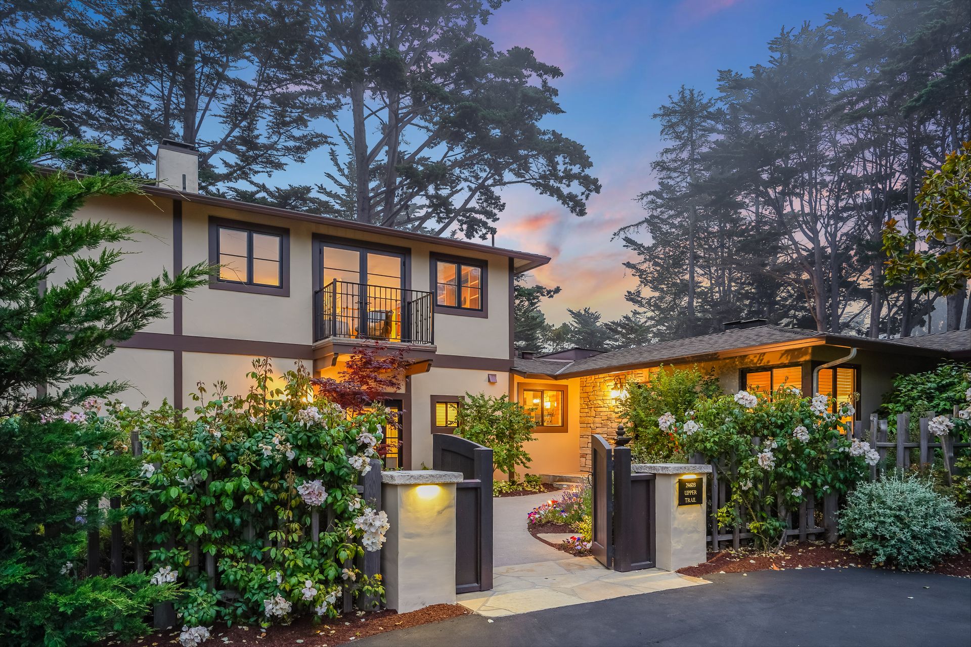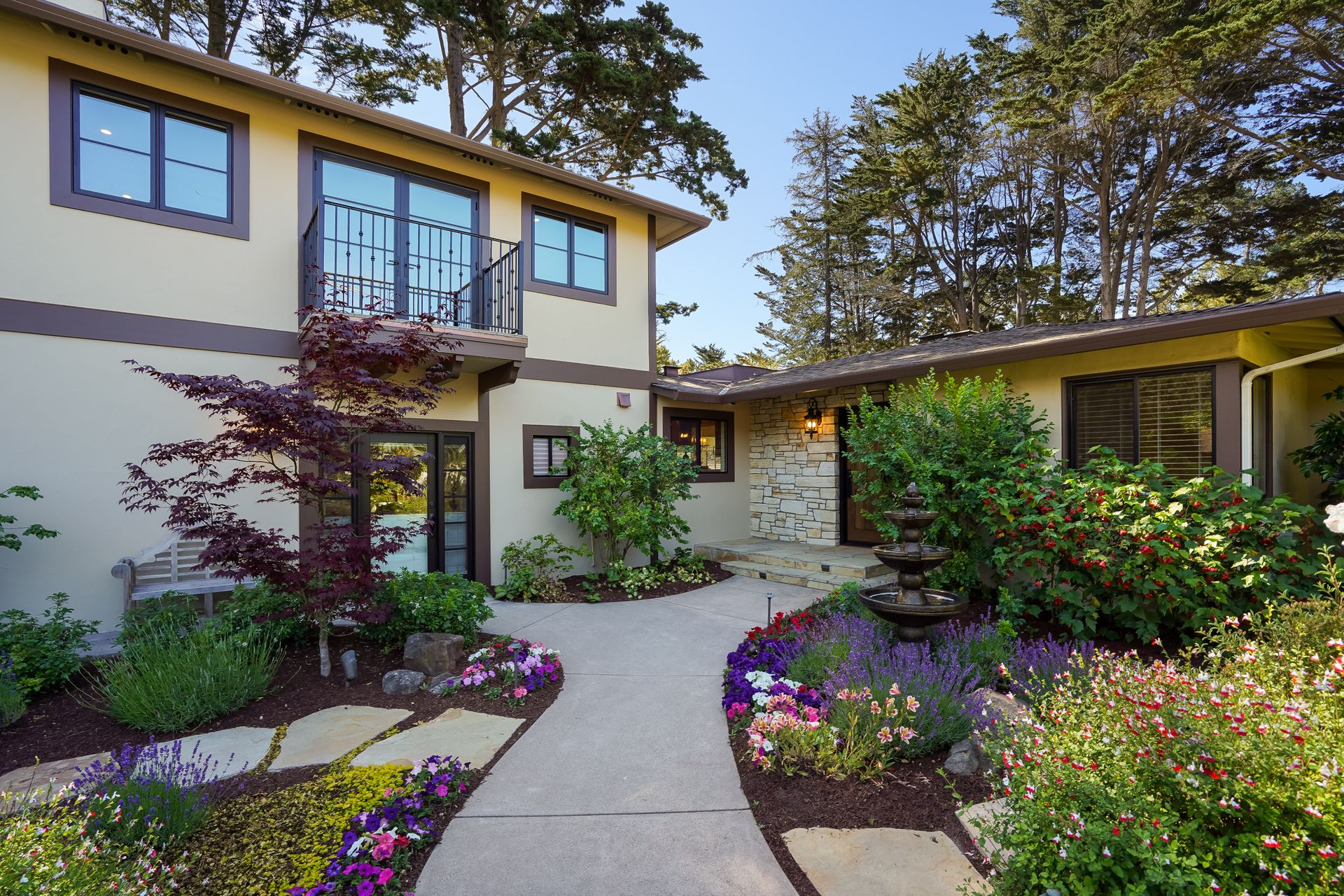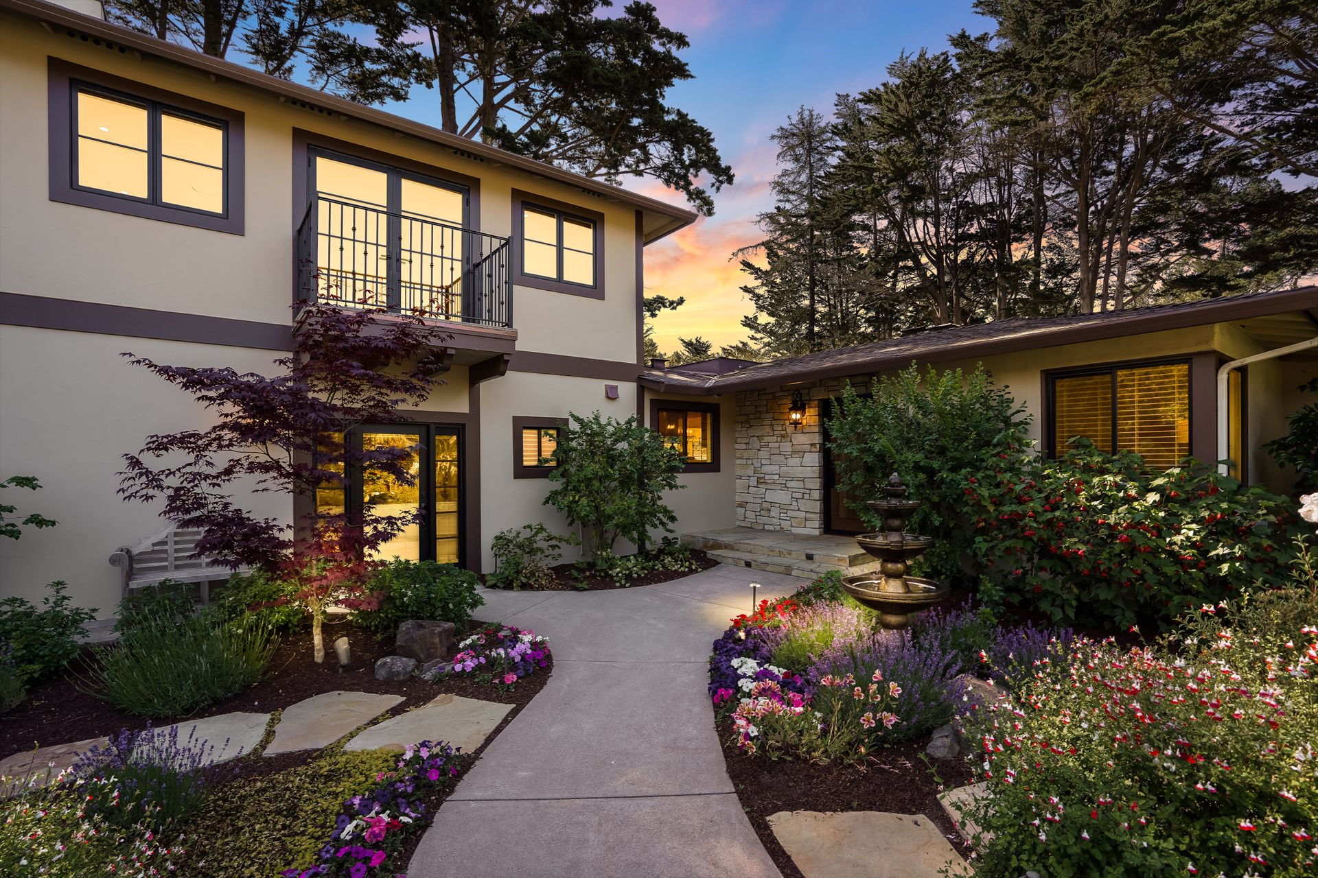 STUNNING, newly remodeled Carmel home with a magical garden only moments to downtown. The lush garden features a flowing fountain that draws you in. Freshly painted inside and out, this three bedroom, three bath home with an office is situated on approximately one-third of an acre and has numerous upgrades. Upgrades include a beautiful kitchen remodel with hickory cabinets, butler's pantry, stainless steel appliances, six-burner cooktop and porcelain tile floors. The private upstairs primary suite with approximately 800 square feet features a luxurious spa bathroom and has been beautifully redesigned and offers a peek of the ocean. It boasts a custom wrought-iron Juliet balcony and multiple closets including a shoe closet and natural hickory bookshelves. Additional features include a spacious living room with wood floors, large stone fireplace, light-filled dining area with skylights and a cozy family room with a separate entrance. Additional upgrades include dual pane windows and newer roof and gutters. A large two-car garage with ample parking features custom epoxy floors and an abundance of storage cabinets, a homeowner’s dream. Enjoy a nearly 800 square foot Trex deck and outdoor Carmel Stone fireplace in the backyard. The sunsets and sunrises are mesmerizing.