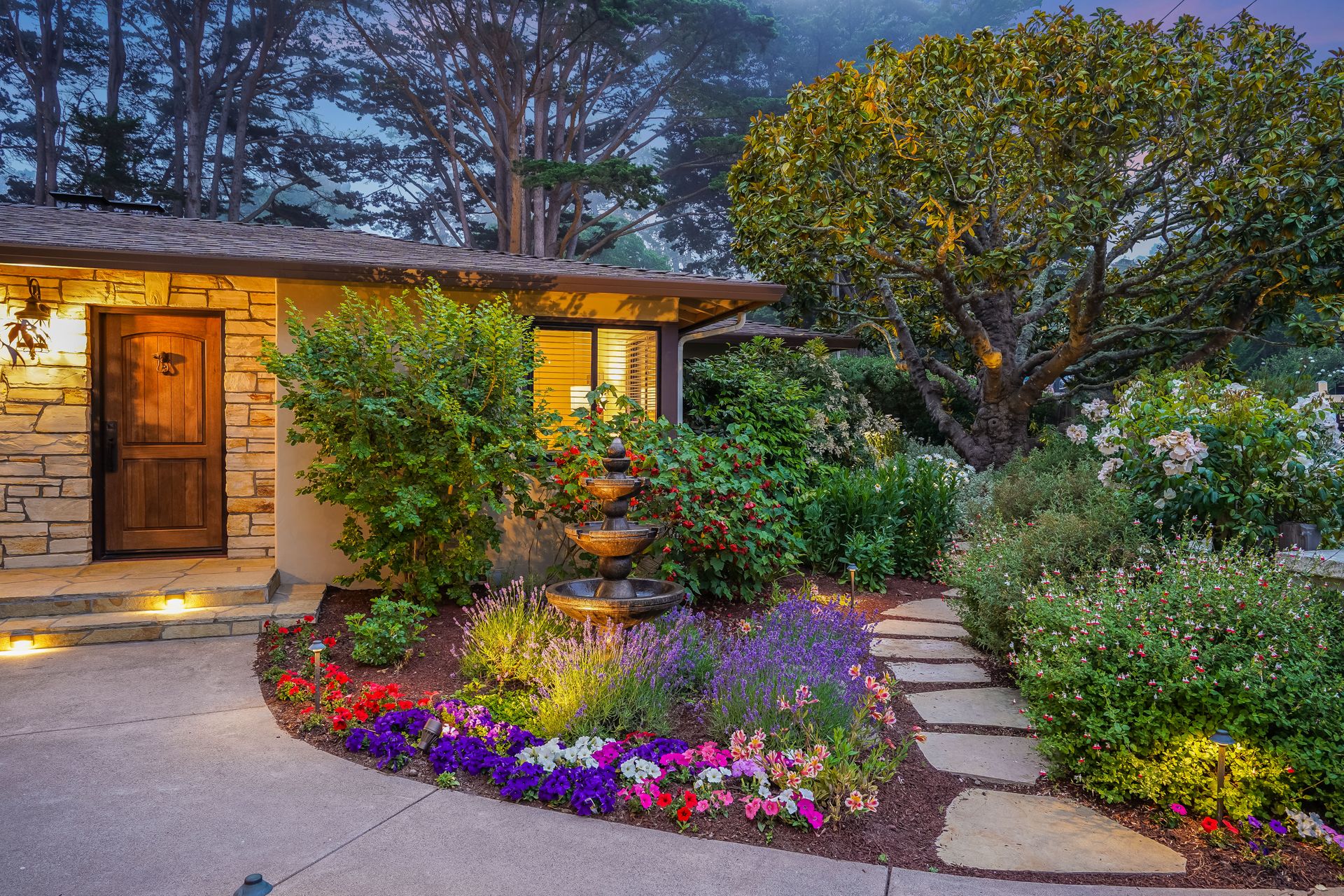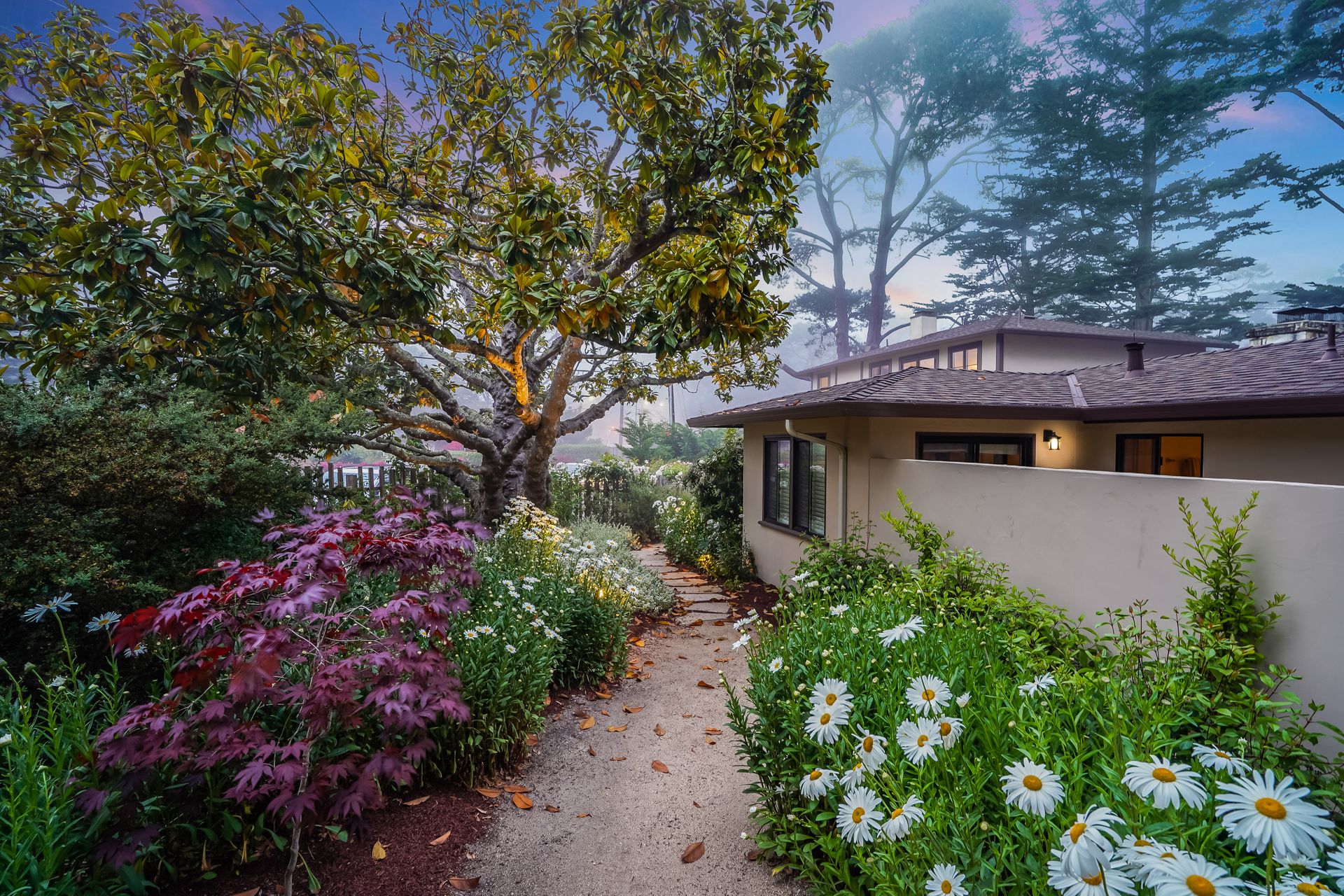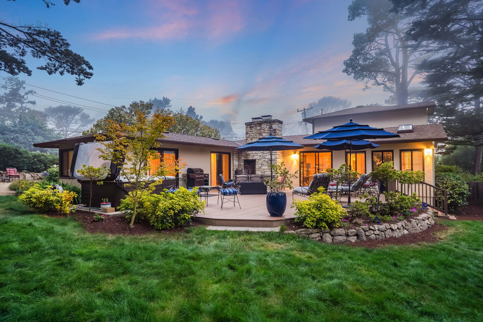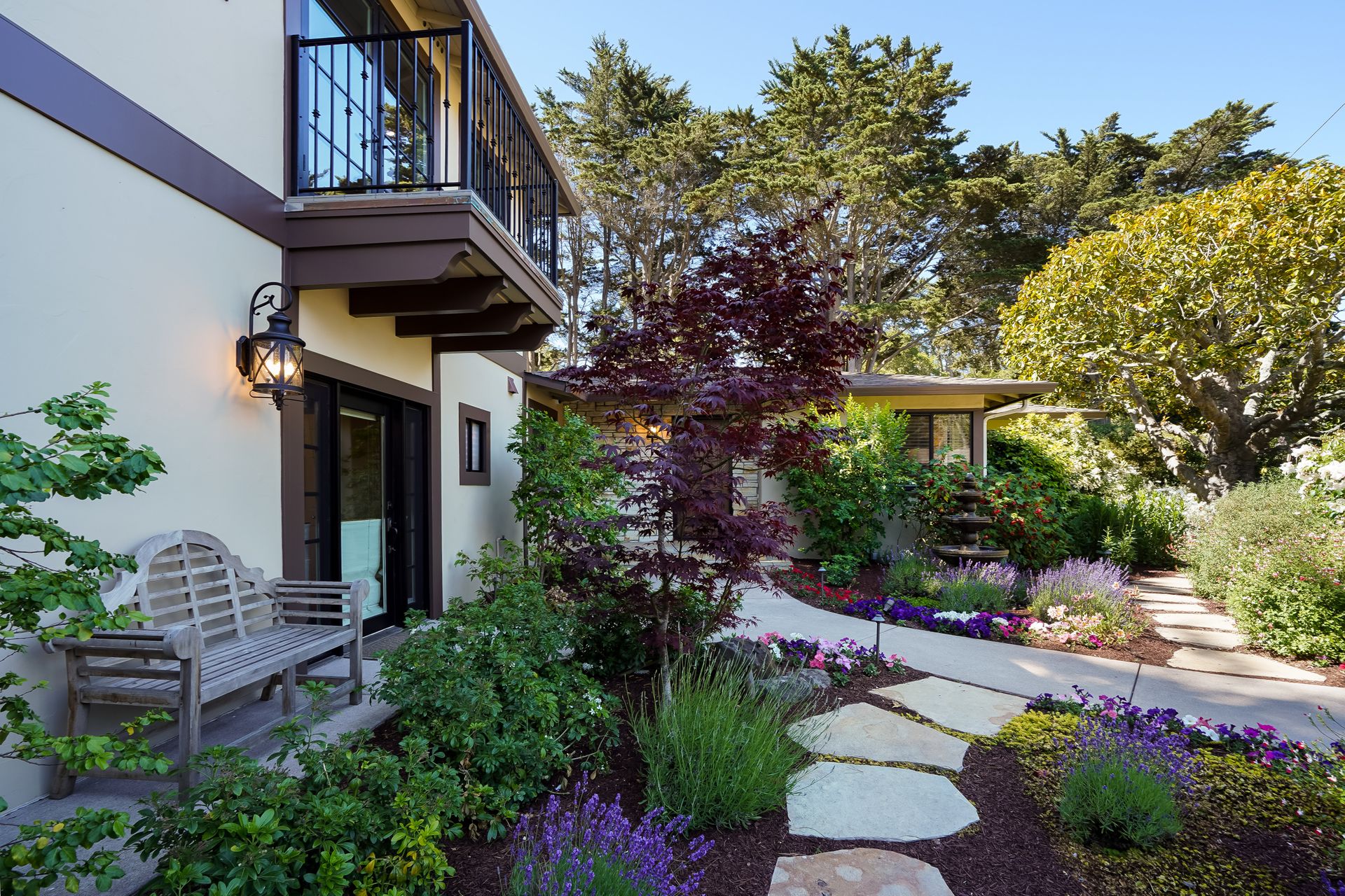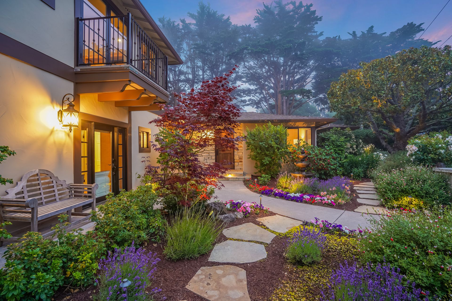 STUNNING, newly remodeled Carmel home with a magical garden only moments to downtown. The lush garden features a flowing fountain that draws you in. Freshly painted inside and out, this three bedroom, three bath home with an office is situated on approximately one-third of an acre and has numerous upgrades. Upgrades include a beautiful kitchen remodel with hickory cabinets, butler's pantry, stainless steel appliances, six-burner cooktop and porcelain tile floors. The private upstairs primary suite with approximately 800 square feet features a luxurious spa bathroom and has been beautifully redesigned and offers a peek of the ocean. It boasts a custom wrought-iron Juliet balcony and multiple closets including a shoe closet and natural hickory bookshelves. Additional features include a spacious living room with wood floors, large stone fireplace, light-filled dining area with skylights and a cozy family room with a separate entrance. Additional upgrades include dual pane windows and newer roof and gutters. A large two-car garage with ample parking features custom epoxy floors and an abundance of storage cabinets, a homeowner’s dream. Enjoy a nearly 800 square foot Trex deck and outdoor Carmel Stone fireplace in the backyard. The sunsets and sunrises are mesmerizing.