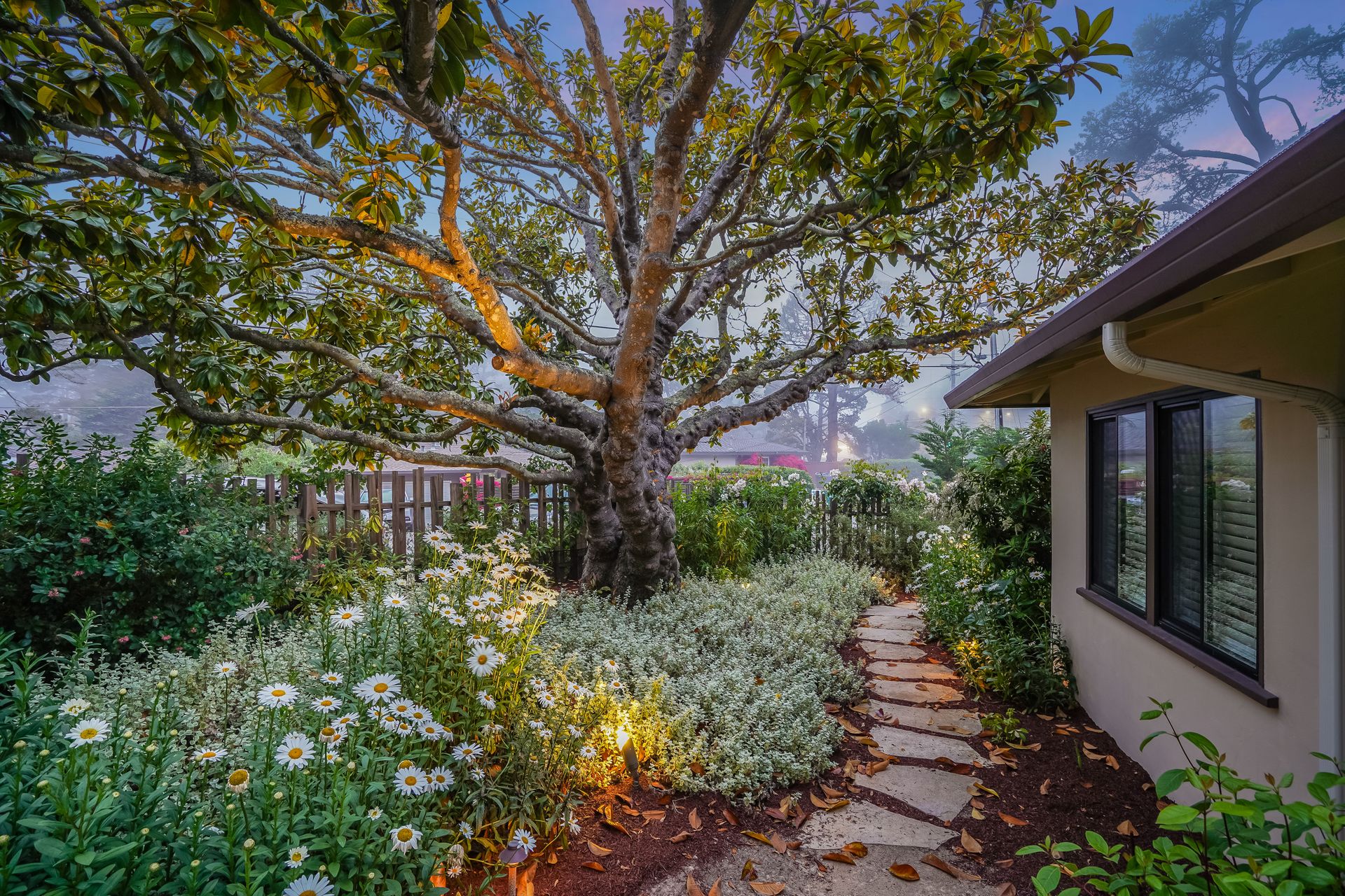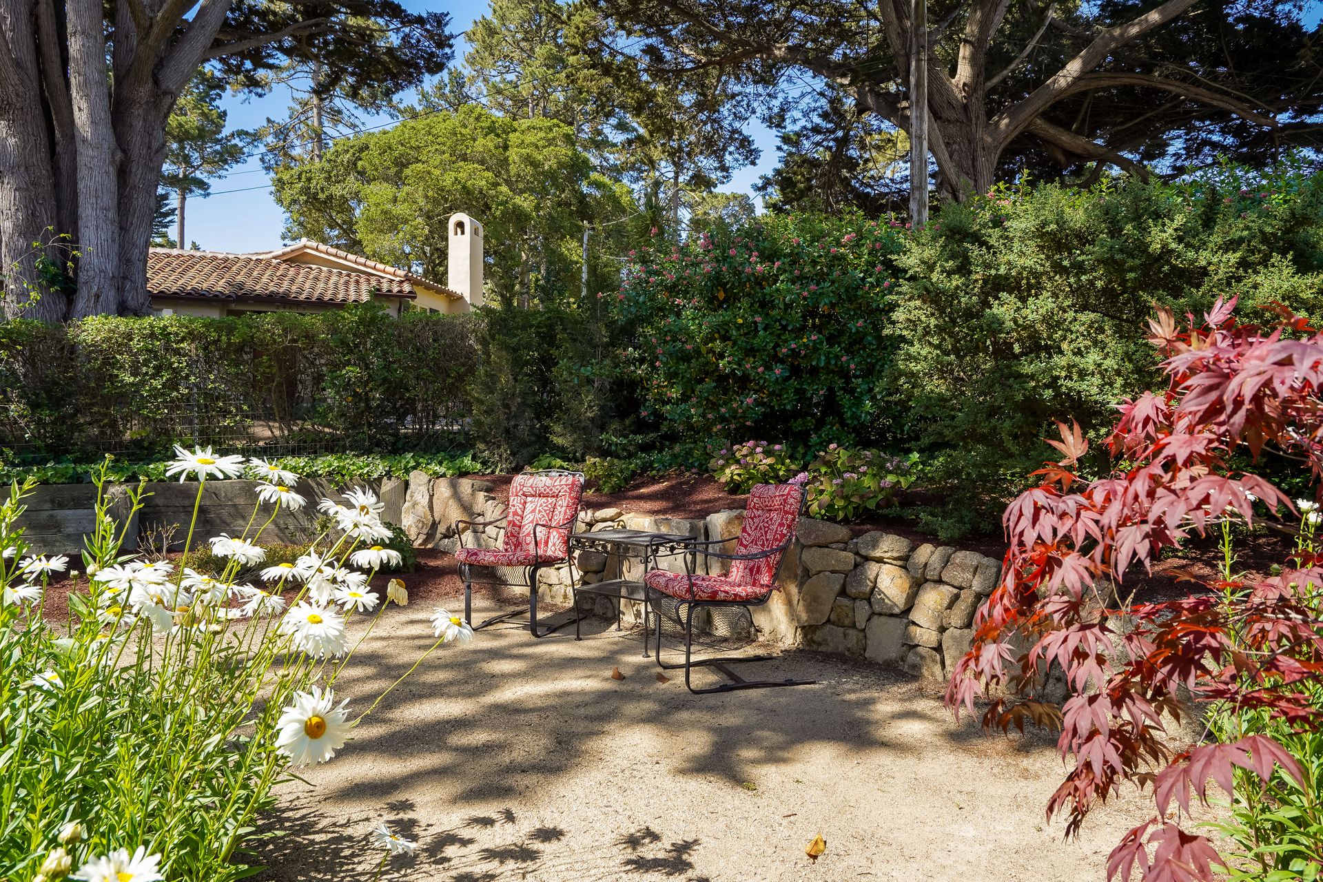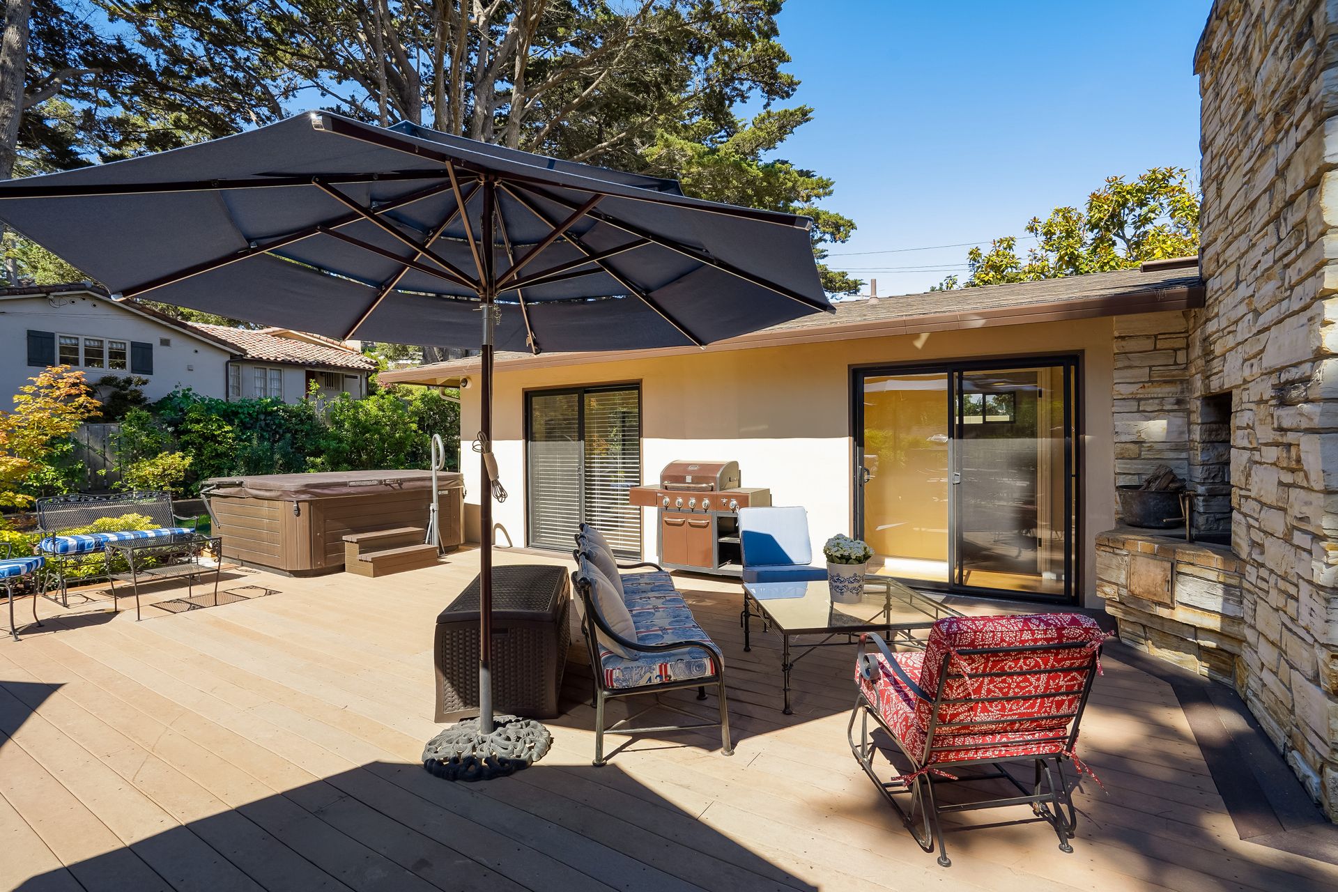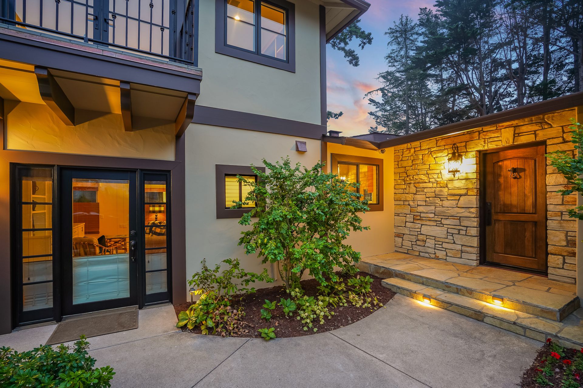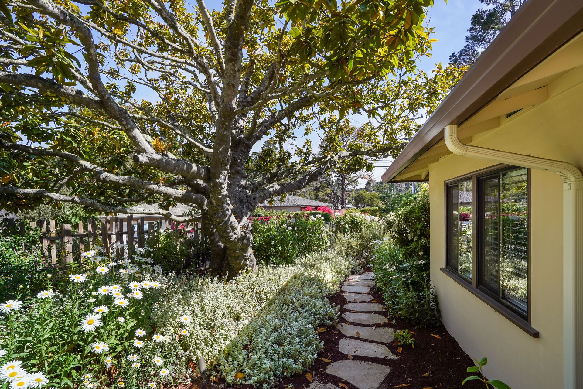STUNNING, newly remodeled Carmel home with a magical garden only moments to downtown. The lush garden features a flowing fountain that draws you in. Freshly painted inside and out, this three bedroom, three bath home with an office is situated on approximately one-third of an acre and has numerous upgrades. Upgrades include a beautiful kitchen remodel with hickory cabinets, butler's pantry, stainless steel appliances, six-burner cooktop and porcelain tile floors. The private upstairs primary suite with approximately 800 square feet features a luxurious spa bathroom and has been beautifully redesigned and offers a peek of the ocean. It boasts a custom wrought-iron Juliet balcony and multiple closets including a shoe closet and natural hickory bookshelves. Additional features include a spacious living room with wood floors, large stone fireplace, light-filled dining area with skylights and a cozy family room with a separate entrance. Additional upgrades include dual pane windows and newer roof and gutters. A large two-car garage with ample parking features custom epoxy floors and an abundance of storage cabinets, a homeowner’s dream. Enjoy a nearly 800 square foot Trex deck and outdoor Carmel Stone fireplace in the backyard. The sunsets and sunrises are mesmerizing.