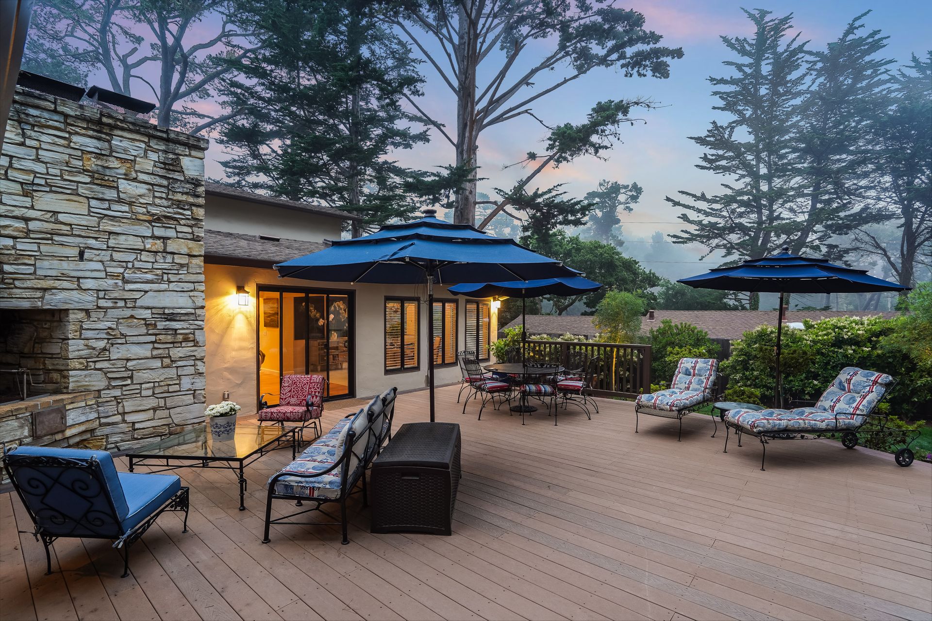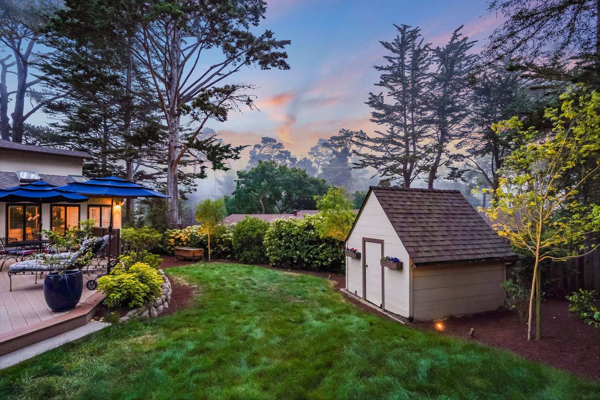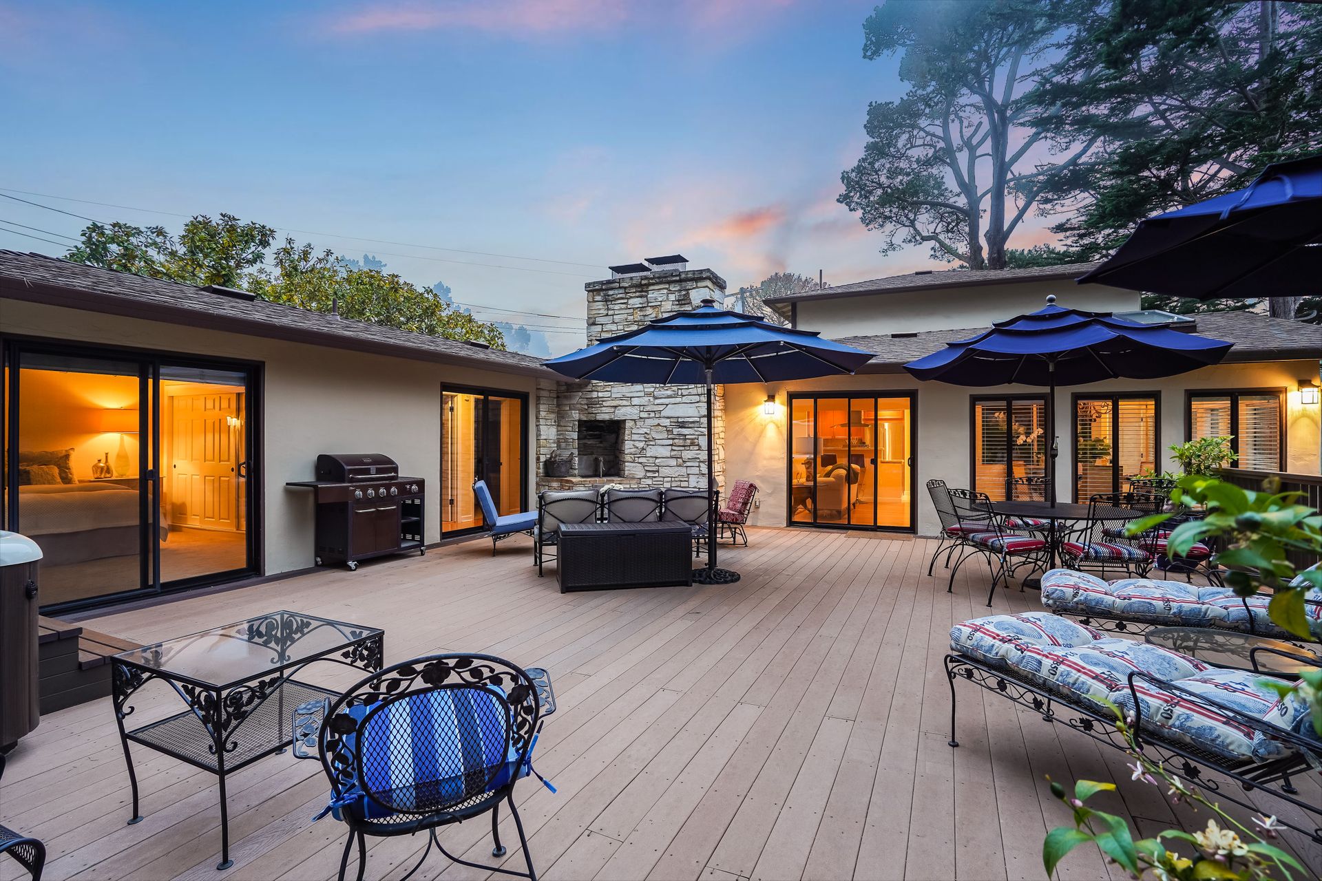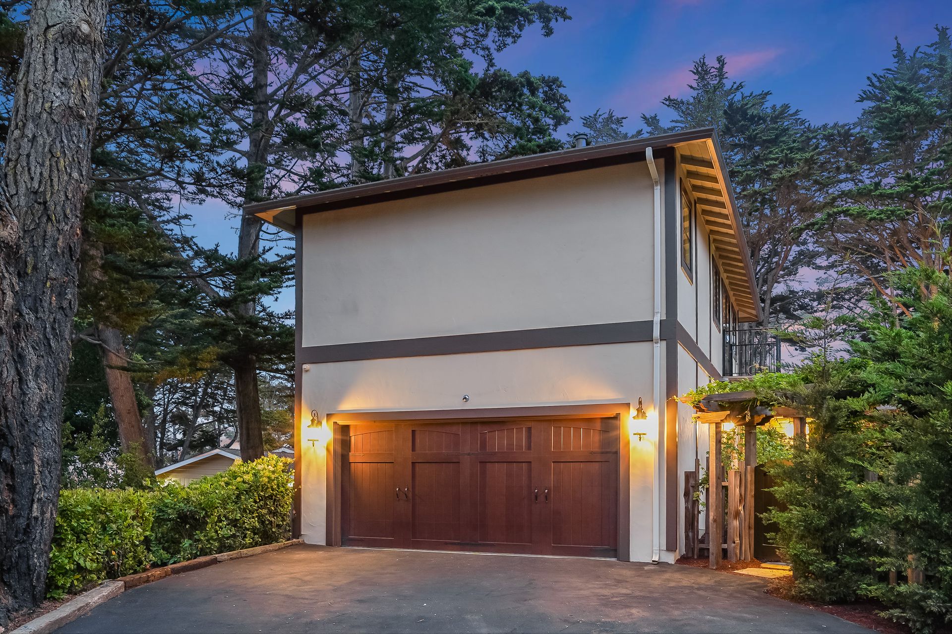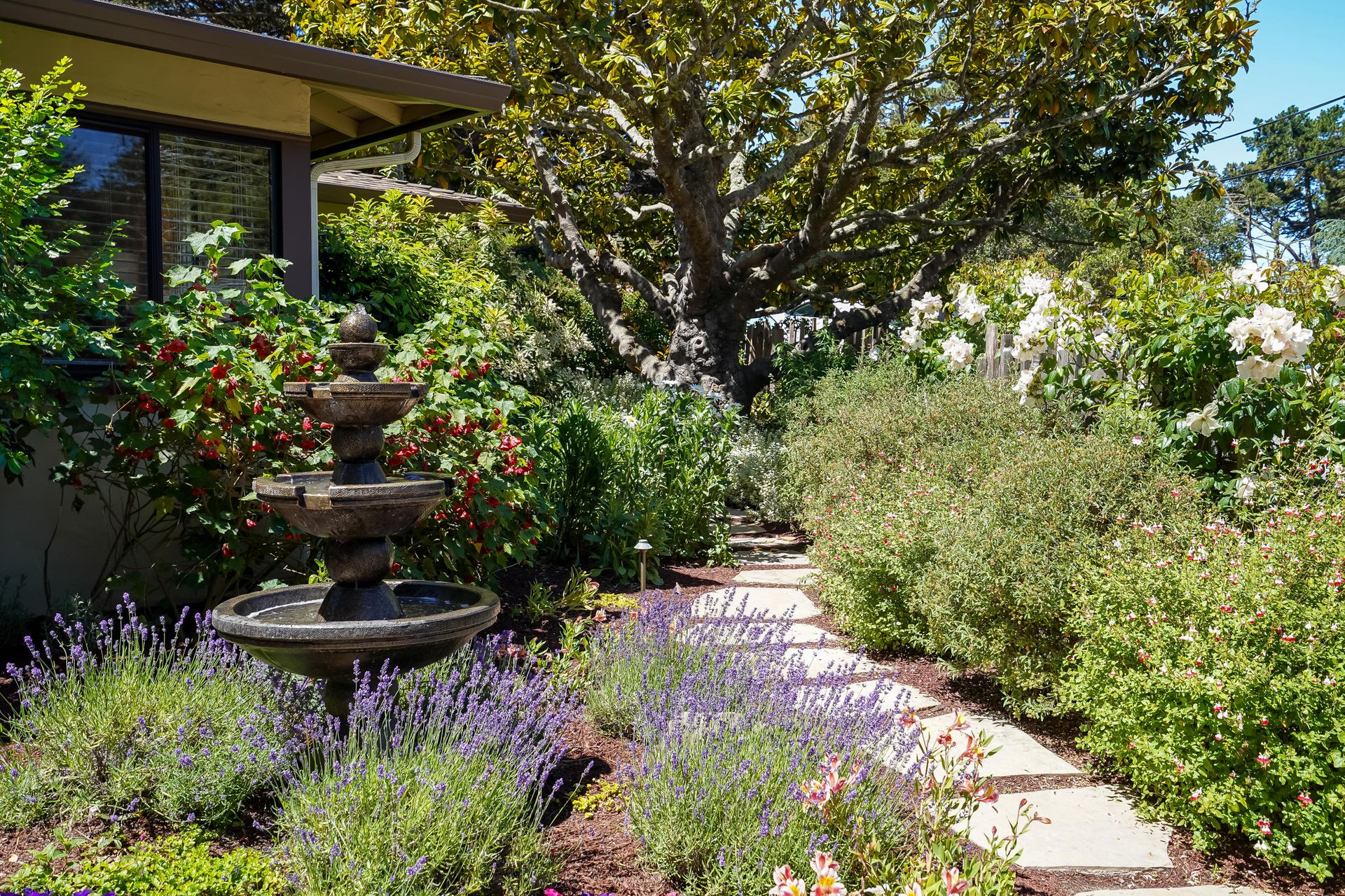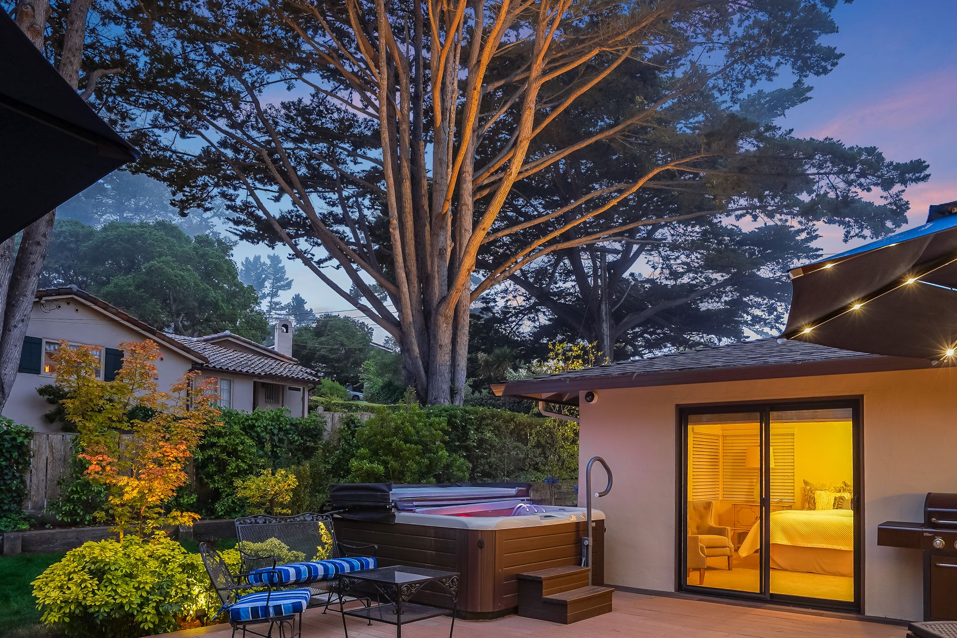 STUNNING, newly remodeled Carmel home with a magical garden only moments to downtown. The lush garden features a flowing fountain that draws you in. Freshly painted inside and out, this three bedroom, three bath home with an office is situated on approximately one-third of an acre and has numerous upgrades. Upgrades include a beautiful kitchen remodel with hickory cabinets, butler's pantry, stainless steel appliances, six-burner cooktop and porcelain tile floors. The private upstairs primary suite with approximately 800 square feet features a luxurious spa bathroom and has been beautifully redesigned and offers a peek of the ocean. It boasts a custom wrought-iron Juliet balcony and multiple closets including a shoe closet and natural hickory bookshelves. Additional features include a spacious living room with wood floors, large stone fireplace, light-filled dining area with skylights and a cozy family room with a separate entrance. Additional upgrades include dual pane windows and newer roof and gutters. A large two-car garage with ample parking features custom epoxy floors and an abundance of storage cabinets, a homeowner’s dream. Enjoy a nearly 800 square foot Trex deck and outdoor Carmel Stone fireplace in the backyard. The sunsets and sunrises are mesmerizing.