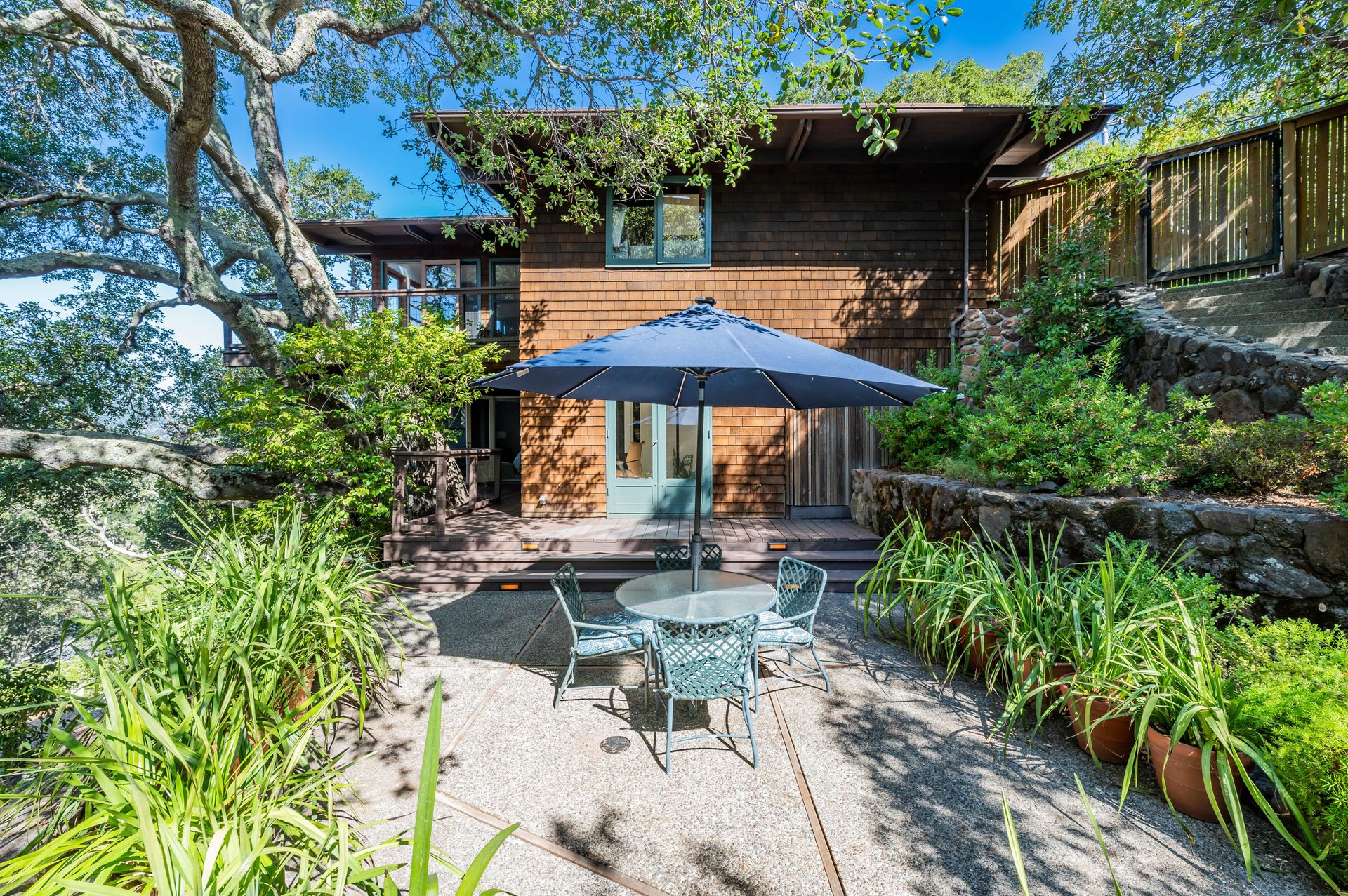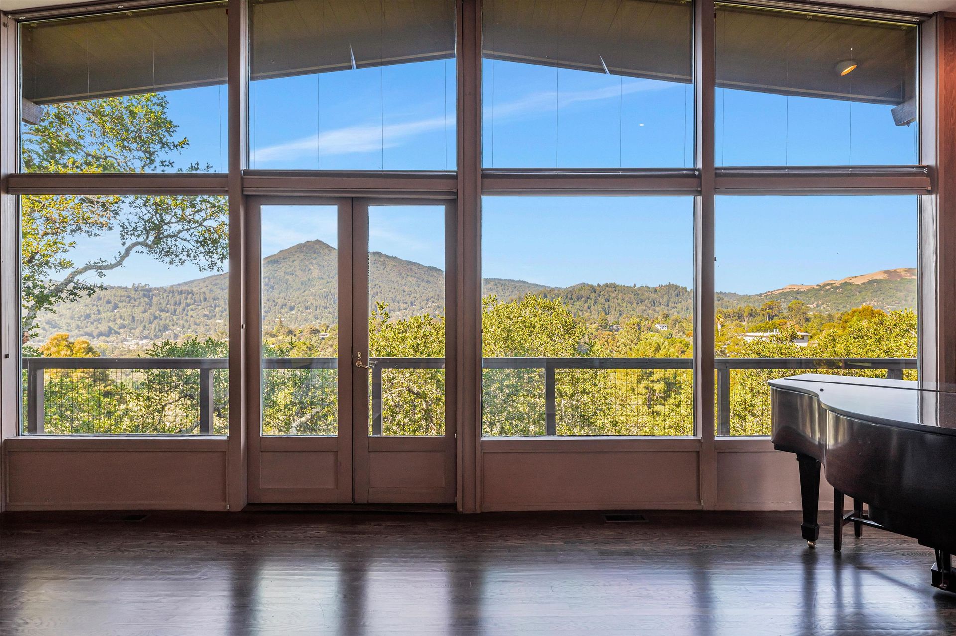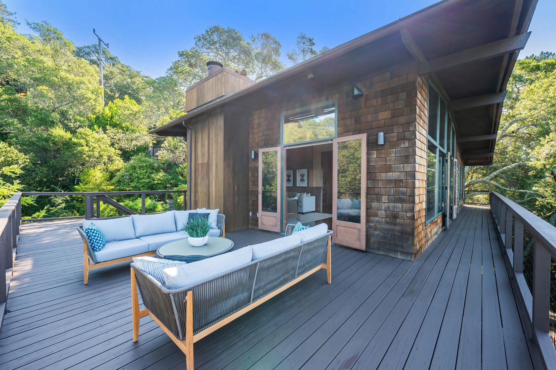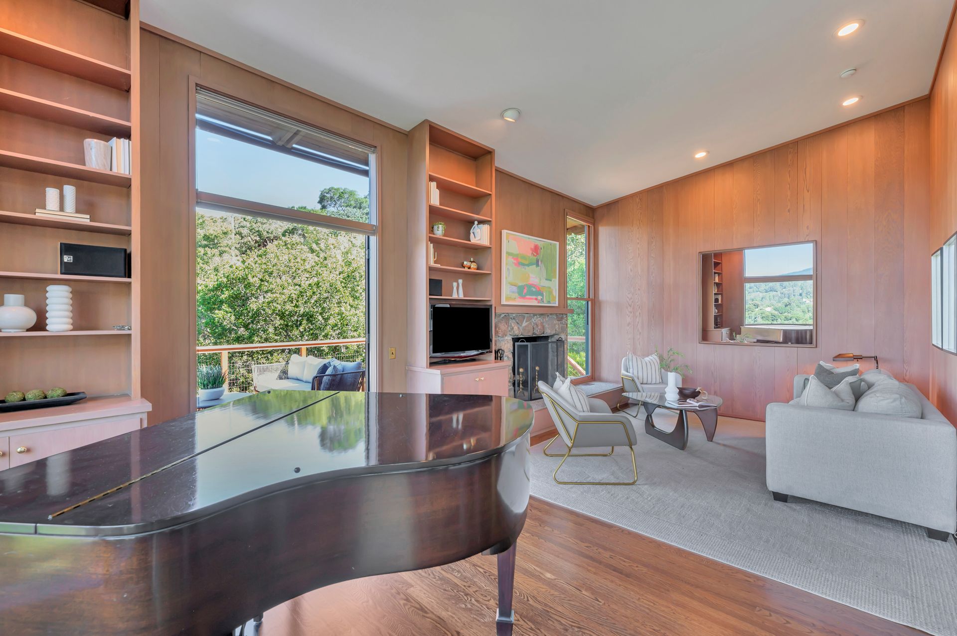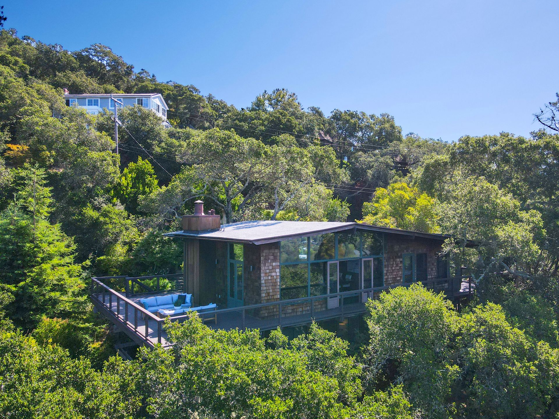 This approximately 2,309 square foot house sits on nearly 1 acre of land in a scenic woodland setting in a neighborhood of high-end homes. The Joseph Esherick mid-century architectural design feels like living in a treehouse, yet you are close to schools, freeway and shopping. The home features three light-filled bedrooms and two and a half bathrooms and another bedroom used as a home office. All the bedrooms are on the lower level. The layout is true to Esherick's style, one that maximized natural light, with an abundance of windows throughout the living spaces.