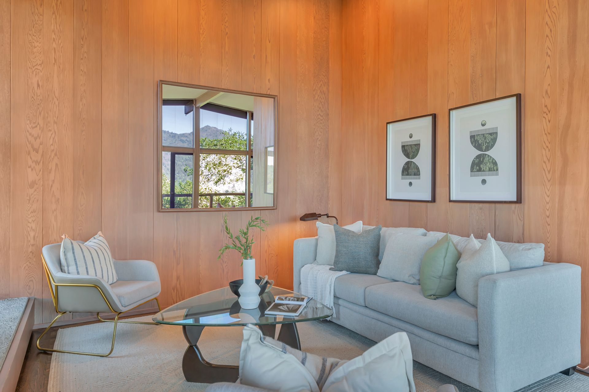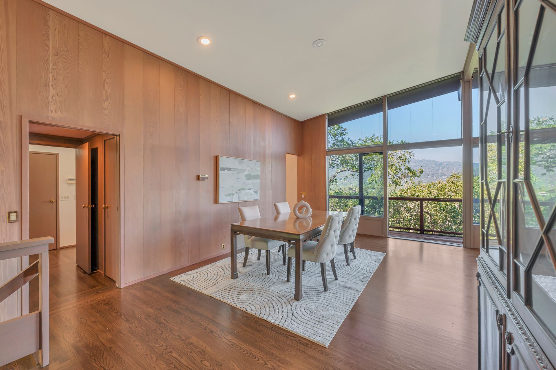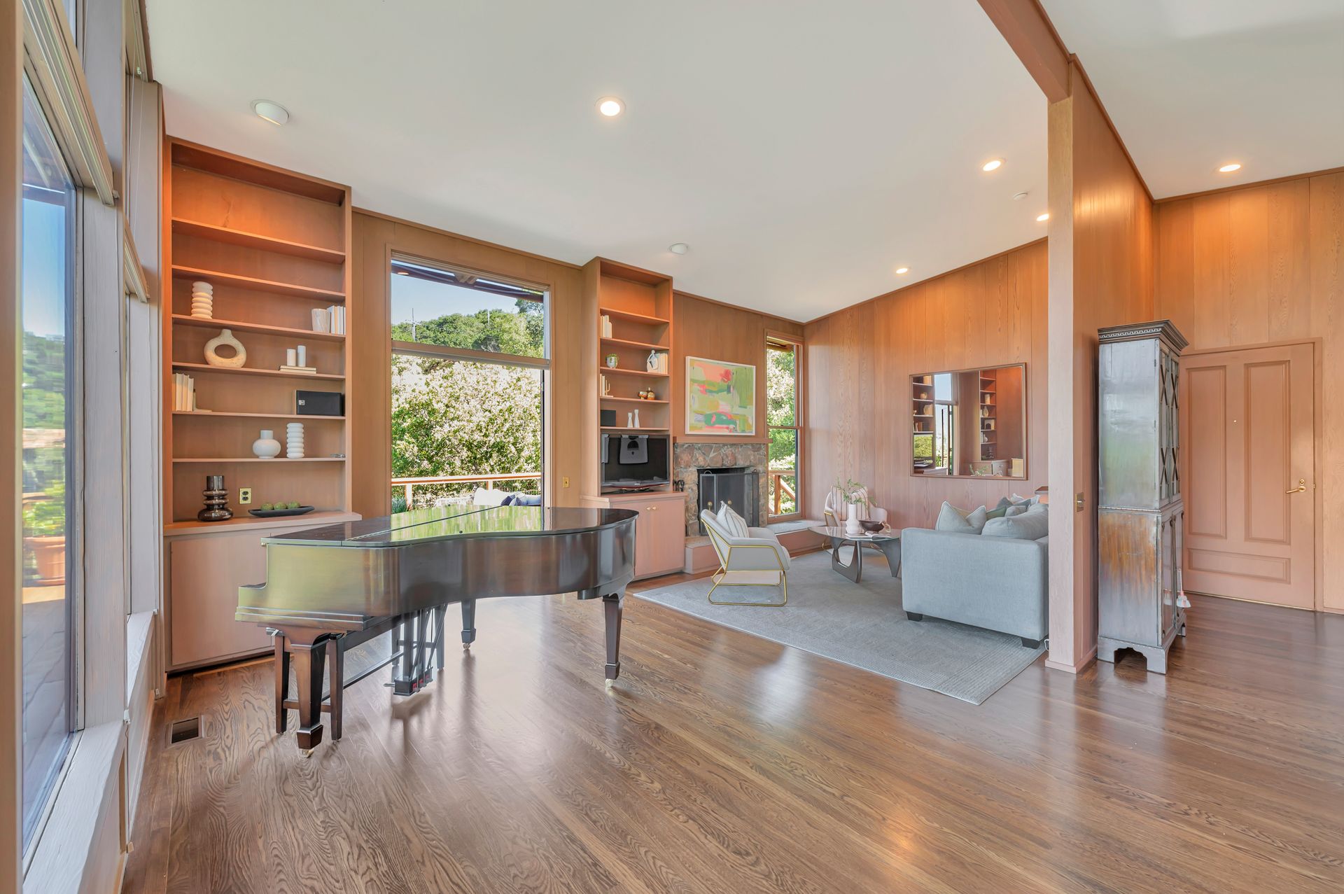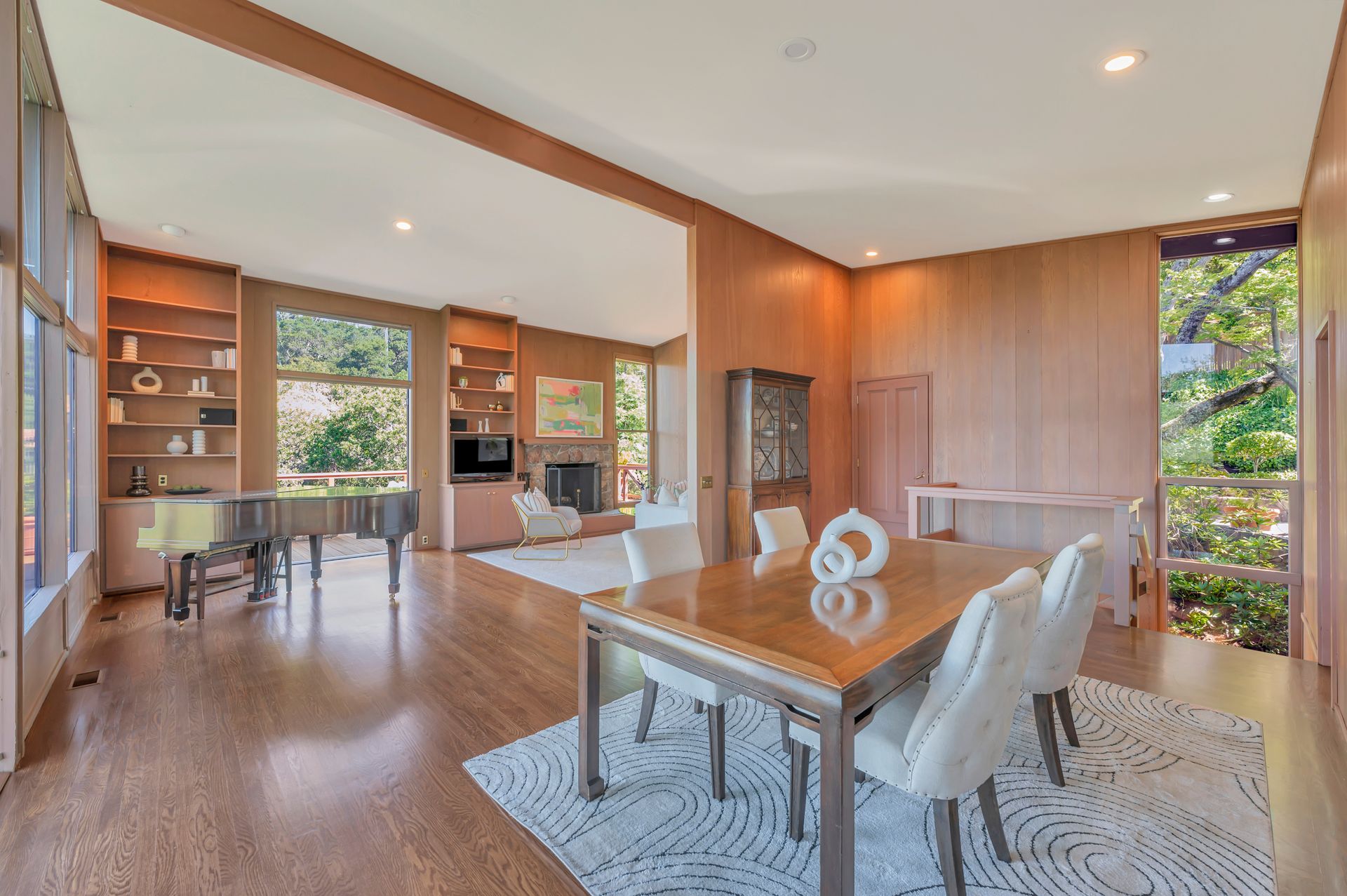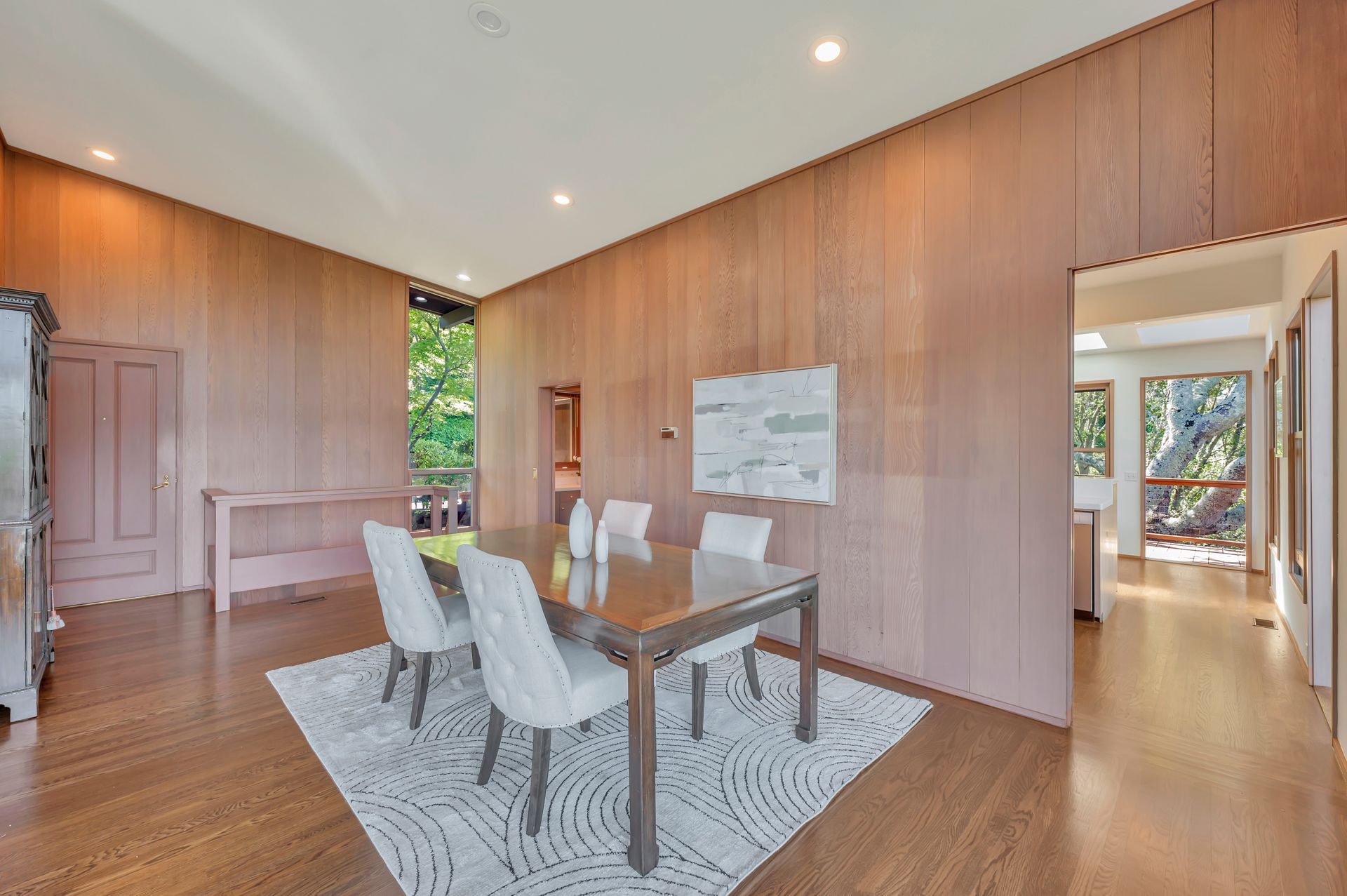 This approximately 2,309 square foot house sits on nearly 1 acre of land in a scenic woodland setting in a neighborhood of high-end homes. The Joseph Esherick mid-century architectural design feels like living in a treehouse, yet you are close to schools, freeway and shopping. The home features three light-filled bedrooms and two and a half bathrooms and another bedroom used as a home office. All the bedrooms are on the lower level. The layout is true to Esherick's style, one that maximized natural light, with an abundance of windows throughout the living spaces.