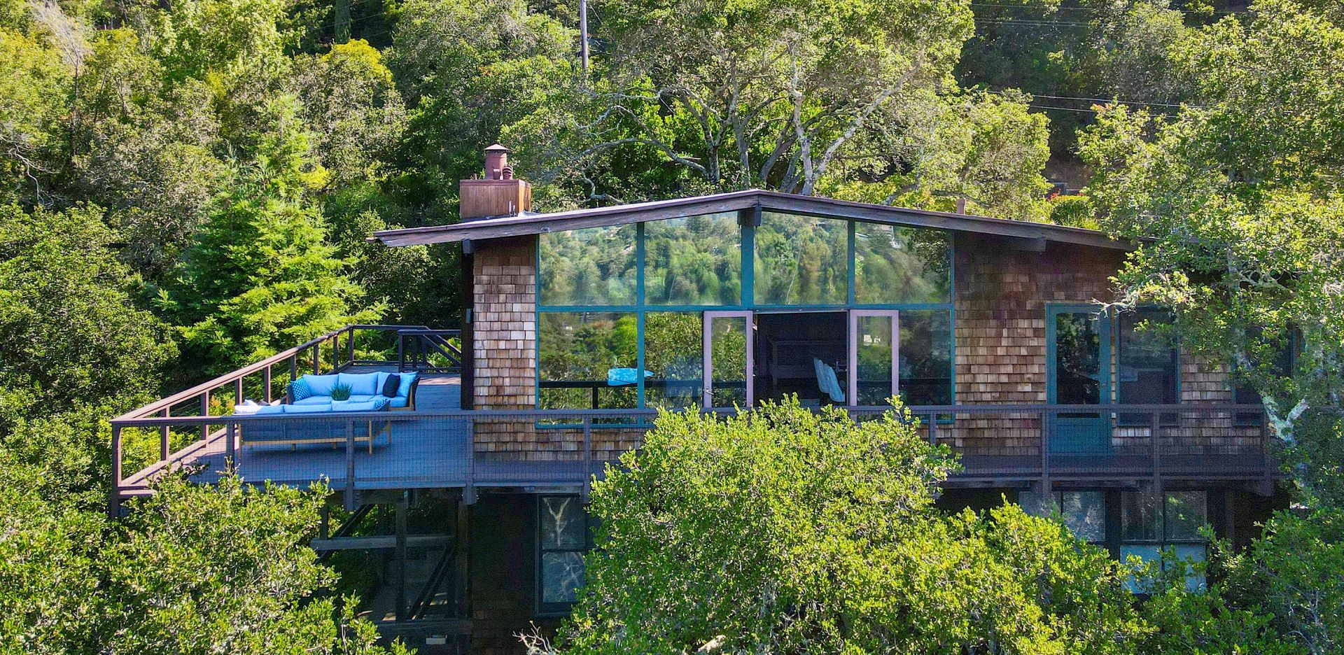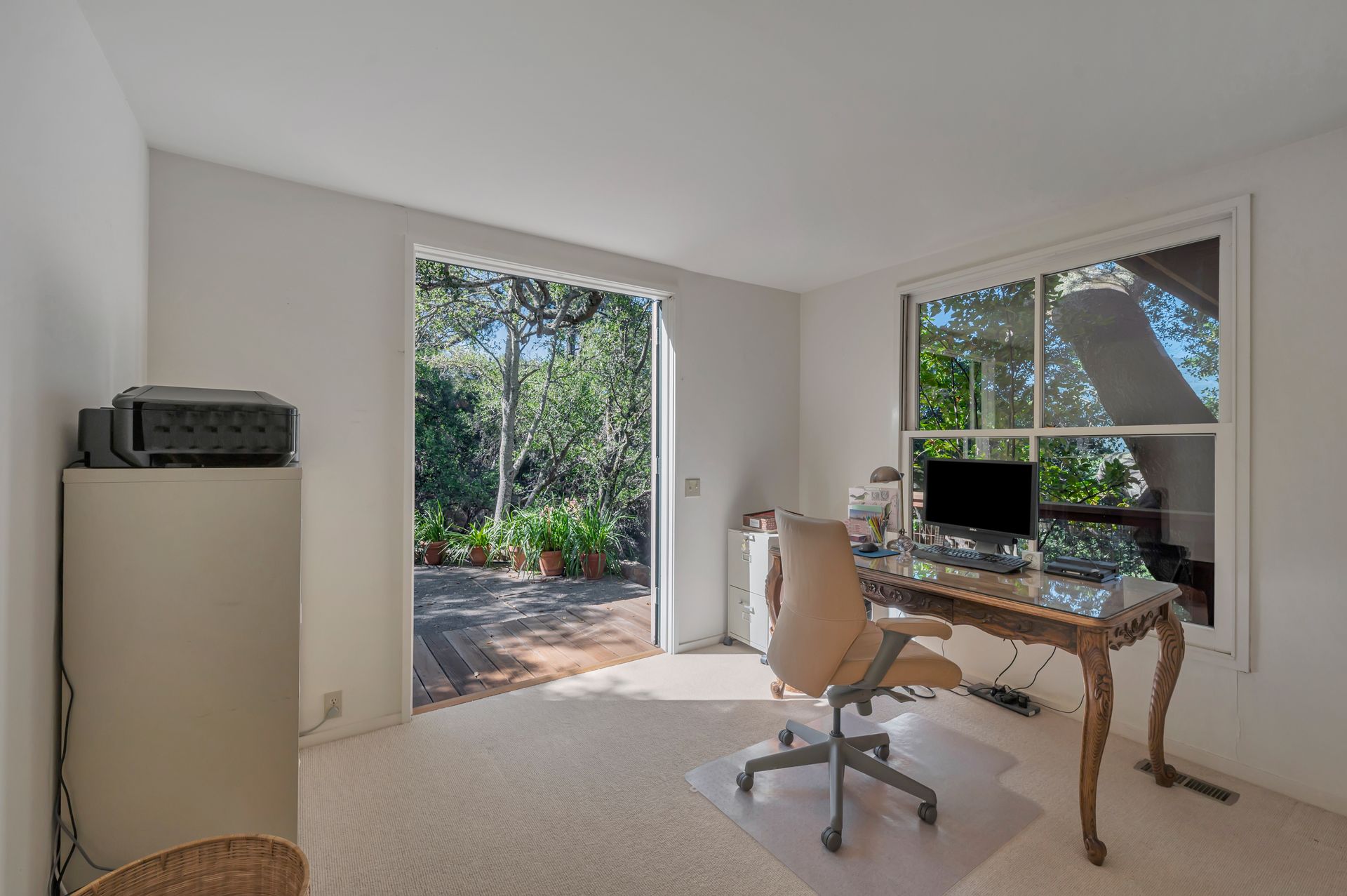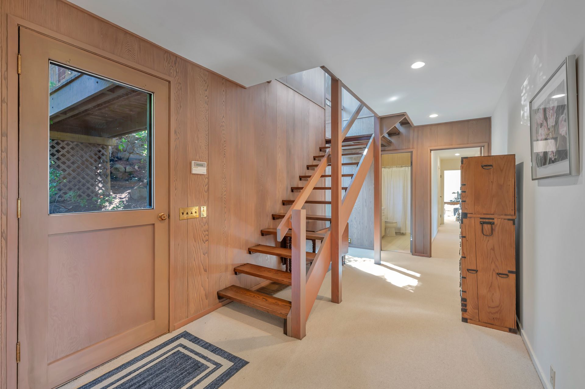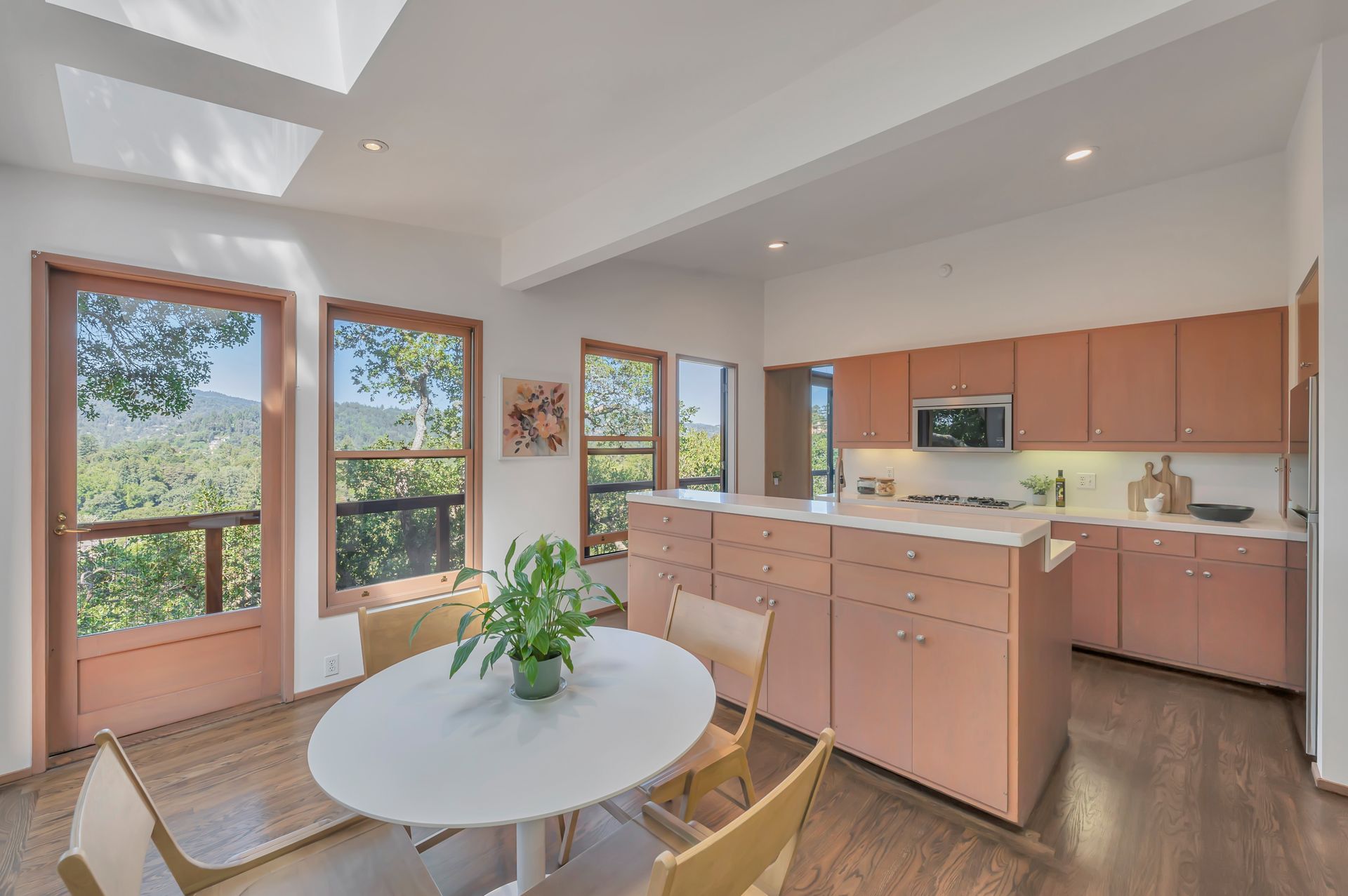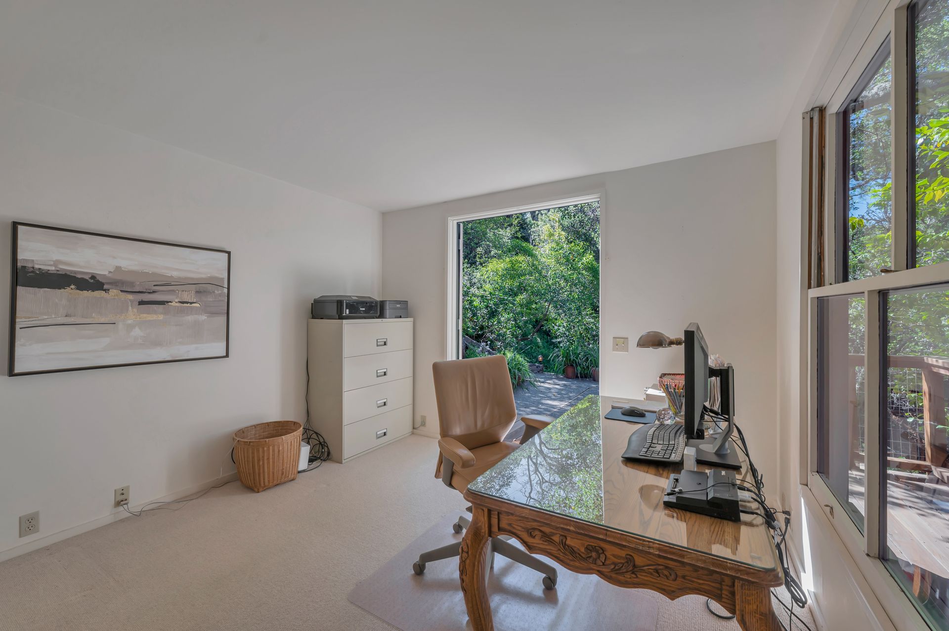 This approximately 2,309 square foot house sits on nearly 1 acre of land in a scenic woodland setting in a neighborhood of high-end homes. The Joseph Esherick mid-century architectural design feels like living in a treehouse, yet you are close to schools, freeway and shopping. The home features three light-filled bedrooms and two and a half bathrooms and another bedroom used as a home office. All the bedrooms are on the lower level. The layout is true to Esherick's style, one that maximized natural light, with an abundance of windows throughout the living spaces.