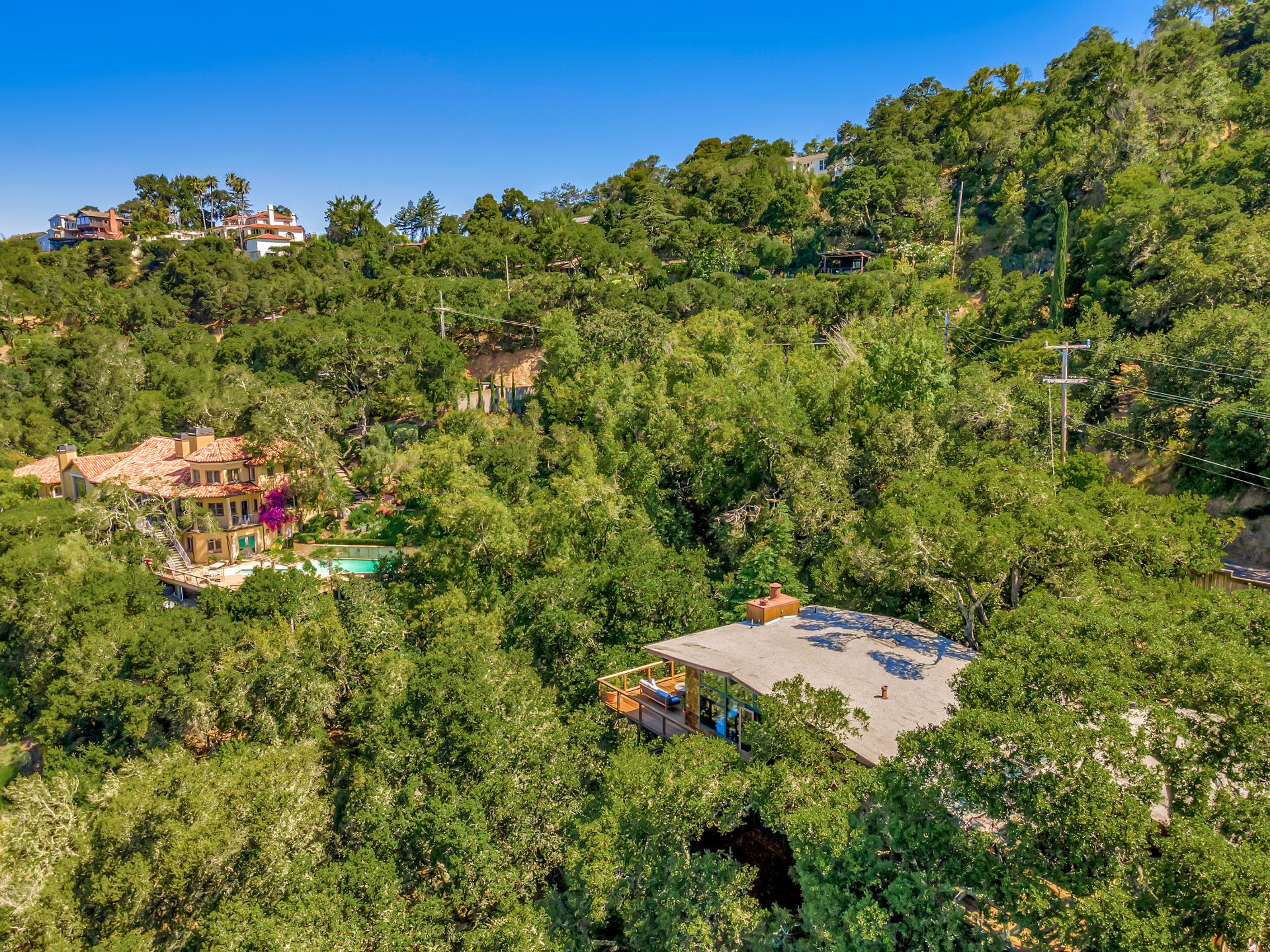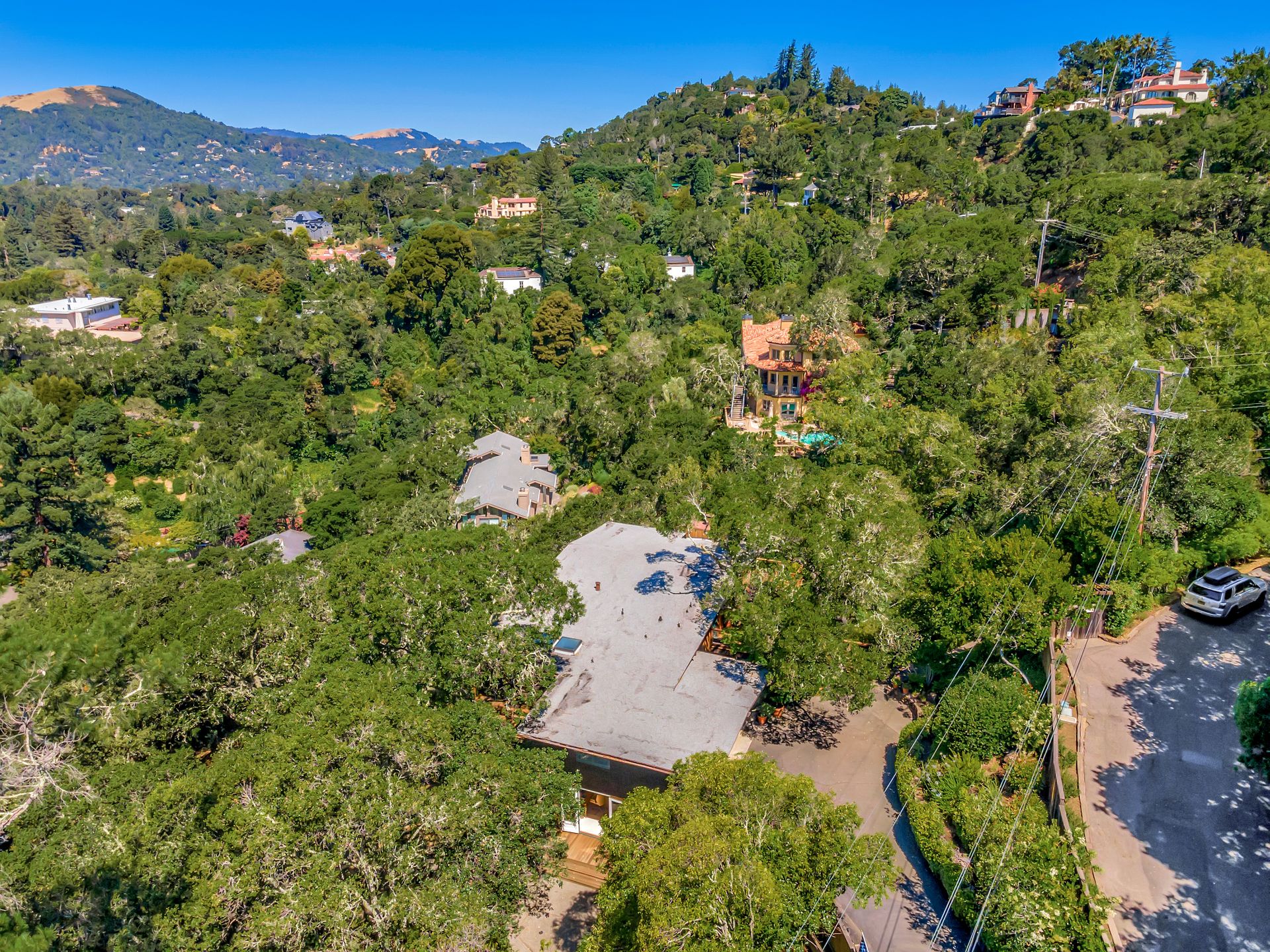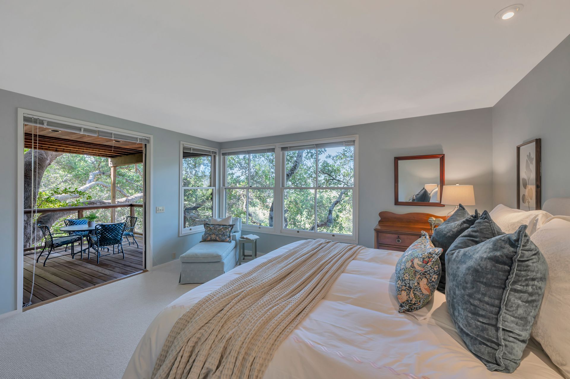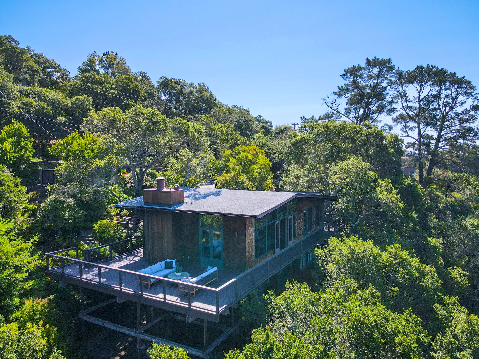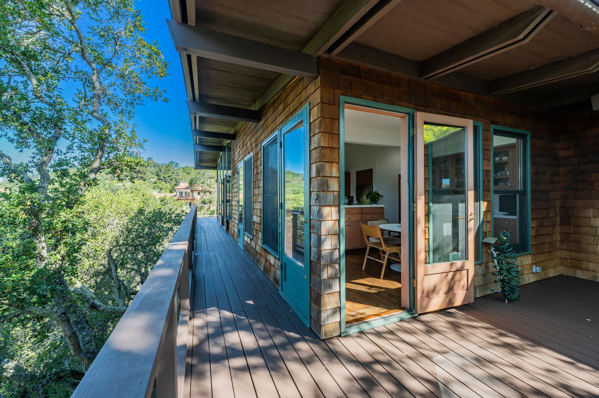 This approximately 2,309 square foot house sits on nearly 1 acre of land in a scenic woodland setting in a neighborhood of high-end homes. The Joseph Esherick mid-century architectural design feels like living in a treehouse, yet you are close to schools, freeway and shopping. The home features three light-filled bedrooms and two and a half bathrooms and another bedroom used as a home office. All the bedrooms are on the lower level. The layout is true to Esherick's style, one that maximized natural light, with an abundance of windows throughout the living spaces.