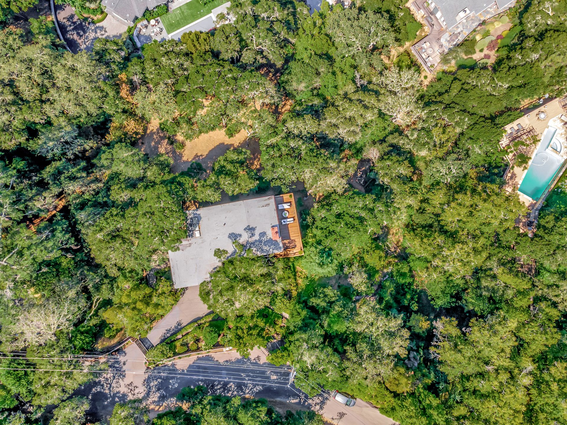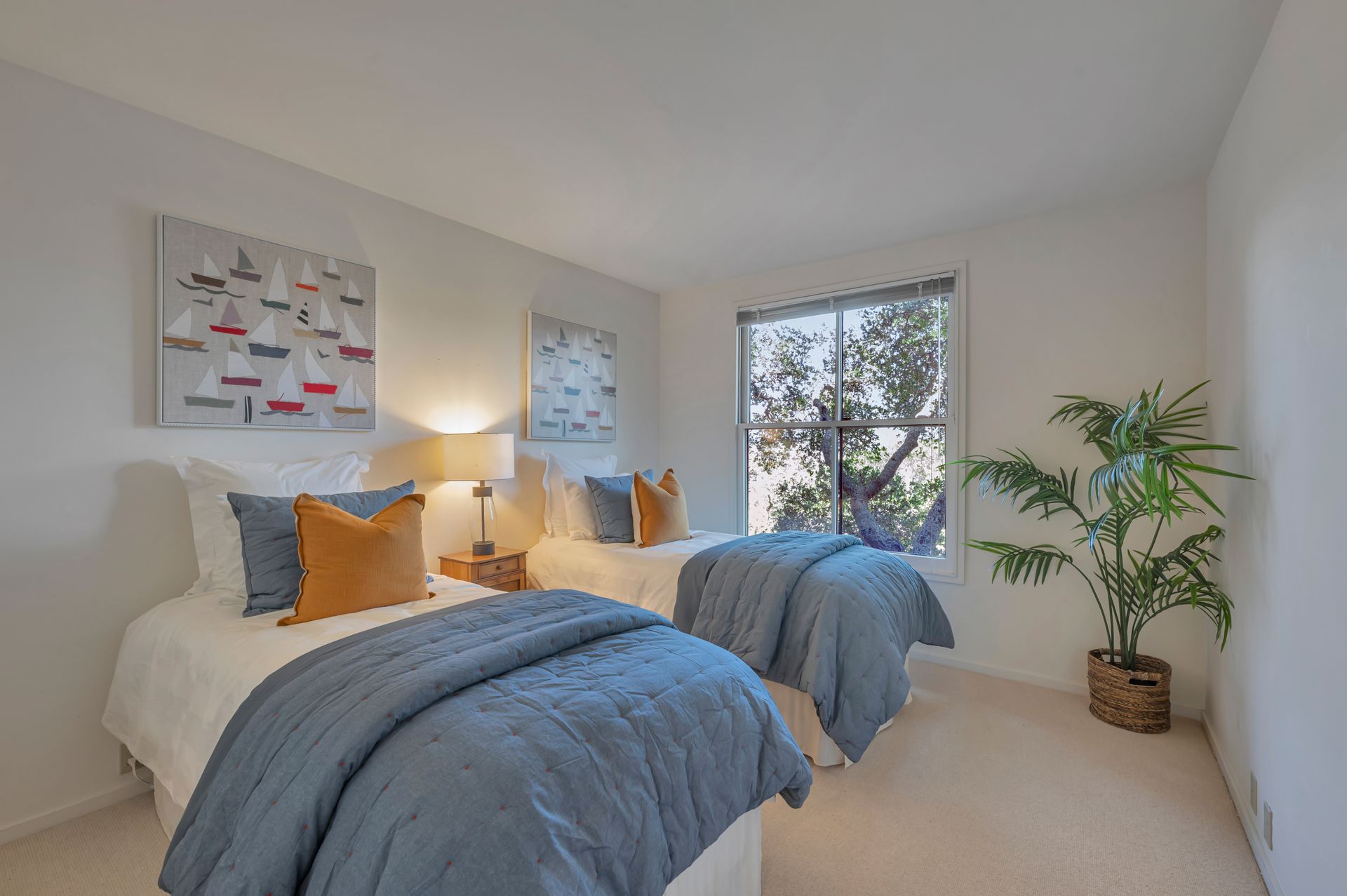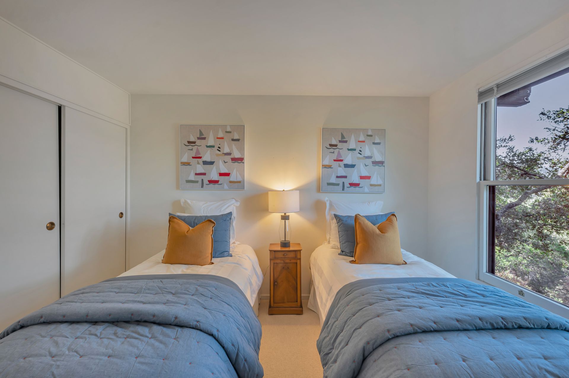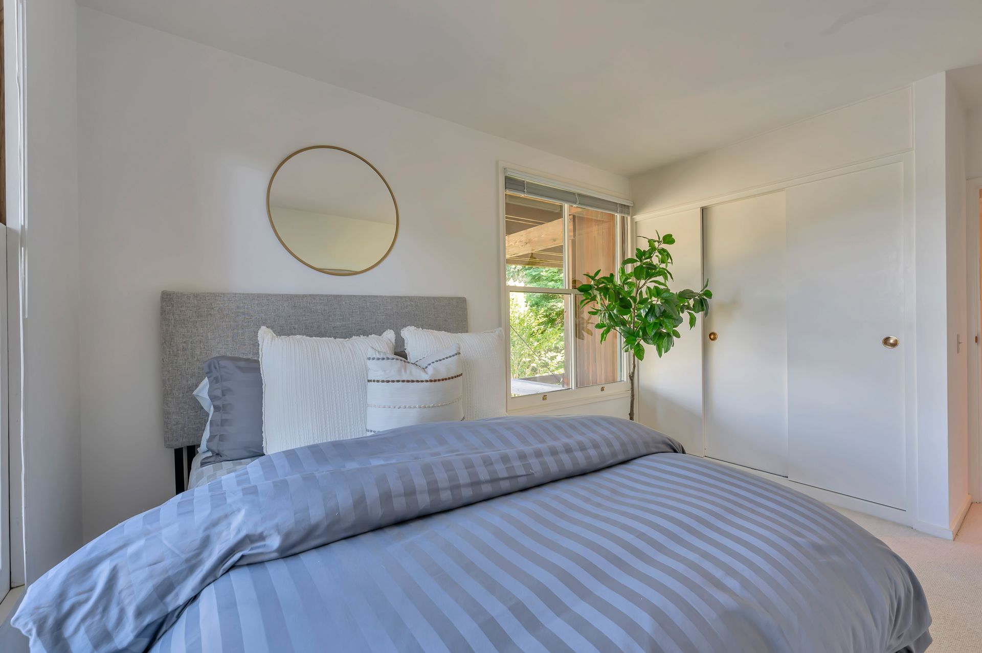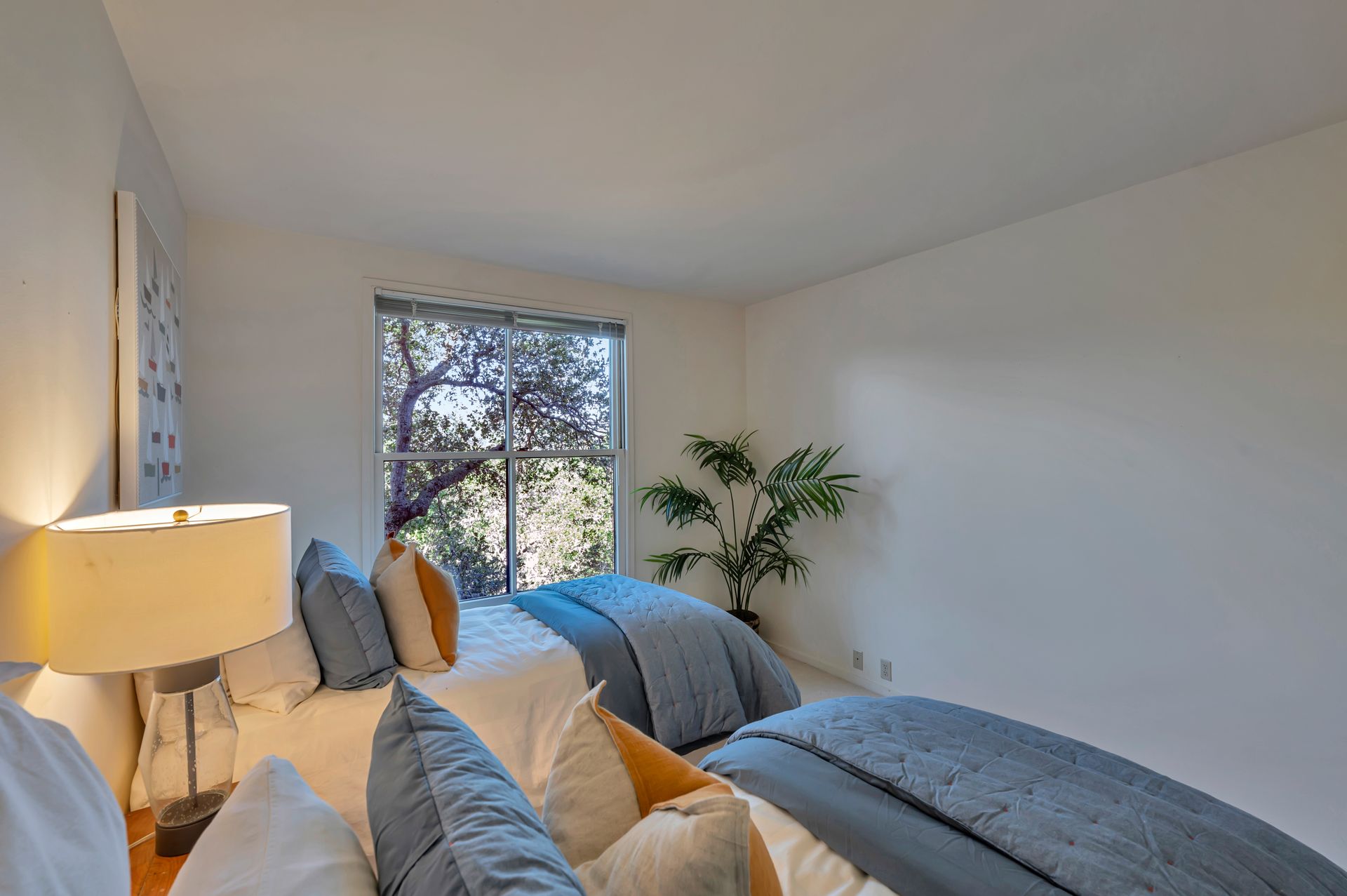 This approximately 2,309 square foot house sits on nearly 1 acre of land in a scenic woodland setting in a neighborhood of high-end homes. The Joseph Esherick mid-century architectural design feels like living in a treehouse, yet you are close to schools, freeway and shopping. The home features three light-filled bedrooms and two and a half bathrooms and another bedroom used as a home office. All the bedrooms are on the lower level. The layout is true to Esherick's style, one that maximized natural light, with an abundance of windows throughout the living spaces.