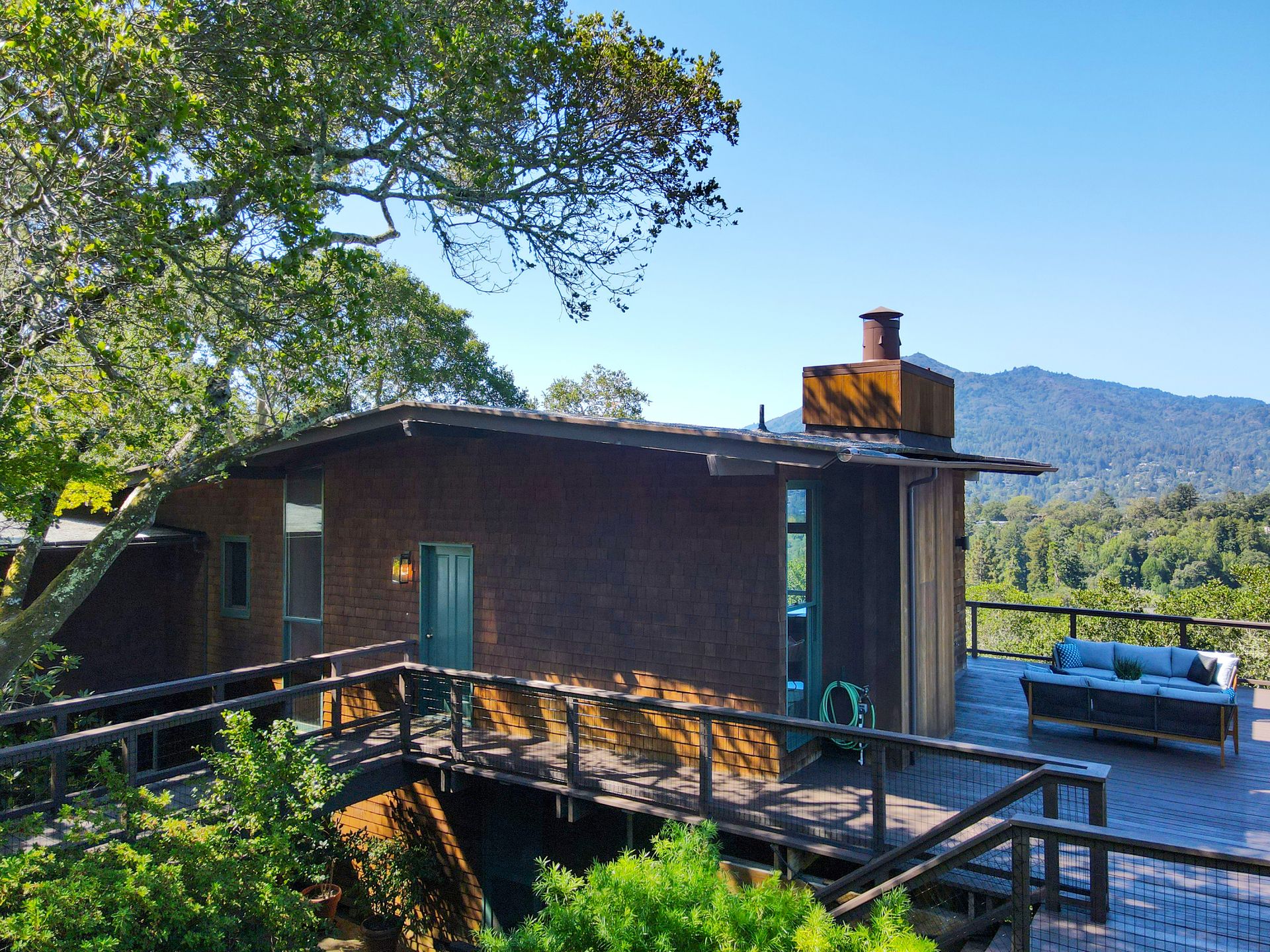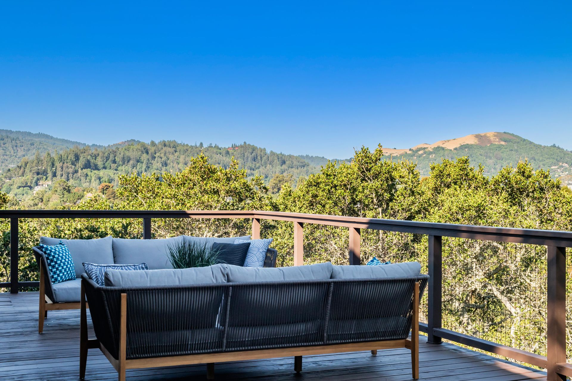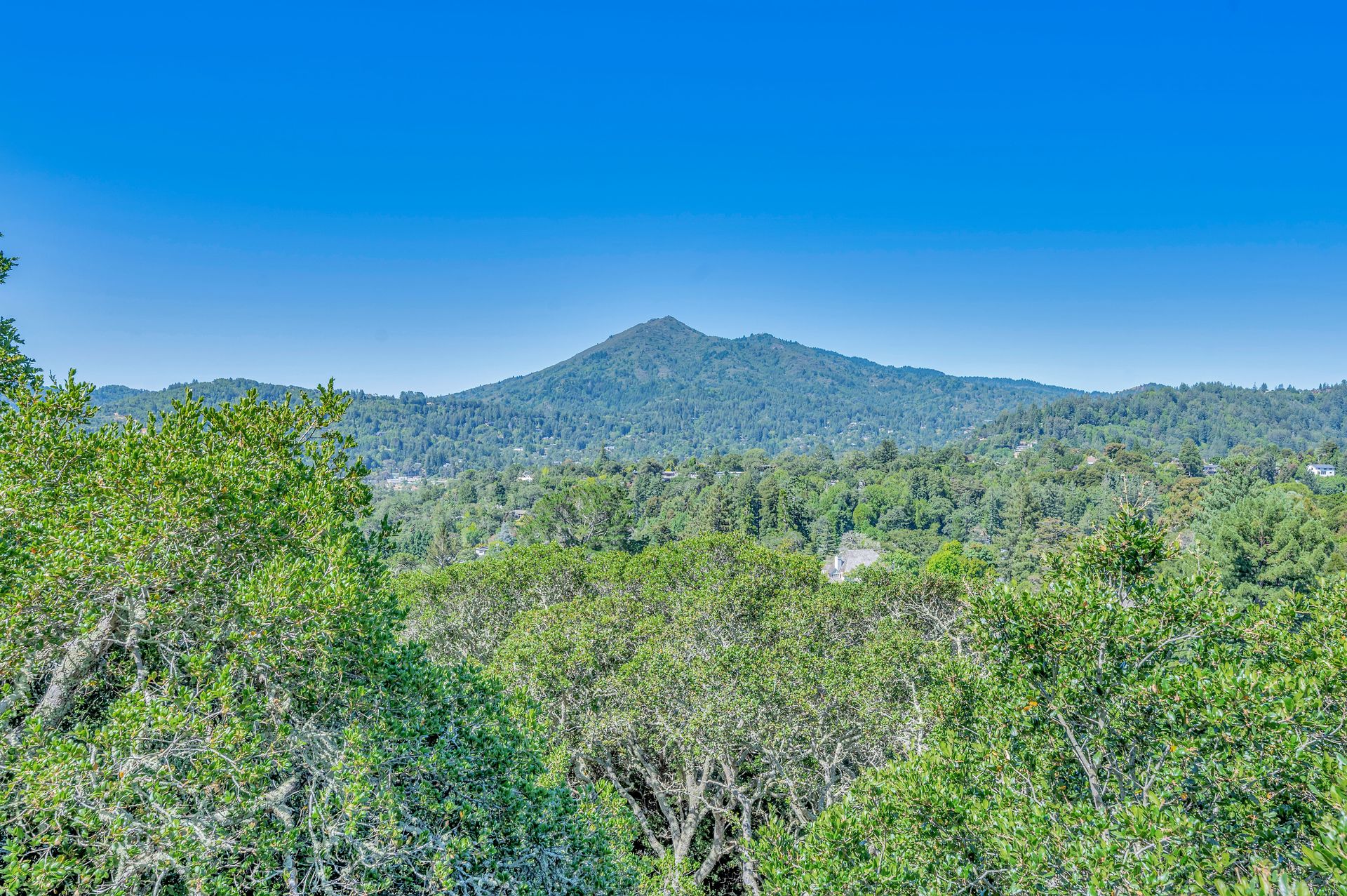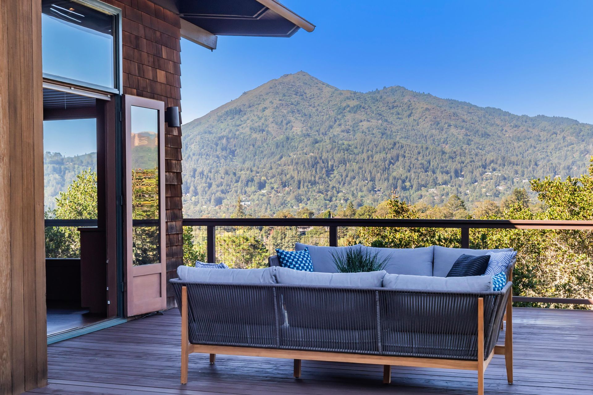 Hardwood flooring complements the cozy fireplace, creating a warm and inviting atmosphere. The expansive deck offers ample space for outdoor enjoyment, with breathtaking views of Mount Tamalpais. The home's serene setting and privacy are further enhanced by the lush greenery with an abundance of coast live oak trees.