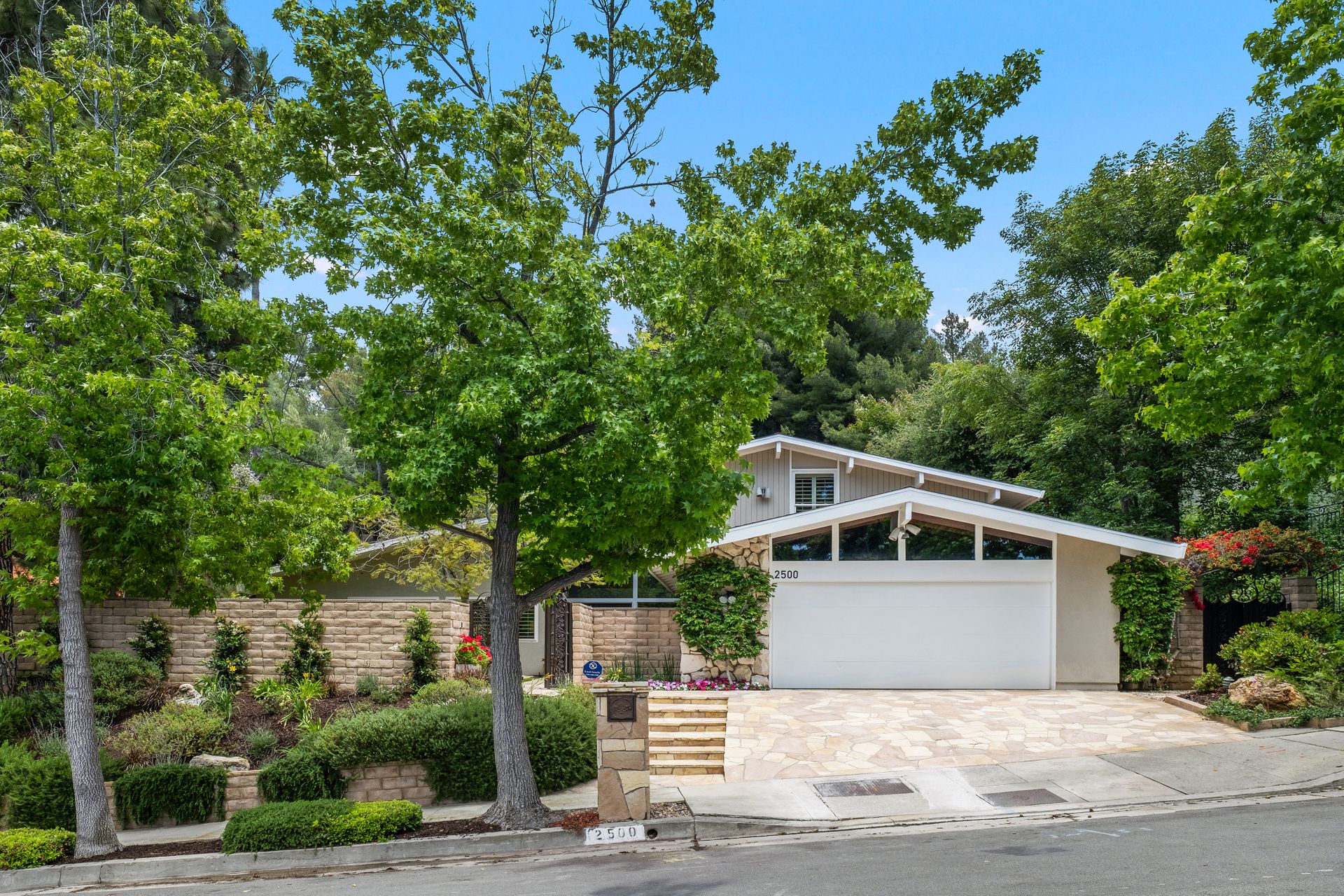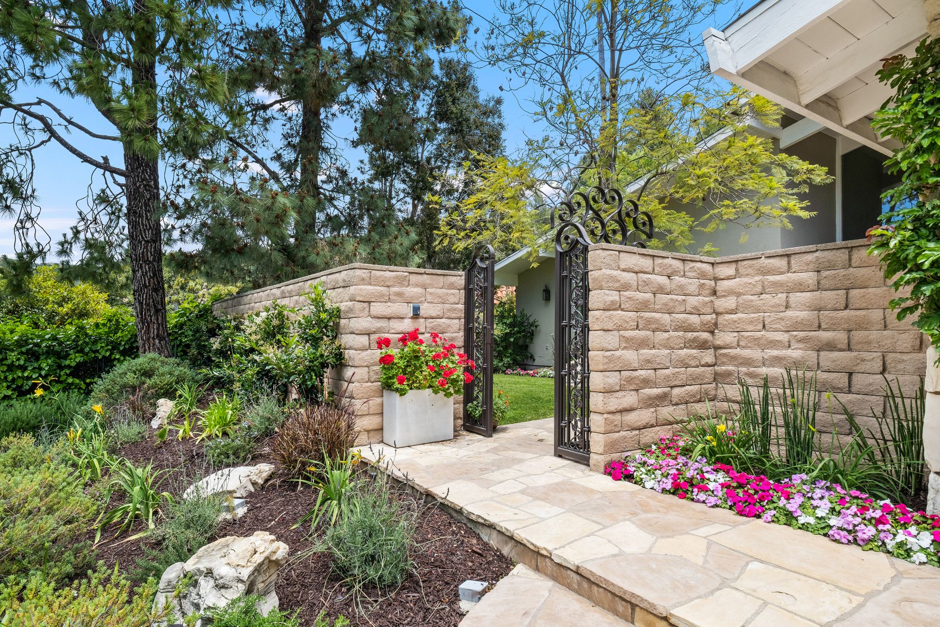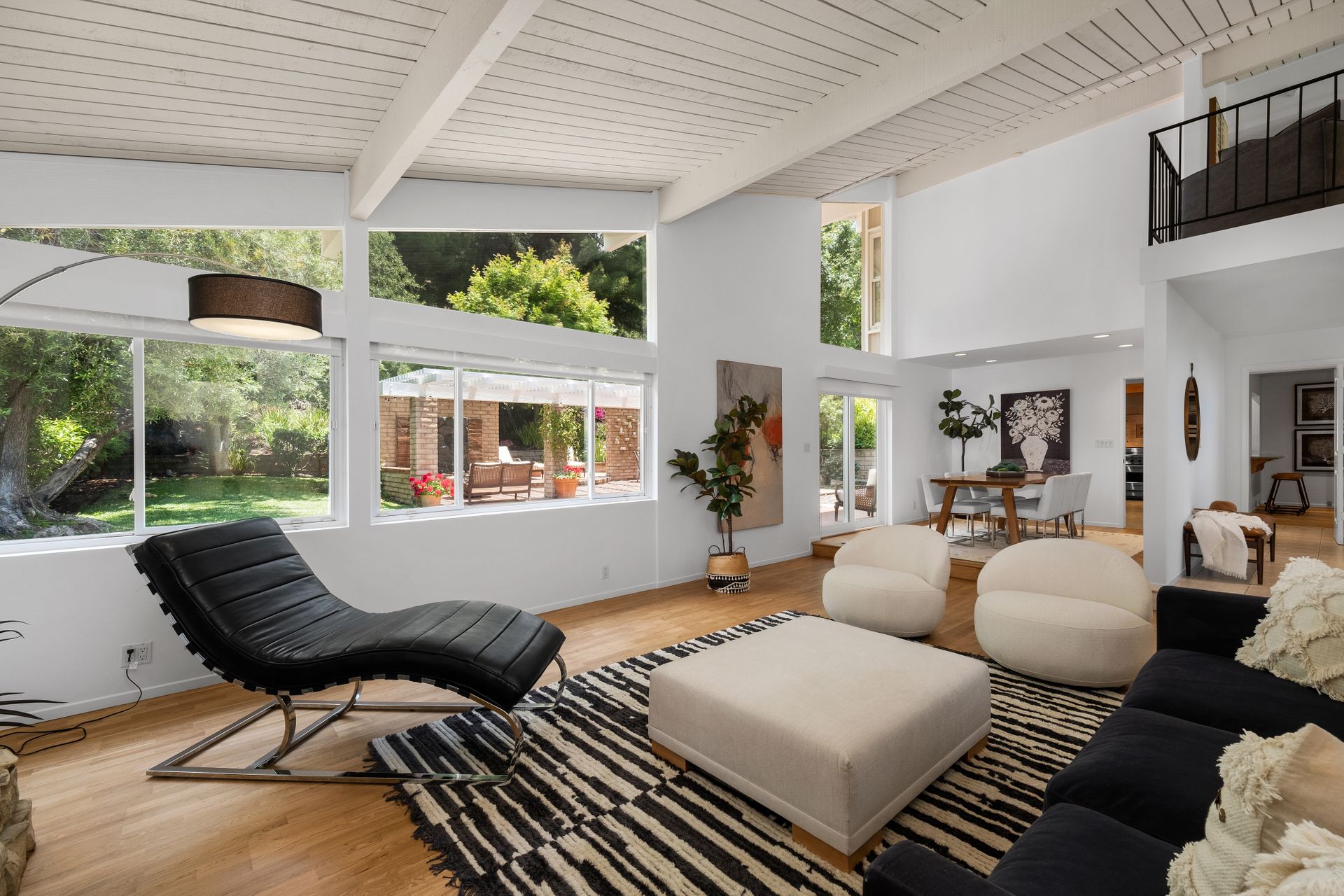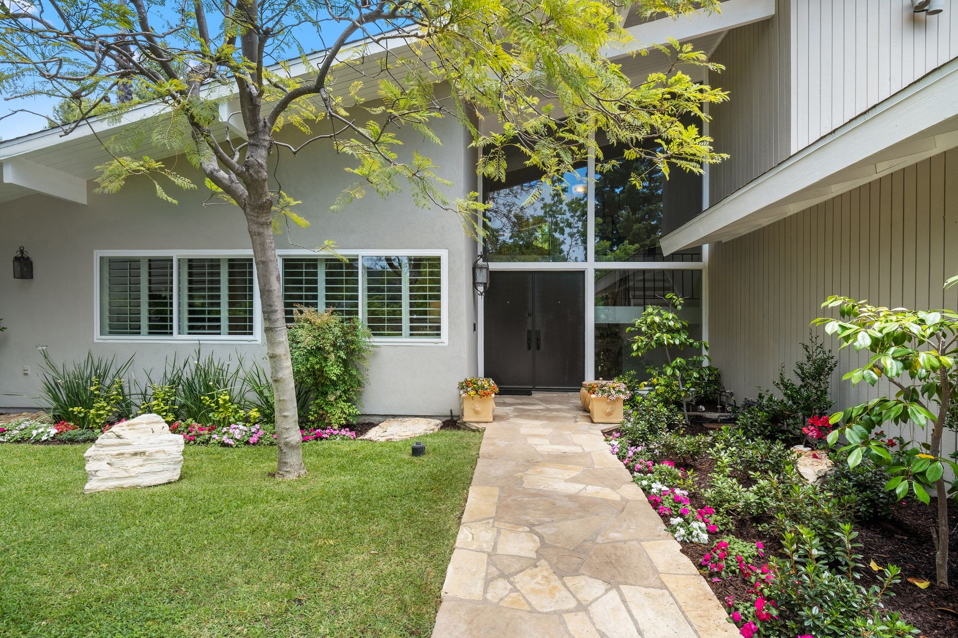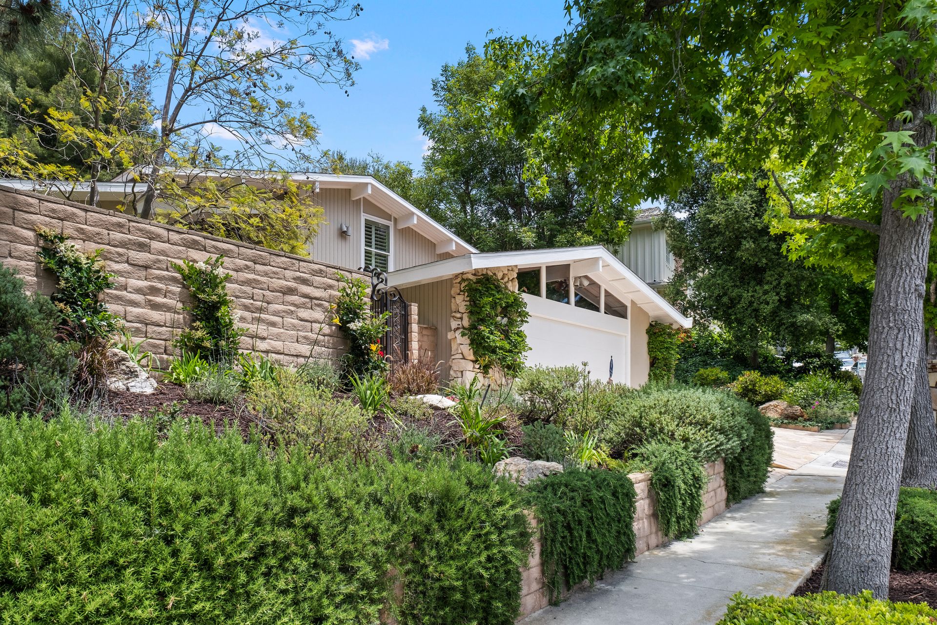 This is the mid-century modern home you've been waiting for! Step into this gated, beautifully updated, freshly painted home in the extremely serene and desirable Brentwood Hills, above Mandeville Canyon. Located on a quiet and peaceful double cul-de-sac, this home warmly greets you with a tastefully adorned flagstone hardscape and an inviting landscaped front yard. This home has an expansive backyard with a covered patio, grassy area, built-in barbecue, fire-pit and stunning landscaping perfect for entertaining. The light-filled two-story entrance opens to a spacious and well-laid-out floor plan. The main bedroom suite, located on the first floor has a cathedral ceiling, with an en-suite bath and wall-to-wall closets. A spacious living room boasts high ceilings and a gas fireplace with a Palisades stone hearth and surround with large fixed and sliding dual-paned windows, which connects to an open yet separate dining room with views and access to the picturesque backyard. Gourmet kitchen with granite countertops, high-end stainless steel appliances, custom cabinetry, eat-in breakfast area and pass through to the breakfast bar. The central hub of the house is the family room with brand-new wood flooring, built-in bookshelves with an attached desk and a sliding glass door leading out to a lovely side patio area. Two-car side-by-side garage with laundry. Upstairs are three additional bedrooms and loft landing, full bathroom and a den/office with a closet.