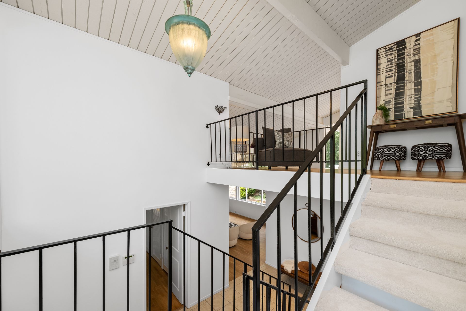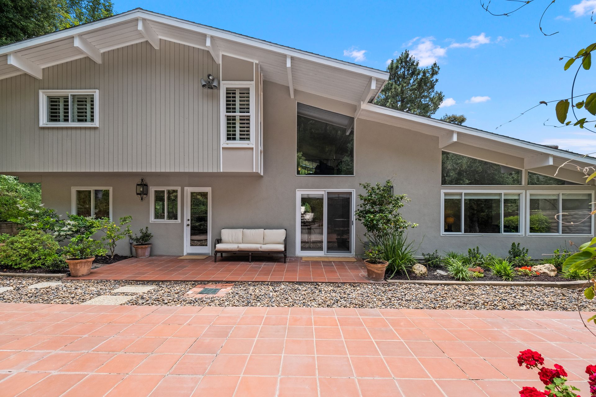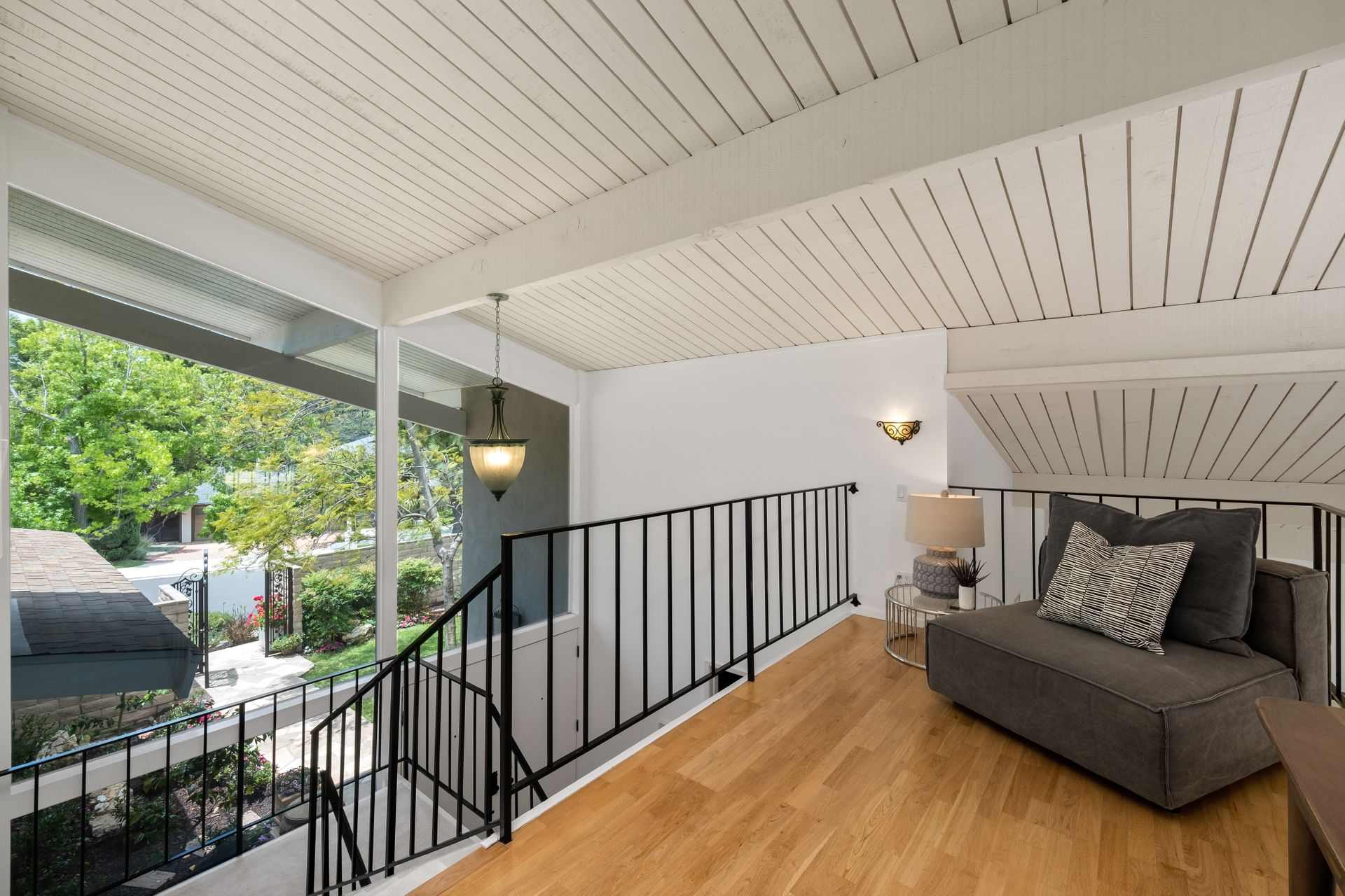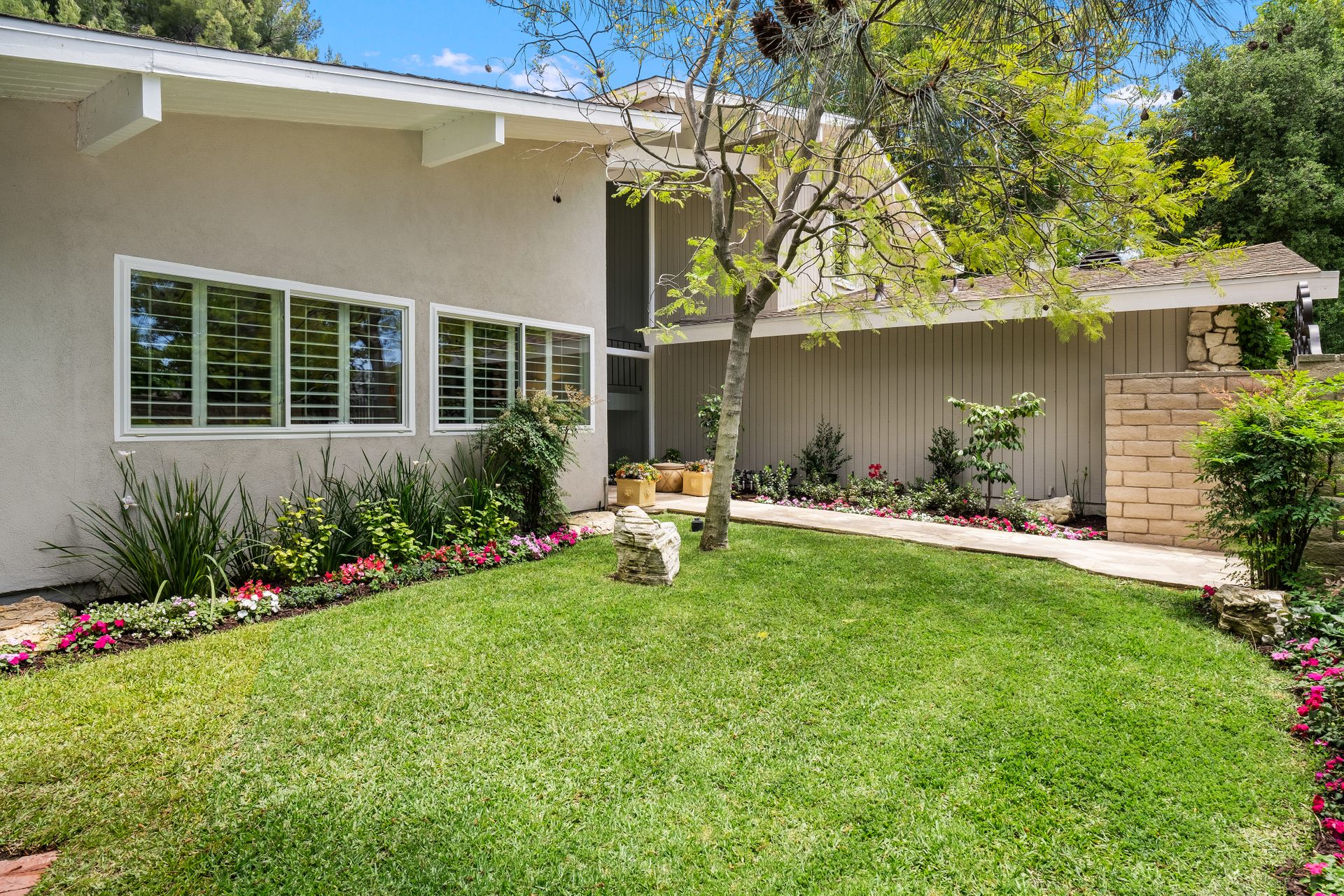This is the mid-century modern home you've been waiting for! Step into this gated, beautifully updated, freshly painted home in the extremely serene and desirable Brentwood Hills, above Mandeville Canyon. Located on a quiet and peaceful double cul-de-sac, this home warmly greets you with a tastefully adorned flagstone hardscape and an inviting landscaped front yard. This home has an expansive backyard with a covered patio, grassy area, built-in barbecue, fire-pit and stunning landscaping perfect for entertaining. The light-filled two-story entrance opens to a spacious and well-laid-out floor plan. The main bedroom suite, located on the first floor has a cathedral ceiling, with an en-suite bath and wall-to-wall closets. A spacious living room boasts high ceilings and a gas fireplace with a Palisades stone hearth and surround with large fixed and sliding dual-paned windows, which connects to an open yet separate dining room with views and access to the picturesque backyard. Gourmet kitchen with granite countertops, high-end stainless steel appliances, custom cabinetry, eat-in breakfast area and pass through to the breakfast bar. The central hub of the house is the family room with brand-new wood flooring, built-in bookshelves with an attached desk and a sliding glass door leading out to a lovely side patio area. Two-car side-by-side garage with laundry. Upstairs are three additional bedrooms and loft landing, full bathroom and a den/office with a closet.