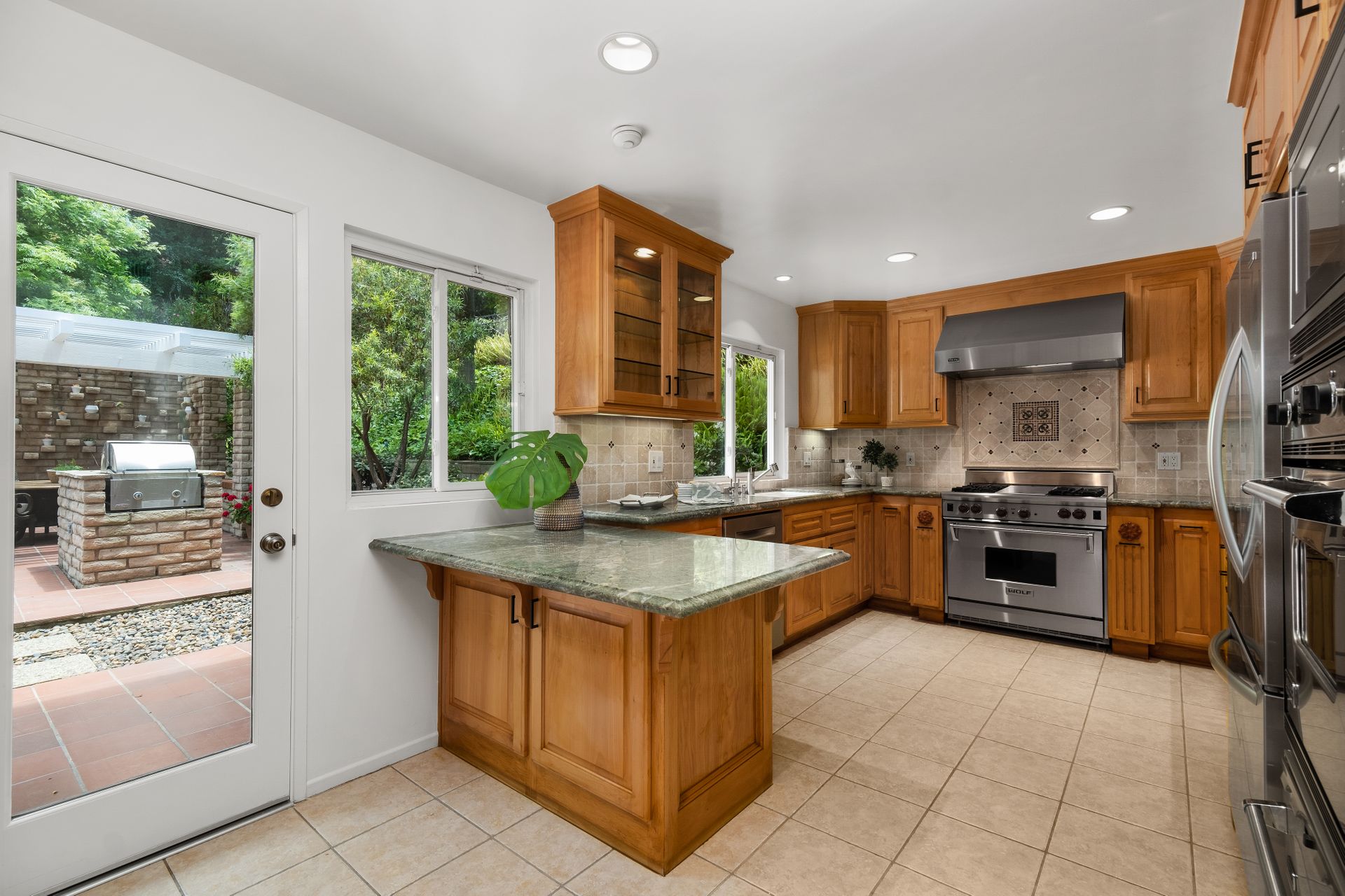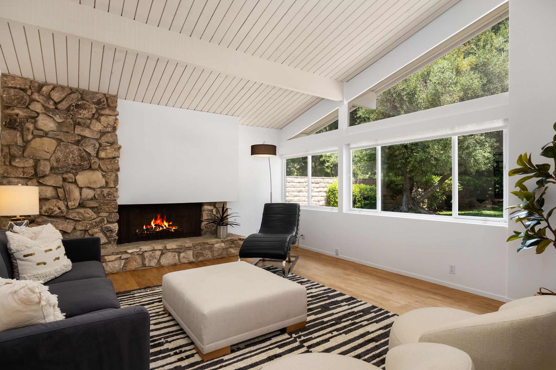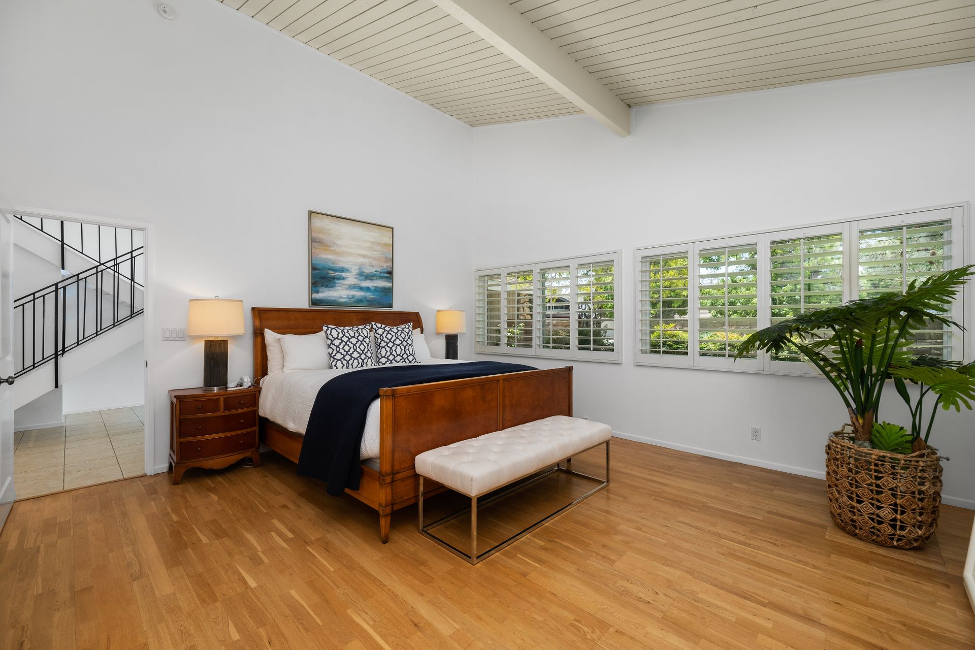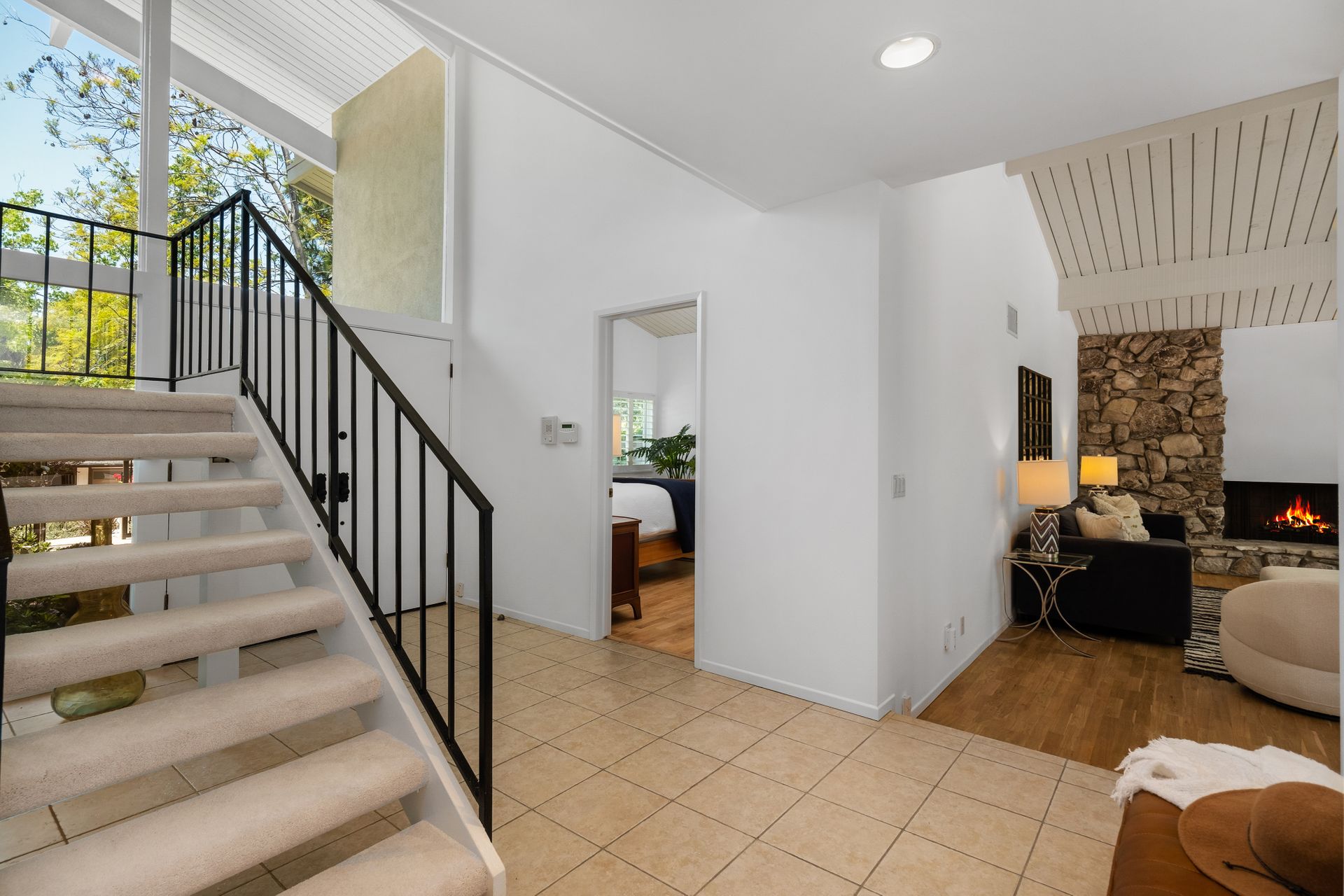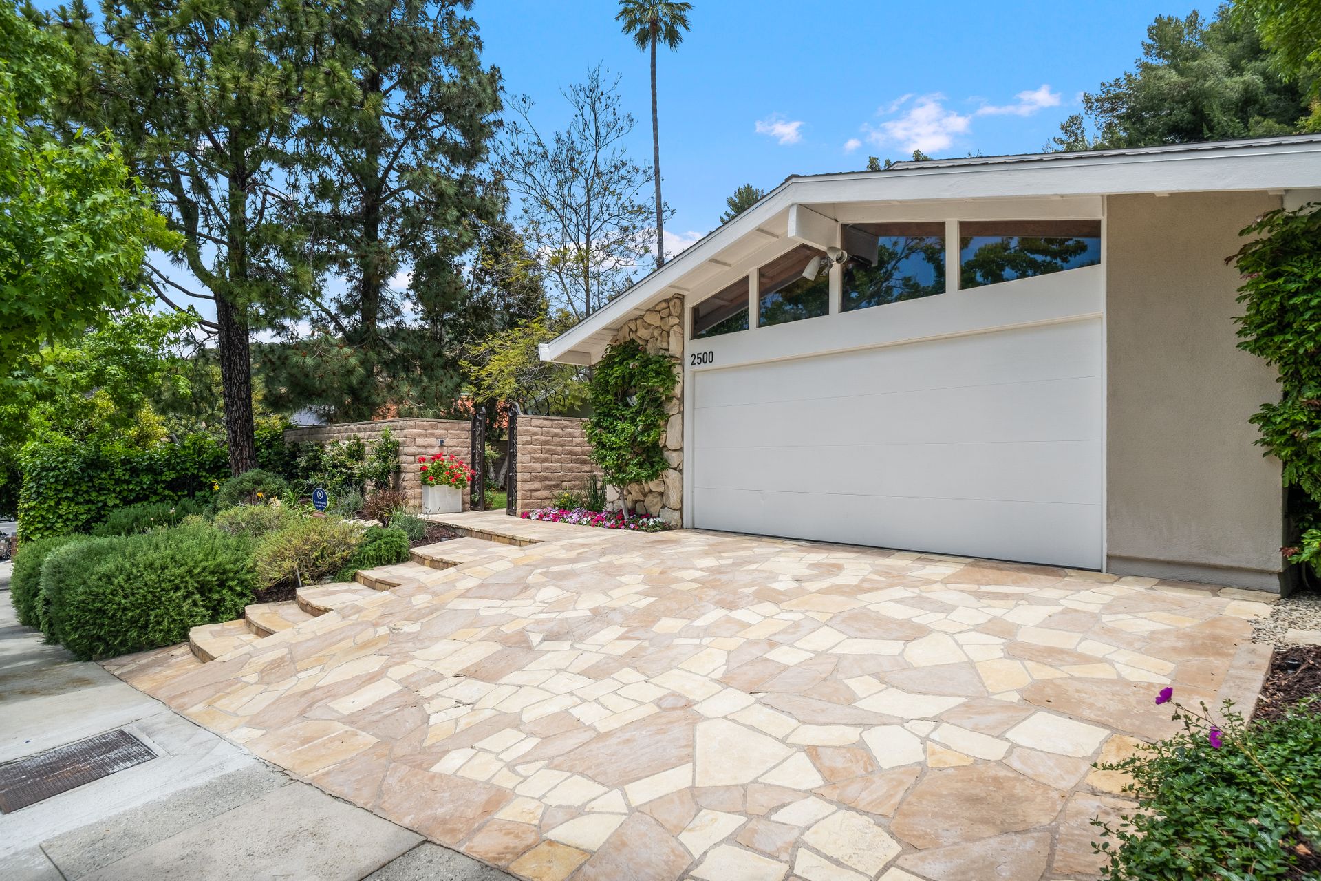 This is the mid-century modern home you've been waiting for! Step into this gated, beautifully updated, freshly painted home in the extremely serene and desirable Brentwood Hills, above Mandeville Canyon. Located on a quiet and peaceful double cul-de-sac, this home warmly greets you with a tastefully adorned flagstone hardscape and an inviting landscaped front yard. This home has an expansive backyard with a covered patio, grassy area, built-in barbecue, fire-pit and stunning landscaping perfect for entertaining. The light-filled two-story entrance opens to a spacious and well-laid-out floor plan. The main bedroom suite, located on the first floor has a cathedral ceiling, with an en-suite bath and wall-to-wall closets. A spacious living room boasts high ceilings and a gas fireplace with a Palisades stone hearth and surround with large fixed and sliding dual-paned windows, which connects to an open yet separate dining room with views and access to the picturesque backyard. Gourmet kitchen with granite countertops, high-end stainless steel appliances, custom cabinetry, eat-in breakfast area and pass through to the breakfast bar. The central hub of the house is the family room with brand-new wood flooring, built-in bookshelves with an attached desk and a sliding glass door leading out to a lovely side patio area. Two-car side-by-side garage with laundry. Upstairs are three additional bedrooms and loft landing, full bathroom and a den/office with a closet.