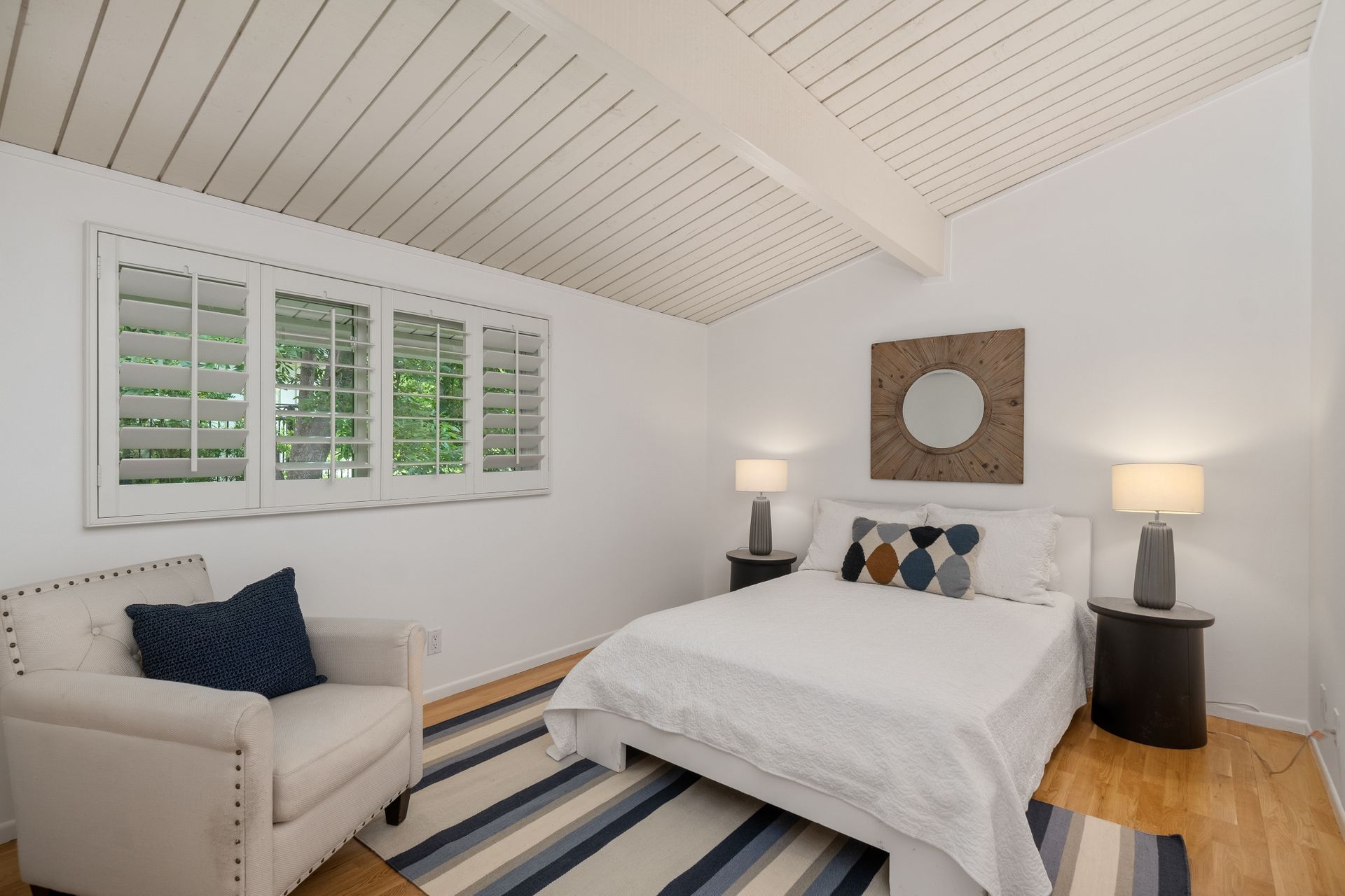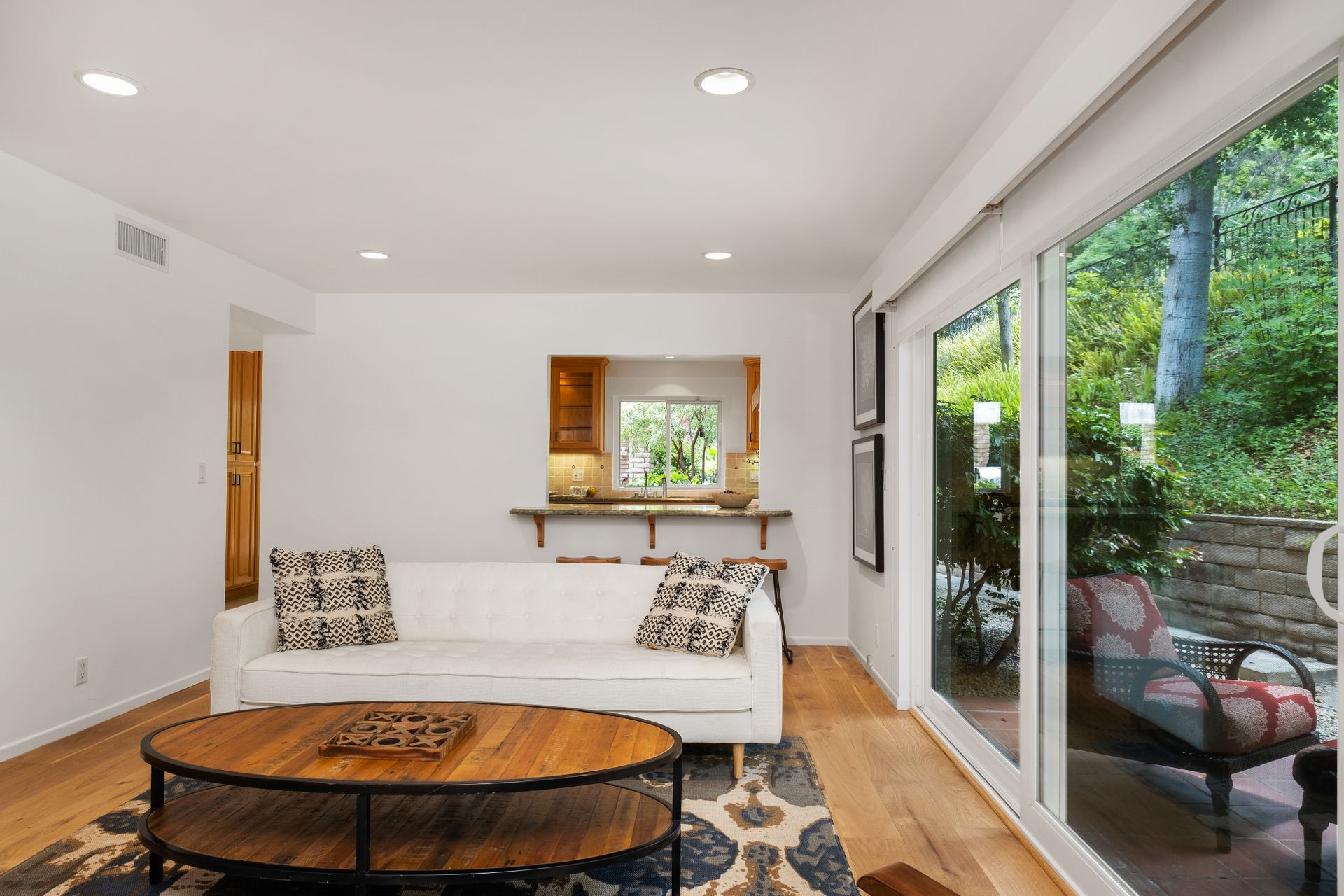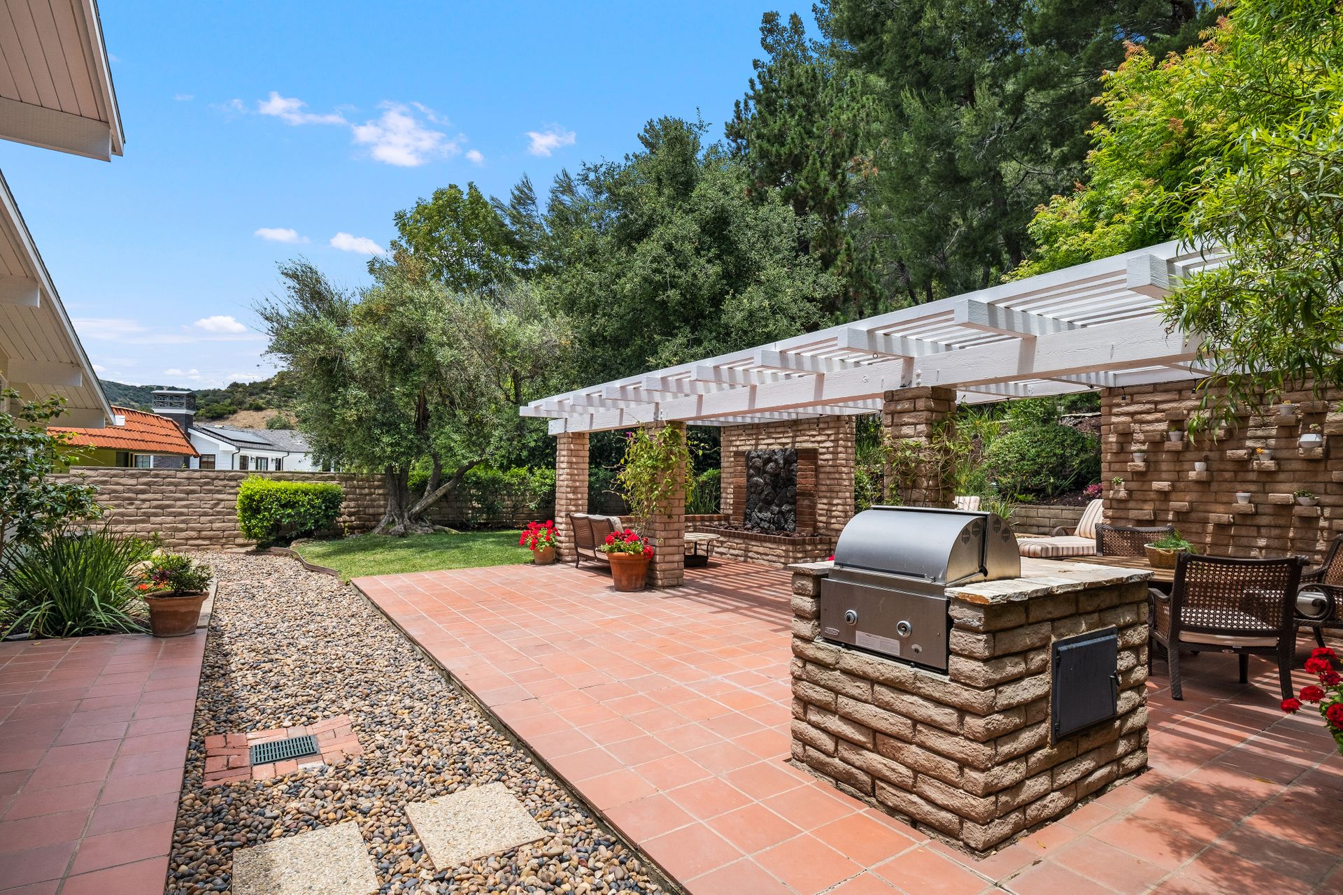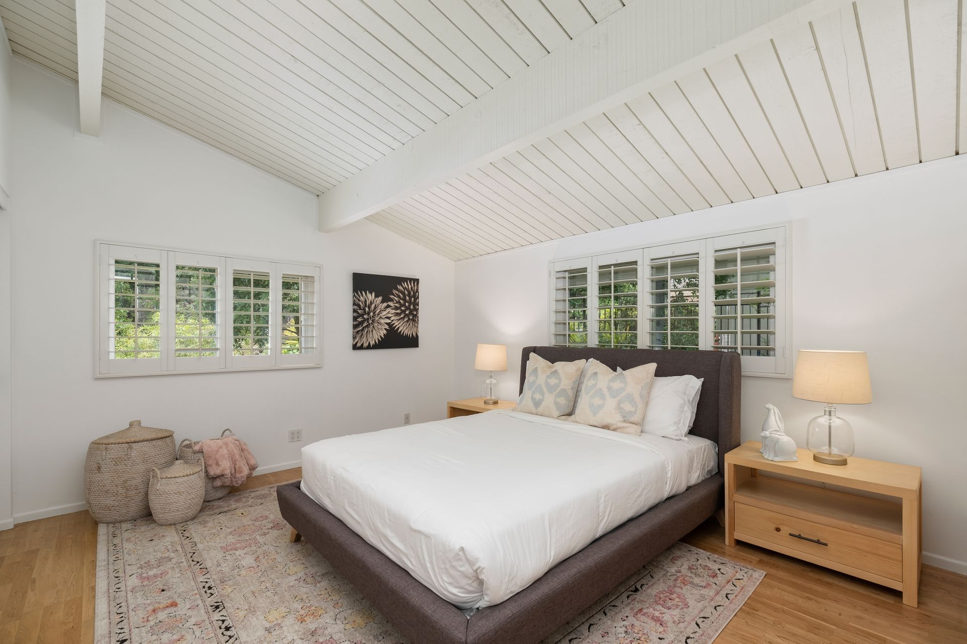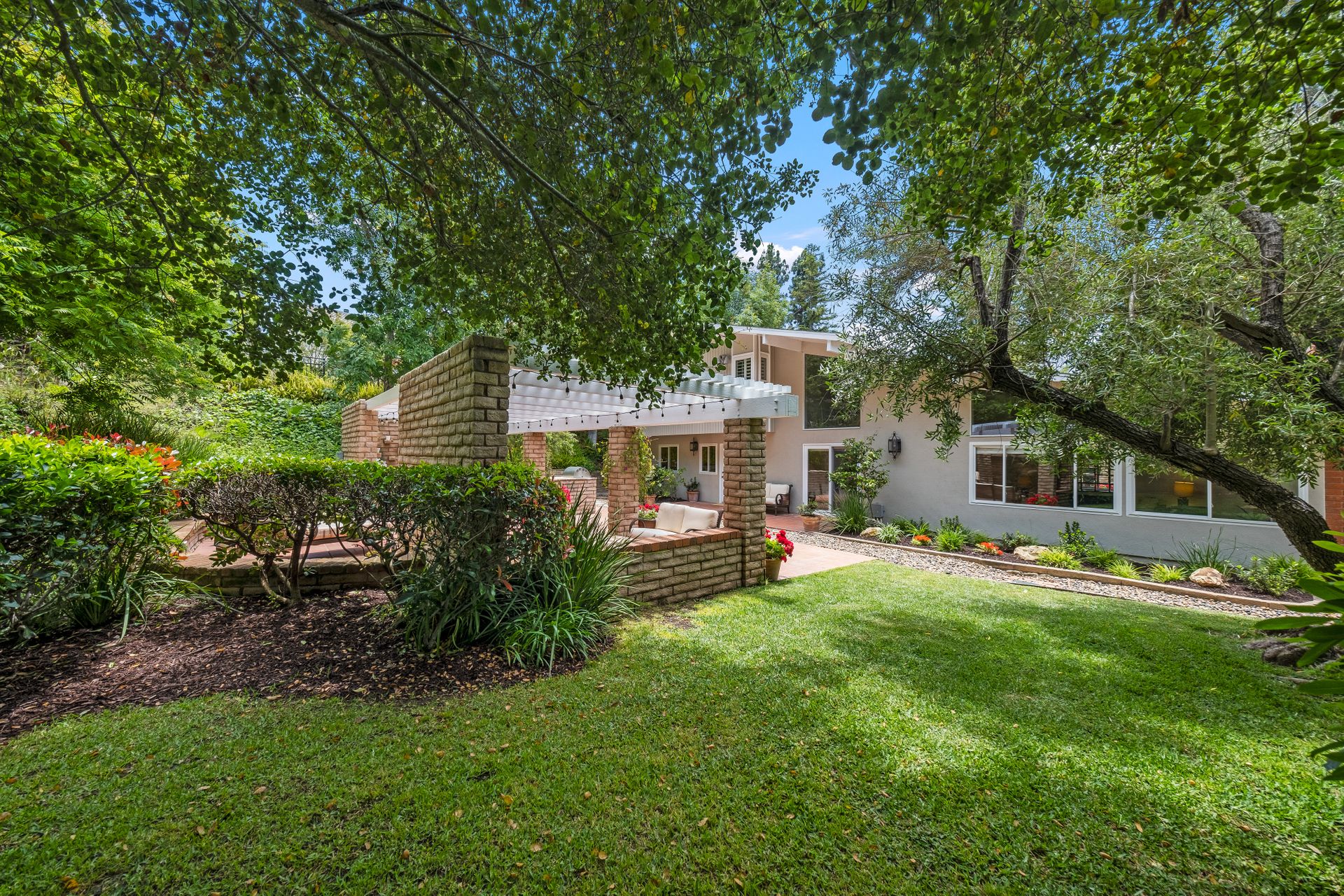 This is the mid-century modern home you've been waiting for! Step into this gated, beautifully updated, freshly painted home in the extremely serene and desirable Brentwood Hills, above Mandeville Canyon. Located on a quiet and peaceful double cul-de-sac, this home warmly greets you with a tastefully adorned flagstone hardscape and an inviting landscaped front yard. This home has an expansive backyard with a covered patio, grassy area, built-in barbecue, fire-pit and stunning landscaping perfect for entertaining. The light-filled two-story entrance opens to a spacious and well-laid-out floor plan. The main bedroom suite, located on the first floor has a cathedral ceiling, with an en-suite bath and wall-to-wall closets. A spacious living room boasts high ceilings and a gas fireplace with a Palisades stone hearth and surround with large fixed and sliding dual-paned windows, which connects to an open yet separate dining room with views and access to the picturesque backyard. Gourmet kitchen with granite countertops, high-end stainless steel appliances, custom cabinetry, eat-in breakfast area and pass through to the breakfast bar. The central hub of the house is the family room with brand-new wood flooring, built-in bookshelves with an attached desk and a sliding glass door leading out to a lovely side patio area. Two-car side-by-side garage with laundry. Upstairs are three additional bedrooms and loft landing, full bathroom and a den/office with a closet.