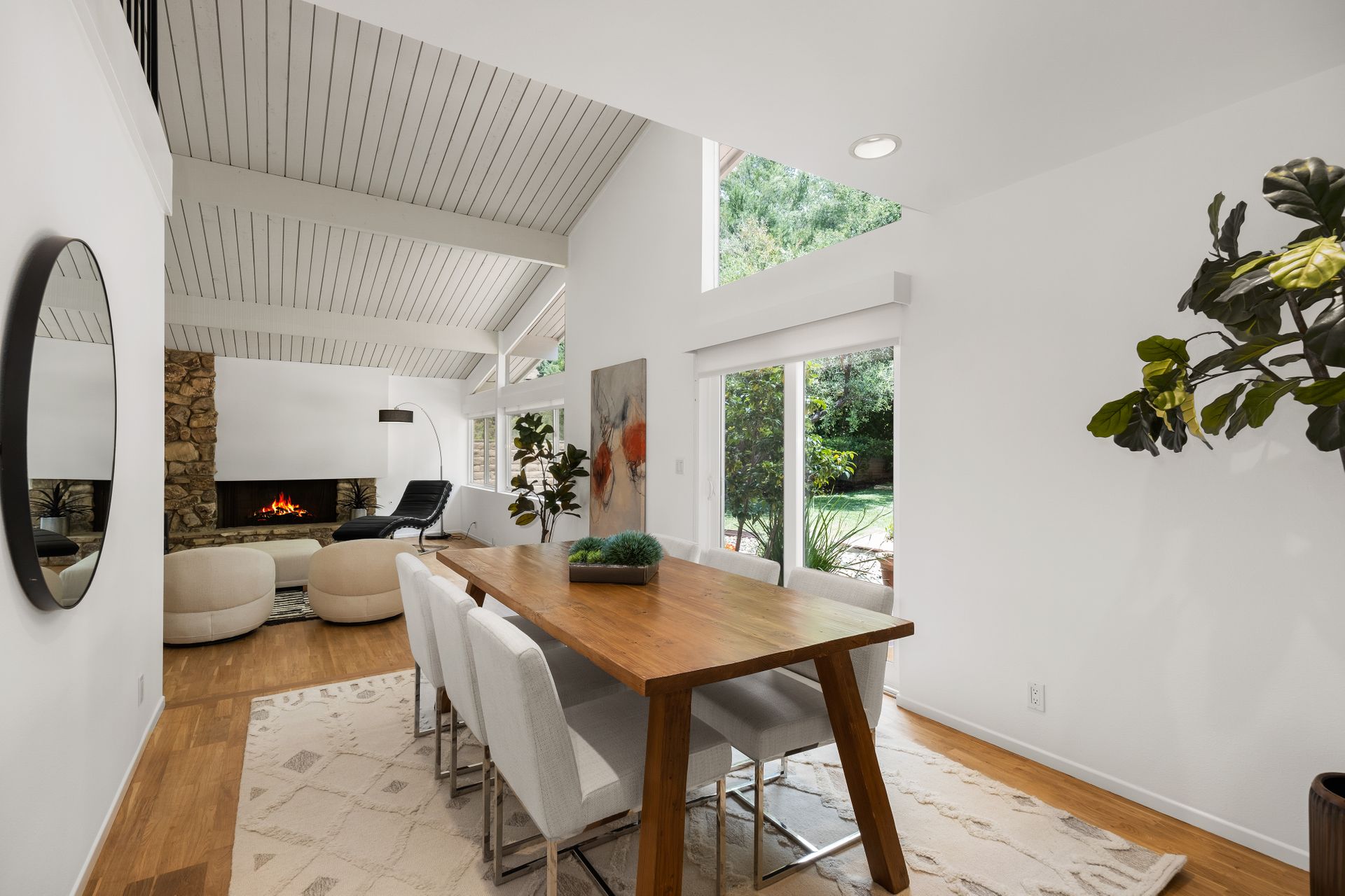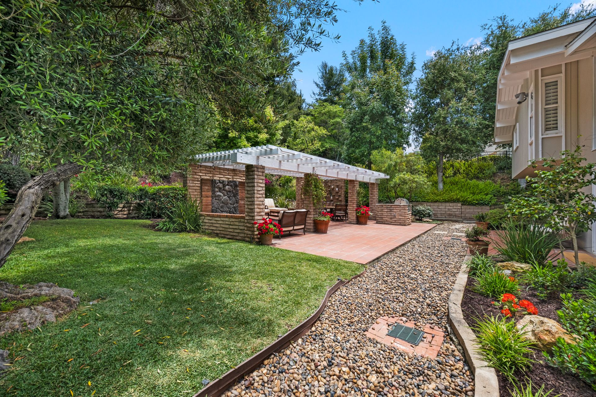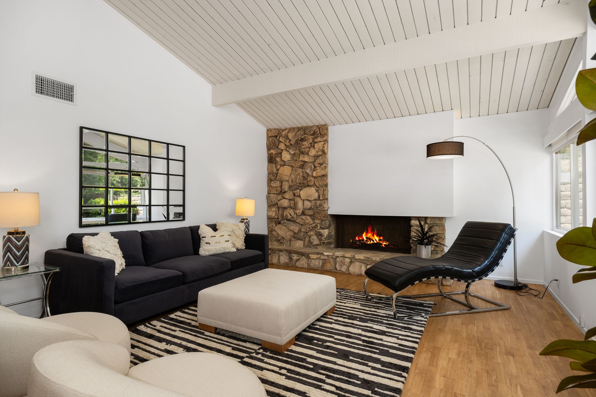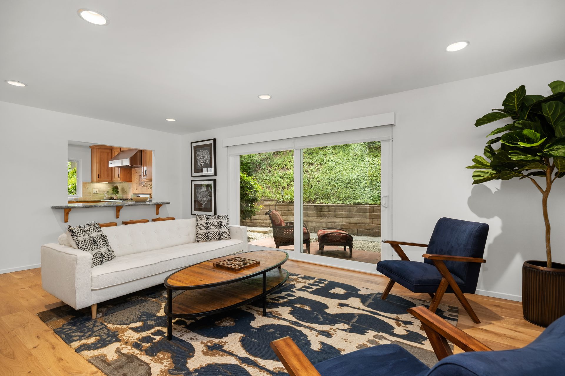 This is the mid-century modern home you've been waiting for! Step into this gated, beautifully updated, freshly painted home in the extremely serene and desirable Brentwood Hills, above Mandeville Canyon. Located on a quiet and peaceful double cul-de-sac, this home warmly greets you with a tastefully adorned flagstone hardscape and an inviting landscaped front yard. This home has an expansive backyard with a covered patio, grassy area, built-in barbecue, fire-pit and stunning landscaping perfect for entertaining. The light-filled two-story entrance opens to a spacious and well-laid-out floor plan. The main bedroom suite, located on the first floor has a cathedral ceiling, with an en-suite bath and wall-to-wall closets. A spacious living room boasts high ceilings and a gas fireplace with a Palisades stone hearth and surround with large fixed and sliding dual-paned windows, which connects to an open yet separate dining room with views and access to the picturesque backyard. Gourmet kitchen with granite countertops, high-end stainless steel appliances, custom cabinetry, eat-in breakfast area and pass through to the breakfast bar. The central hub of the house is the family room with brand-new wood flooring, built-in bookshelves with an attached desk and a sliding glass door leading out to a lovely side patio area. Two-car side-by-side garage with laundry. Upstairs are three additional bedrooms and loft landing, full bathroom and a den/office with a closet.