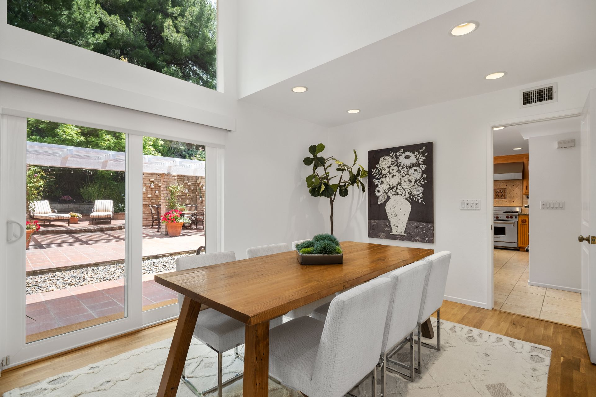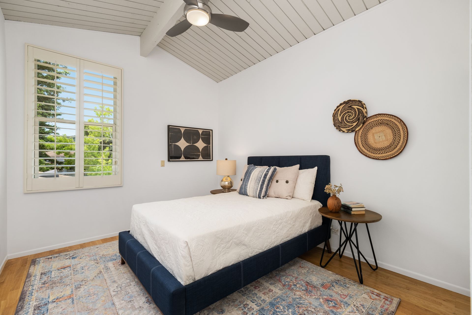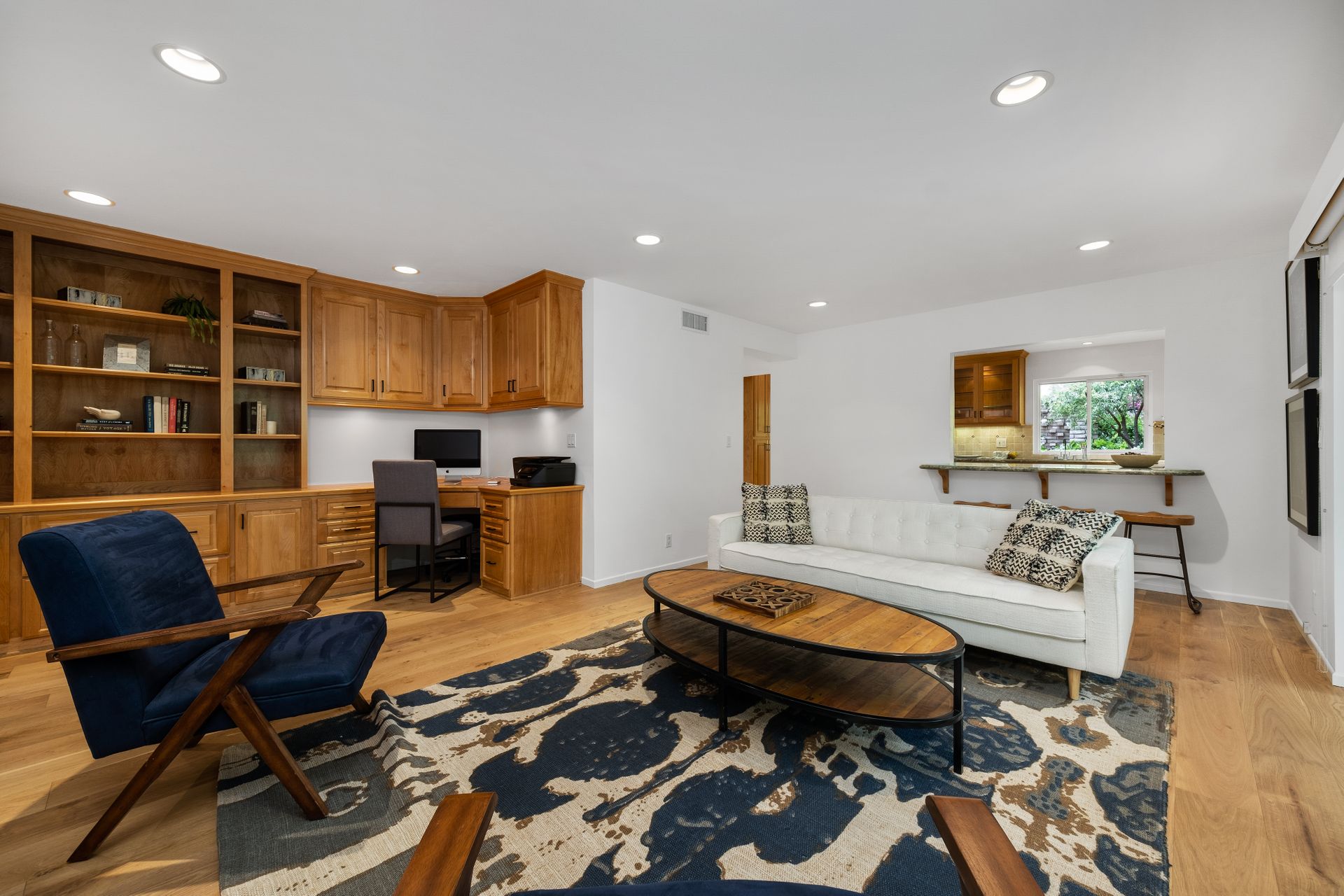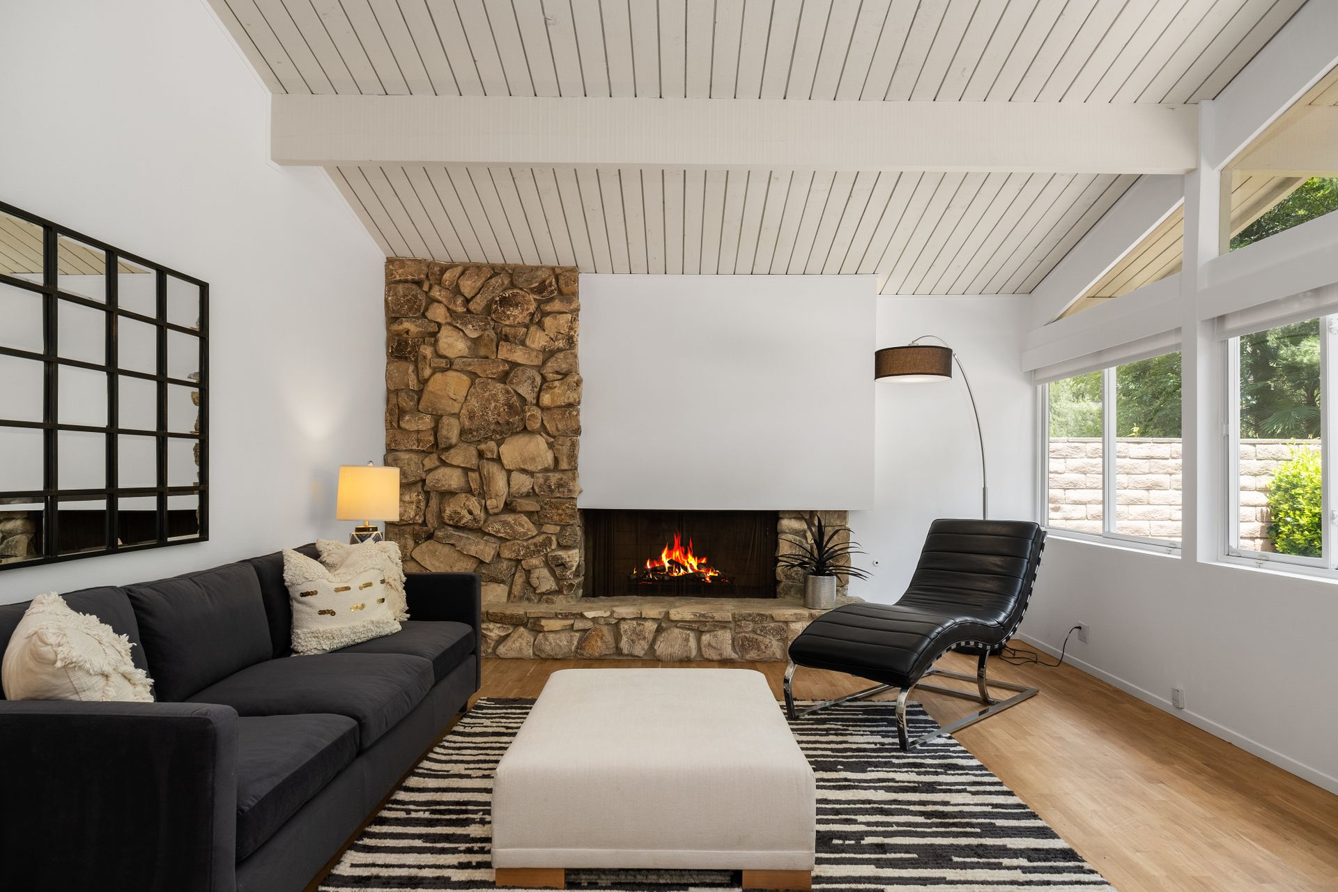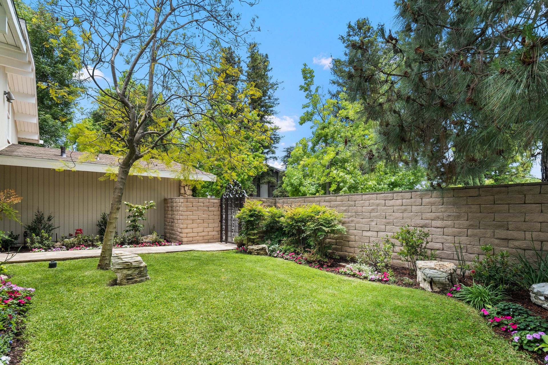 This is the mid-century modern home you've been waiting for! Step into this gated, beautifully updated, freshly painted home in the extremely serene and desirable Brentwood Hills, above Mandeville Canyon. Located on a quiet and peaceful double cul-de-sac, this home warmly greets you with a tastefully adorned flagstone hardscape and an inviting landscaped front yard. This home has an expansive backyard with a covered patio, grassy area, built-in barbecue, fire-pit and stunning landscaping perfect for entertaining. The light-filled two-story entrance opens to a spacious and well-laid-out floor plan. The main bedroom suite, located on the first floor has a cathedral ceiling, with an en-suite bath and wall-to-wall closets. A spacious living room boasts high ceilings and a gas fireplace with a Palisades stone hearth and surround with large fixed and sliding dual-paned windows, which connects to an open yet separate dining room with views and access to the picturesque backyard. Gourmet kitchen with granite countertops, high-end stainless steel appliances, custom cabinetry, eat-in breakfast area and pass through to the breakfast bar. The central hub of the house is the family room with brand-new wood flooring, built-in bookshelves with an attached desk and a sliding glass door leading out to a lovely side patio area. Two-car side-by-side garage with laundry. Upstairs are three additional bedrooms and loft landing, full bathroom and a den/office with a closet.