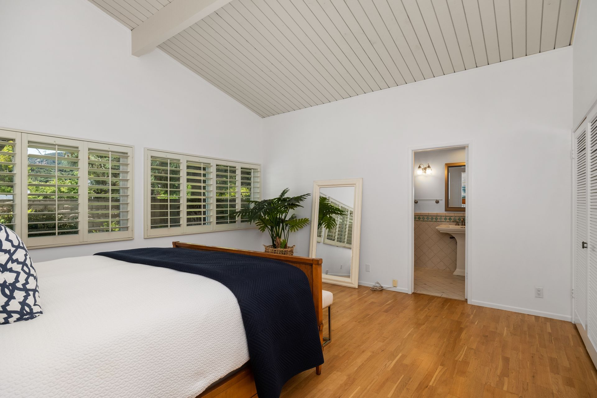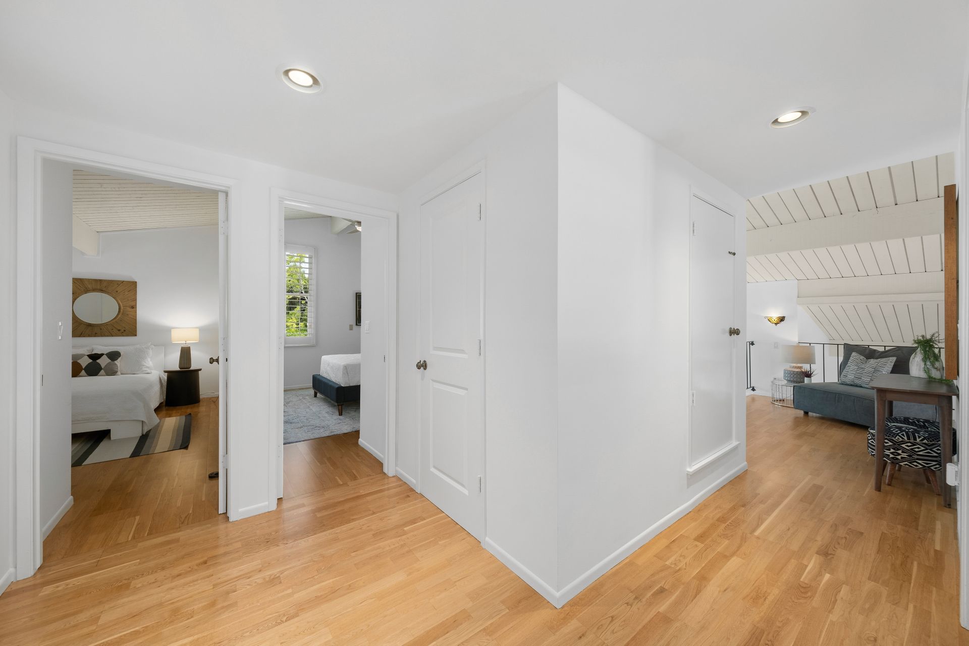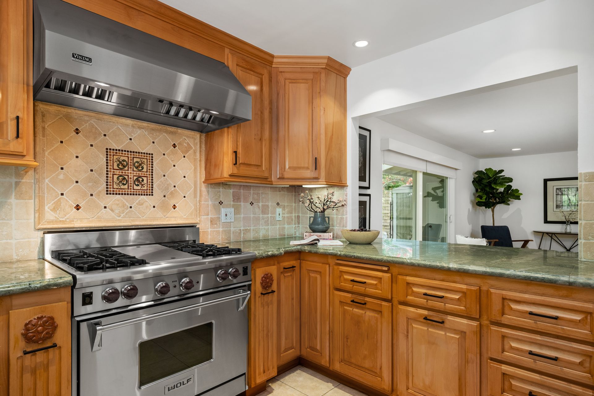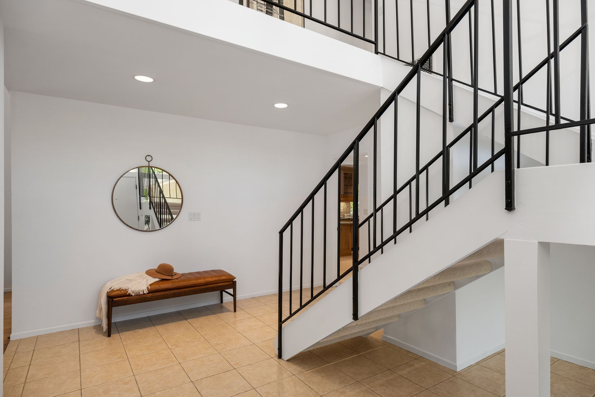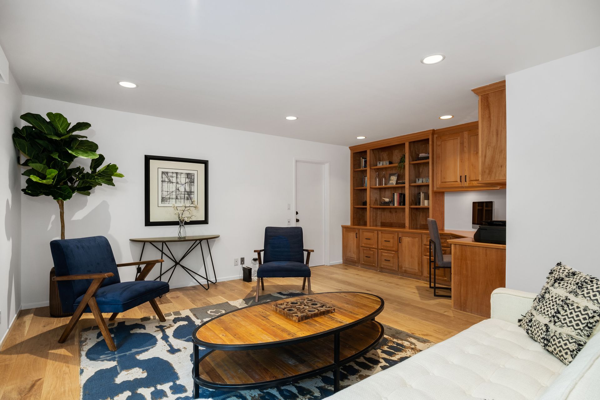 This is the mid-century modern home you've been waiting for! Step into this gated, beautifully updated, freshly painted home in the extremely serene and desirable Brentwood Hills, above Mandeville Canyon. Located on a quiet and peaceful double cul-de-sac, this home warmly greets you with a tastefully adorned flagstone hardscape and an inviting landscaped front yard. This home has an expansive backyard with a covered patio, grassy area, built-in barbecue, fire-pit and stunning landscaping perfect for entertaining. The light-filled two-story entrance opens to a spacious and well-laid-out floor plan. The main bedroom suite, located on the first floor has a cathedral ceiling, with an en-suite bath and wall-to-wall closets. A spacious living room boasts high ceilings and a gas fireplace with a Palisades stone hearth and surround with large fixed and sliding dual-paned windows, which connects to an open yet separate dining room with views and access to the picturesque backyard. Gourmet kitchen with granite countertops, high-end stainless steel appliances, custom cabinetry, eat-in breakfast area and pass through to the breakfast bar. The central hub of the house is the family room with brand-new wood flooring, built-in bookshelves with an attached desk and a sliding glass door leading out to a lovely side patio area. Two-car side-by-side garage with laundry. Upstairs are three additional bedrooms and loft landing, full bathroom and a den/office with a closet.