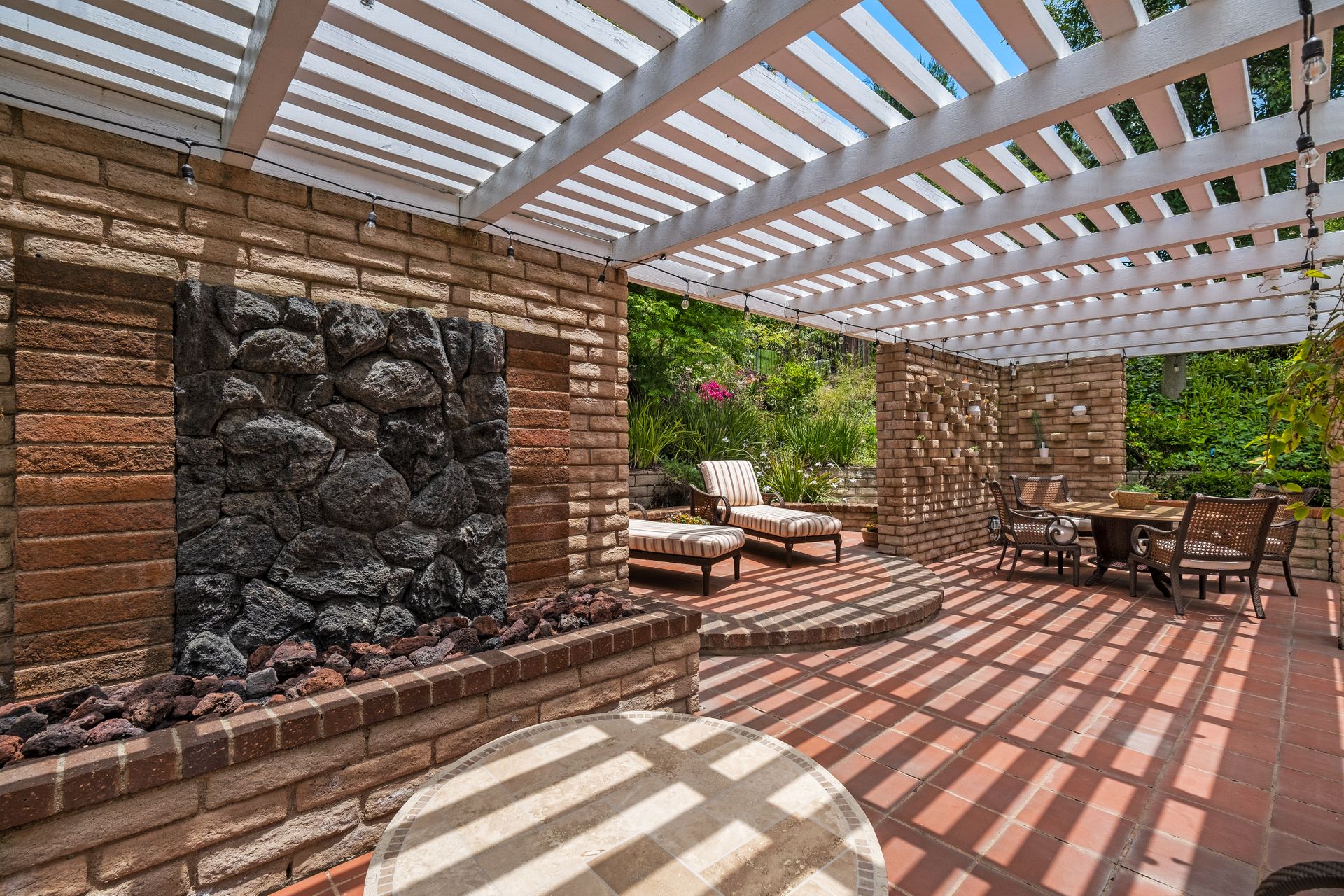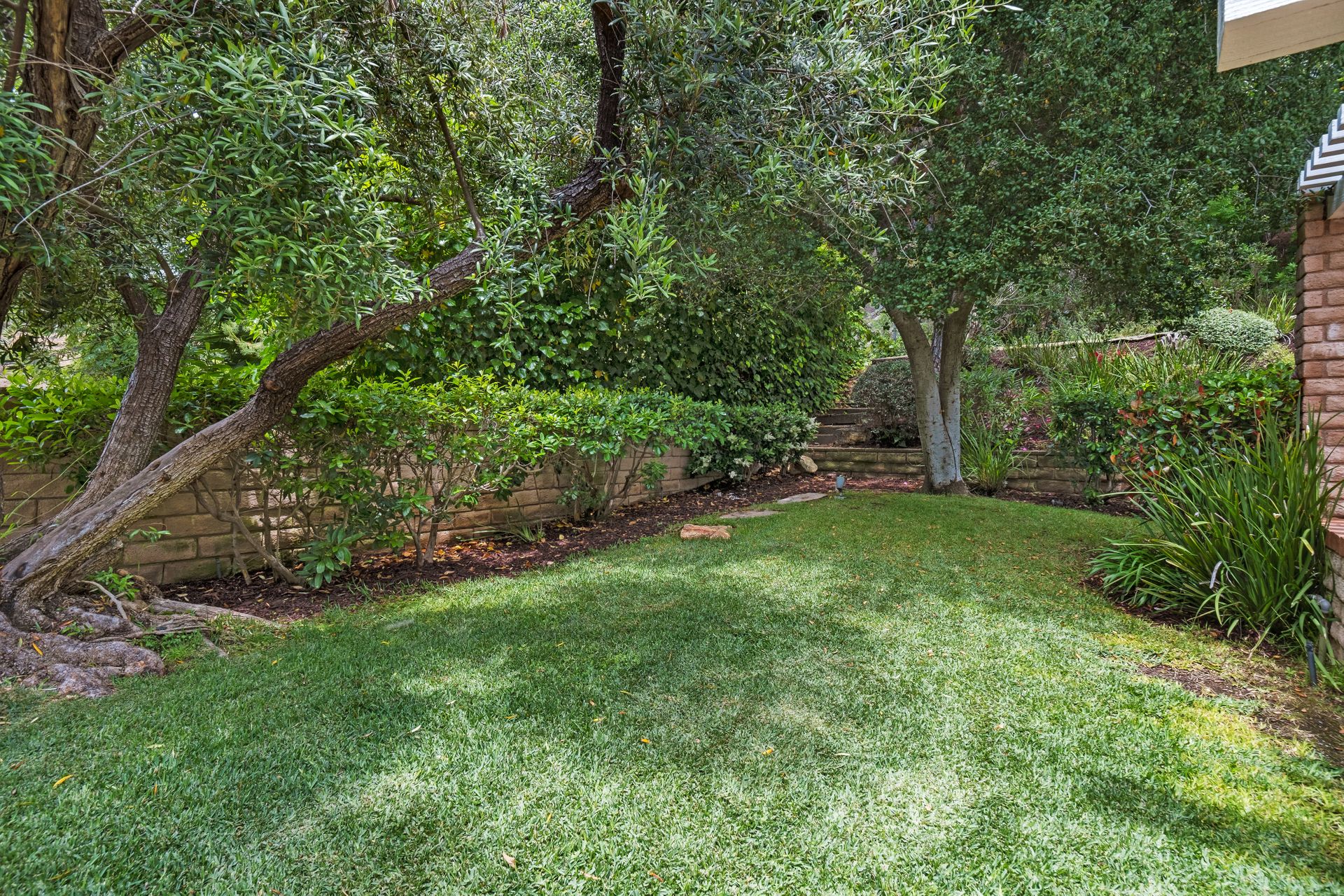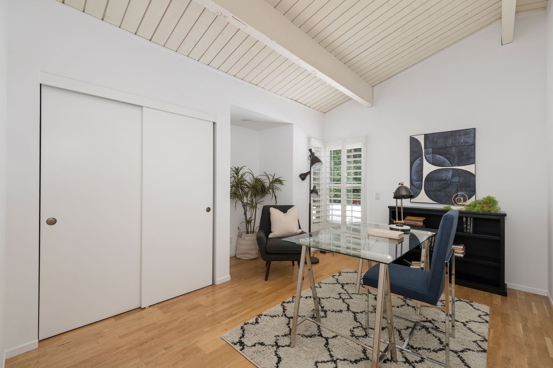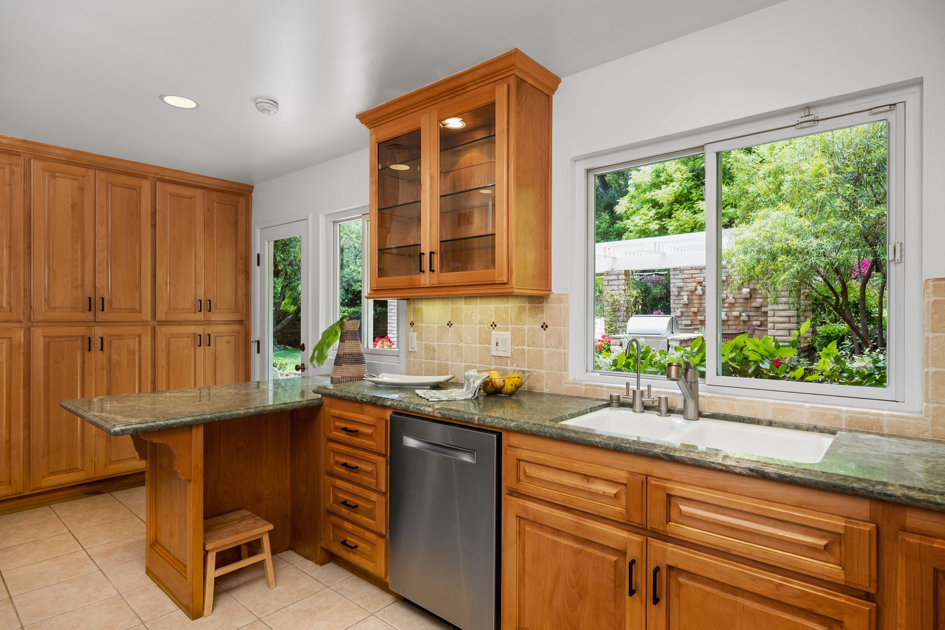 This is the mid-century modern home you've been waiting for! Step into this gated, beautifully updated, freshly painted home in the extremely serene and desirable Brentwood Hills, above Mandeville Canyon. Located on a quiet and peaceful double cul-de-sac, this home warmly greets you with a tastefully adorned flagstone hardscape and an inviting landscaped front yard. This home has an expansive backyard with a covered patio, grassy area, built-in barbecue, fire-pit and stunning landscaping perfect for entertaining. The light-filled two-story entrance opens to a spacious and well-laid-out floor plan. The main bedroom suite, located on the first floor has a cathedral ceiling, with an en-suite bath and wall-to-wall closets. A spacious living room boasts high ceilings and a gas fireplace with a Palisades stone hearth and surround with large fixed and sliding dual-paned windows, which connects to an open yet separate dining room with views and access to the picturesque backyard. Gourmet kitchen with granite countertops, high-end stainless steel appliances, custom cabinetry, eat-in breakfast area and pass through to the breakfast bar. The central hub of the house is the family room with brand-new wood flooring, built-in bookshelves with an attached desk and a sliding glass door leading out to a lovely side patio area. Two-car side-by-side garage with laundry. Upstairs are three additional bedrooms and loft landing, full bathroom and a den/office with a closet.