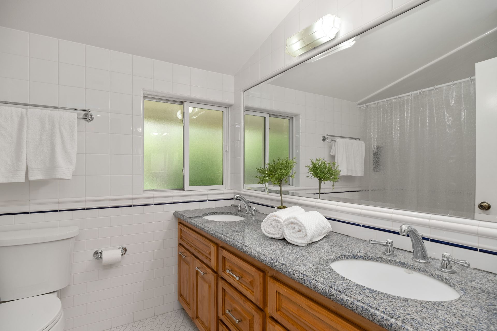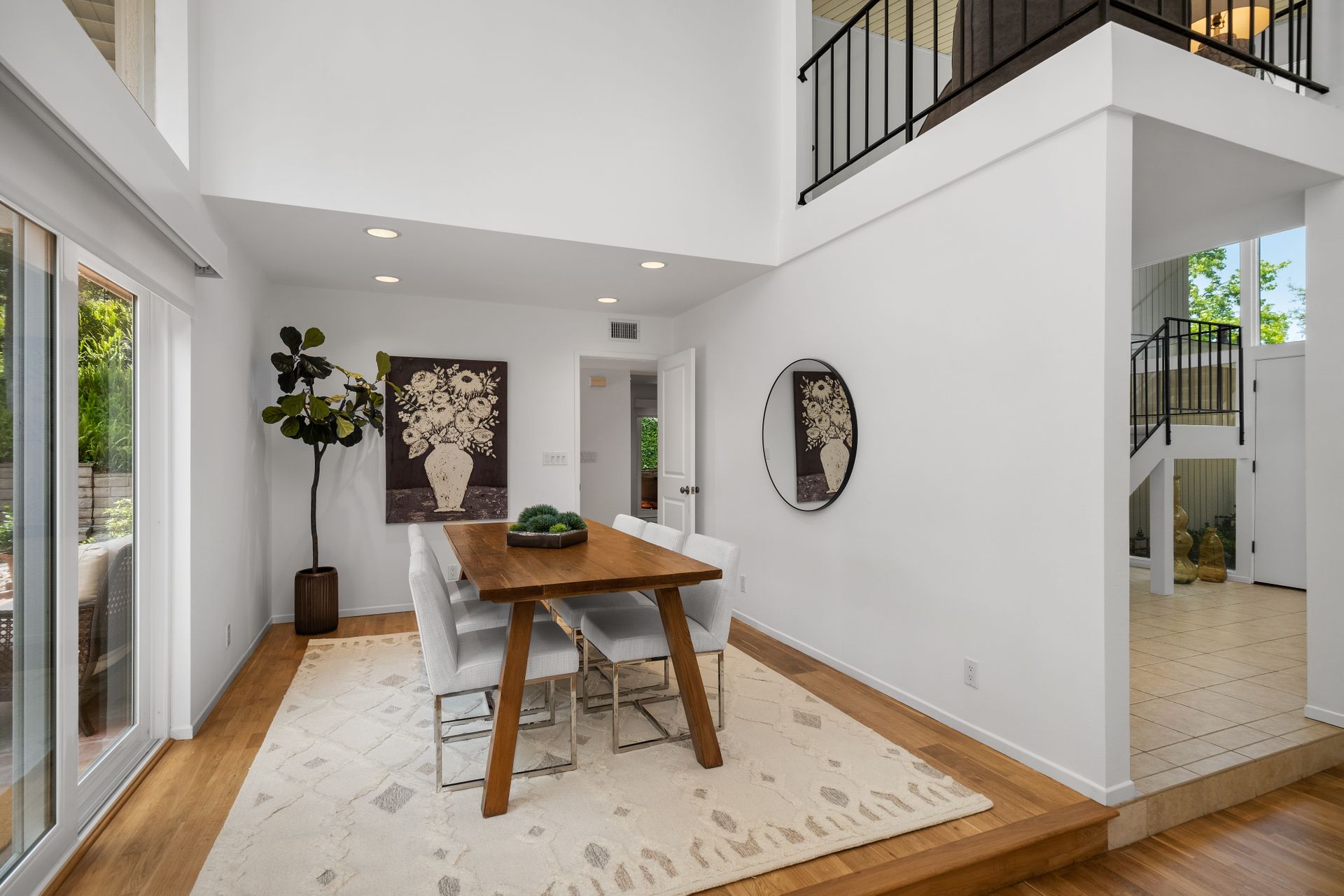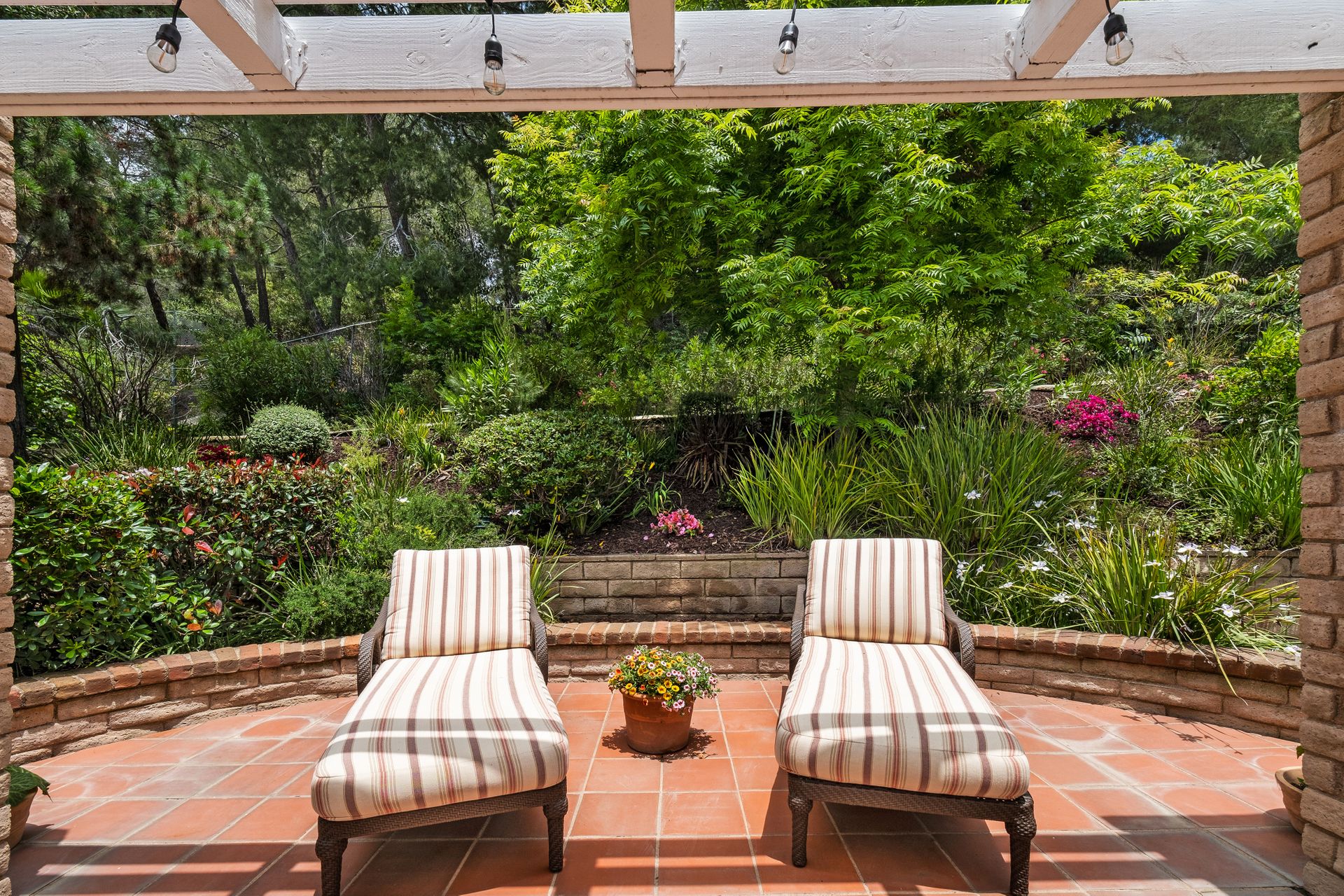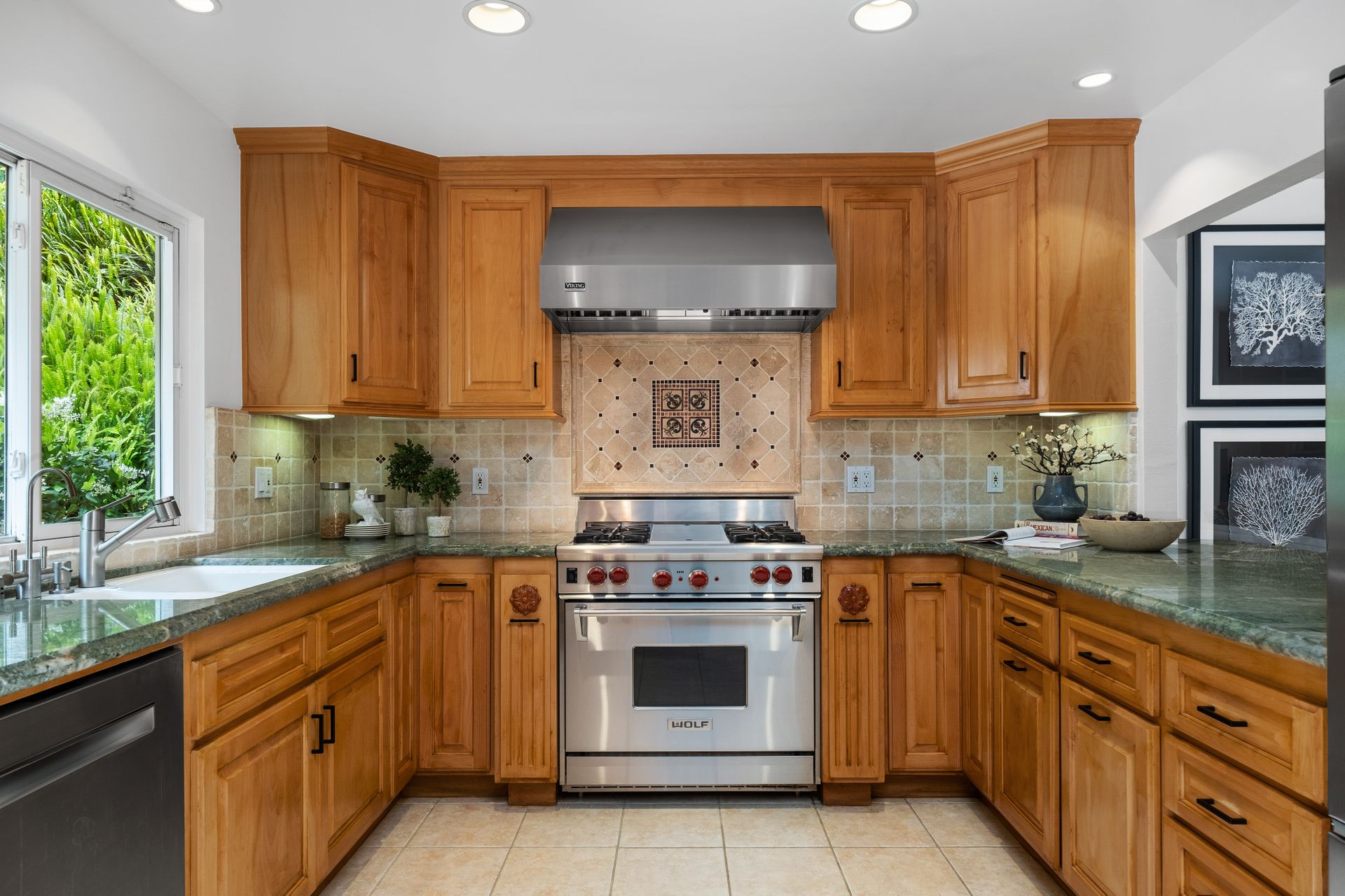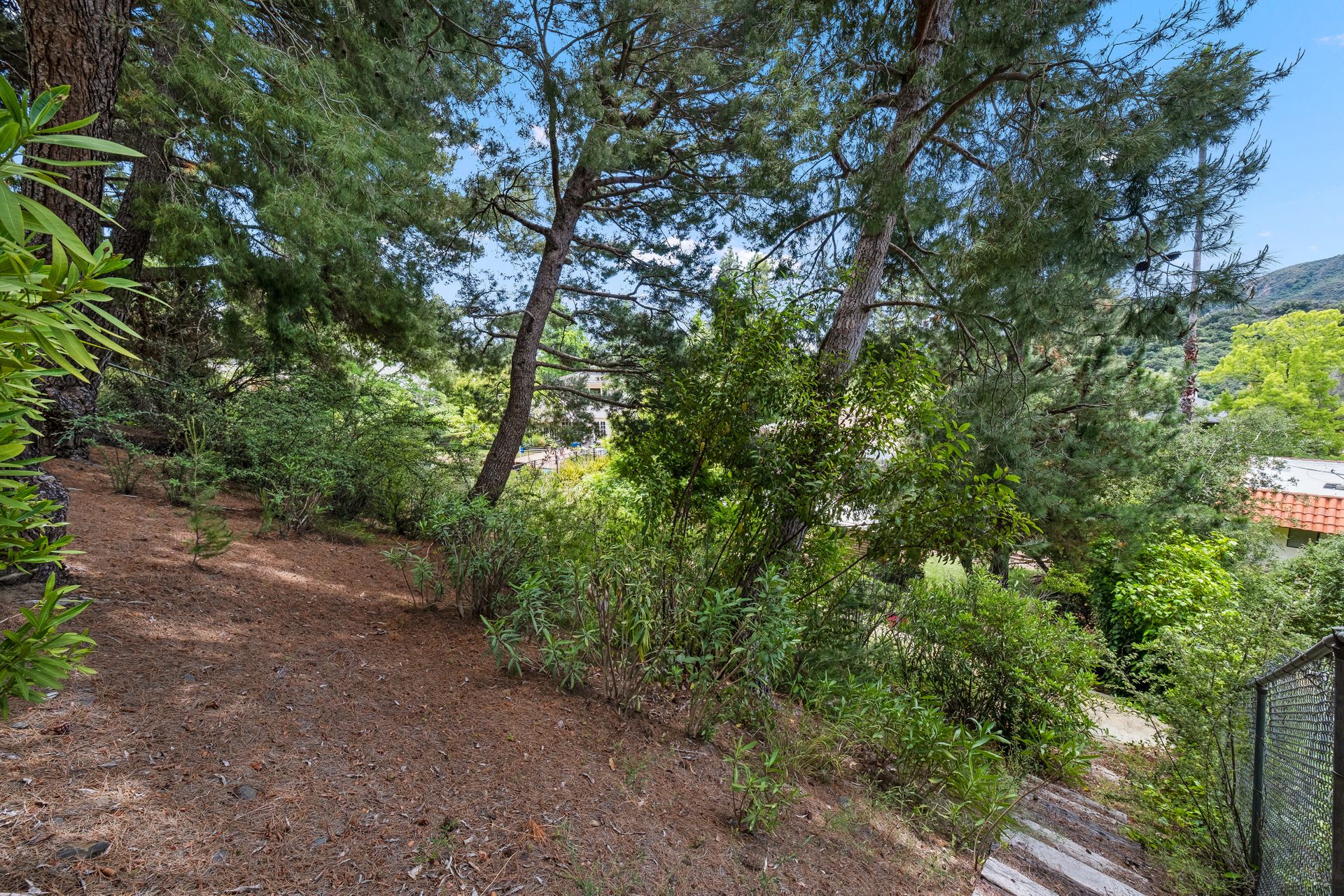 This is the mid-century modern home you've been waiting for! Step into this gated, beautifully updated, freshly painted home in the extremely serene and desirable Brentwood Hills, above Mandeville Canyon. Located on a quiet and peaceful double cul-de-sac, this home warmly greets you with a tastefully adorned flagstone hardscape and an inviting landscaped front yard. This home has an expansive backyard with a covered patio, grassy area, built-in barbecue, fire-pit and stunning landscaping perfect for entertaining. The light-filled two-story entrance opens to a spacious and well-laid-out floor plan. The main bedroom suite, located on the first floor has a cathedral ceiling, with an en-suite bath and wall-to-wall closets. A spacious living room boasts high ceilings and a gas fireplace with a Palisades stone hearth and surround with large fixed and sliding dual-paned windows, which connects to an open yet separate dining room with views and access to the picturesque backyard. Gourmet kitchen with granite countertops, high-end stainless steel appliances, custom cabinetry, eat-in breakfast area and pass through to the breakfast bar. The central hub of the house is the family room with brand-new wood flooring, built-in bookshelves with an attached desk and a sliding glass door leading out to a lovely side patio area. Two-car side-by-side garage with laundry. Upstairs are three additional bedrooms and loft landing, full bathroom and a den/office with a closet.