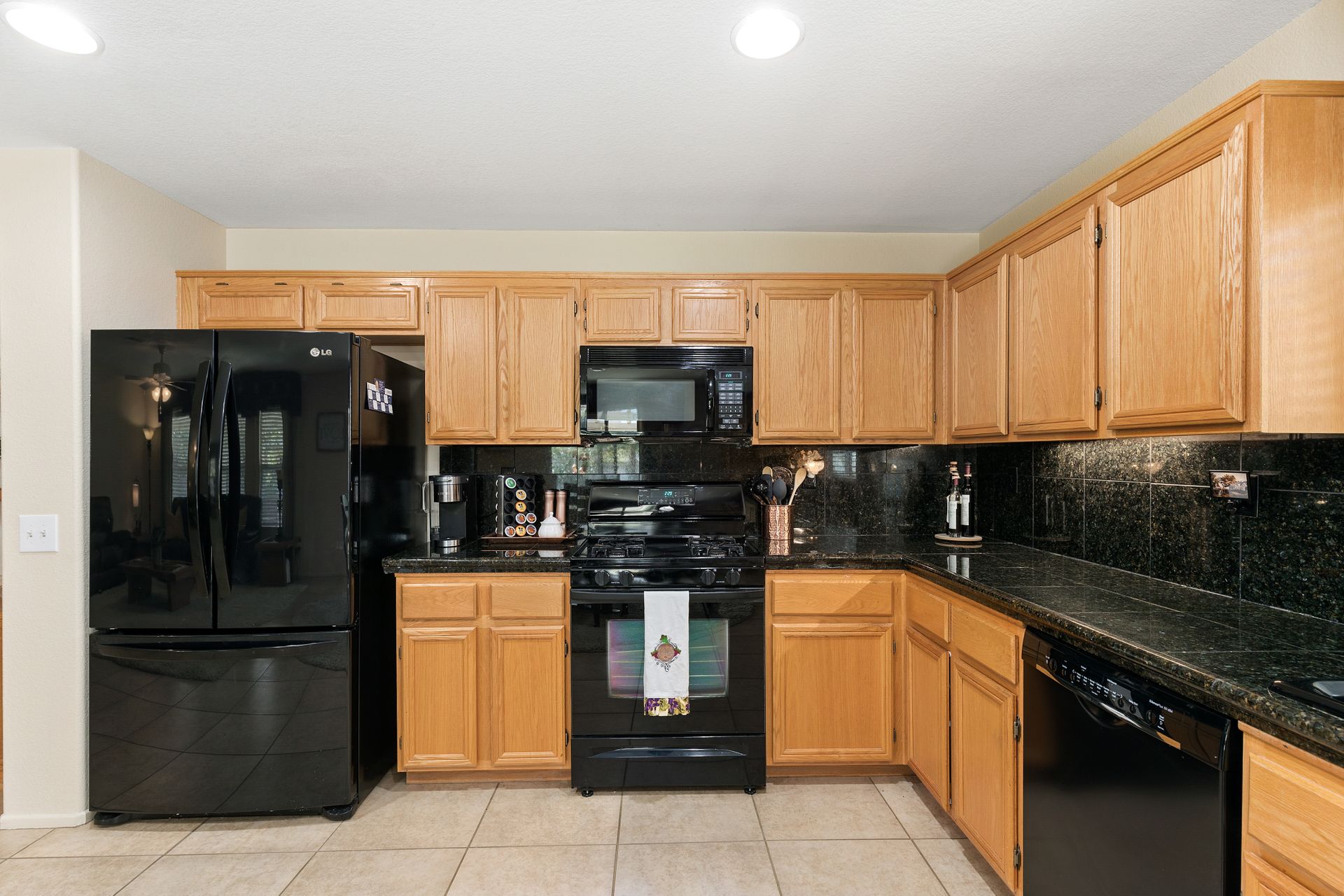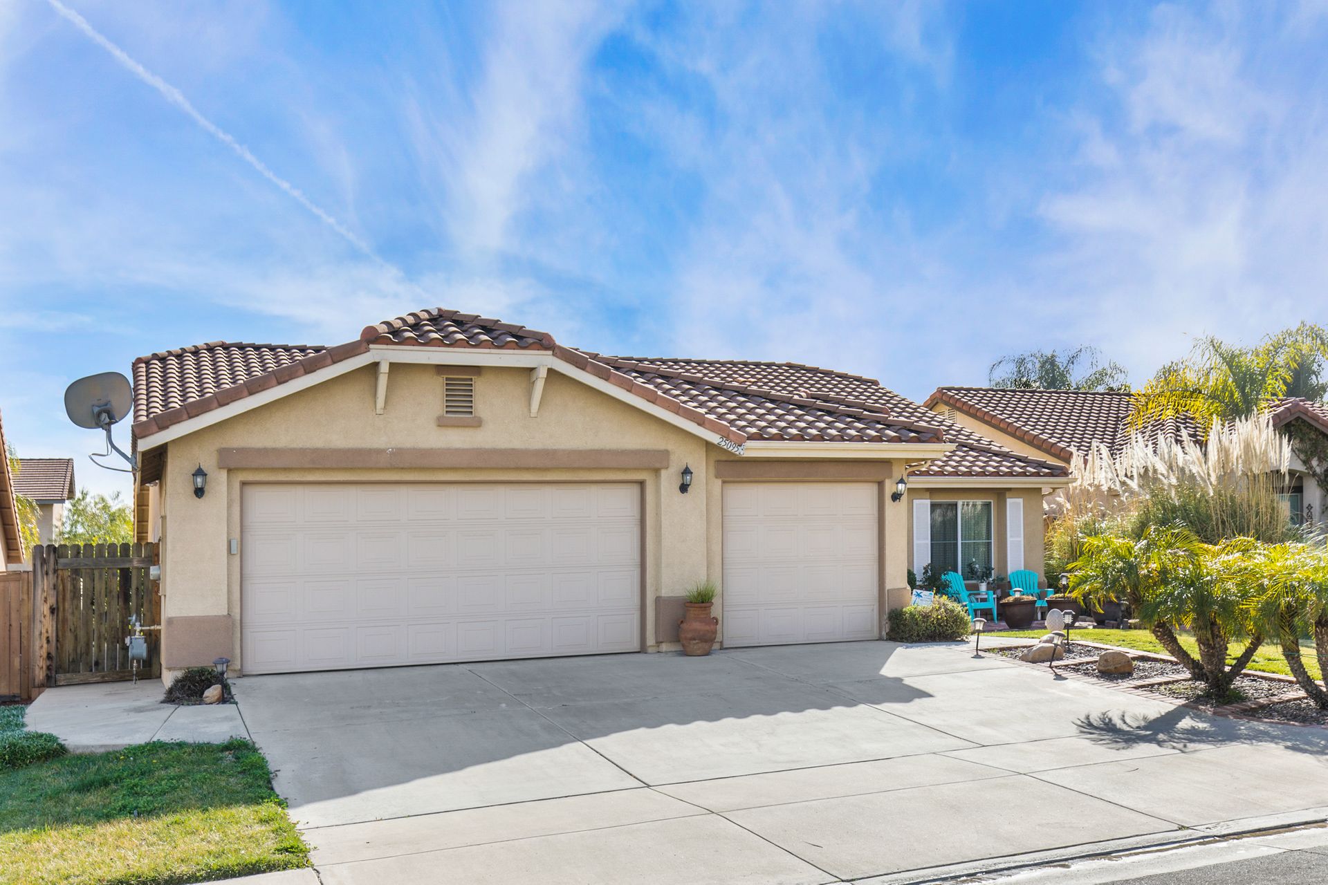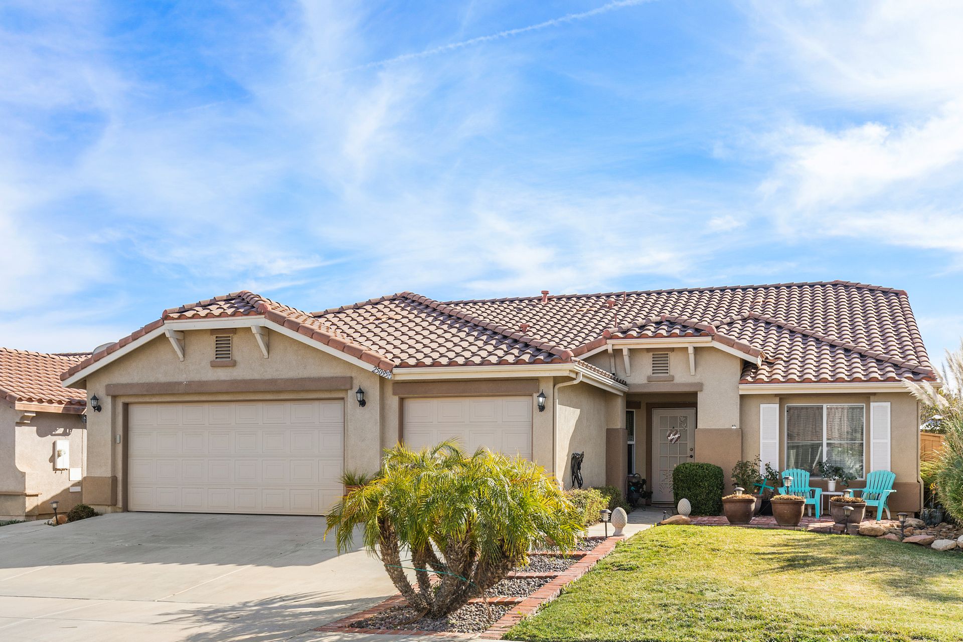 Welcome to this beautiful, single story ranch style home in West Menifee. The formal living room is inviting upon entry with the open floorplan and high, 10-foot ceilings. As you make your way through the main walkway, you’ll follow the large tile flooring through to the large, open family room with an adjoining kitchen. This great room comes with floor rugs, window coverings, a ceiling fan, canned lights, built-in TV curio cabinets and tons of natural light. The kitchen features black granite counters and backsplash and matching black appliances. You will be sure to enjoy all the storage this kitchen has to offer. There are plenty of cabinets, cupboards come with pull out drawers for easy access and deep shelves in the pantry. I know you’ll also appreciate the many outlets along the backsplash! Enter the spacious owner’s suite through double doors just past the living room. This room is airy and romantic with its white blinds and sheer window coverings. It has a large walk-in closet with built-in shelves and the bathroom is upgraded with a natural color stone tile countertop, a personal linen closet, a walk-in tile shower and tile flooring. There are two good size bedrooms down a separate hallway with a full bathroom near the indoor laundry room which is adjacent to the three-car garage for house access. One other feature that makes this house even more perfect is the bonus space with built-in shelving across from the living room. So many options!!