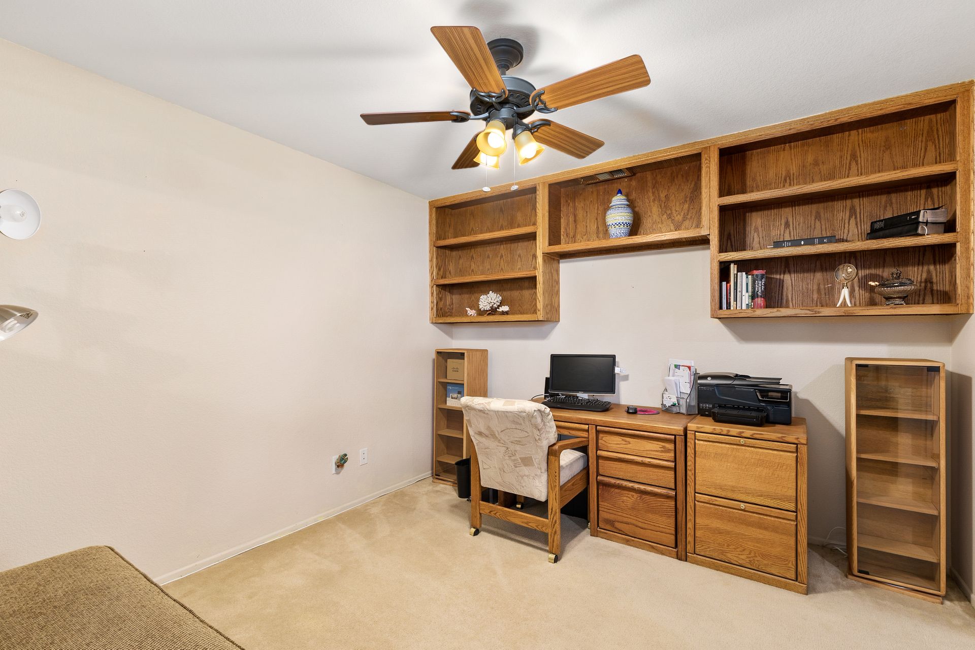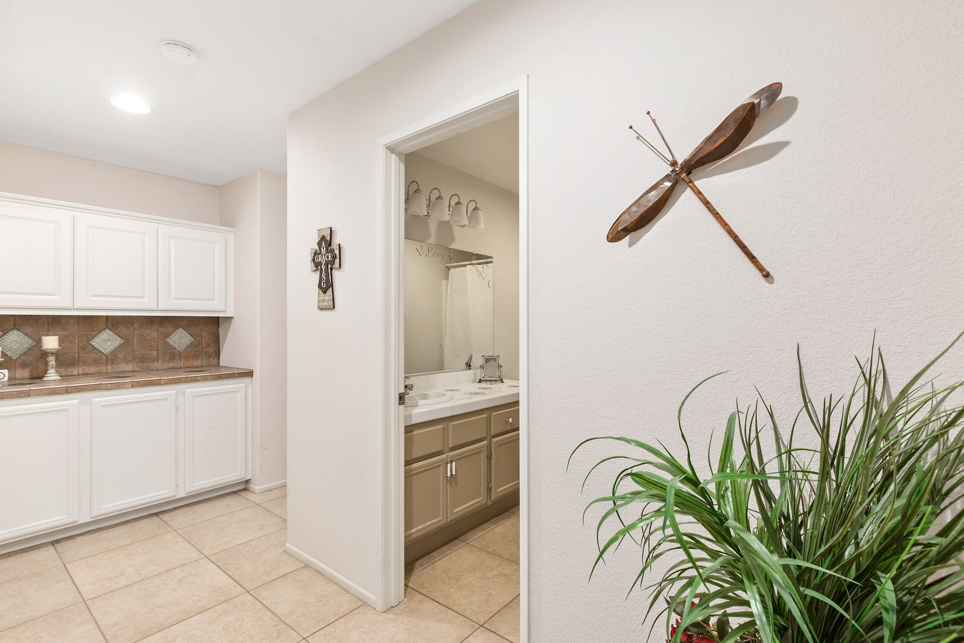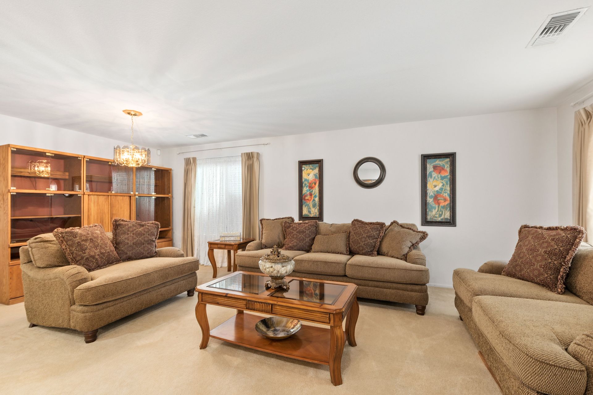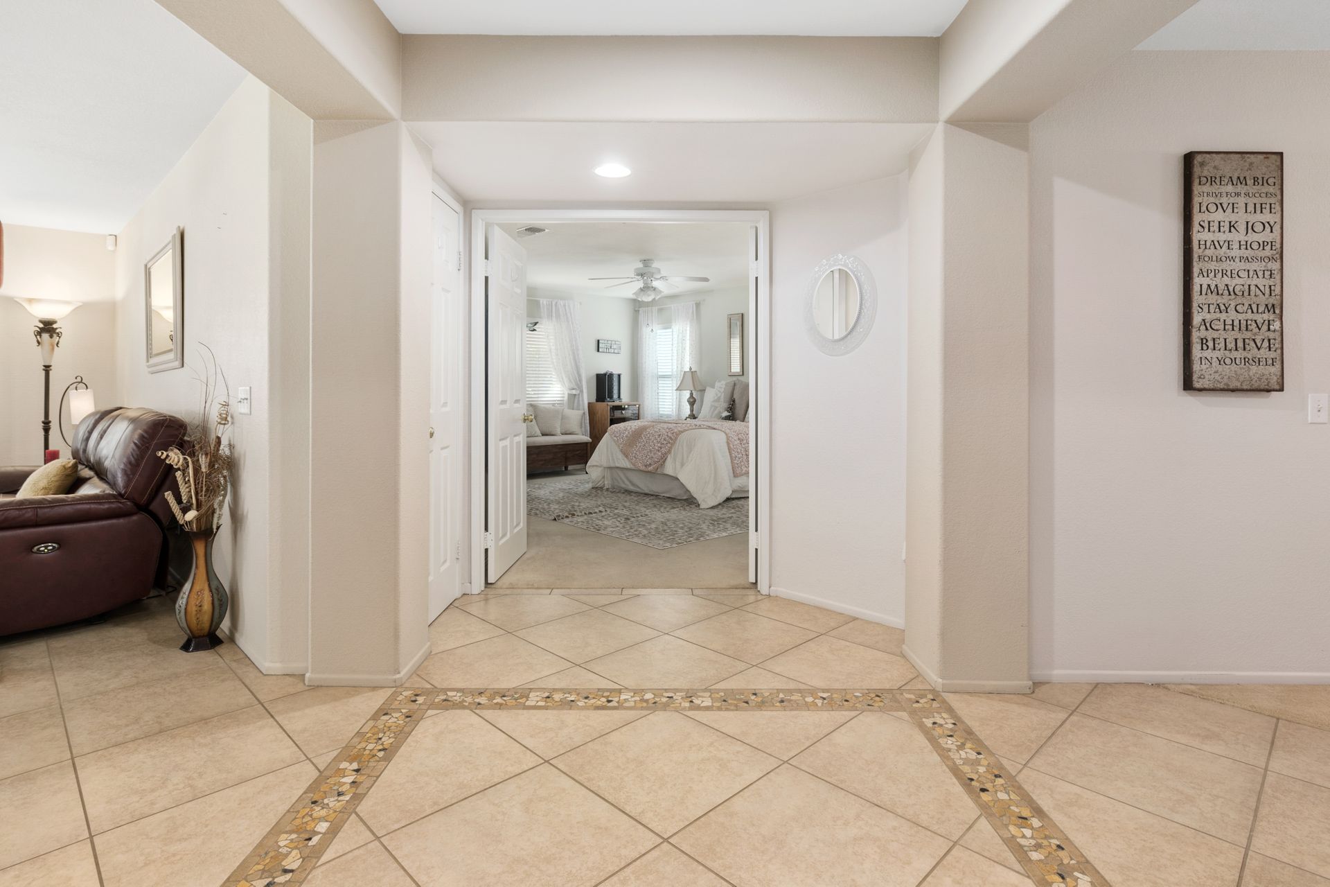 Welcome to this beautiful, single story ranch style home in West Menifee. The formal living room is inviting upon entry with the open floorplan and high, 10-foot ceilings. As you make your way through the main walkway, you’ll follow the large tile flooring through to the large, open family room with an adjoining kitchen. This great room comes with floor rugs, window coverings, a ceiling fan, canned lights, built-in TV curio cabinets and tons of natural light. The kitchen features black granite counters and backsplash and matching black appliances. You will be sure to enjoy all the storage this kitchen has to offer. There are plenty of cabinets, cupboards come with pull out drawers for easy access and deep shelves in the pantry. I know you’ll also appreciate the many outlets along the backsplash! Enter the spacious owner’s suite through double doors just past the living room. This room is airy and romantic with its white blinds and sheer window coverings. It has a large walk-in closet with built-in shelves and the bathroom is upgraded with a natural color stone tile countertop, a personal linen closet, a walk-in tile shower and tile flooring. There are two good size bedrooms down a separate hallway with a full bathroom near the indoor laundry room which is adjacent to the three-car garage for house access. One other feature that makes this house even more perfect is the bonus space with built-in shelving across from the living room. So many options!!