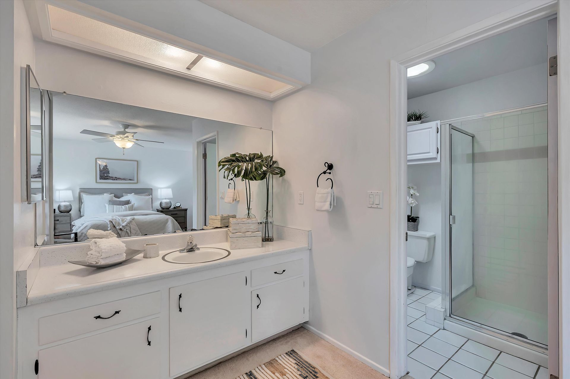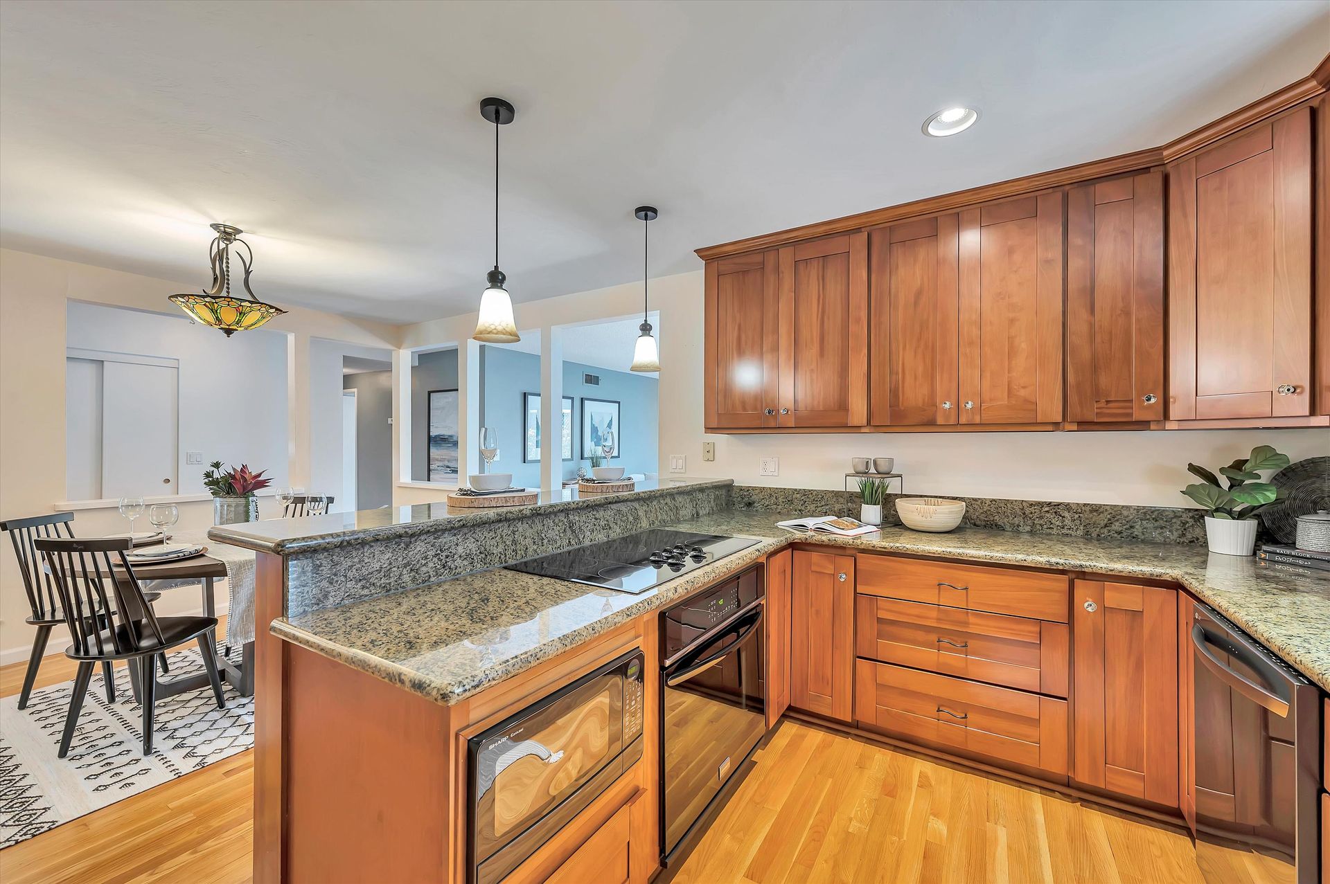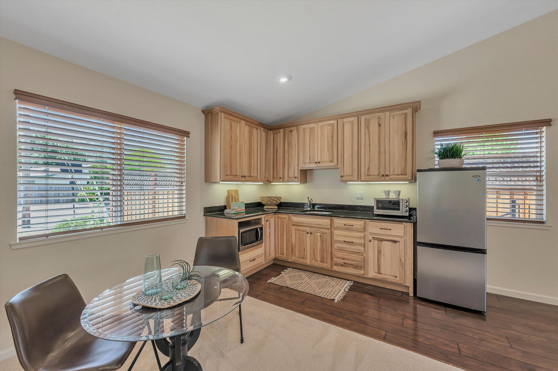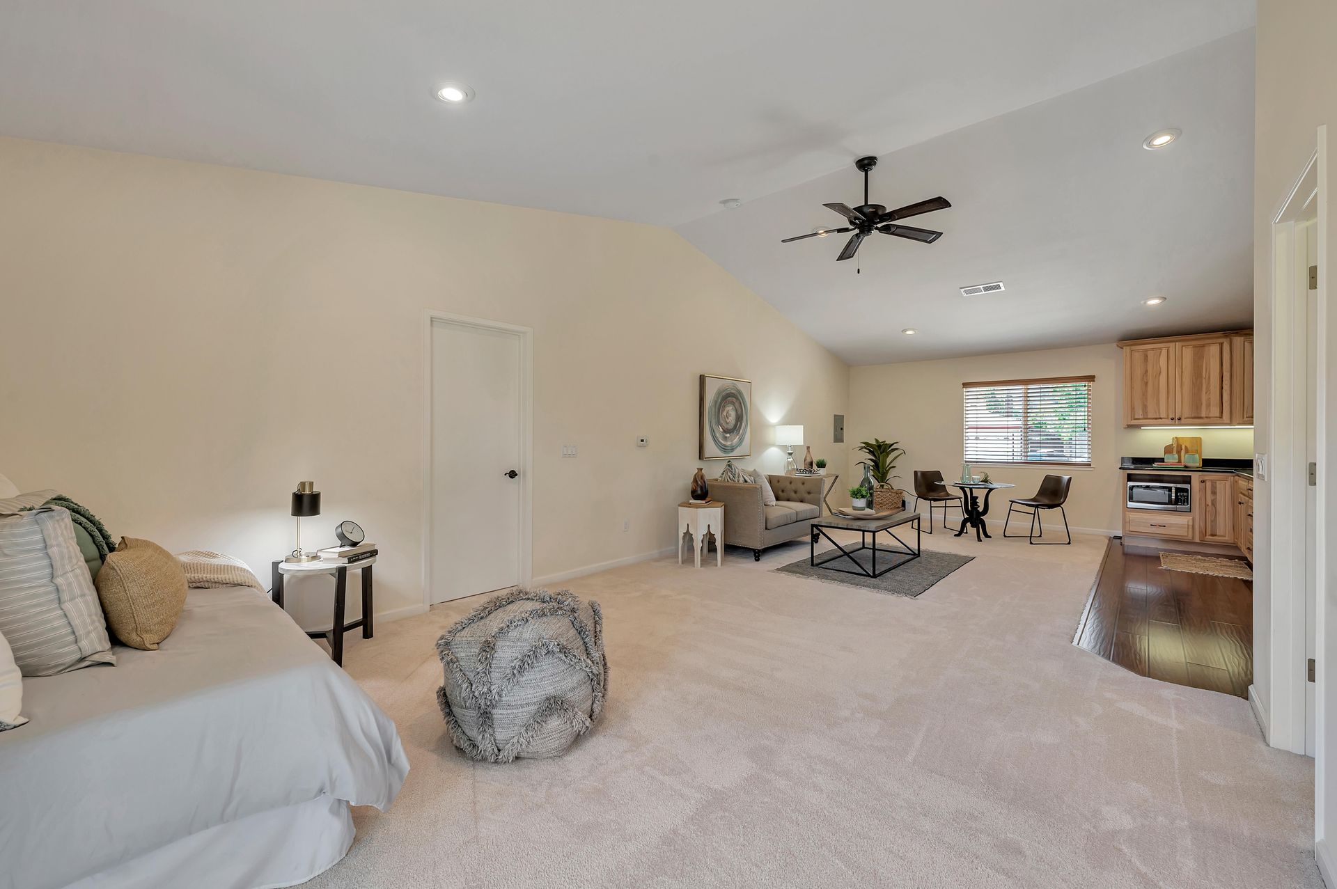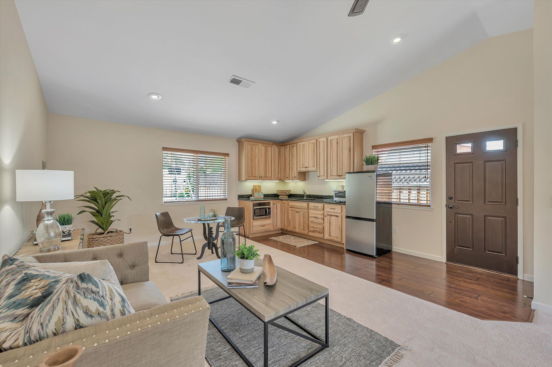 Expansive addition boasts nearly six hundred square feet of upgraded livable space, including vaulted ceilings, a sizable kitchenette with granite counters, a walk-in closet, full bathroom, dual-zone heating, a separate side entrance for added privacy and independence, and a seamless transition to a dedicated rear patio. The interior access from the addition to the main home can also be achieved through a connected hallway or leave the door closed to preserve privacy. Whether you use as a guest suite, an extended livable area, or source of rental income, this improved space offers flexibility and adaptability to suit your needs.