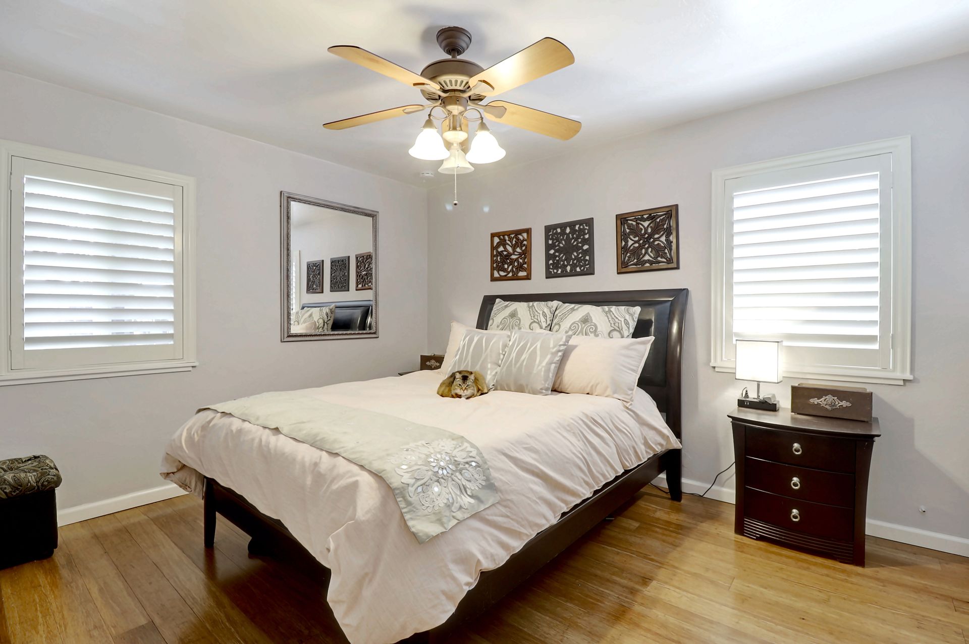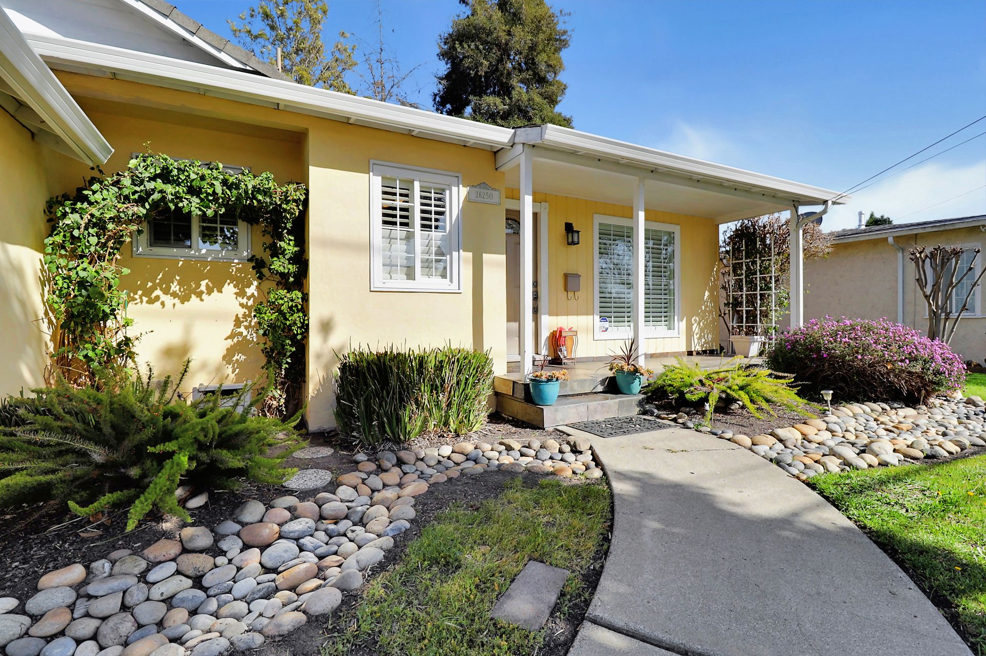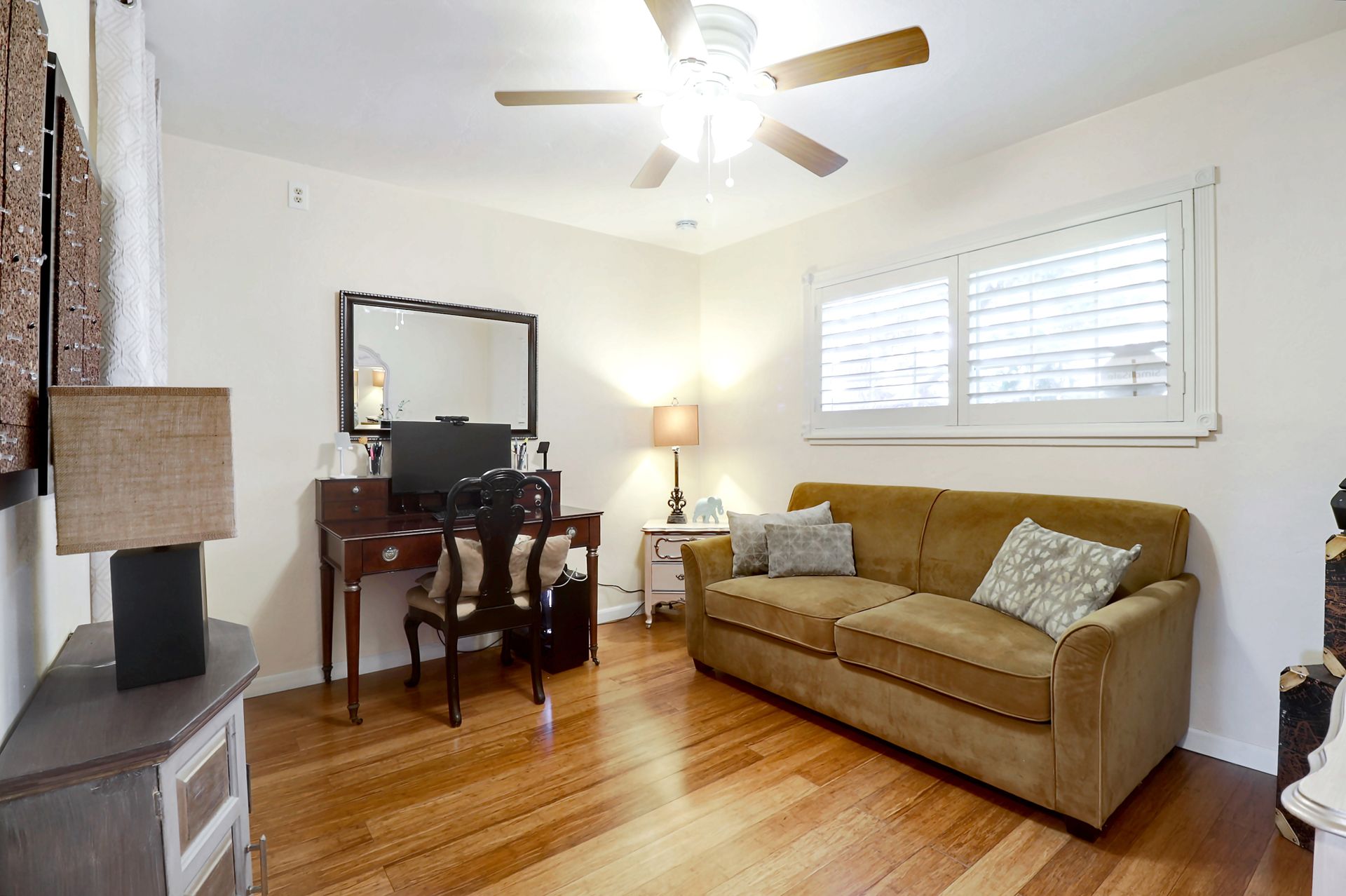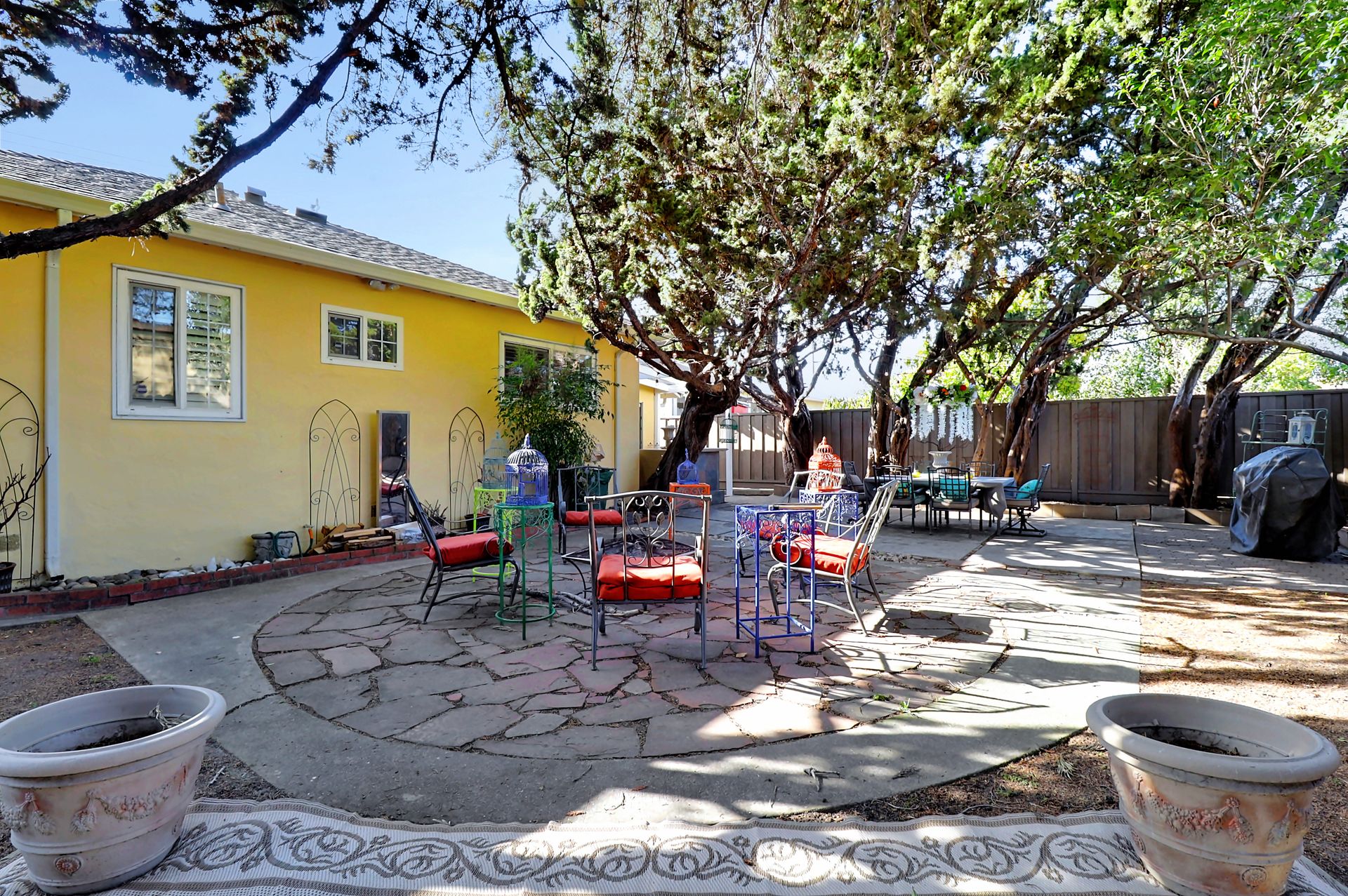 Enter into this home with its beautiful decorator touches throughout. Begin with the landscaped front yard, the living room with canned ceiling lights, Travertine tiled fireplace and mantel and a bumped-out wall giving architectural interest. Crown molding in living area. Dual pane windows with plantation shutters throughout the home. Remodeled kitchen with granite counters and tile floors. Breakfast nook. The main home has bamboo hardwood floors that are in great shape. The first bedroom has been turned into a formal dining room with steps to a lovely family room addition, flooring is a laminate with a slider to the back yard (family room has no permits). Slider also has plantation shutters. Bathroom has been beautifully remodeled with the stately grey colored tile. Notice the master bedroom has an Ikea closet with incredible space saving features. Ceiling fans throughout the home helping you stop stay cool. Beautifully shaded backyard for your summertime entertainment including a built-in bar. Garage walls and ceiling are sheet rocked and textured with canned ceiling lights allowing you to use this area as a garage or as a work area or additional space, a wall air conditioner in this space keeping it cool during our warmer days in the bay. Roof line has been raised for a proper pitch allowing for a composition shingle roof.