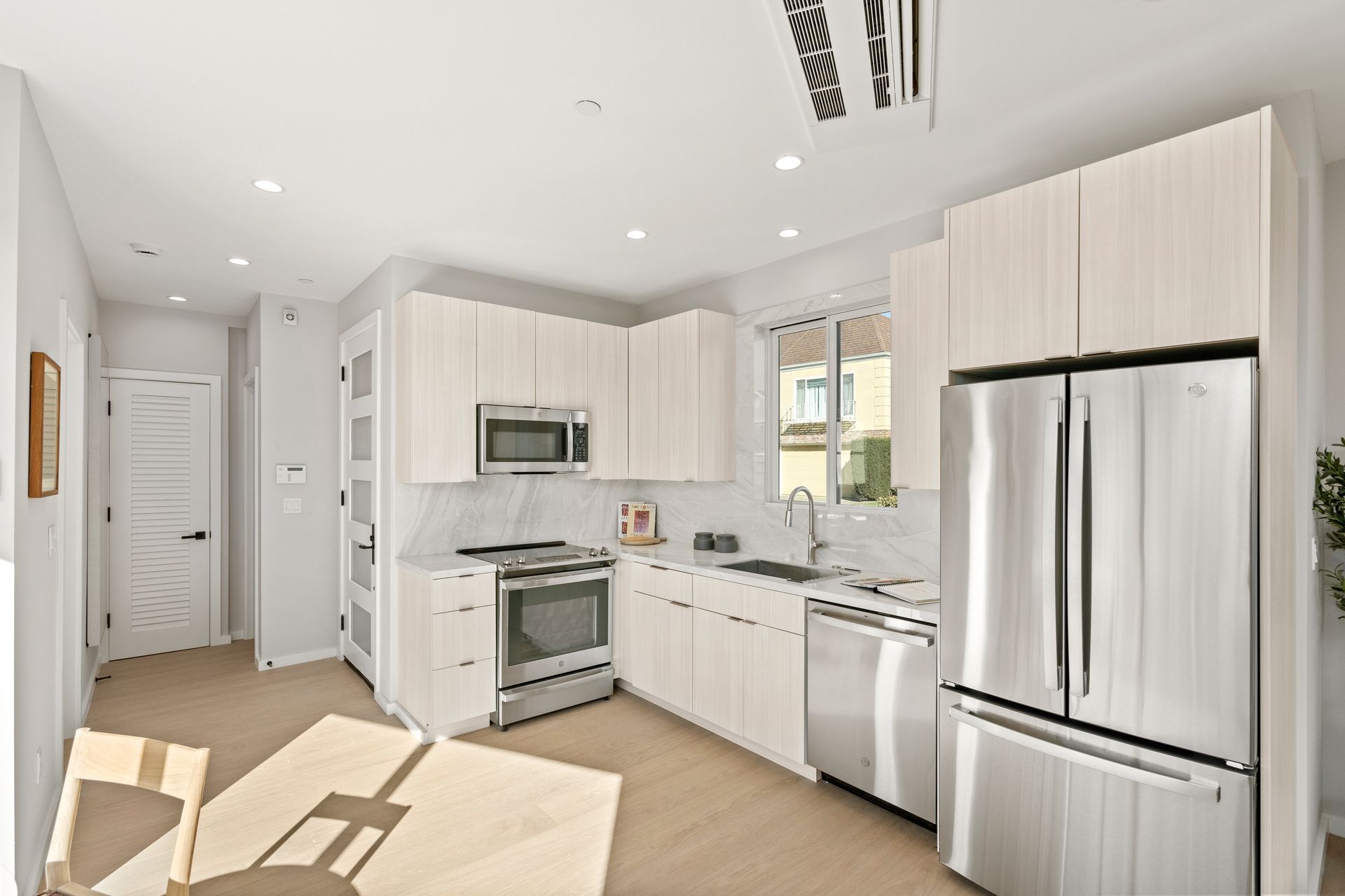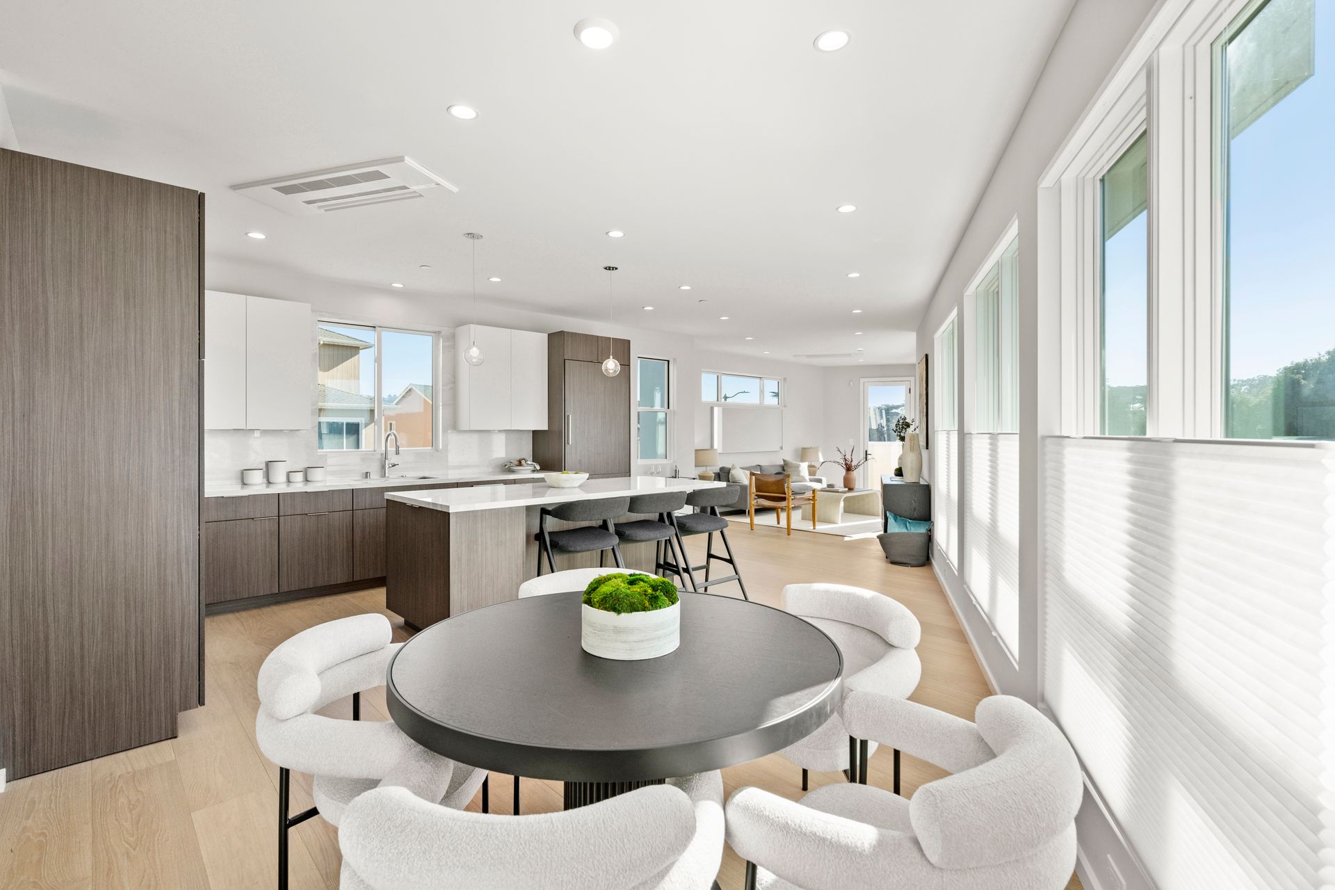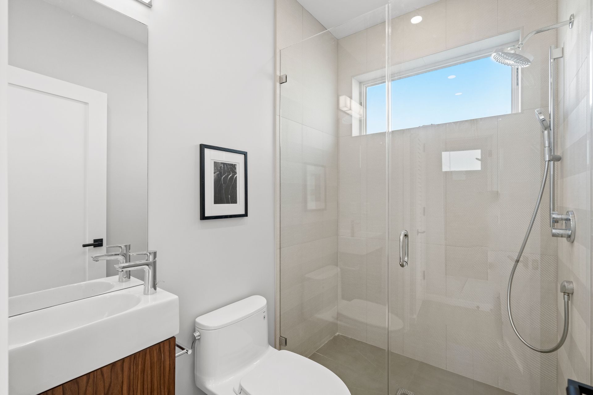 Main Level features an open-concept kitchen, living, and dining area with oak hardwood floors, recessed lighting, and Marvin windows. The chef’s kitchen boasts a center island, Fisher & Paykel appliances, custom Eclipse cabinetry, and porcelain countertops. This floor also includes 2 bedrooms and 2 bathrooms.