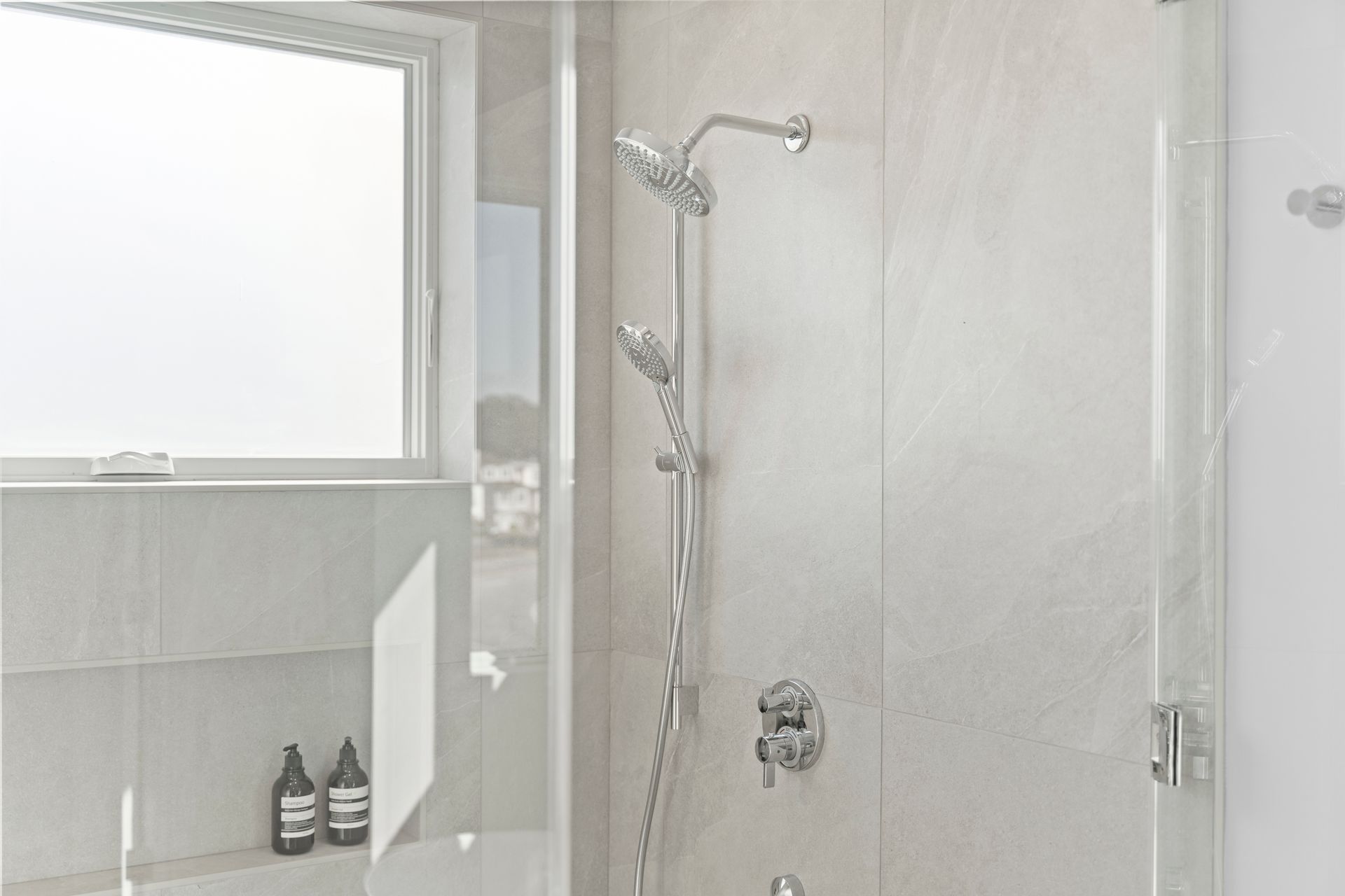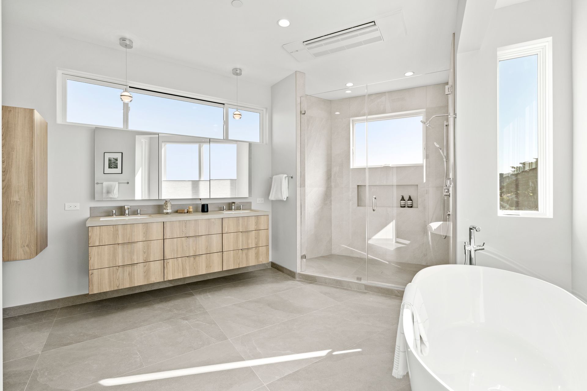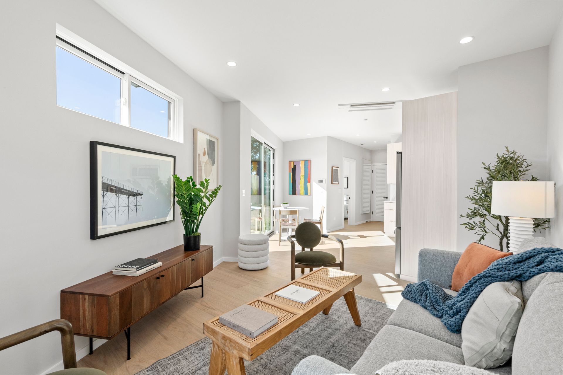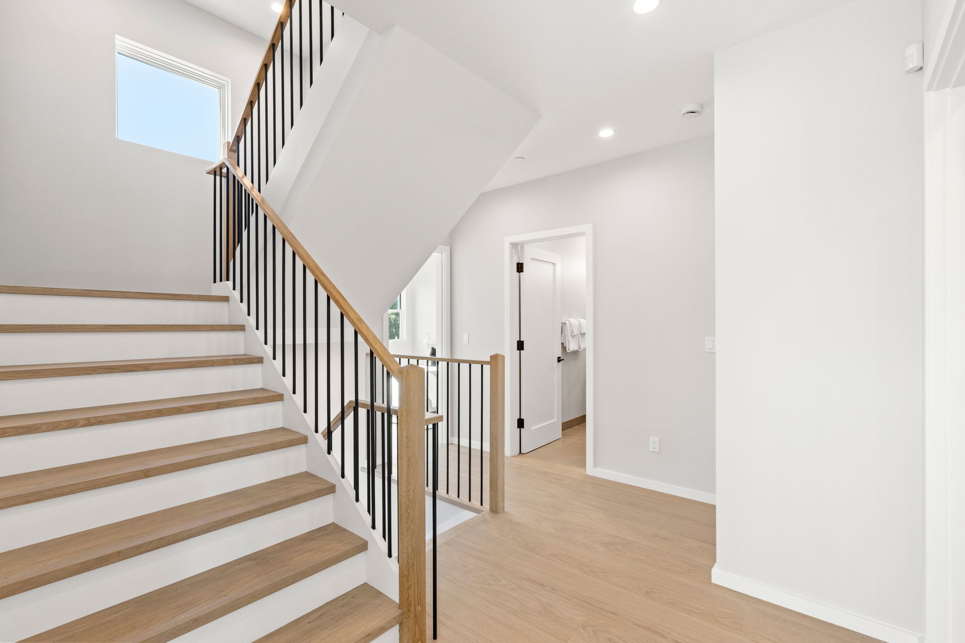 Main Level features an open-concept kitchen, living, and dining area with oak hardwood floors, recessed lighting, and Marvin windows. The chef’s kitchen boasts a center island, Fisher & Paykel appliances, custom Eclipse cabinetry, and porcelain countertops. This floor also includes 2 bedrooms and 2 bathrooms.