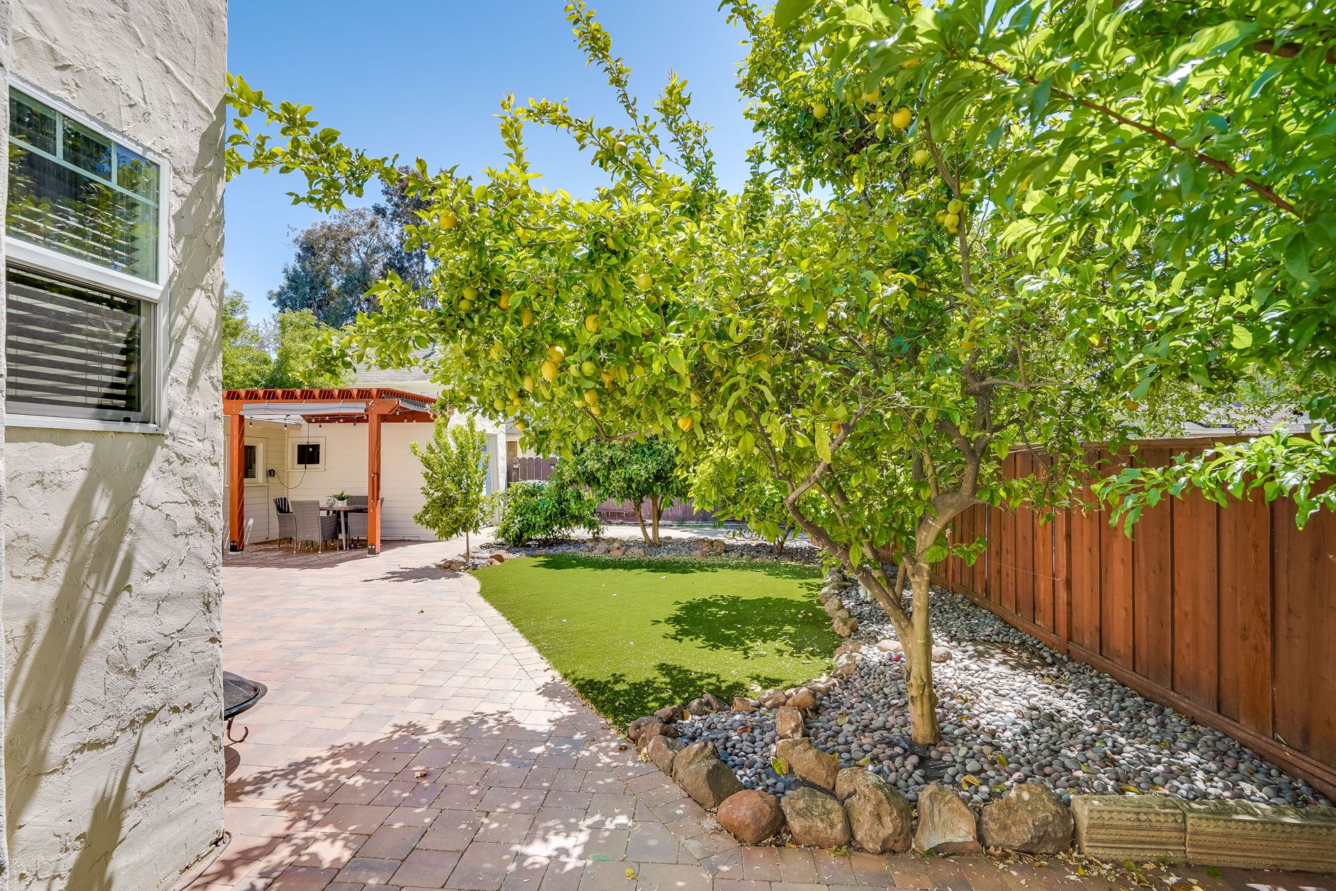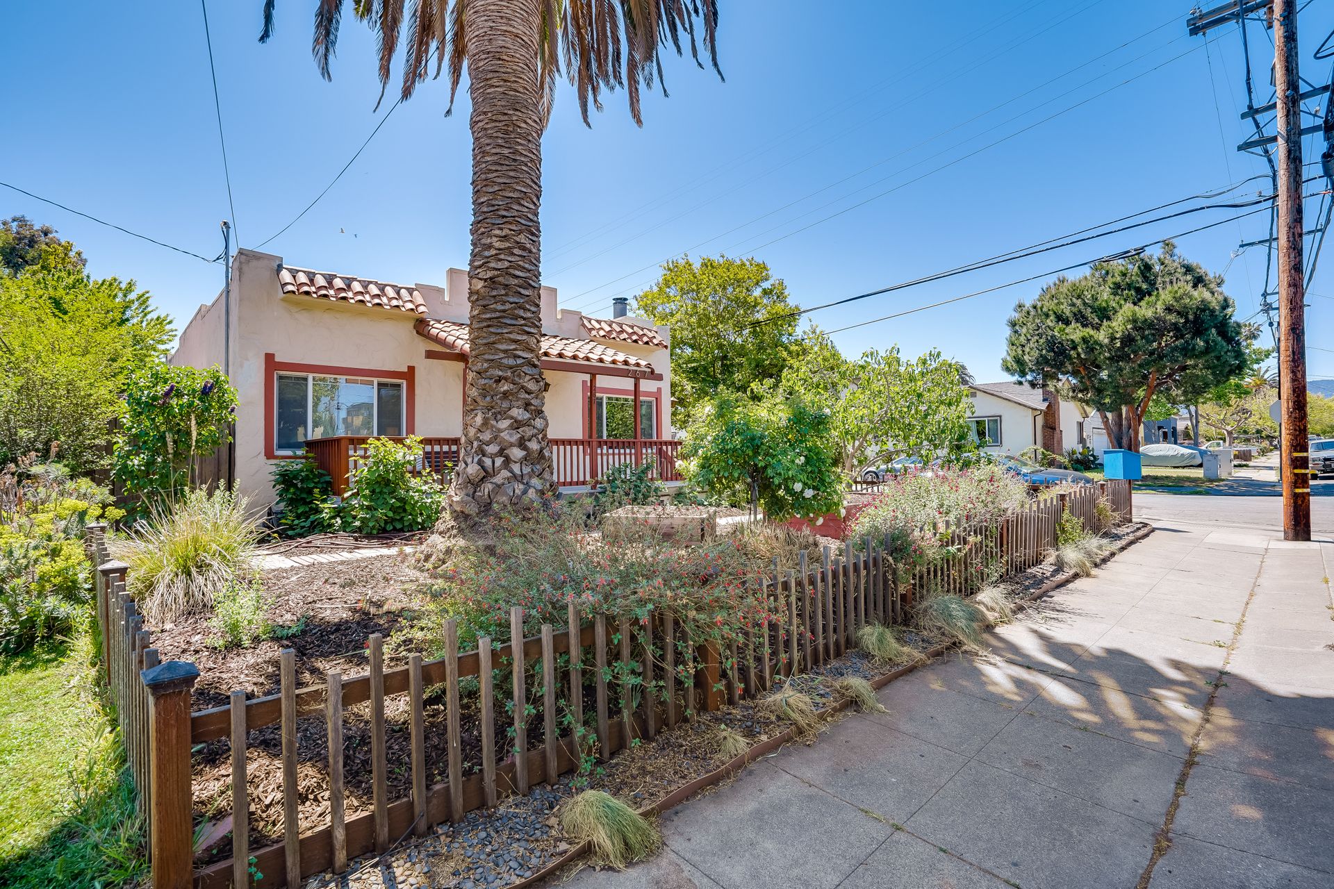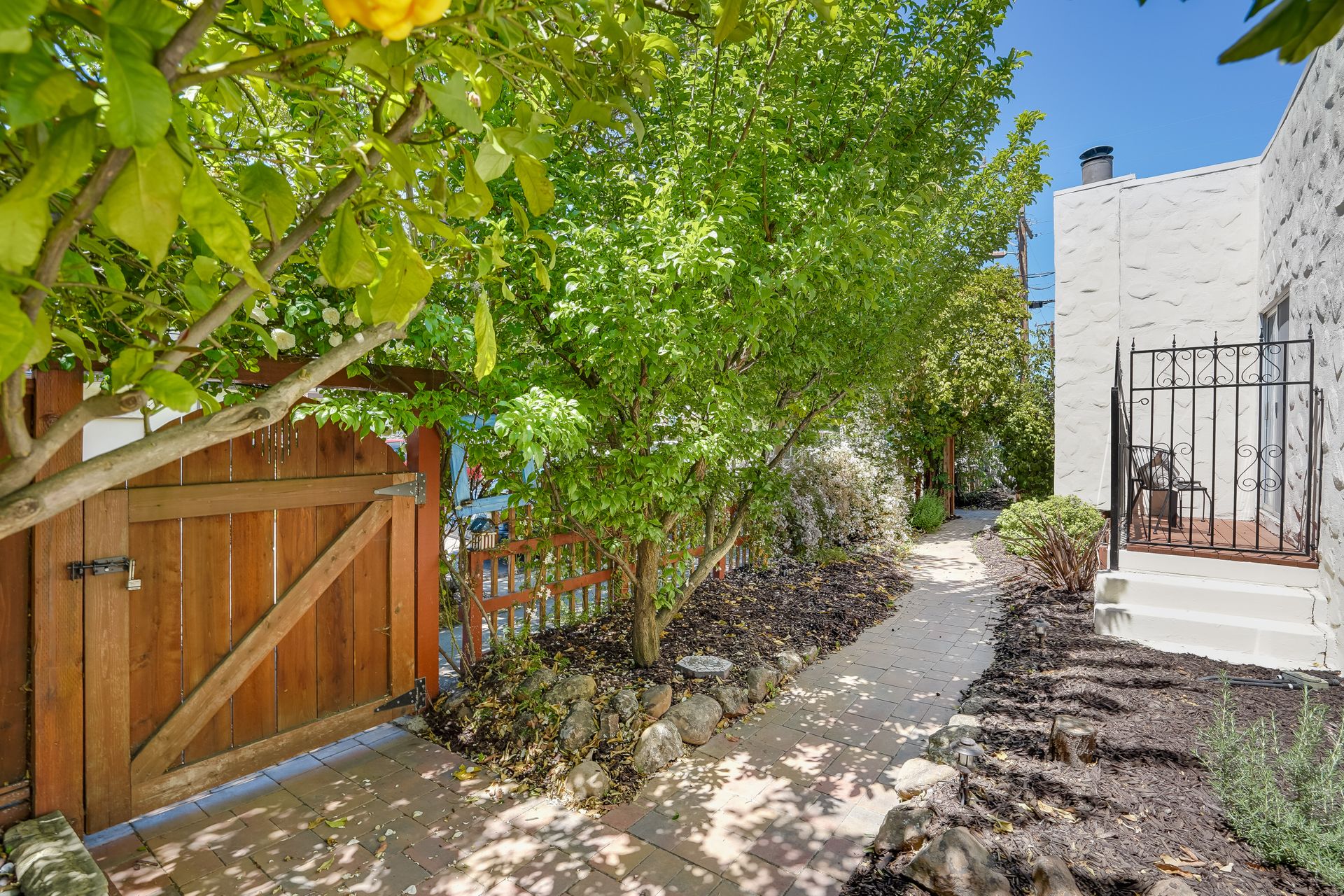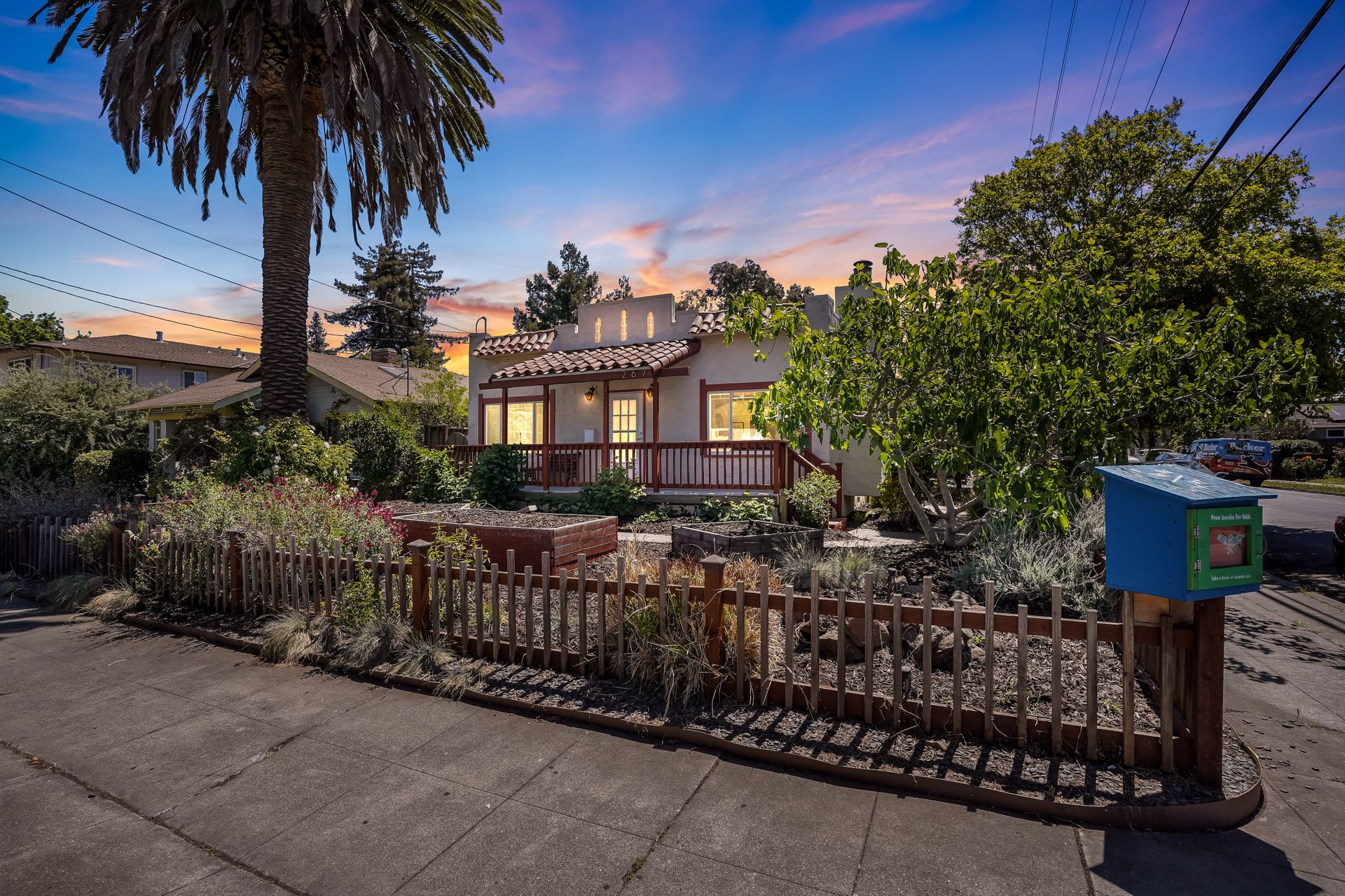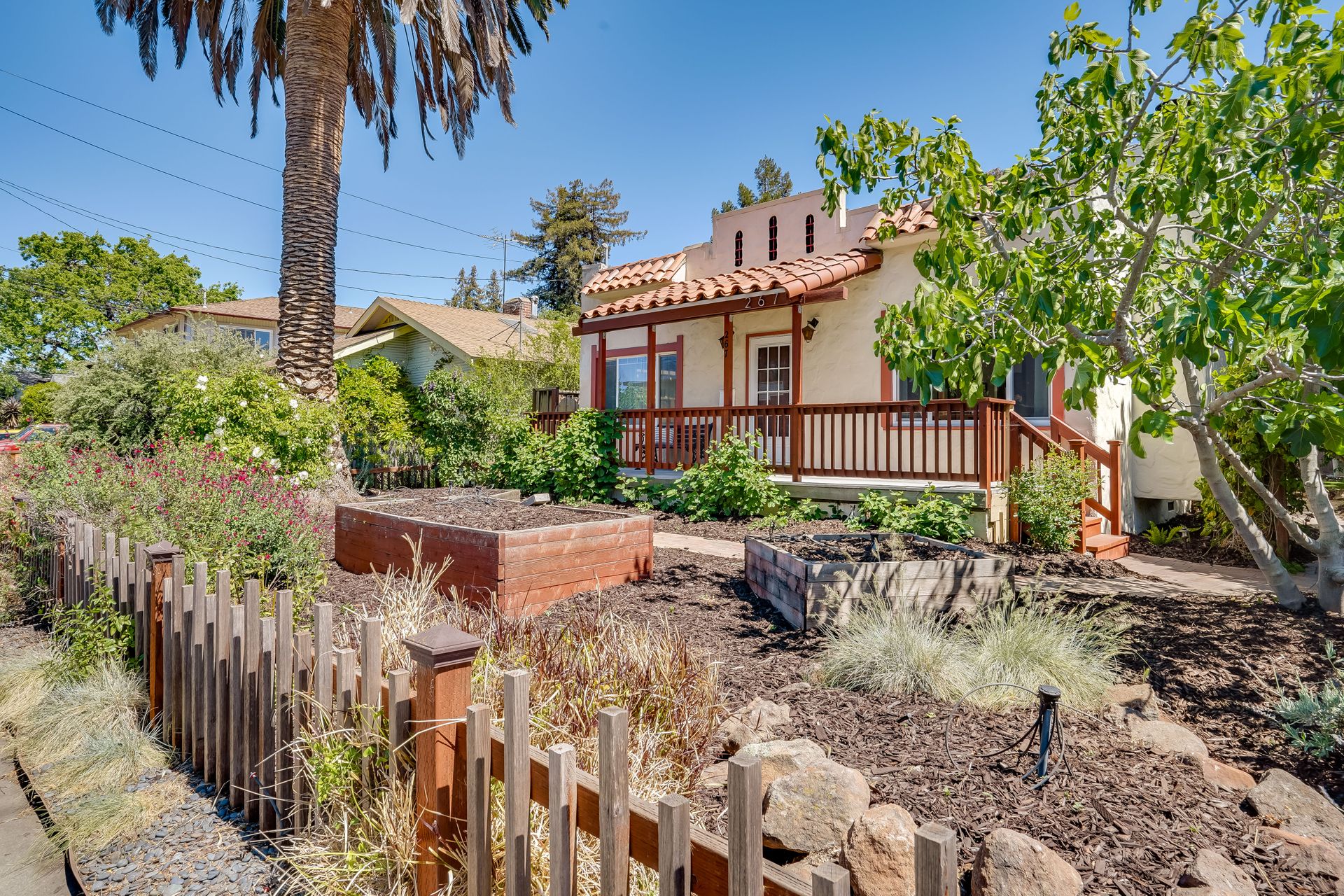 This quant and cozy home boasts newly refinished hardwood floors, updated kitchen, 3 beds, 2 baths and a functional floor plan. A wood burning fireplace in the living room and Mediterranean detailing makes this home shine! A multitude of fruit, citrus, fig, roses and sumptuous gardens transform the yard into your own sunny oasis, while the front yard features a lovely mature palm tree and raised beds to grow vegetables. Gated driveway, detached garage, and outdoor work space for hobbyists.