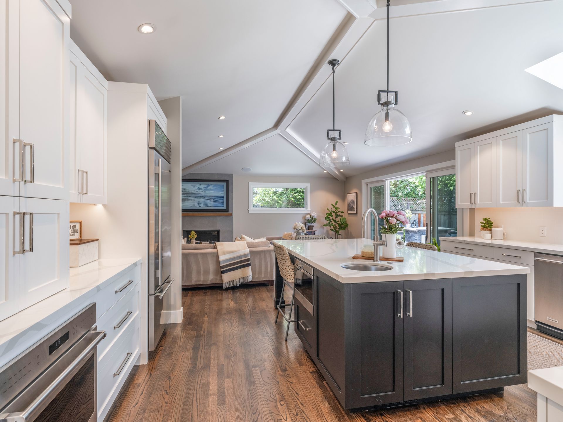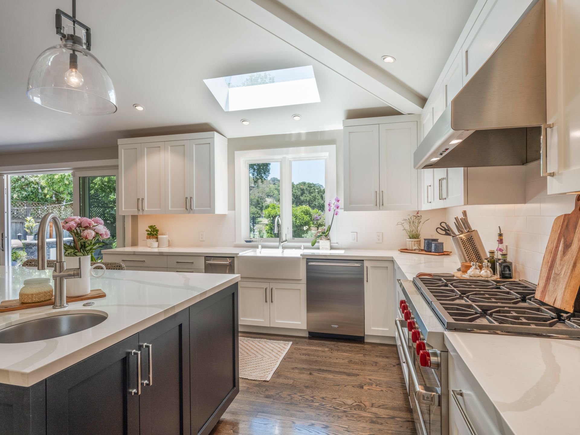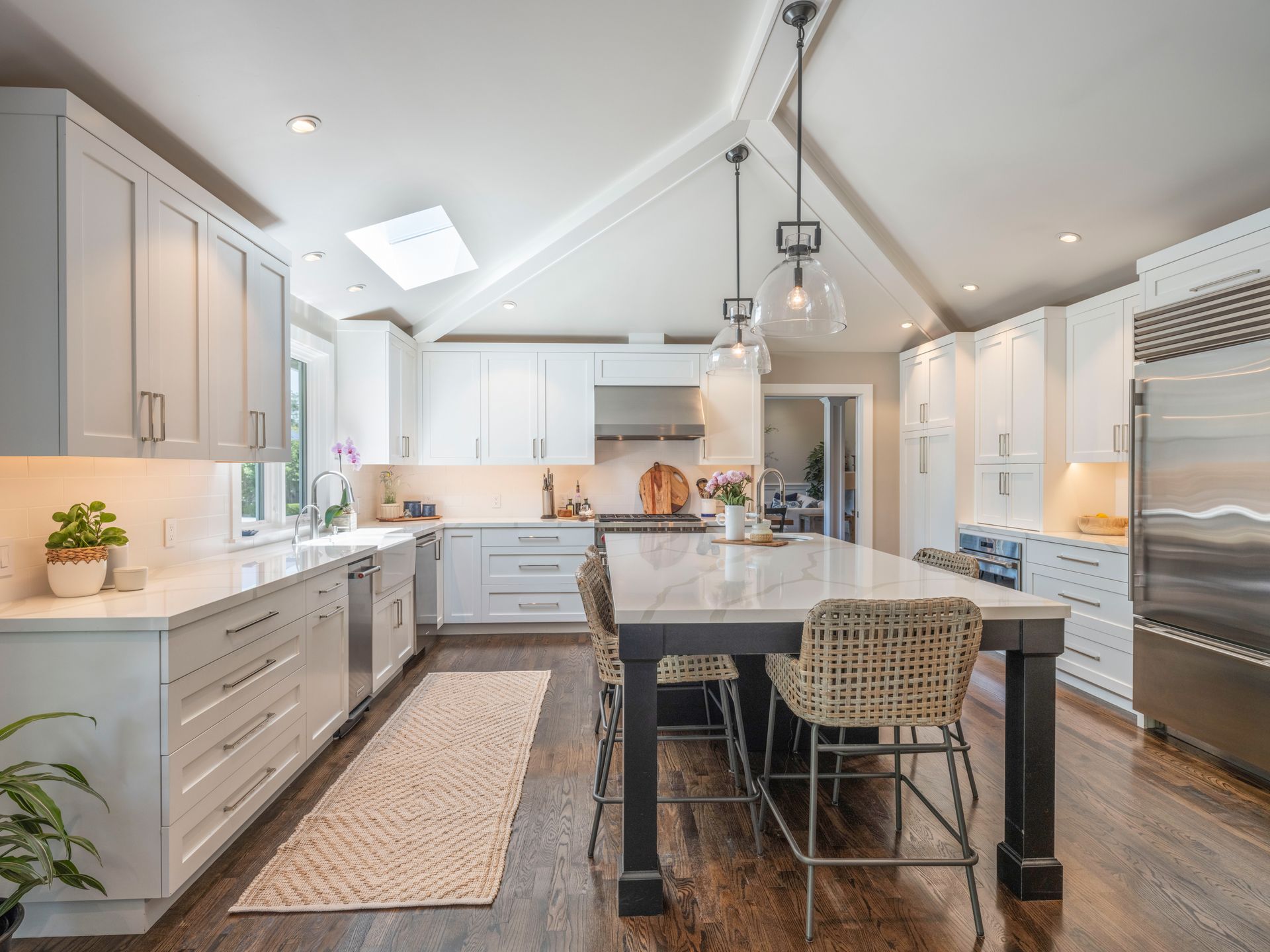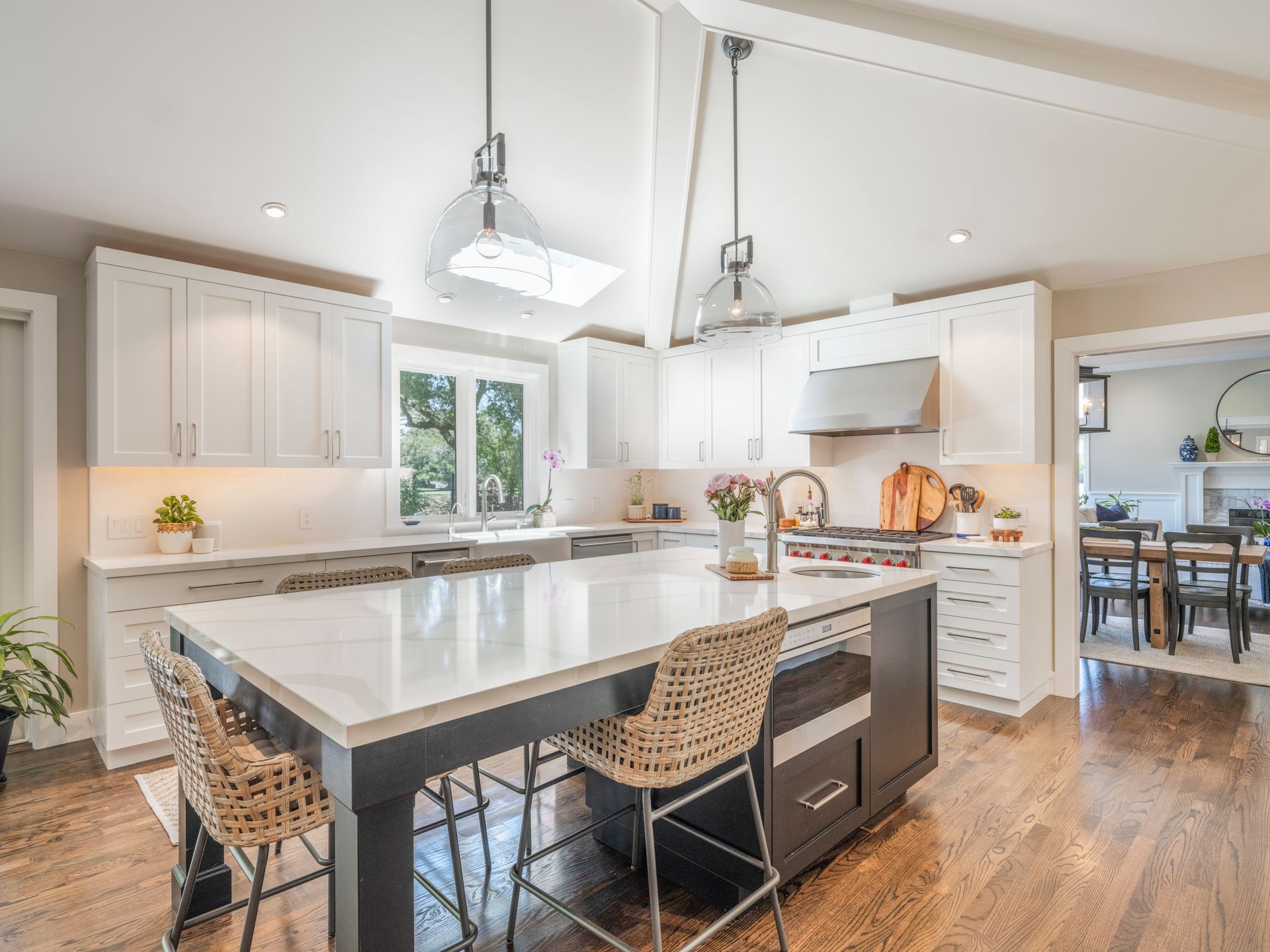 - Gourmet updated kitchen includes Restoration Hardware pendant lighting, island seating for 6 with prep sink, quartz countertops with farmhouse sink, custom cabinetry with pullout shelving, appliance garage and tech drawer for hidden charging, under cabinet counter and floor lighting, Wolf 6 burner free standing gas range, Wolf wall oven and Subzero built-in refrigerator and appliances (Cove dishwasher – Cove is a product of SubZero, microwave is Wolf)