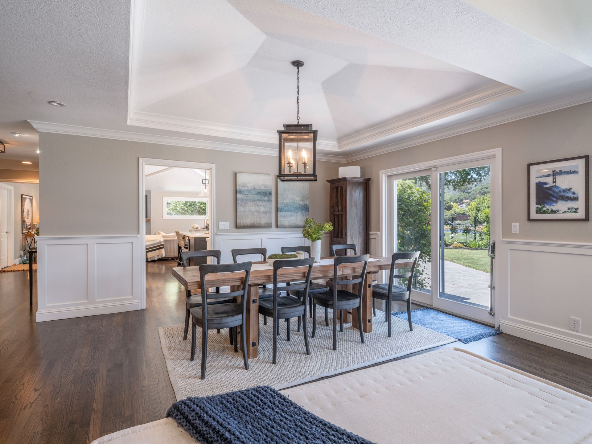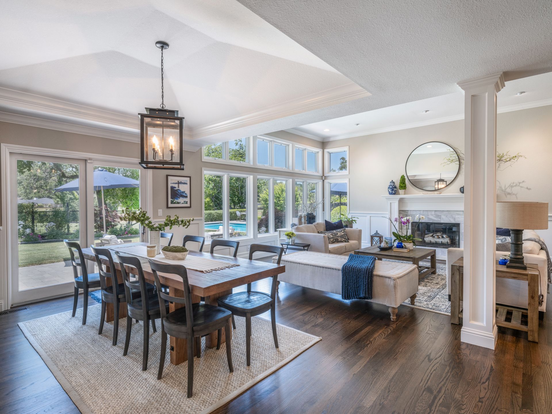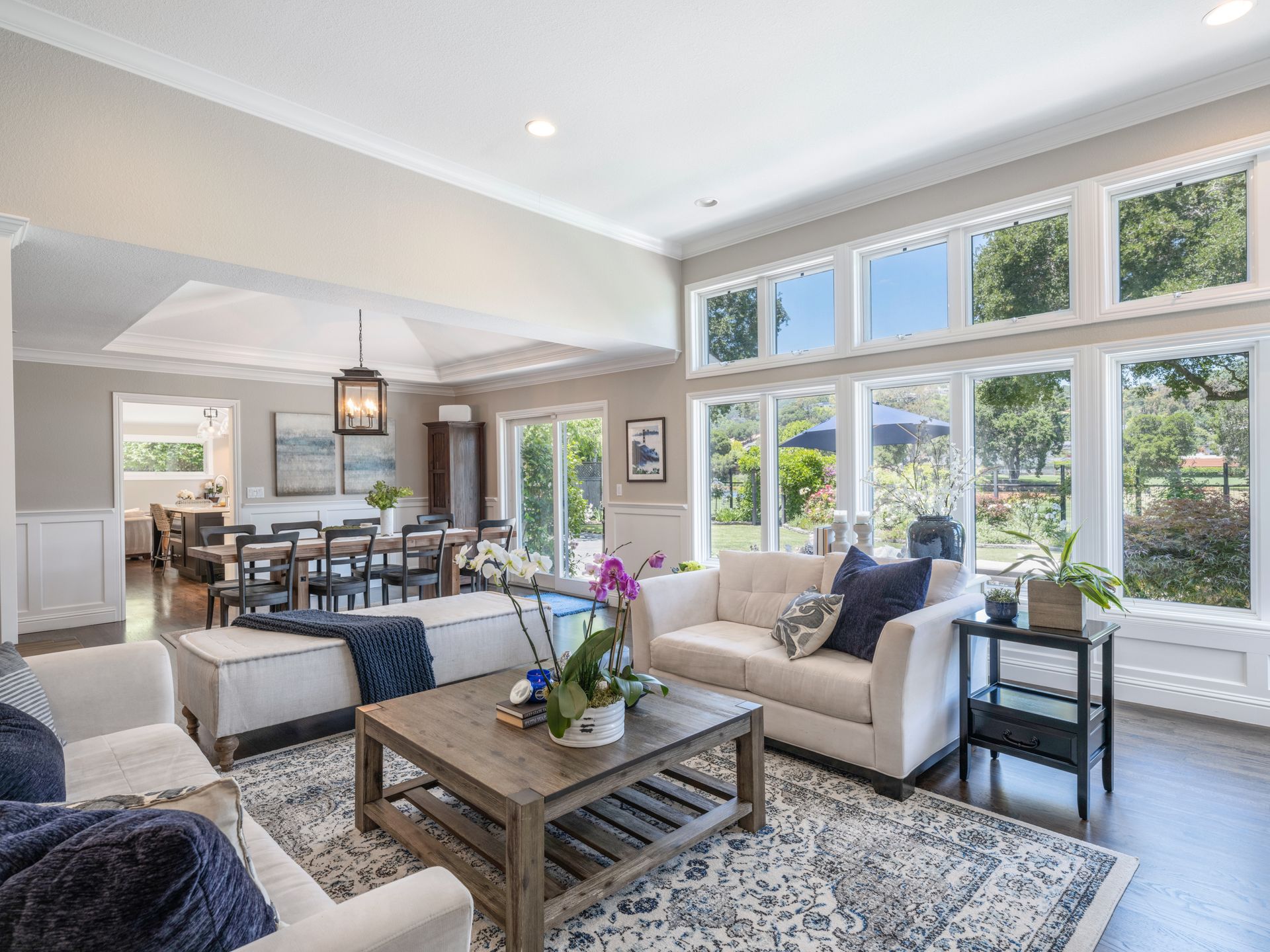 - Formal living room with cathedral ceilings & premium showcase windows, slider for yard/pool access, custom wainscoting, and coffered dining ceiling with custom lighting