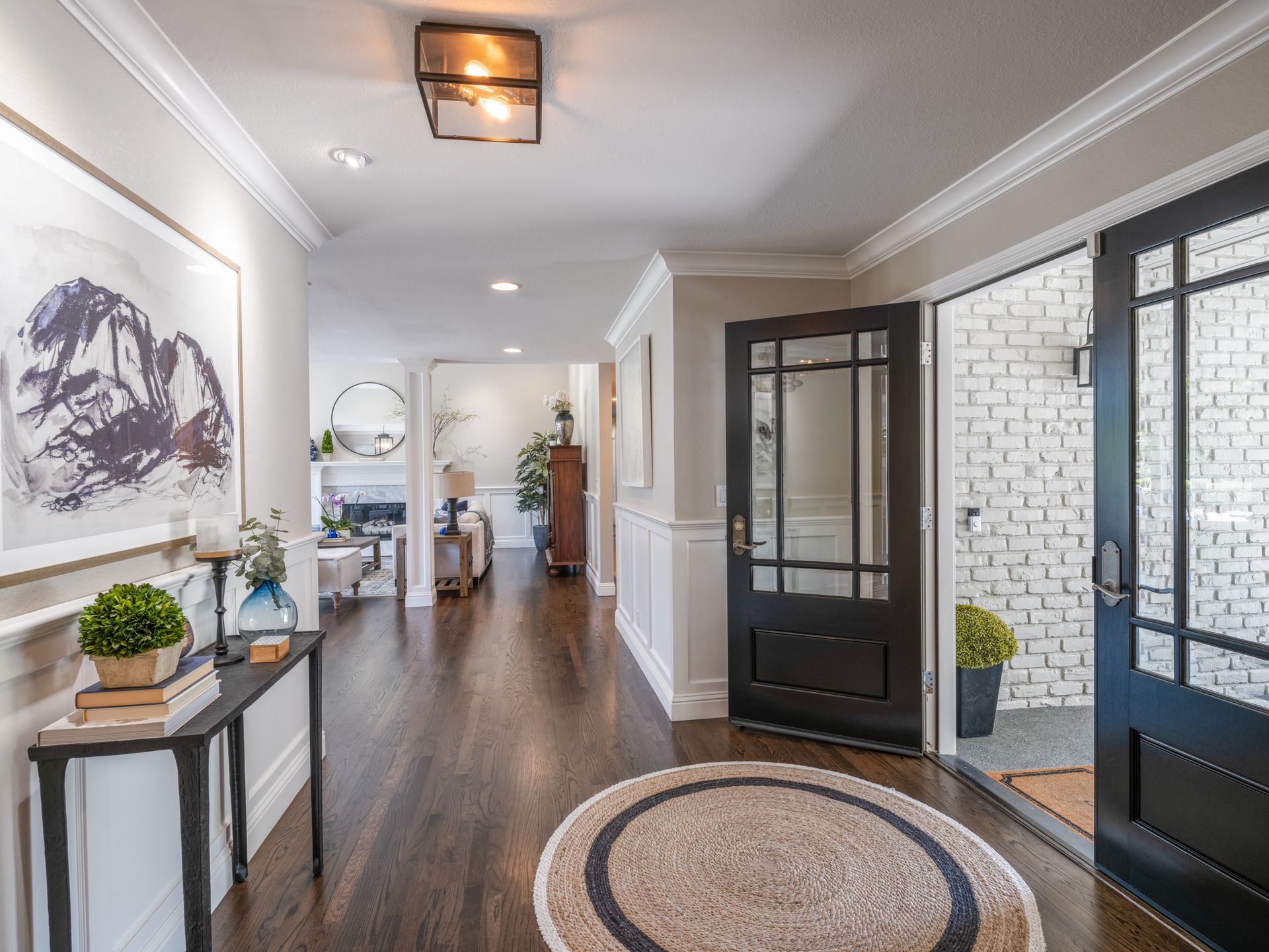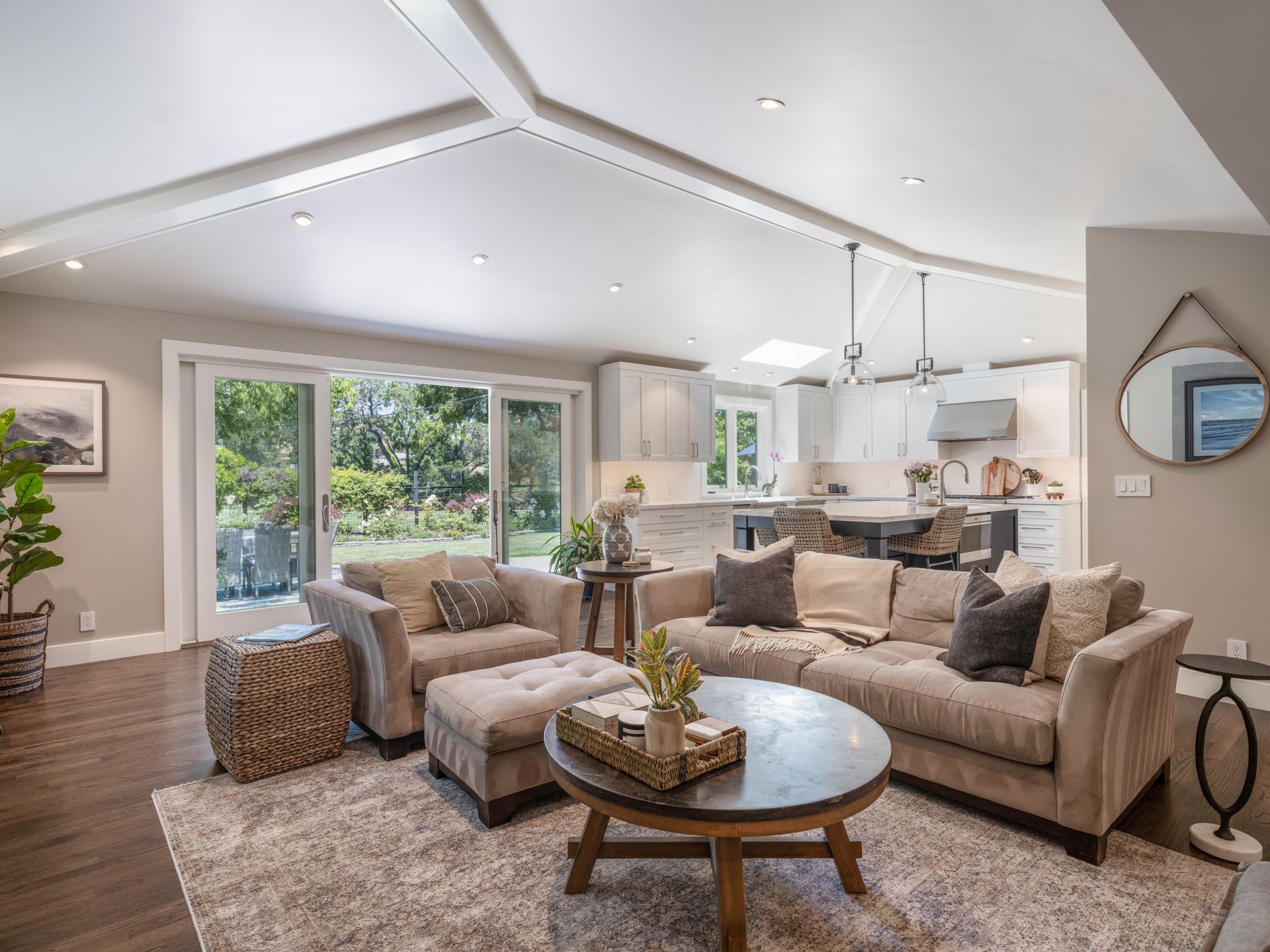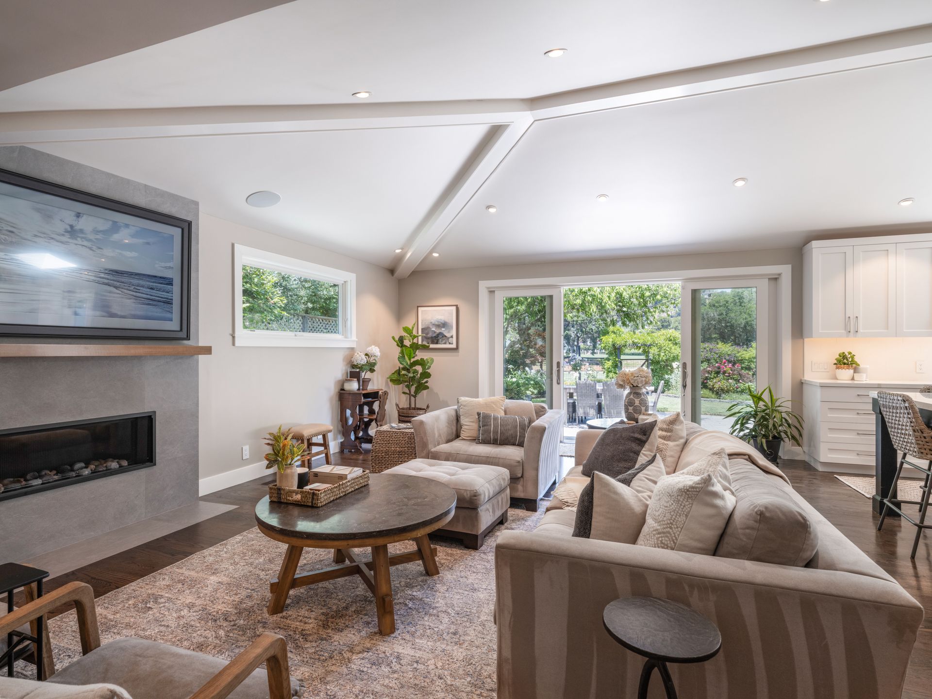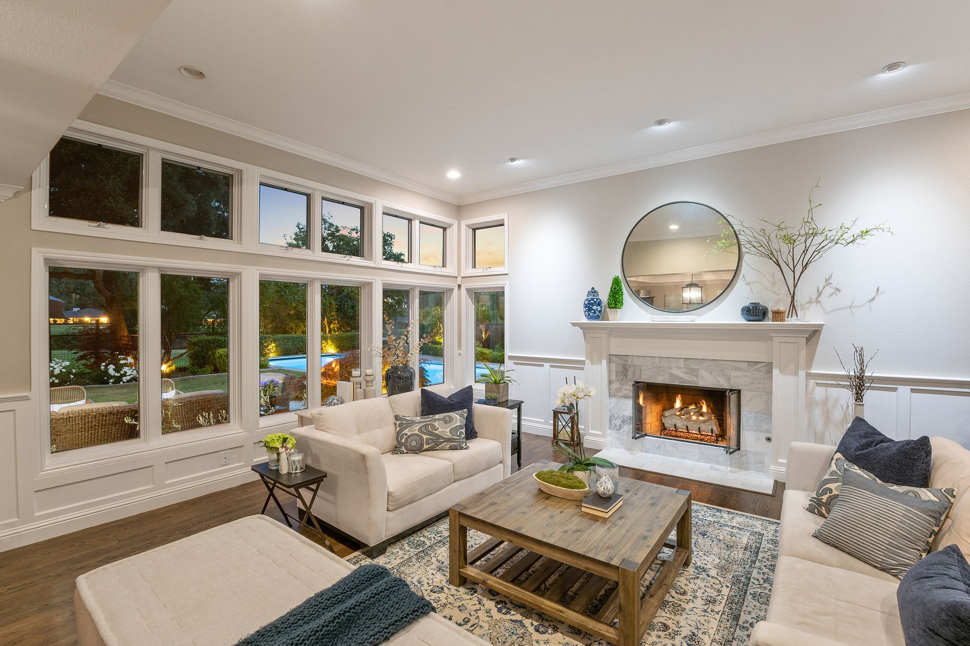 - Formal living room with cathedral ceilings & premium showcase windows, slider for yard/pool access, custom wainscoting, and coffered dining ceiling with custom lighting