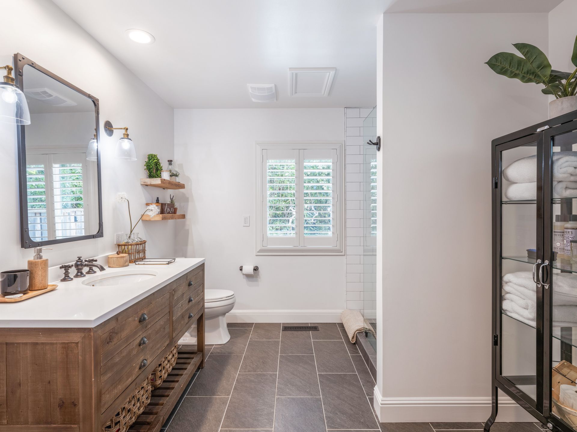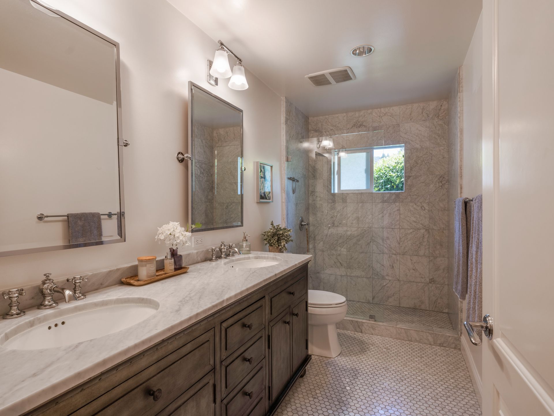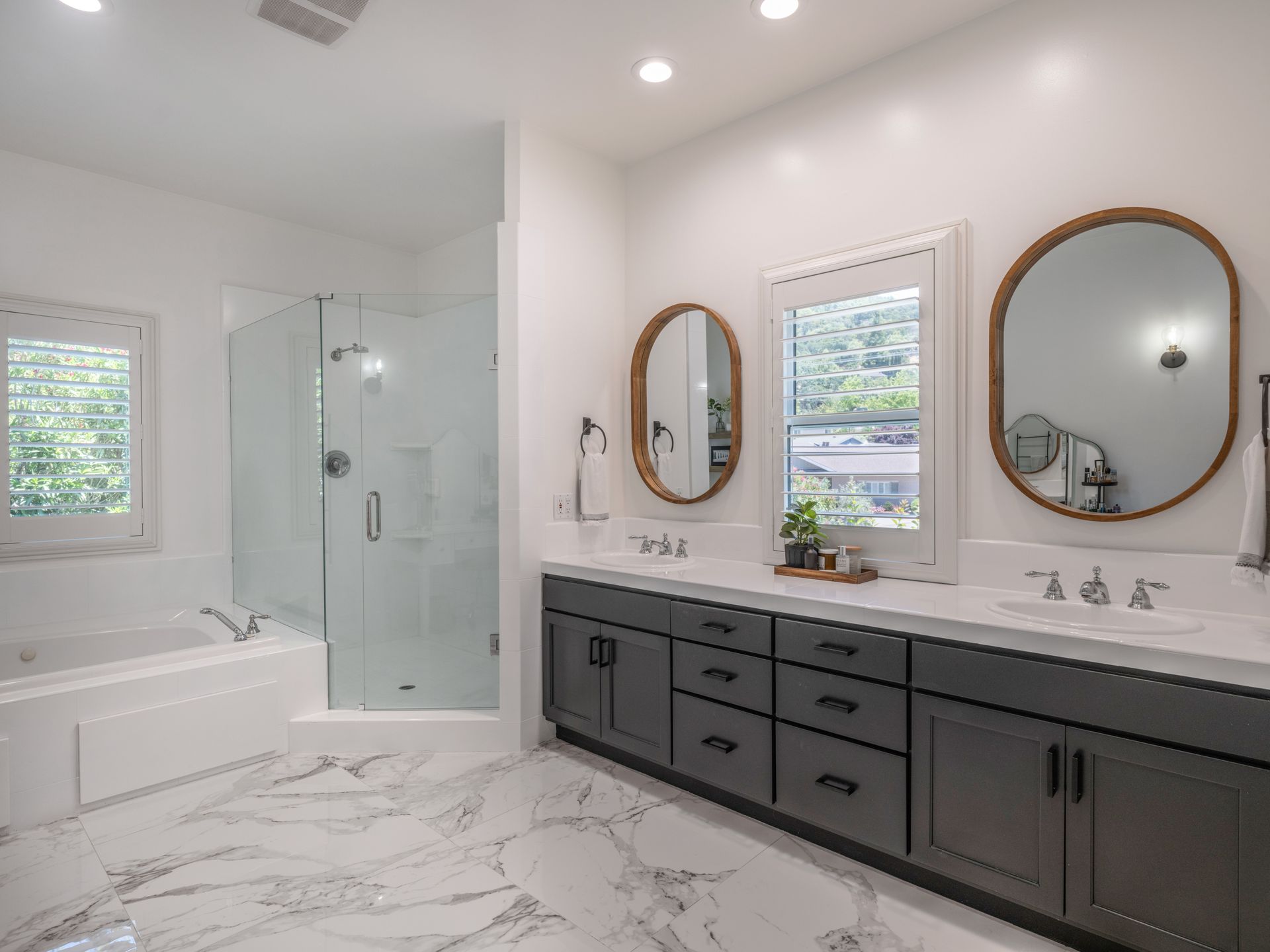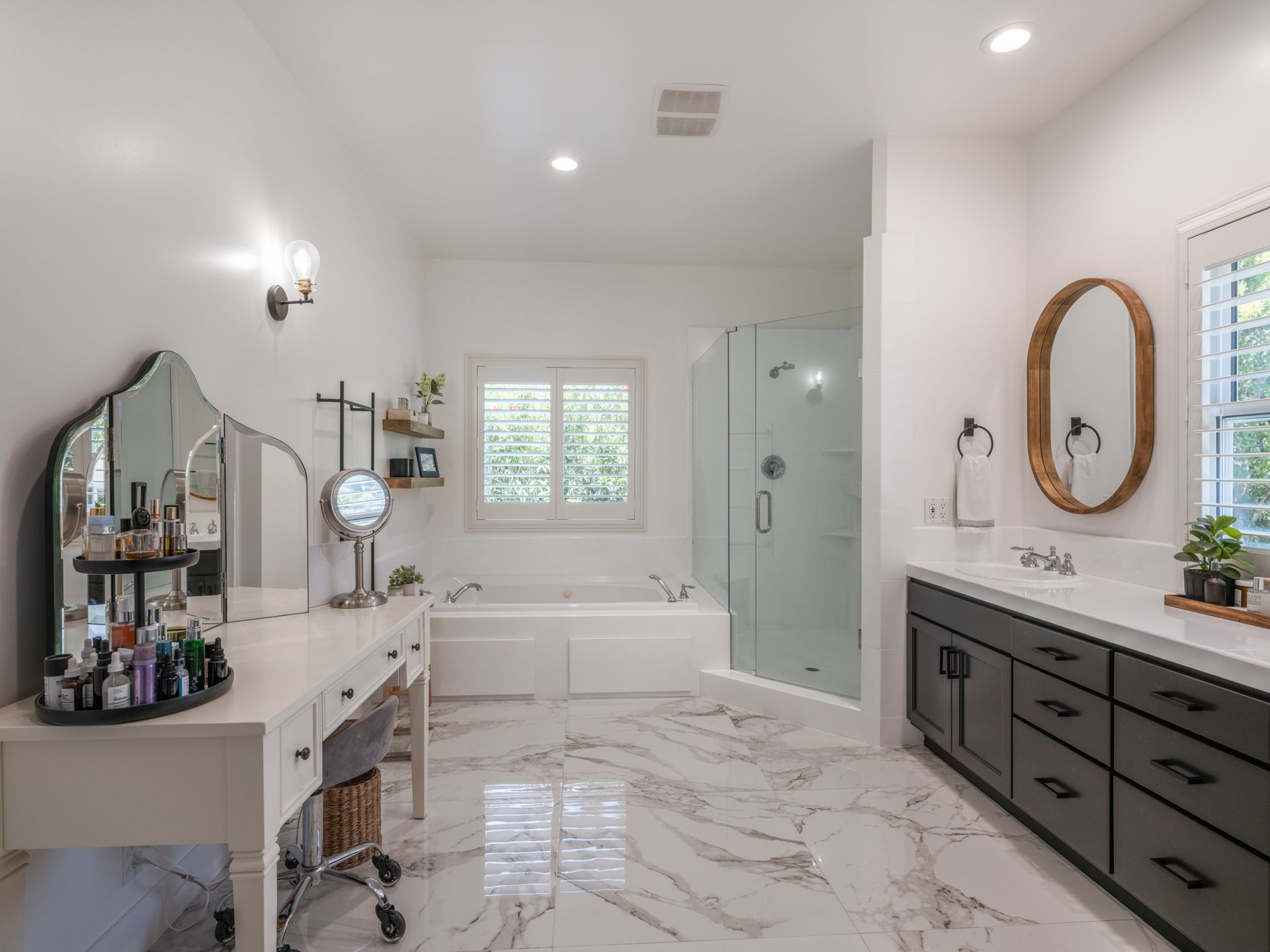 - Updated primary bath lighting, mirrors, flooring and paint, frameless shower enclosure with two shower heads and with his/her sinks