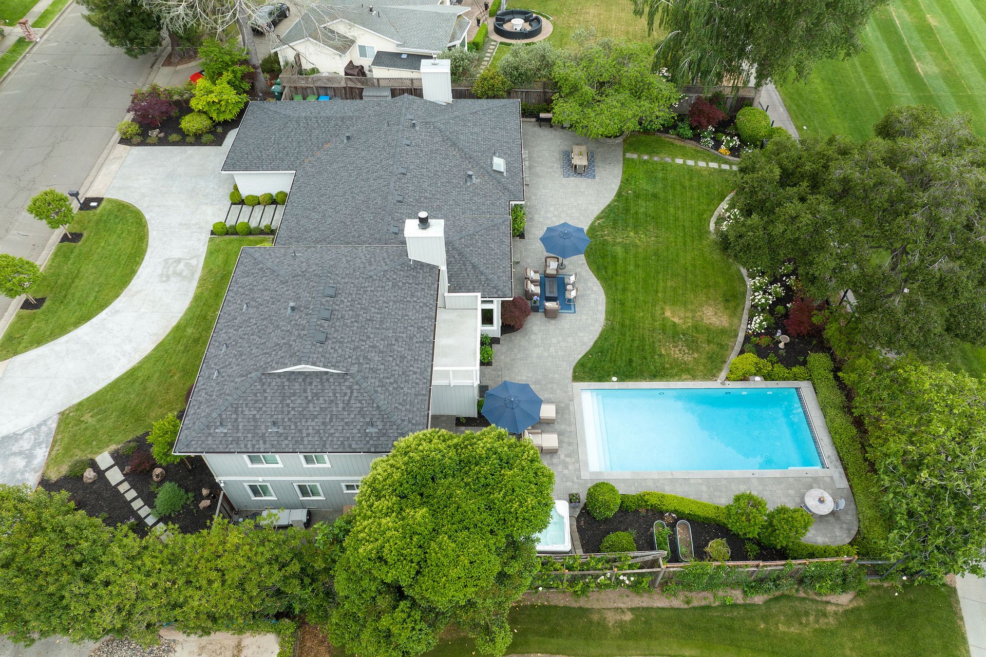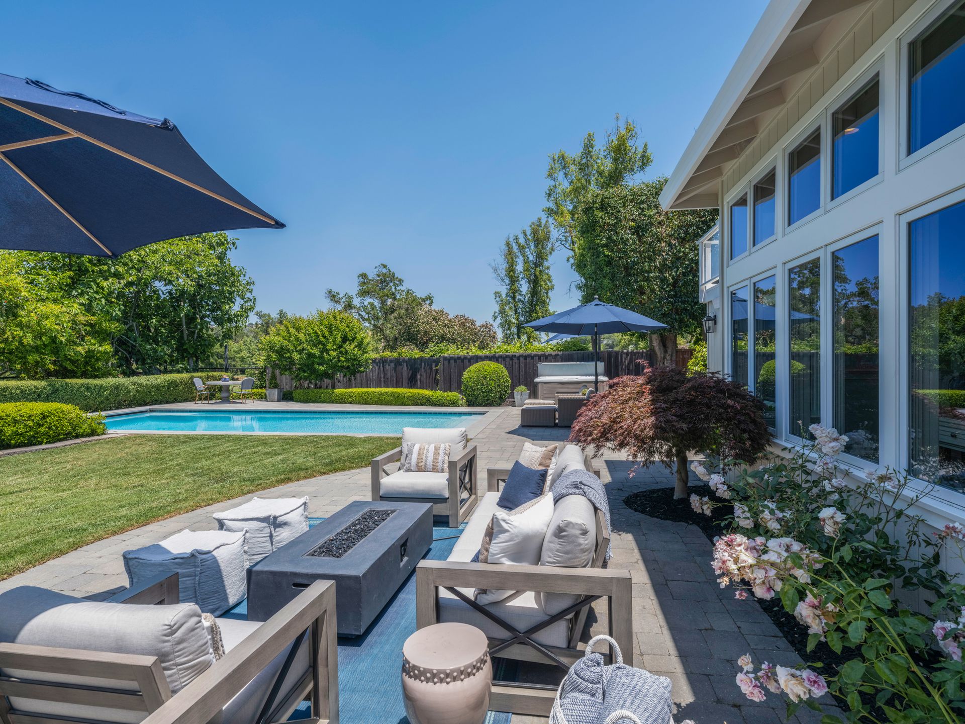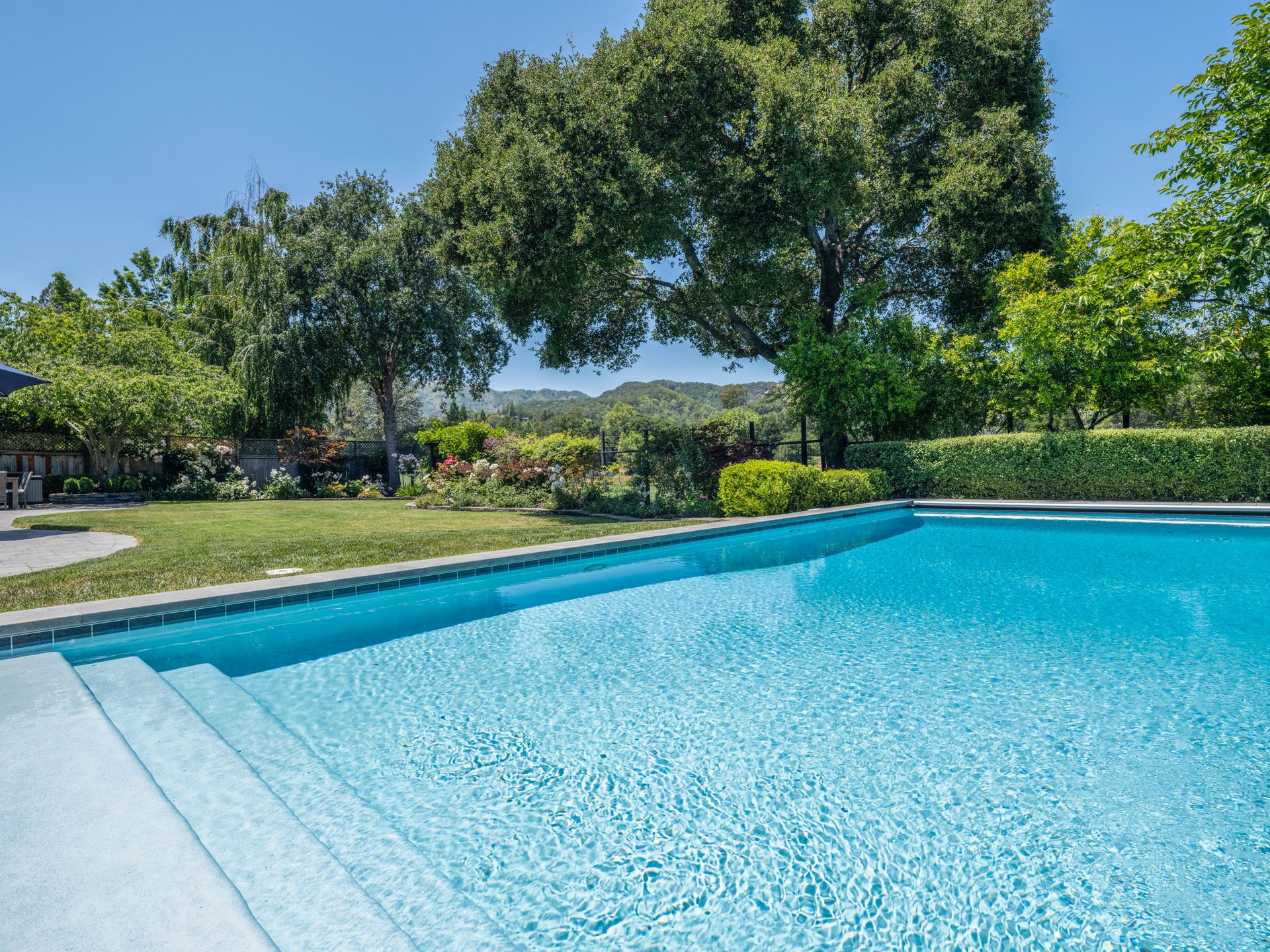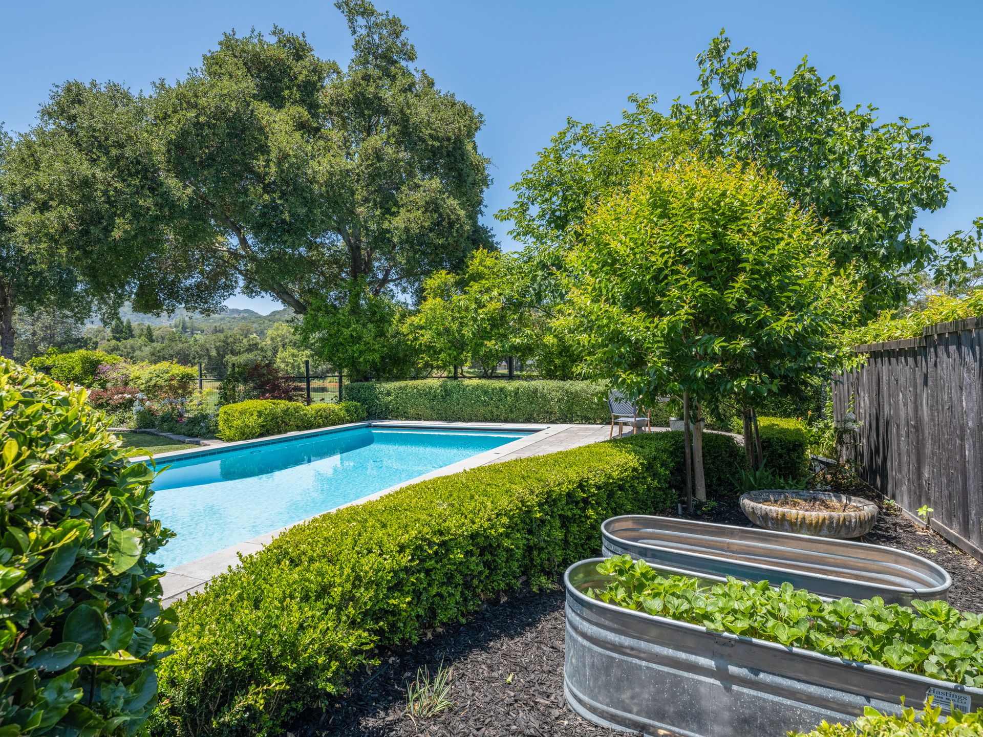 - Just over 1/3 acre lot with mature gardens, flat lawn, custom paver patio, custom salt water pool with automatic cover & fountains, salt water Hot Springs hot tub, raised garden beds, build-in prep counter with refrigerator.