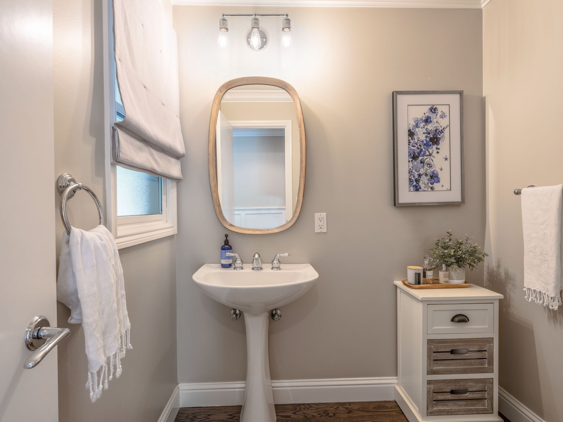 - Main level primary suite with slider access to yard, surround sound speakers, ensuite updated bath featuring Restoration Hardware vanity. (Currently used as a second family/theater room)