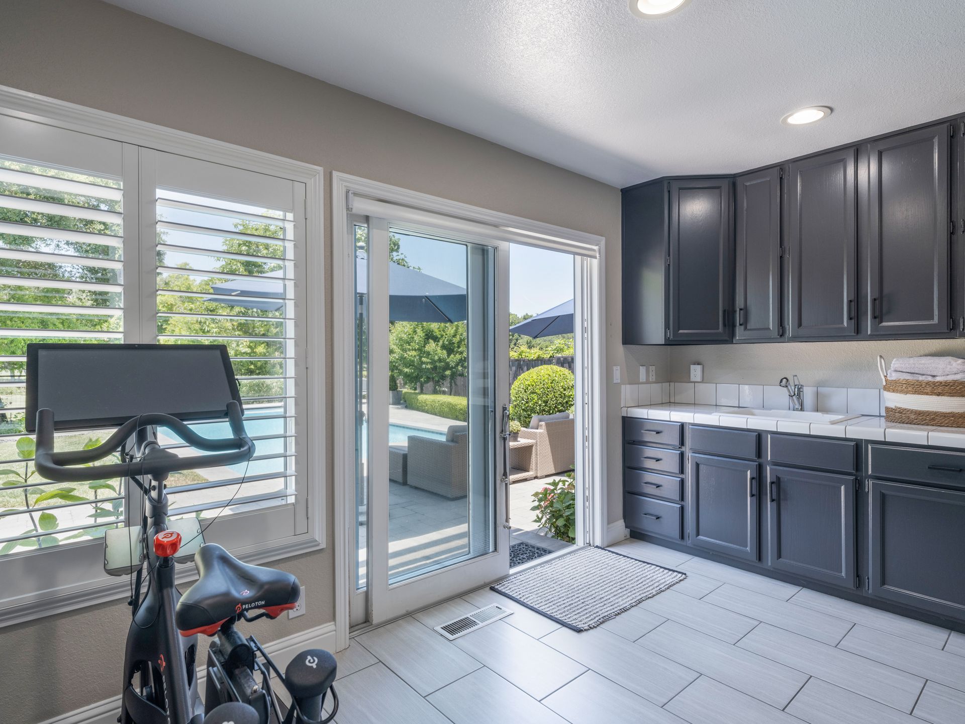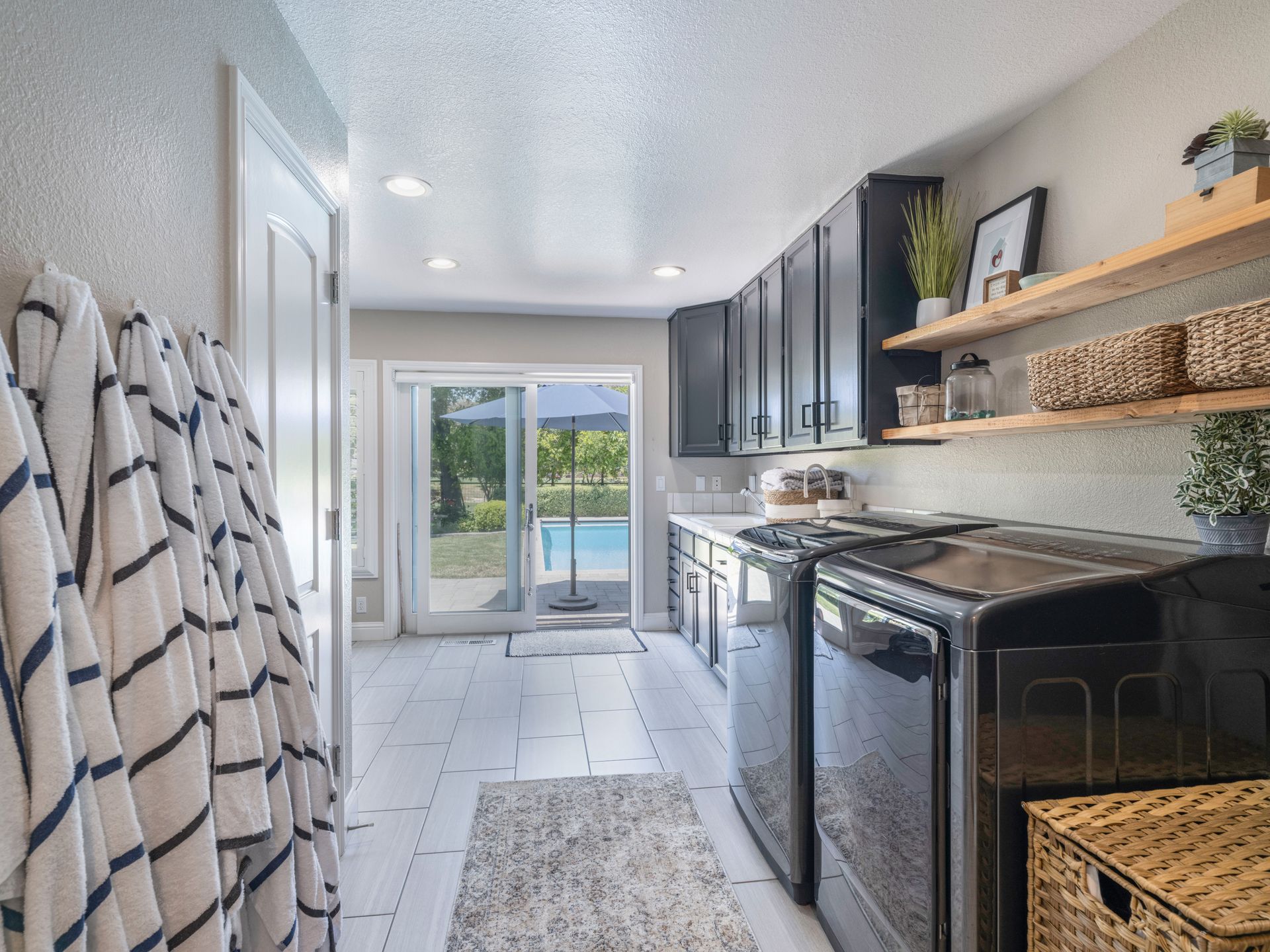 - Huge laundry room with pool access, ½ bath, built-in cabinets, additional closet storage and open shelving
