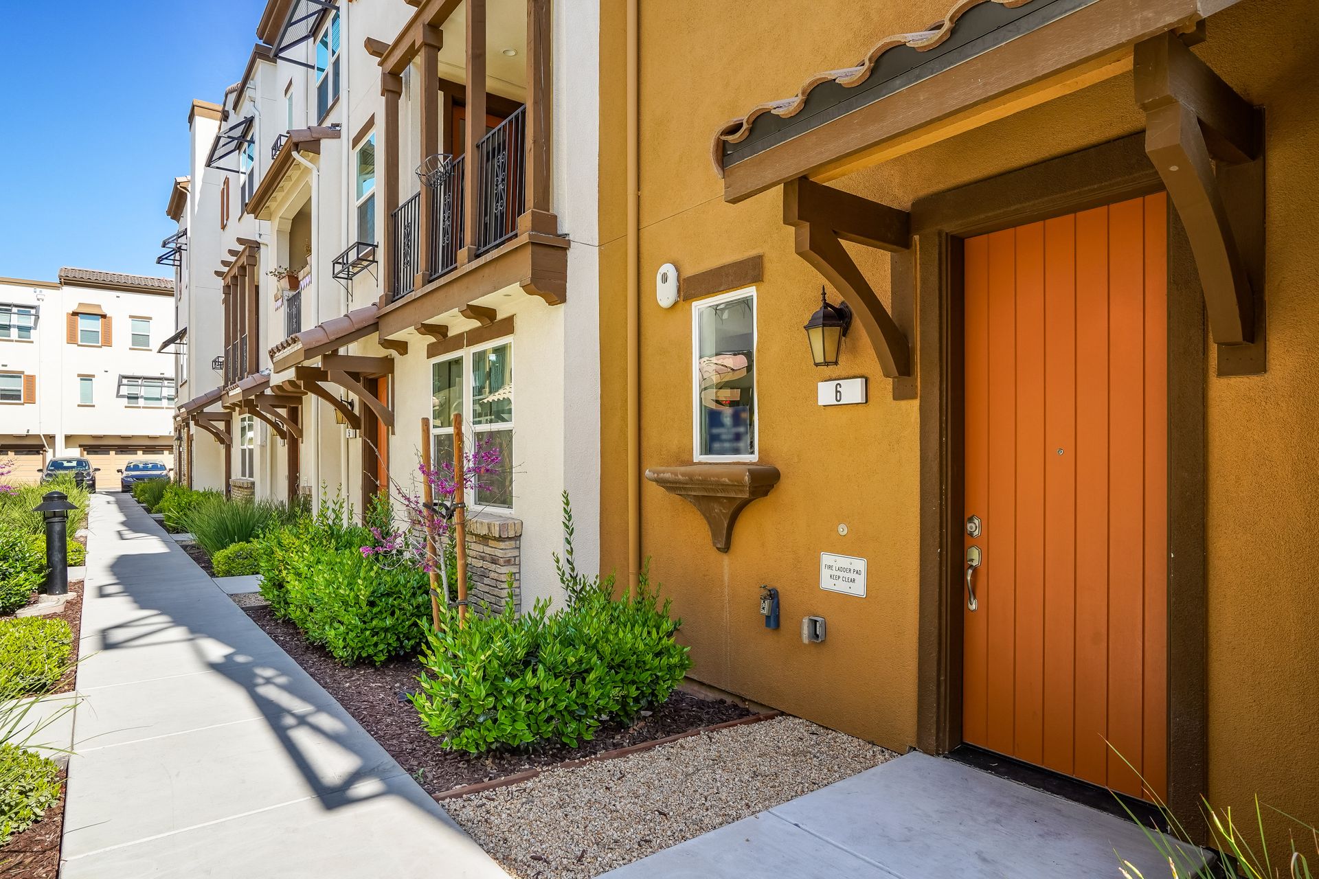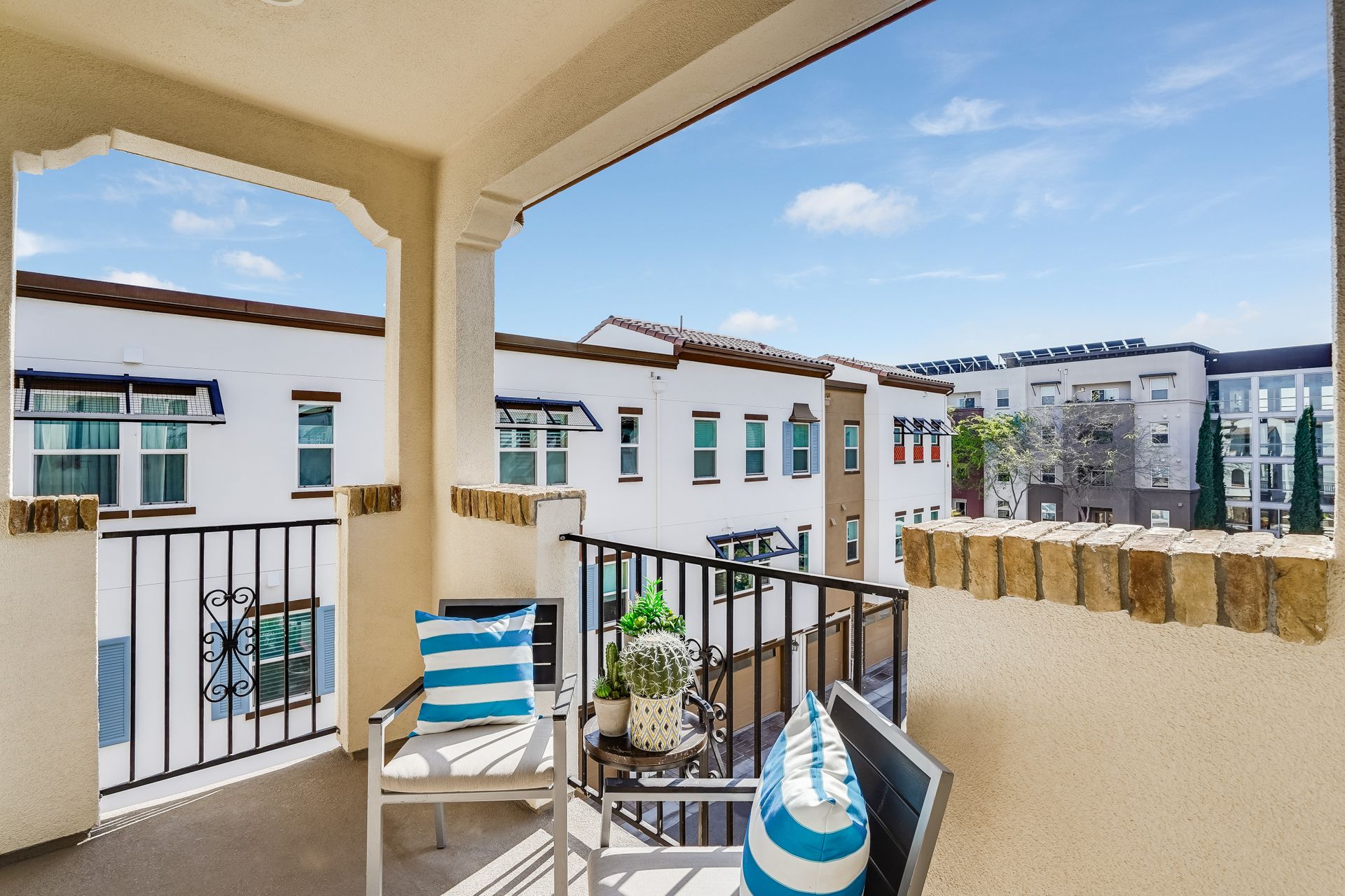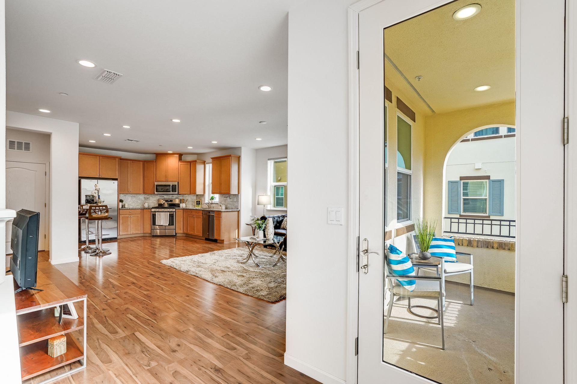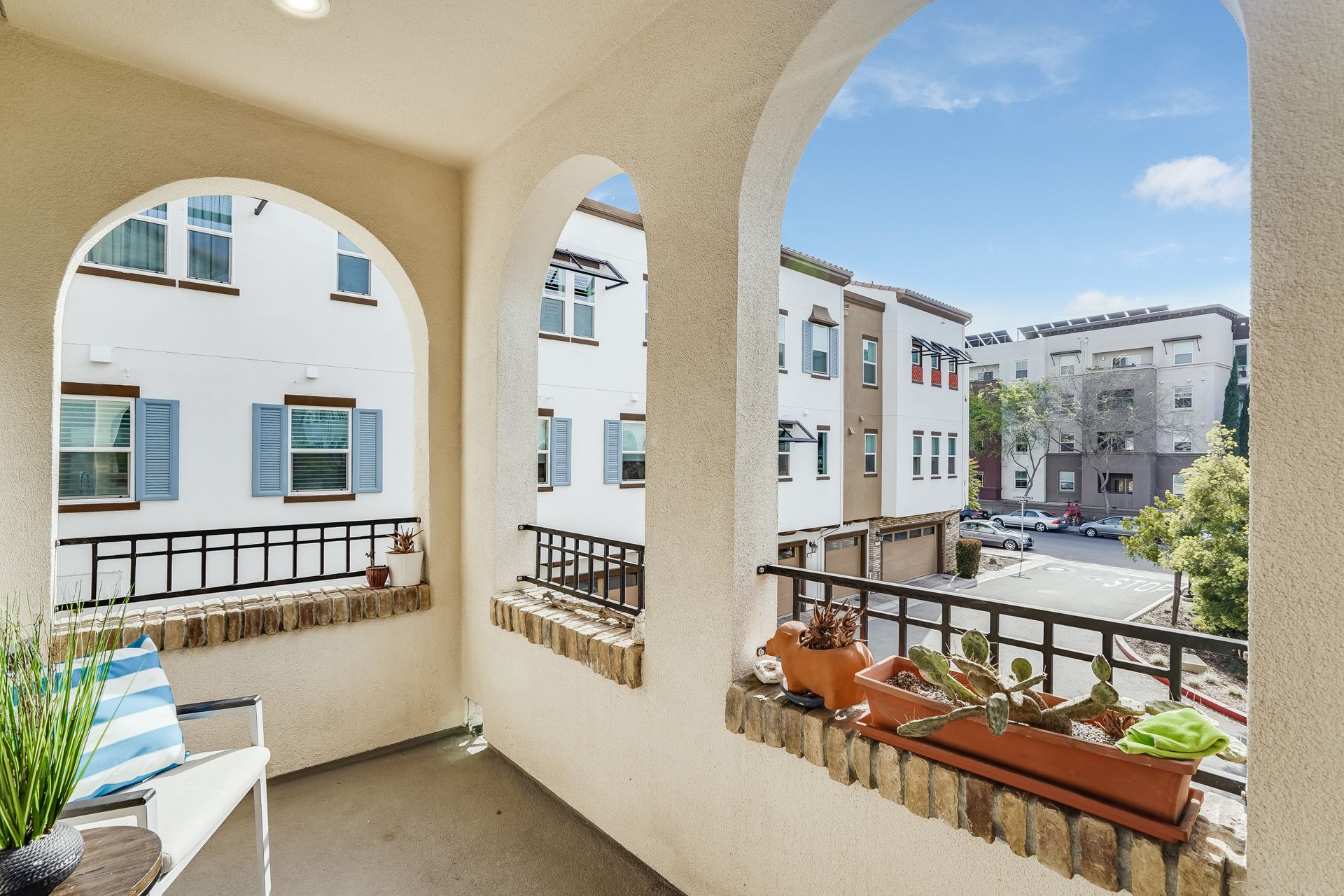 Welcome to this pristine townhome-style condo in the Indigo at Montecito Vista community built by Taylor Morrison. This unit features a spacious, approximately 1303 square feet of livable space with two bedrooms and two and one-half baths. Open main level with living area, dining area, and kitchen with granite counters, upgraded stainless appliances, five-burner gas range, soft close drawers, and custom pull-outs, plus balcony, half bath, large storage closet, upgraded recessed lighting, and laundry area. Upstairs find two bedrooms including a large primary retreat with a private balcony, each with an en-suite bathroom. Attached two-car tandem garage. Beautiful park located just a few feet from the property, with a BBQ area, basketball court, and a playground. Conveniently located to transportation and shopping.