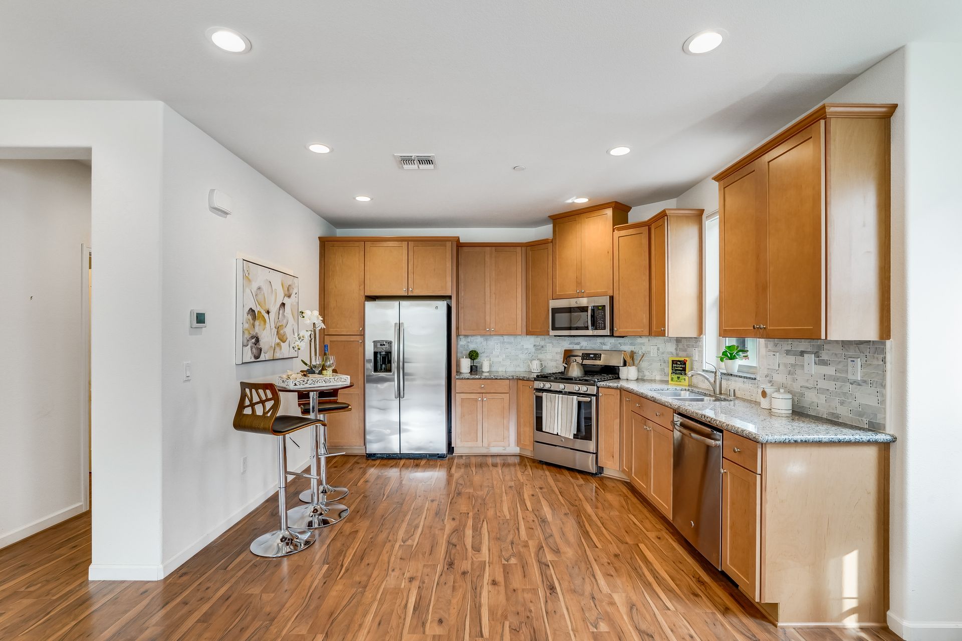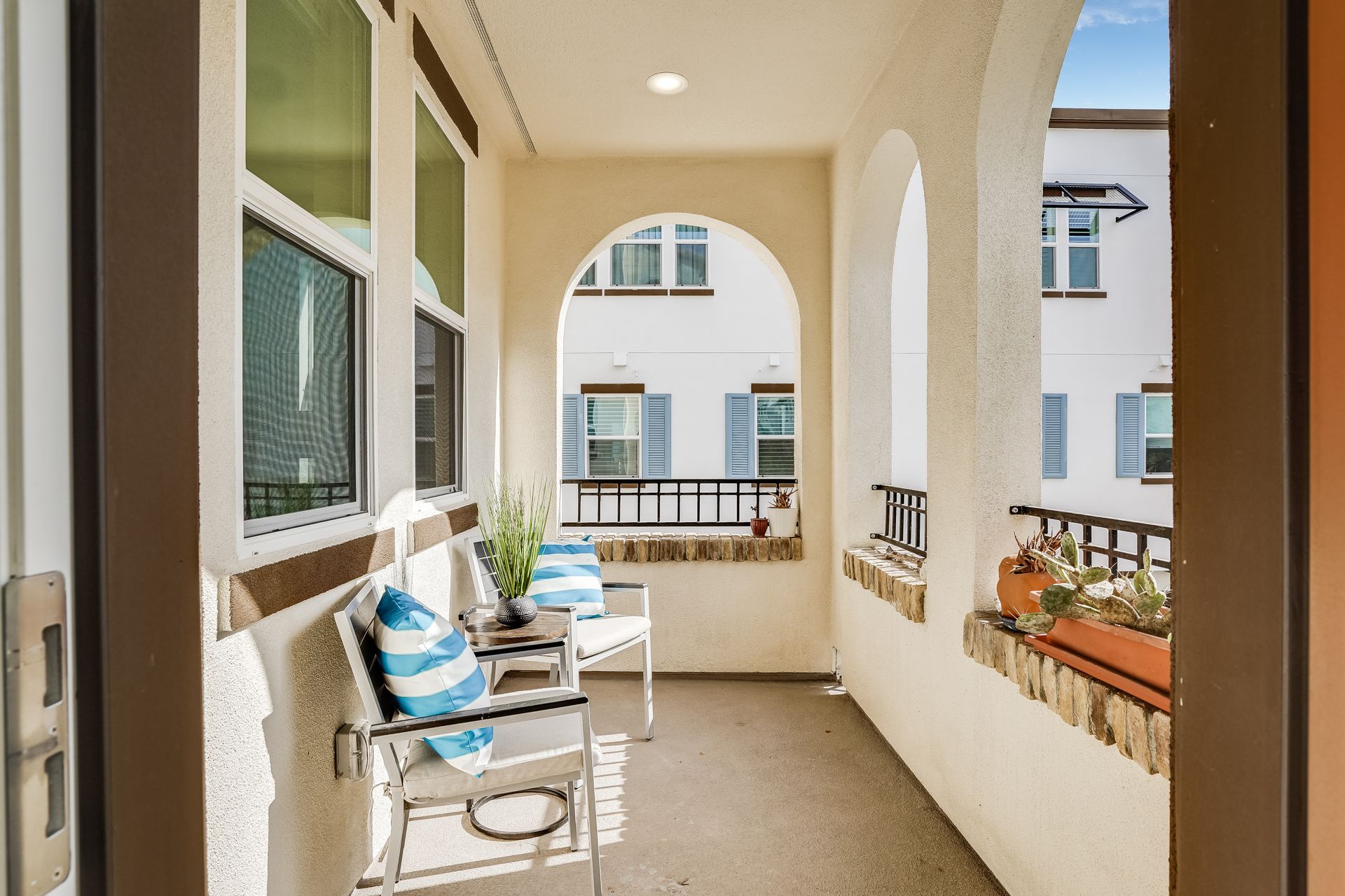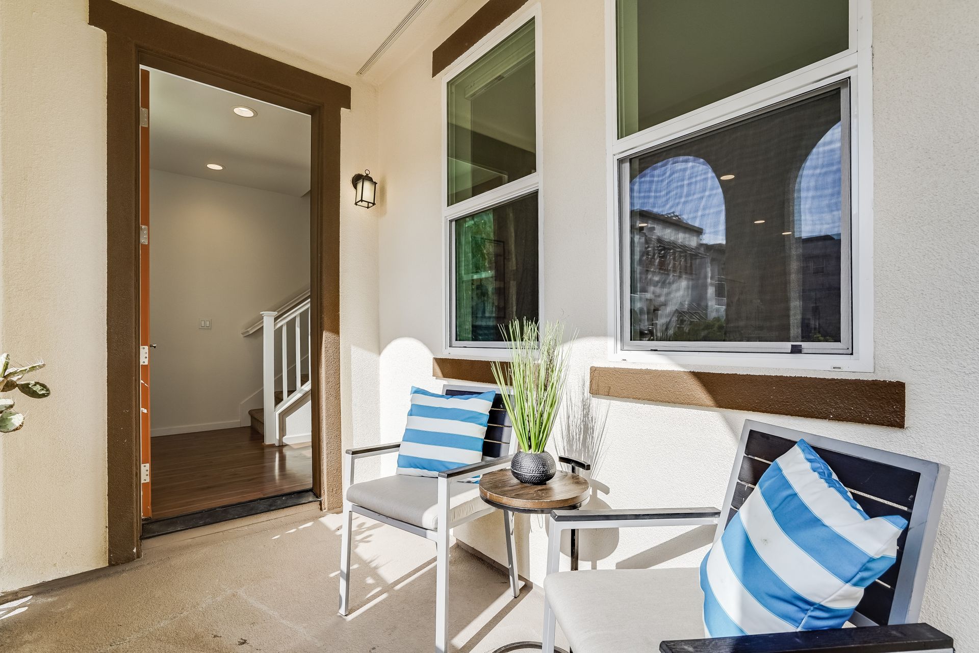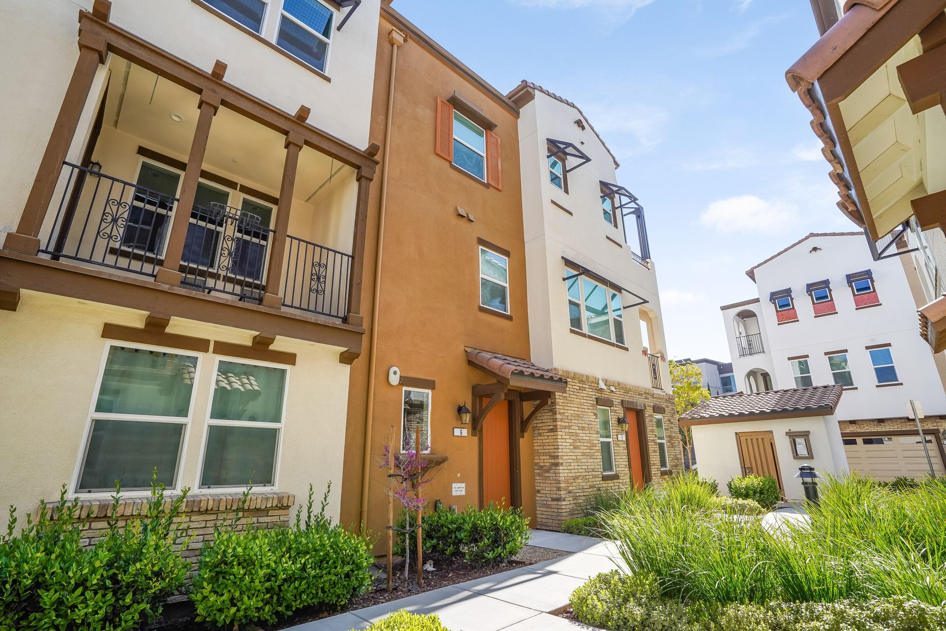 Welcome to this pristine townhome-style condo in the Indigo at Montecito Vista community built by Taylor Morrison. This unit features a spacious, approximately 1303 square feet of livable space with two bedrooms and two and one-half baths. Open main level with living area, dining area, and kitchen with granite counters, upgraded stainless appliances, five-burner gas range, soft close drawers, and custom pull-outs, plus balcony, half bath, large storage closet, upgraded recessed lighting, and laundry area. Upstairs find two bedrooms including a large primary retreat with a private balcony, each with an en-suite bathroom. Attached two-car tandem garage. Beautiful park located just a few feet from the property, with a BBQ area, basketball court, and a playground. Conveniently located to transportation and shopping.
