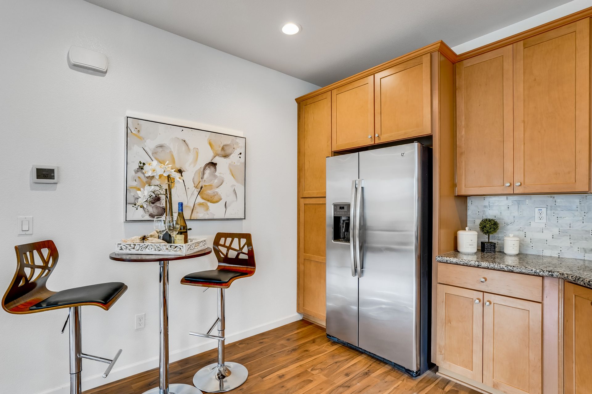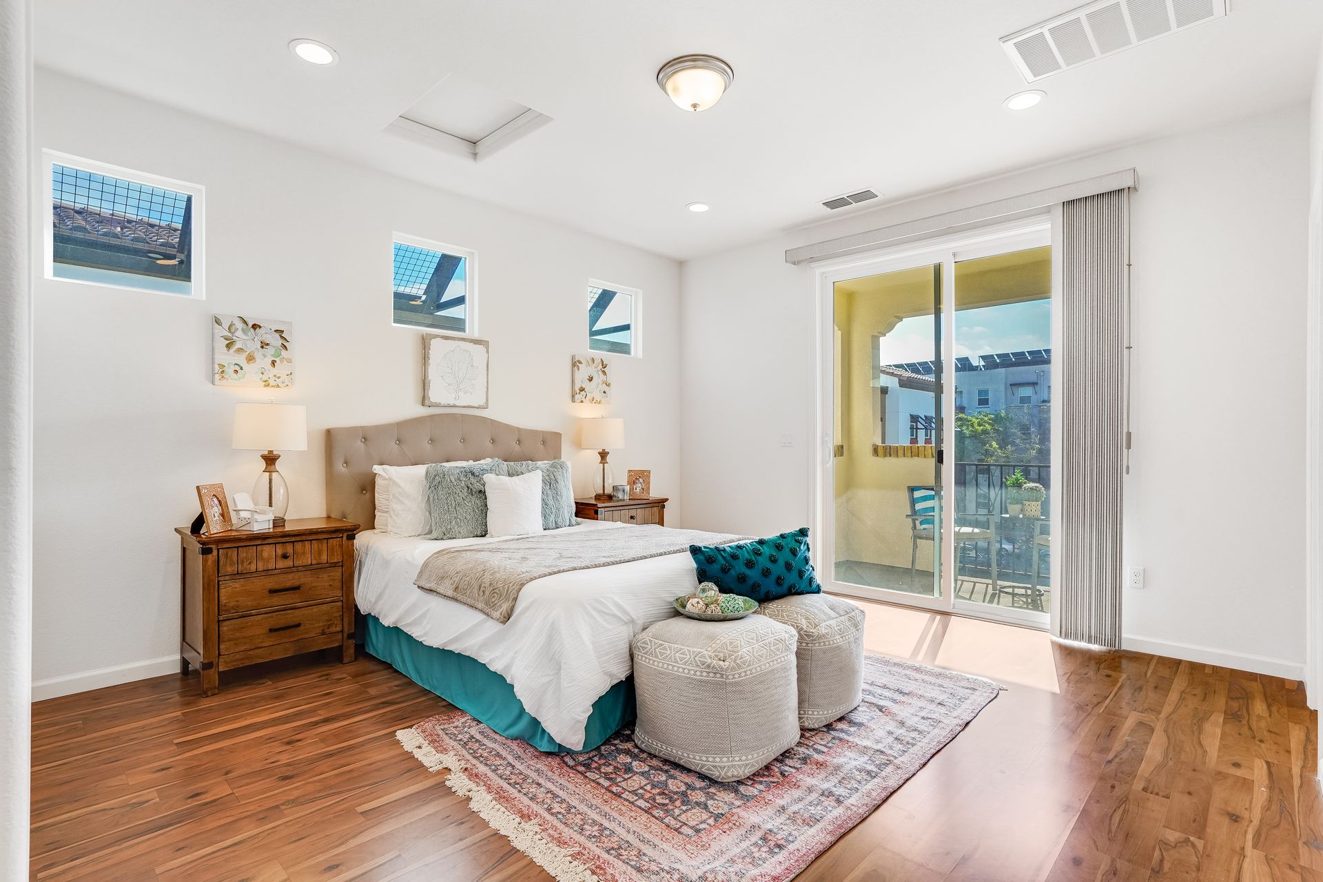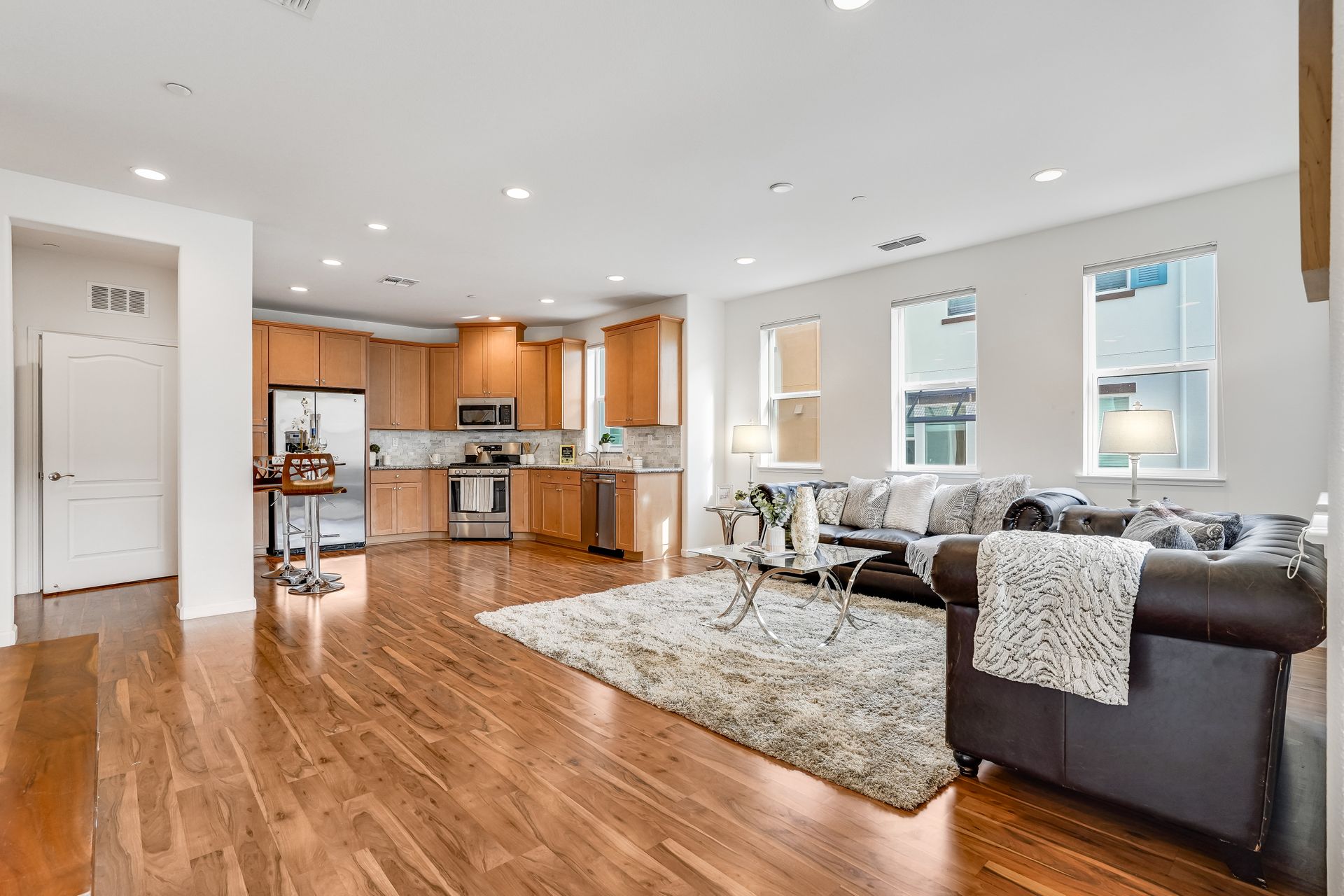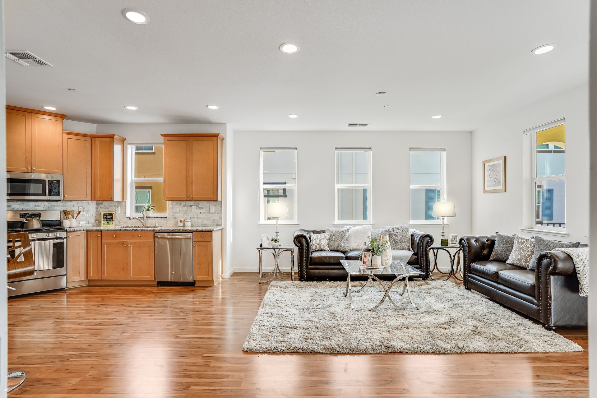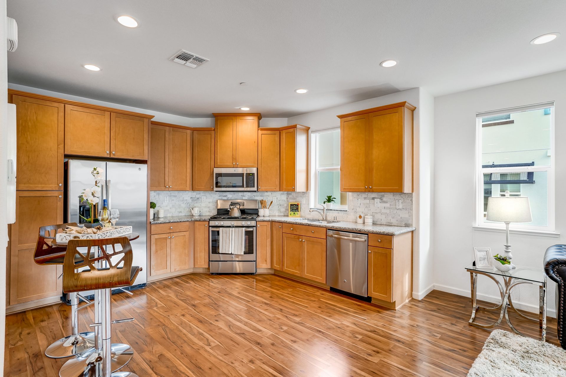 Welcome to this pristine townhome-style condo in the Indigo at Montecito Vista community built by Taylor Morrison. This unit features a spacious, approximately 1303 square feet of livable space with two bedrooms and two and one-half baths. Open main level with living area, dining area, and kitchen with granite counters, upgraded stainless appliances, five-burner gas range, soft close drawers, and custom pull-outs, plus balcony, half bath, large storage closet, upgraded recessed lighting, and laundry area. Upstairs find two bedrooms including a large primary retreat with a private balcony, each with an en-suite bathroom. Attached two-car tandem garage. Beautiful park located just a few feet from the property, with a BBQ area, basketball court, and a playground. Conveniently located to transportation and shopping.