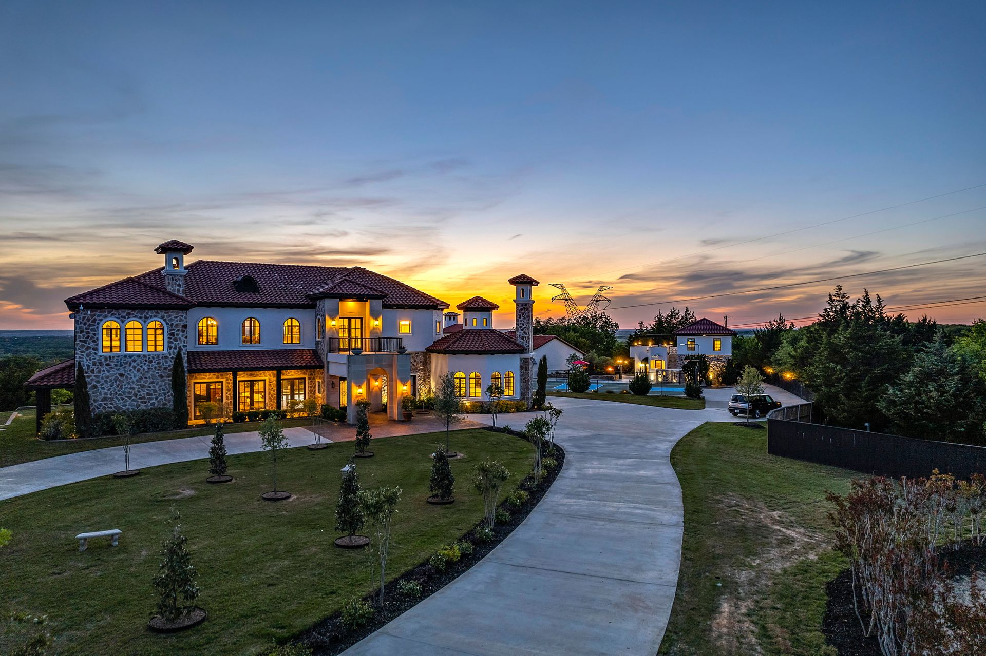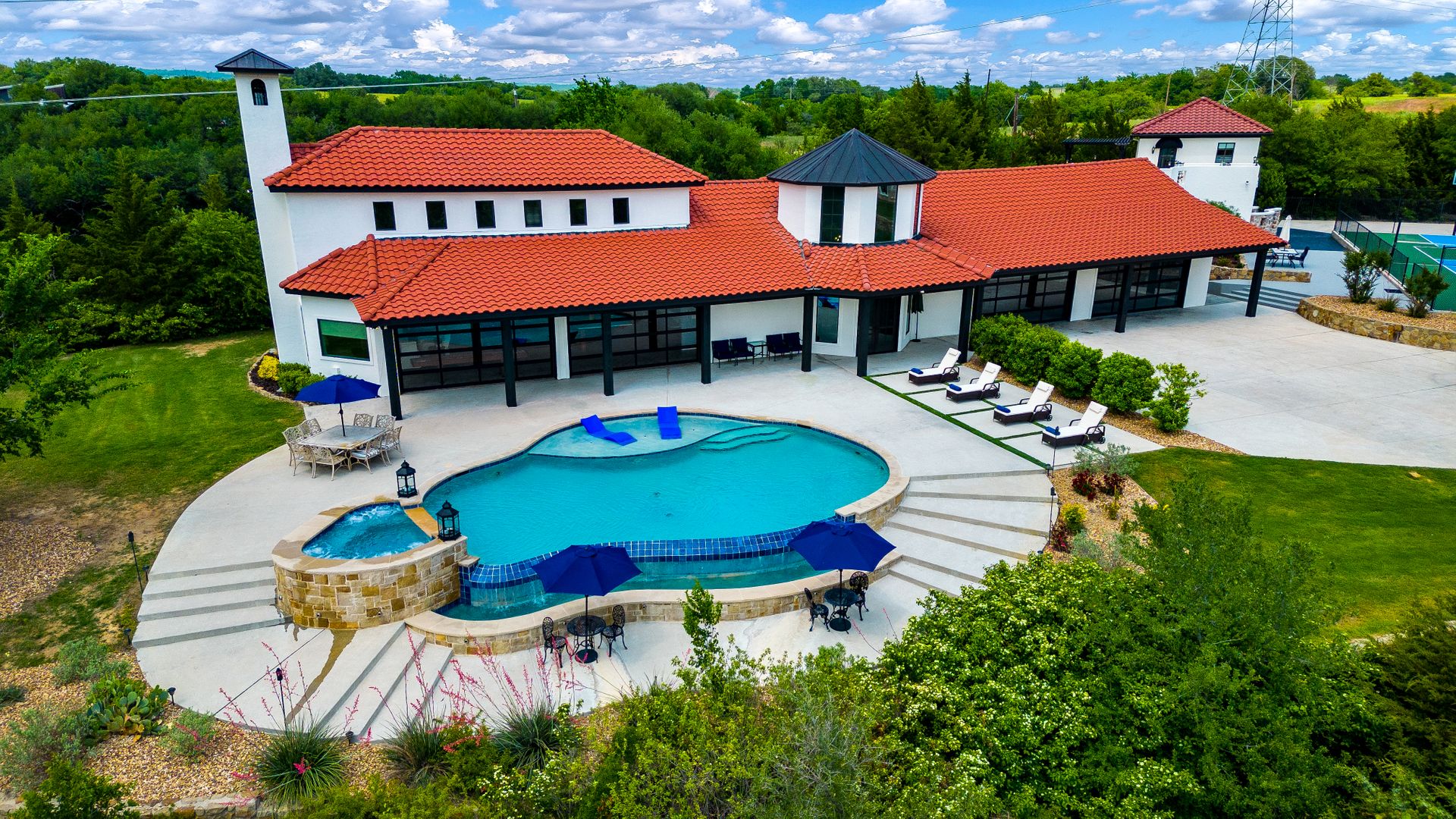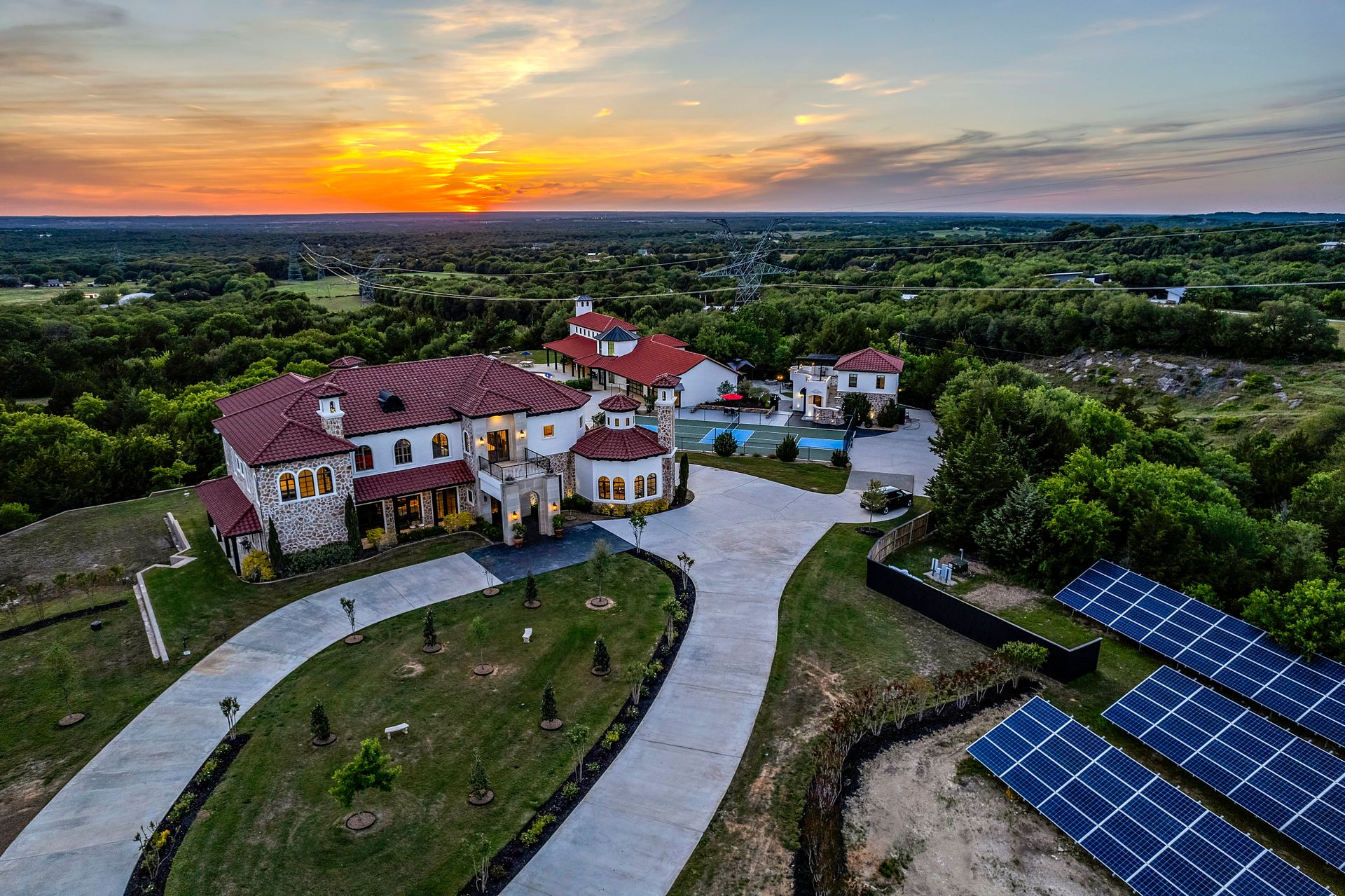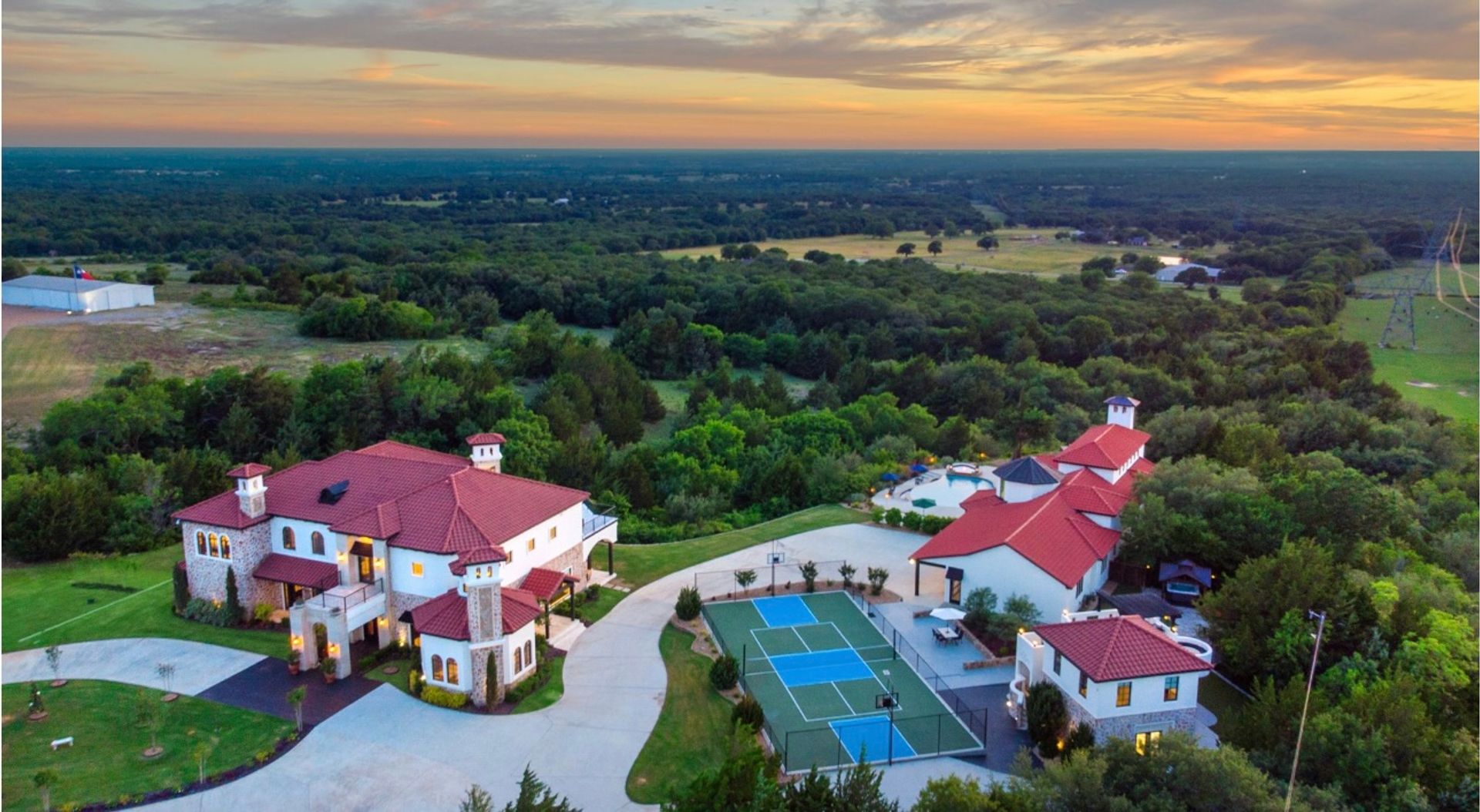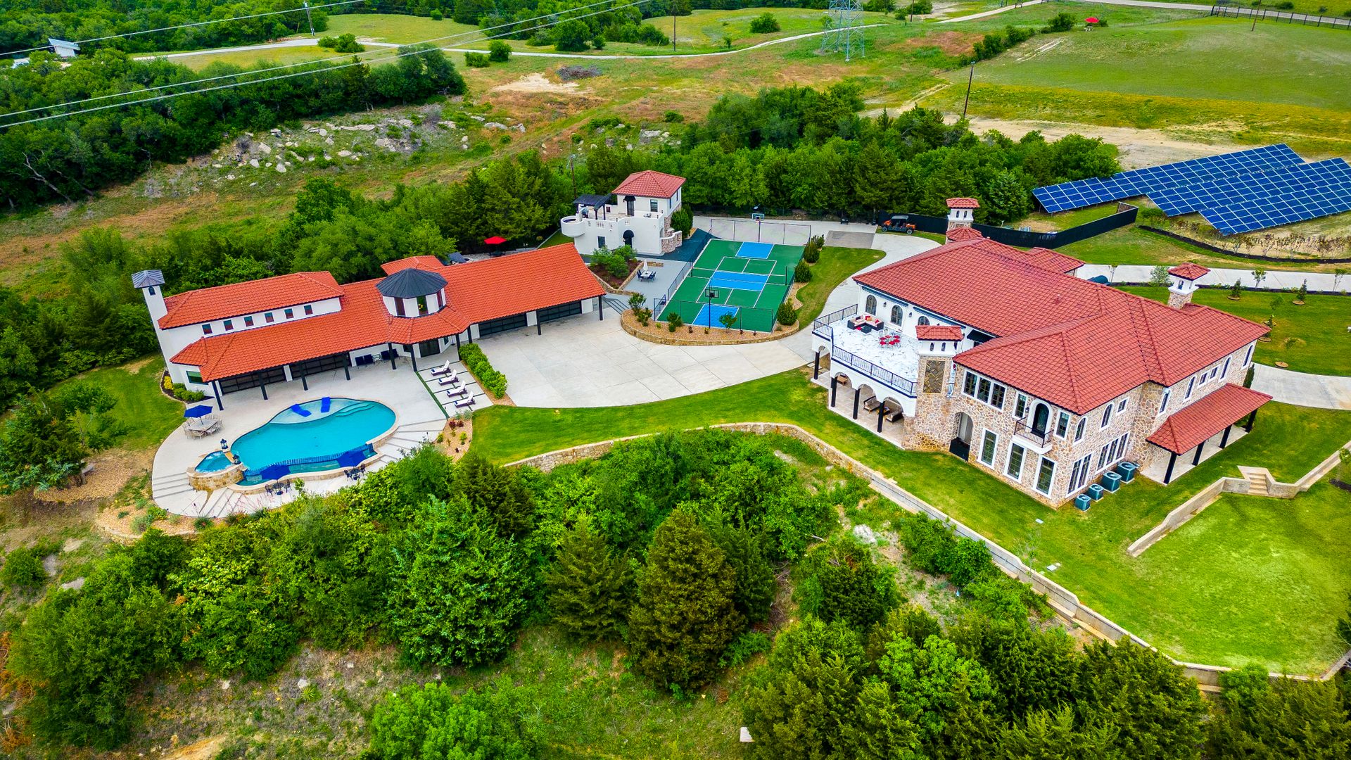 Welcome to La Casa de Fe! This magnificent estate located in the charming city of Decatur, TX. This sprawling property spans an impressive 25 acres, offering an abundance of luxurious amenities and the most breathtaking views you will find in North Texas. This beautiful property presents an incredible opportunity to embrace a serene lifestyle while being conveniently close to urban amenities. The enchanting main house known as "The Spanish Castle" exudes a touch of Old-World charm and elegance, transporting you to a realm of architectural beauty and timeless sophistication. With it's distinctive Spanish-inspired design, this residence offers a truly unique living experience with 5 bedrooms, 8 baths, multiple living and dining areas, cinema room, executive office, resort sized balcony, and resort sized veranda with outdoor commercial grade kitchen and wine bar. The Spanish-style mansion has tastefully appointed interior features such as reclaimed redwood floors, elegant light fixtures, imported tile, and a spectacular view from almost every room. The 3,000-square foot entertainer's dream pool house is flooded with natural light through the custom glass garage doors that open to a resort-style pool with a 32-foot infinity edge and spa area made for relaxing. The pool house also has 2 bedrooms, a loft, and 1 and a half baths, and a 4-car garage with more custom glass doors. The fully equipped Parisian guest villa known as "A Walk in Paris" is ideal for hosting guests in a cozy and intimate space. It will leave your guests feeling like they are on vacation. You will also find a secluded area featuring a putting green, fire pit, and pergola covered custom hot tub. Fitness enthusiasts will appreciate the on-site fitness center, equipped with complete home gym, kitchen, laundry, and half bath. Stay active and maintain a healthy lifestyle day or night on the sports court featuring pickleball, tennis and basketball. Other property amenities include a Helipad situated next to a large hanger or barn ideal for storing helicopters, boats, RVs, or horses. A driving range, hen house, solar farm that produces 74,250 kilowatts of power - the ultimate in energy efficiency, pastures, deck with comfy couch to have a front row seat each day for sunset, multiple outdoor entertaining areas, and a high-flying Texas flag round out this beautiful home. Don't miss the chance to experience the epitome of refined TEXAS living in this exceptional estate!