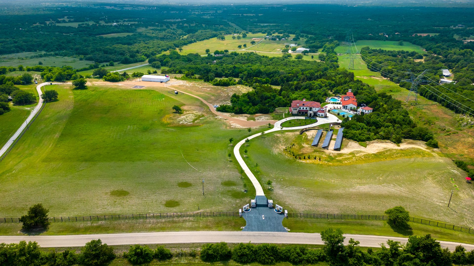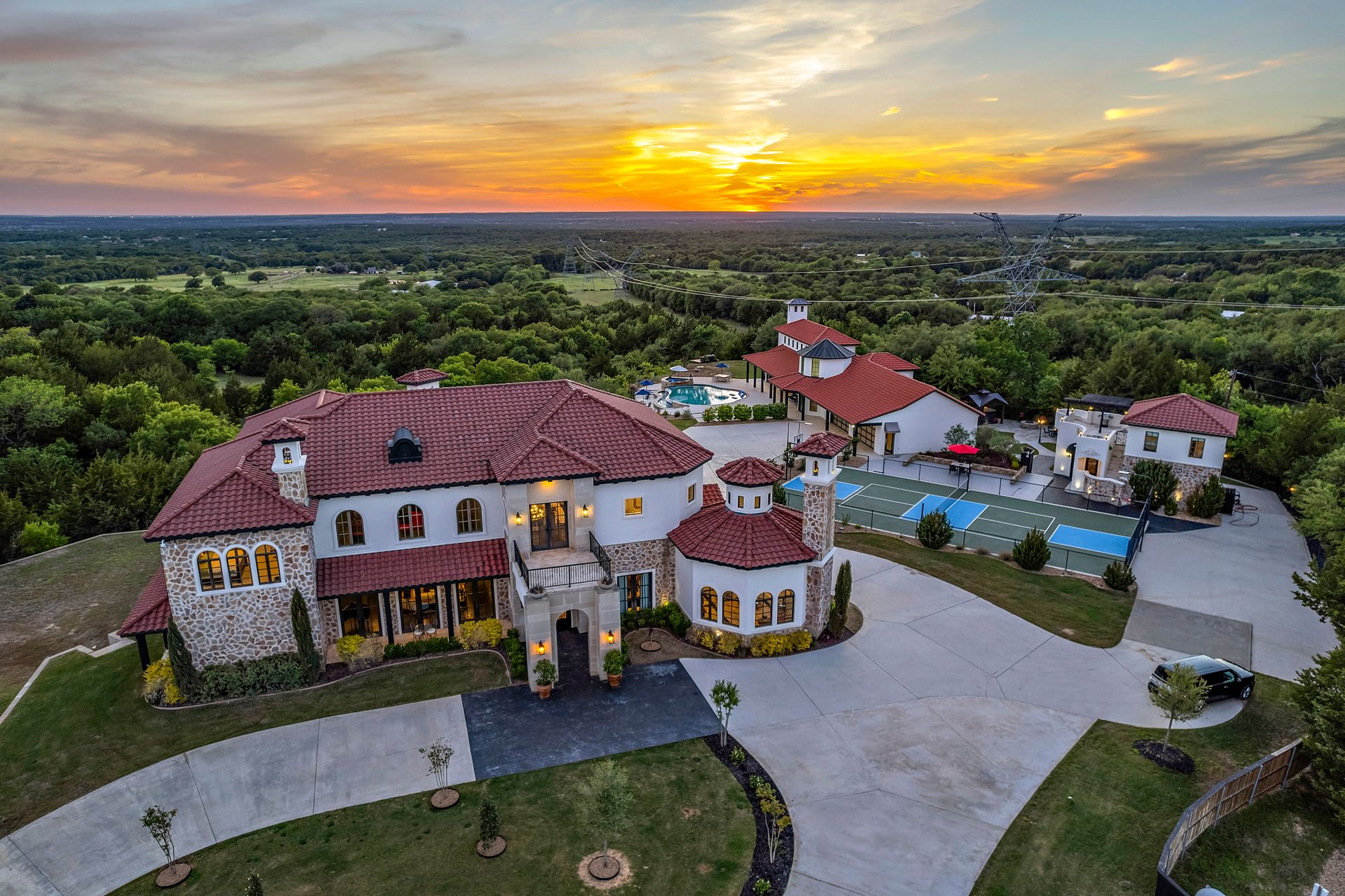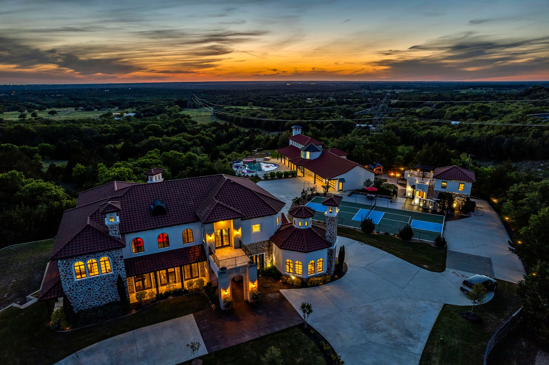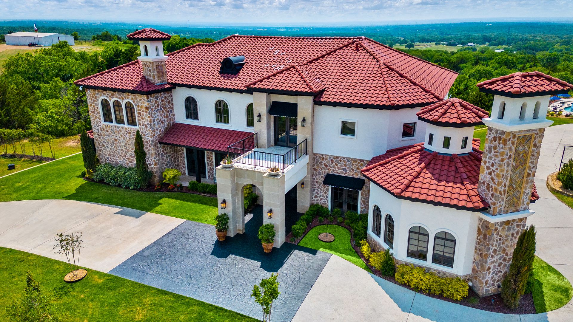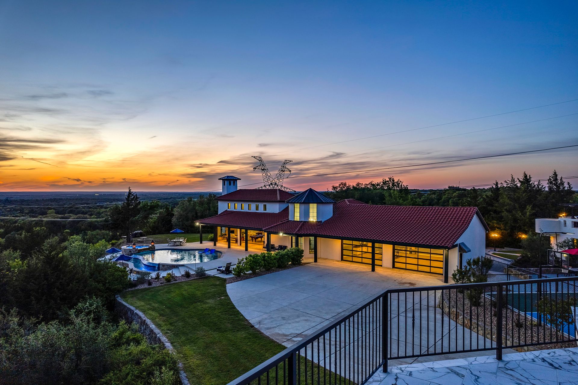 Welcome to La Casa de Fe! This magnificent estate located in the charming city of Decatur, TX. This sprawling property spans an impressive 25 acres, offering an abundance of luxurious amenities and the most breathtaking views you will find in North Texas. This beautiful property presents an incredible opportunity to embrace a serene lifestyle while being conveniently close to urban amenities. The enchanting main house known as "The Spanish Castle" exudes a touch of Old-World charm and elegance, transporting you to a realm of architectural beauty and timeless sophistication. With it's distinctive Spanish-inspired design, this residence offers a truly unique living experience with 5 bedrooms, 8 baths, multiple living and dining areas, cinema room, executive office, resort sized balcony, and resort sized veranda with outdoor commercial grade kitchen and wine bar. The Spanish-style mansion has tastefully appointed interior features such as reclaimed redwood floors, elegant light fixtures, imported tile, and a spectacular view from almost every room. The 3,000-square foot entertainer's dream pool house is flooded with natural light through the custom glass garage doors that open to a resort-style pool with a 32-foot infinity edge and spa area made for relaxing. The pool house also has 2 bedrooms, a loft, and 1 and a half baths, and a 4-car garage with more custom glass doors. The fully equipped Parisian guest villa known as "A Walk in Paris" is ideal for hosting guests in a cozy and intimate space. It will leave your guests feeling like they are on vacation. You will also find a secluded area featuring a putting green, fire pit, and pergola covered custom hot tub. Fitness enthusiasts will appreciate the on-site fitness center, equipped with complete home gym, kitchen, laundry, and half bath. Stay active and maintain a healthy lifestyle day or night on the sports court featuring pickleball, tennis and basketball. Other property amenities include a Helipad situated next to a large hanger or barn ideal for storing helicopters, boats, RVs, or horses. A driving range, hen house, solar farm that produces 74,250 kilowatts of power - the ultimate in energy efficiency, pastures, deck with comfy couch to have a front row seat each day for sunset, multiple outdoor entertaining areas, and a high-flying Texas flag round out this beautiful home. Don't miss the chance to experience the epitome of refined TEXAS living in this exceptional estate!