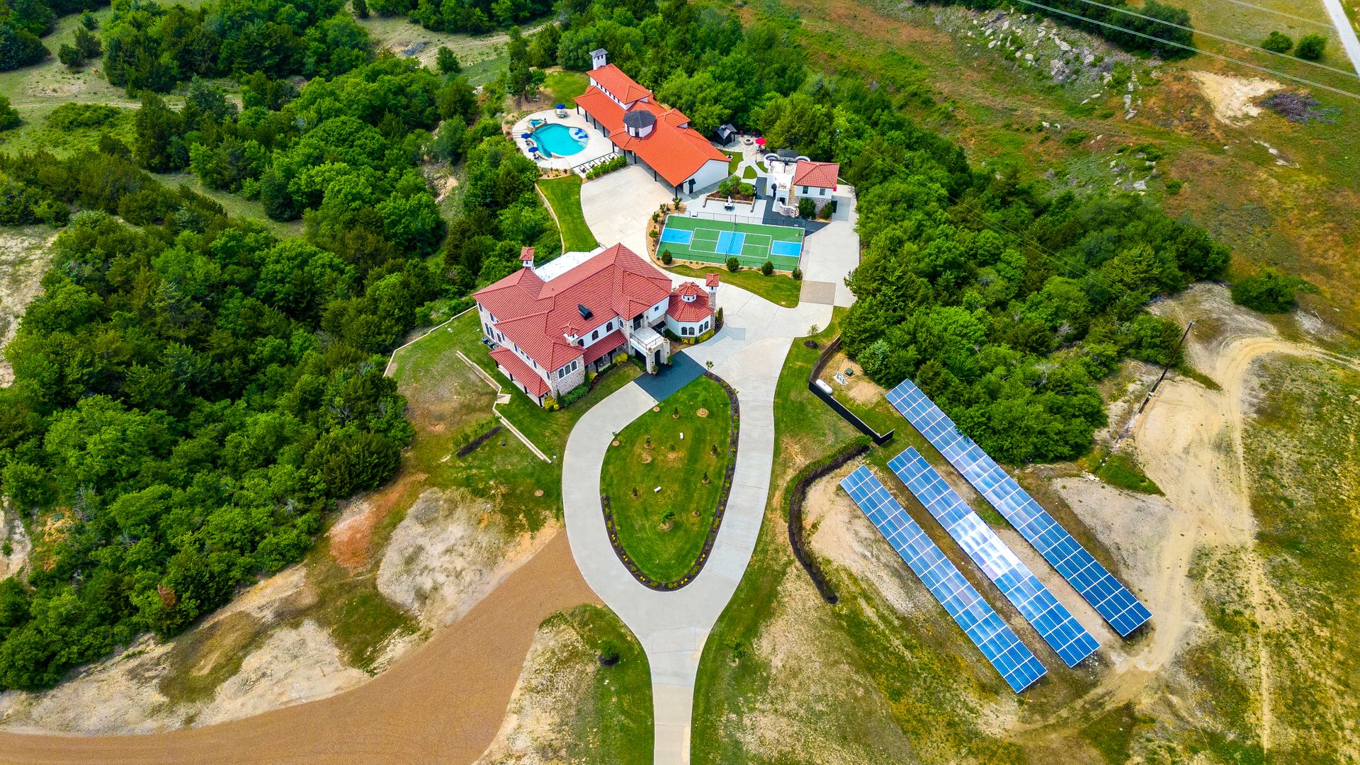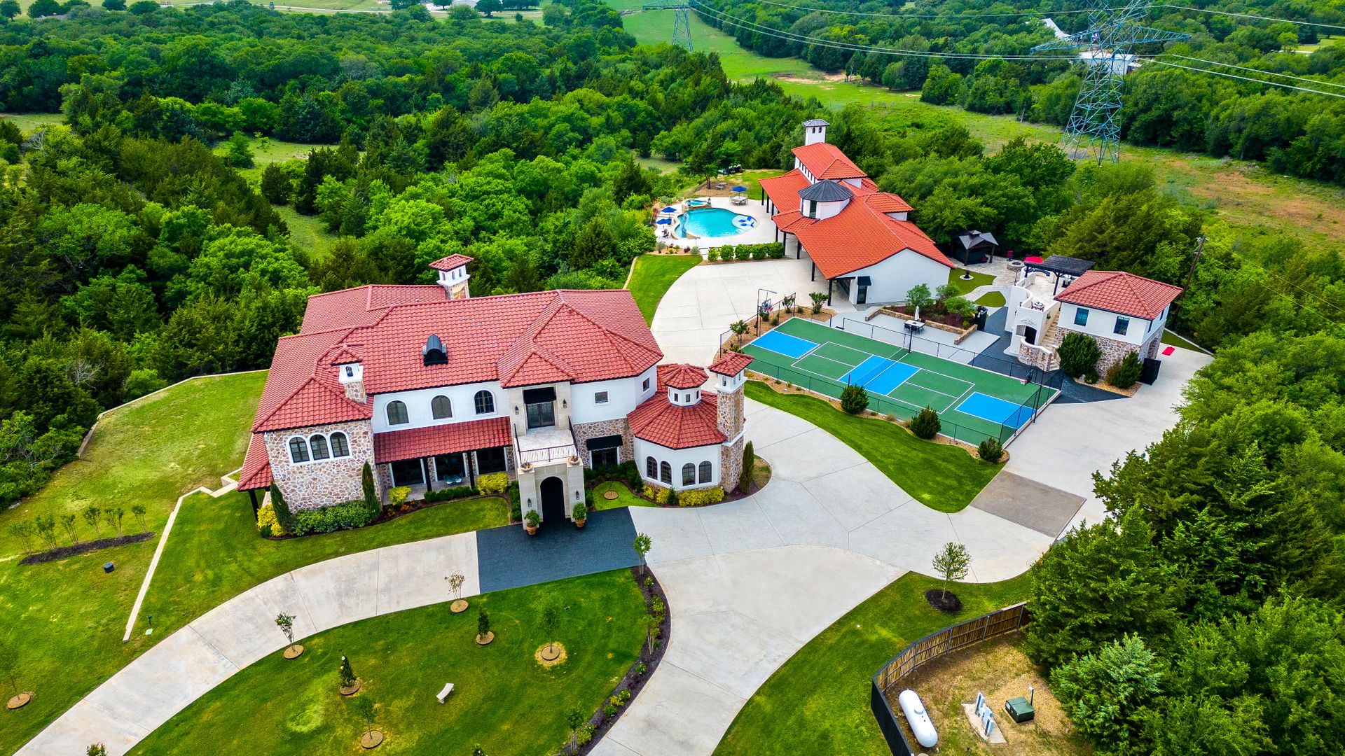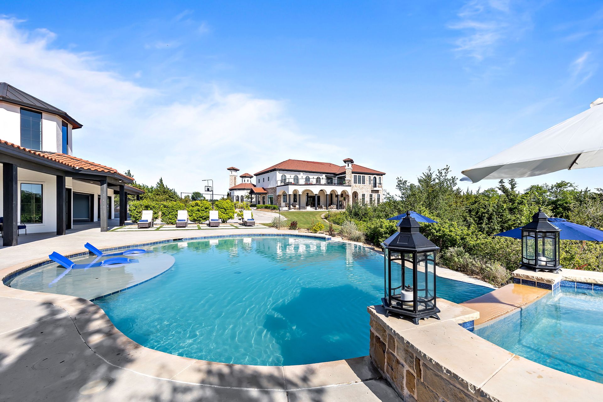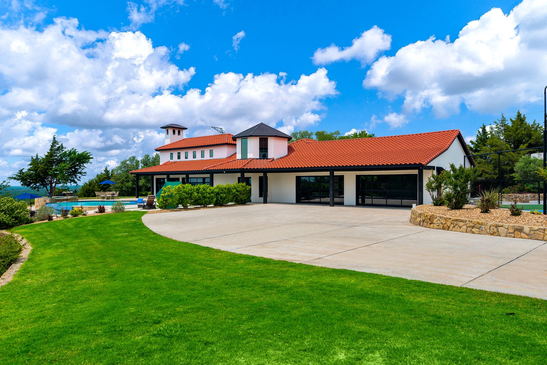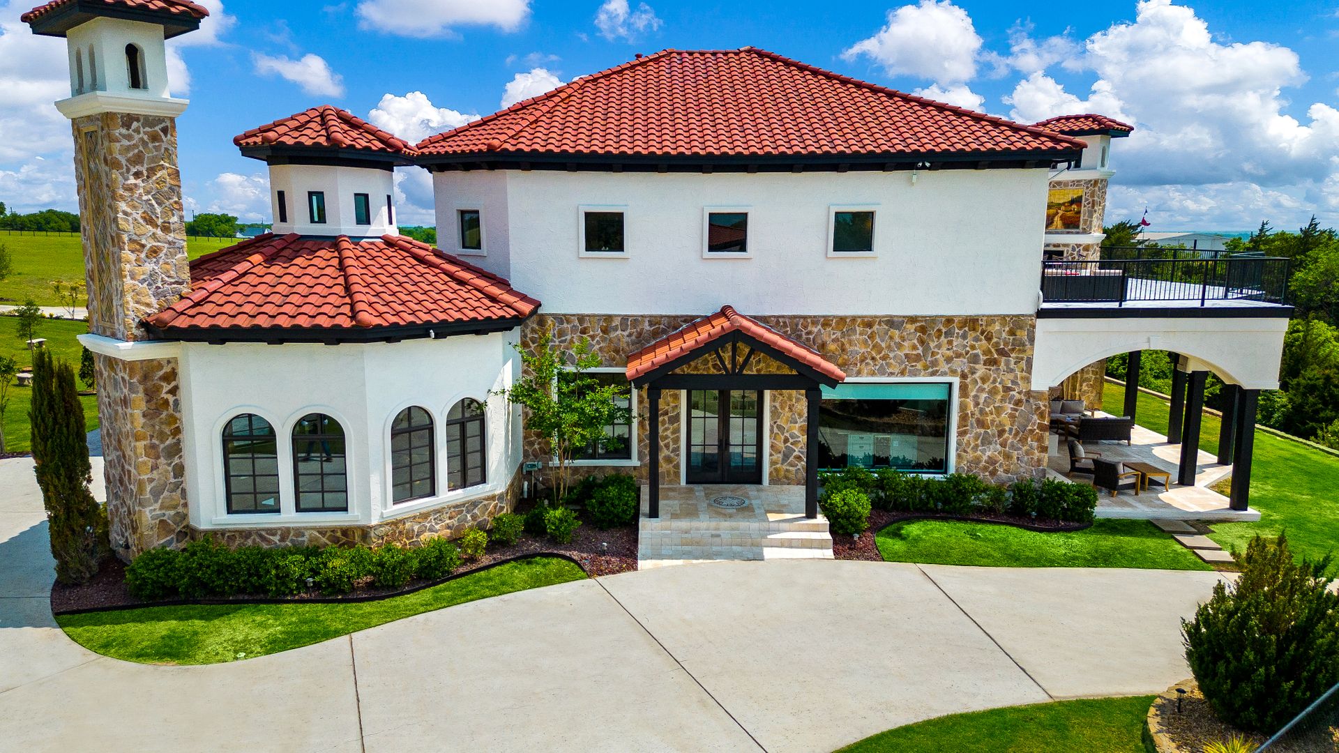 Welcome to La Casa de Fe! This magnificent estate located in the charming city of Decatur, TX. This sprawling property spans an impressive 25 acres, offering an abundance of luxurious amenities and the most breathtaking views you will find in North Texas. This beautiful property presents an incredible opportunity to embrace a serene lifestyle while being conveniently close to urban amenities. The enchanting main house known as "The Spanish Castle" exudes a touch of Old-World charm and elegance, transporting you to a realm of architectural beauty and timeless sophistication. With it's distinctive Spanish-inspired design, this residence offers a truly unique living experience with 5 bedrooms, 8 baths, multiple living and dining areas, cinema room, executive office, resort sized balcony, and resort sized veranda with outdoor commercial grade kitchen and wine bar. The Spanish-style mansion has tastefully appointed interior features such as reclaimed redwood floors, elegant light fixtures, imported tile, and a spectacular view from almost every room. The 3,000-square foot entertainer's dream pool house is flooded with natural light through the custom glass garage doors that open to a resort-style pool with a 32-foot infinity edge and spa area made for relaxing. The pool house also has 2 bedrooms, a loft, and 1 and a half baths, and a 4-car garage with more custom glass doors. The fully equipped Parisian guest villa known as "A Walk in Paris" is ideal for hosting guests in a cozy and intimate space. It will leave your guests feeling like they are on vacation. You will also find a secluded area featuring a putting green, fire pit, and pergola covered custom hot tub. Fitness enthusiasts will appreciate the on-site fitness center, equipped with complete home gym, kitchen, laundry, and half bath. Stay active and maintain a healthy lifestyle day or night on the sports court featuring pickleball, tennis and basketball. Other property amenities include a Helipad situated next to a large hanger or barn ideal for storing helicopters, boats, RVs, or horses. A driving range, hen house, solar farm that produces 74,250 kilowatts of power - the ultimate in energy efficiency, pastures, deck with comfy couch to have a front row seat each day for sunset, multiple outdoor entertaining areas, and a high-flying Texas flag round out this beautiful home. Don't miss the chance to experience the epitome of refined TEXAS living in this exceptional estate!