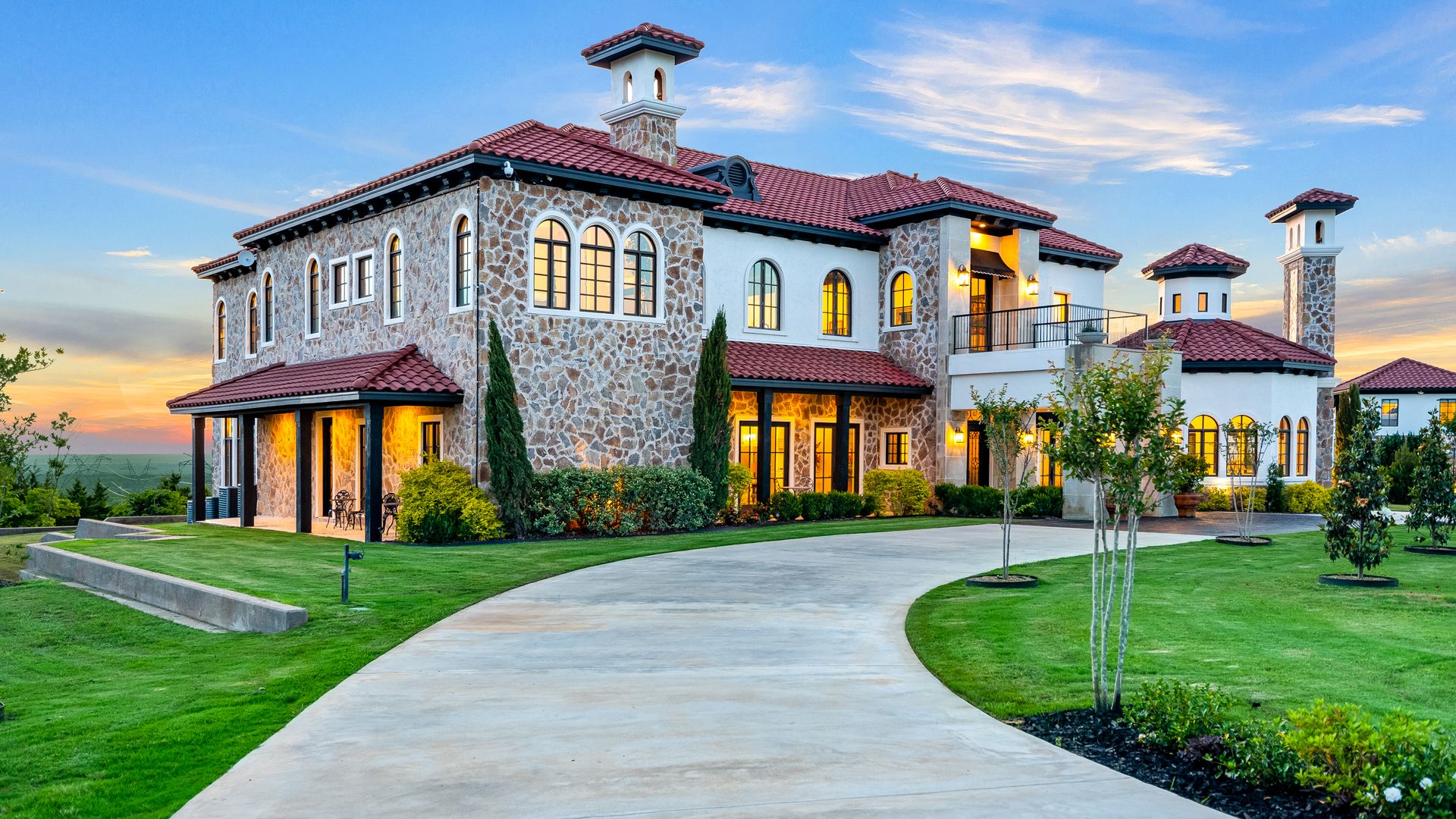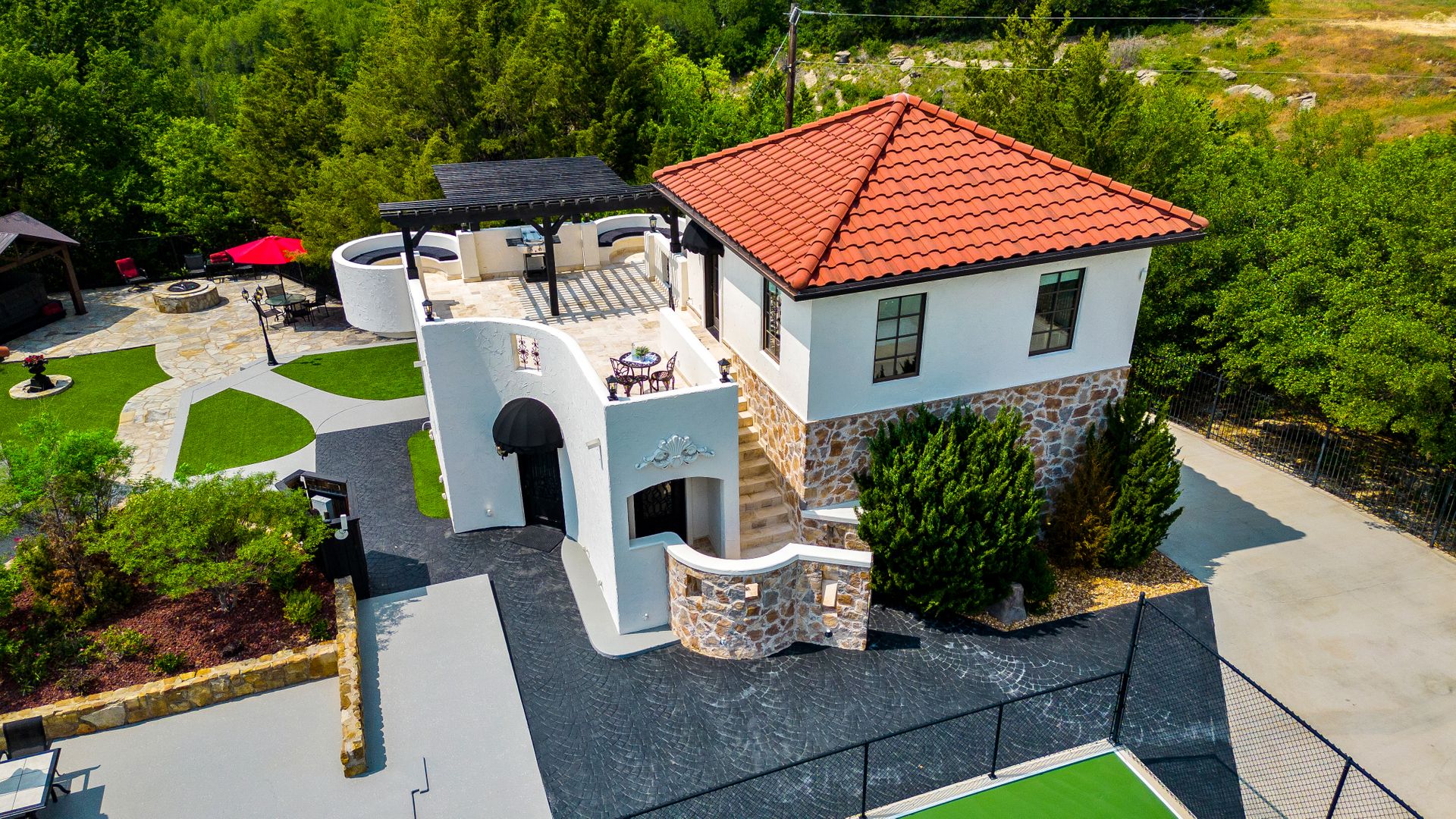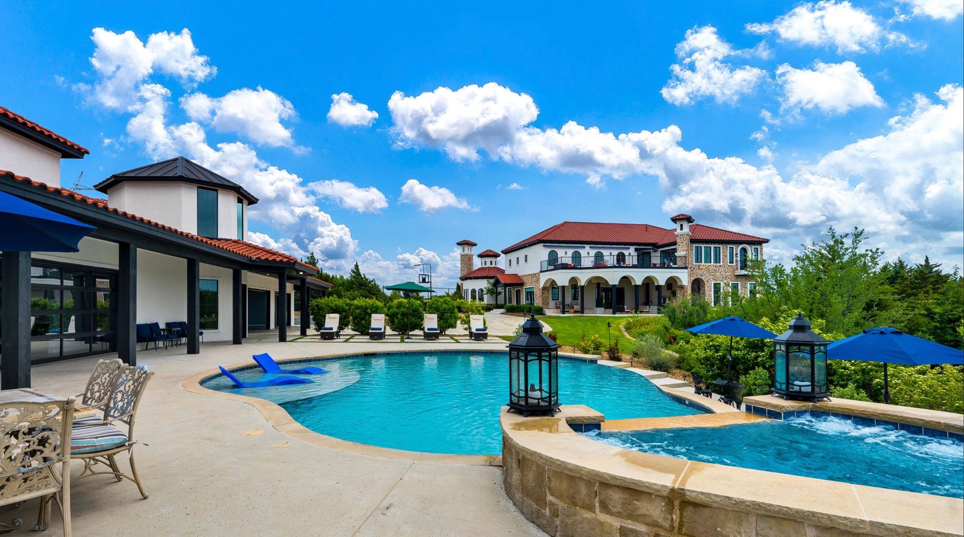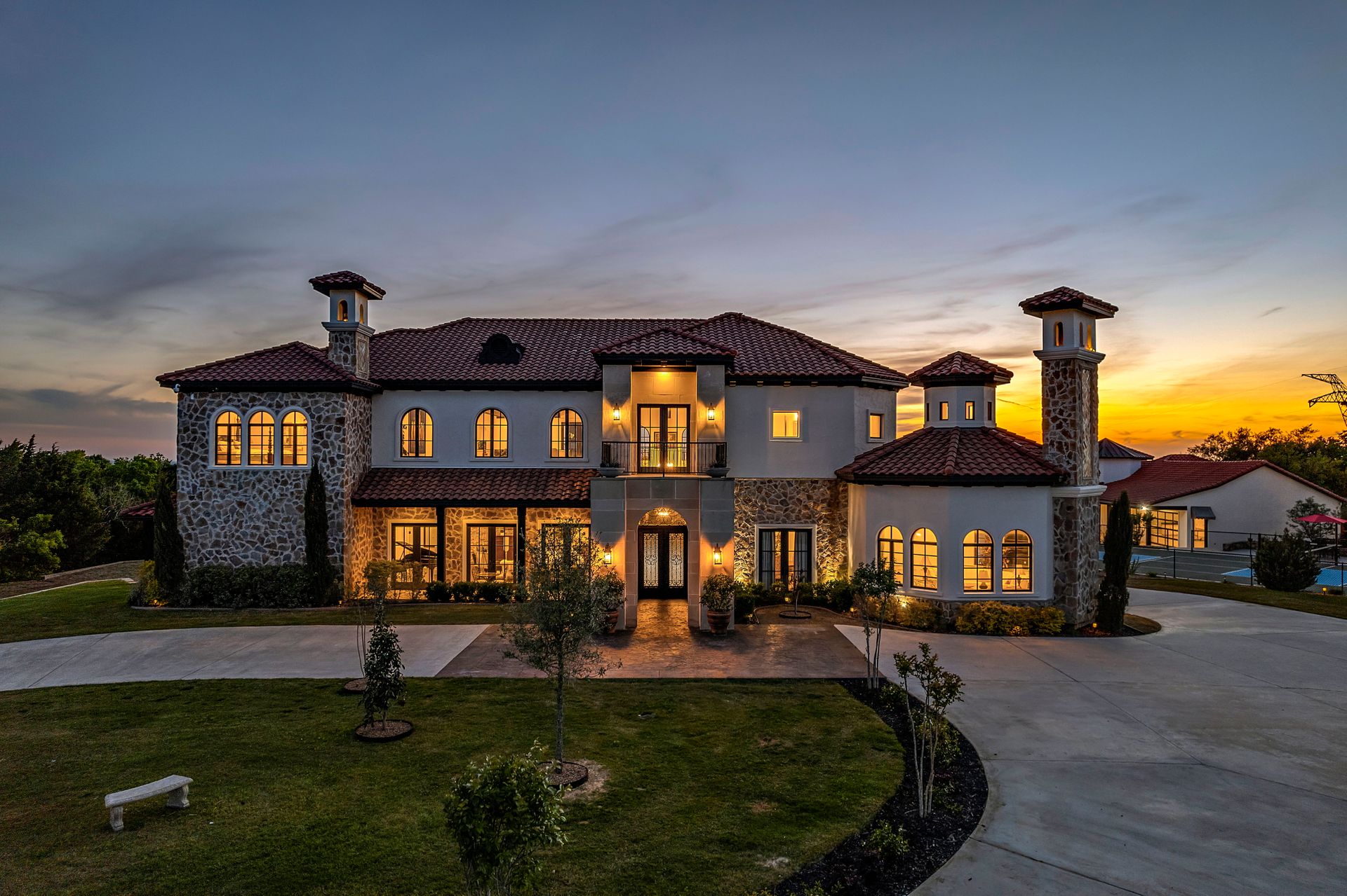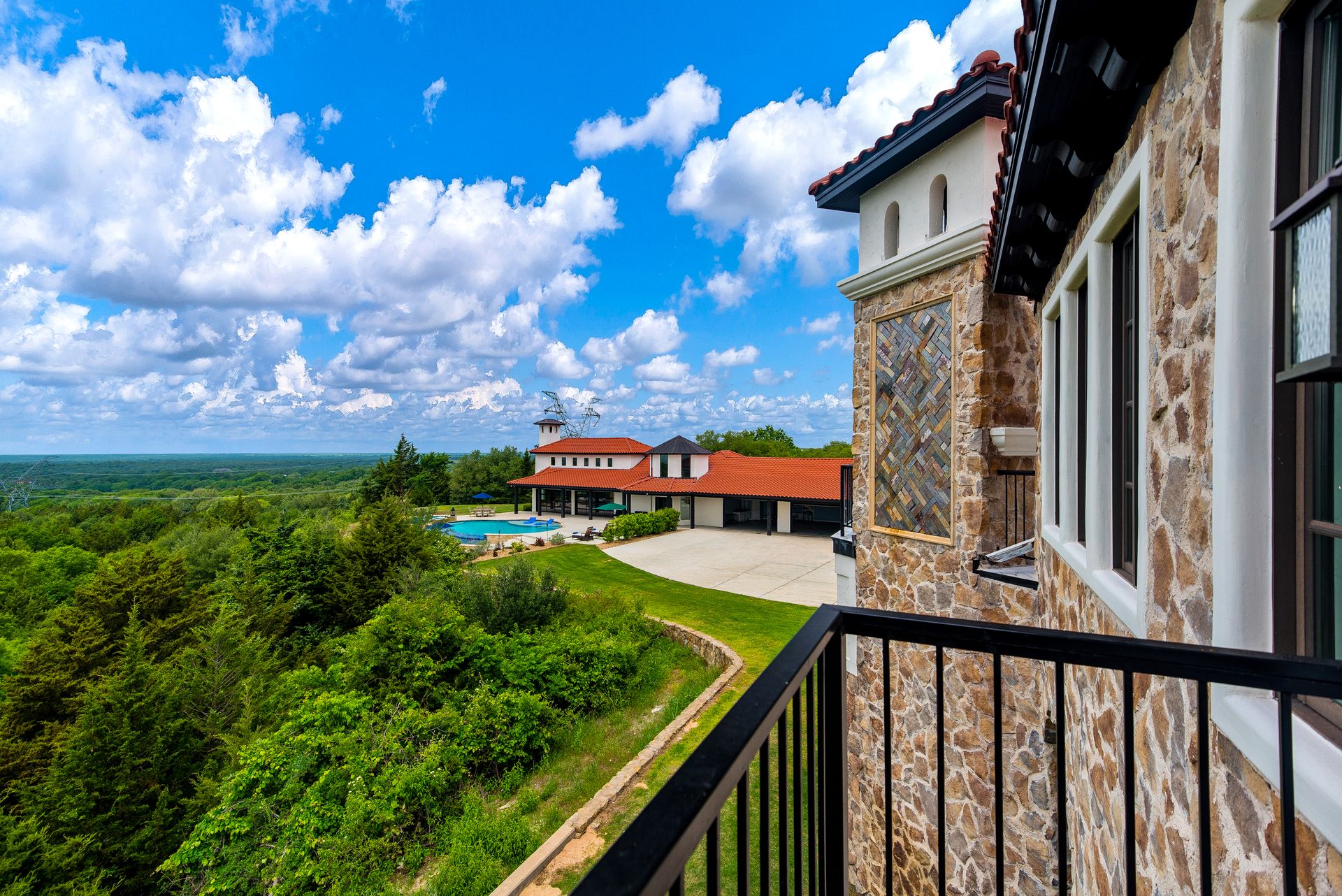 Welcome to La Casa de Fe! This magnificent estate located in the charming city of Decatur, TX. This sprawling property spans an impressive 25 acres, offering an abundance of luxurious amenities and the most breathtaking views you will find in North Texas. This beautiful property presents an incredible opportunity to embrace a serene lifestyle while being conveniently close to urban amenities. The enchanting main house known as "The Spanish Castle" exudes a touch of Old-World charm and elegance, transporting you to a realm of architectural beauty and timeless sophistication. With it's distinctive Spanish-inspired design, this residence offers a truly unique living experience with 5 bedrooms, 8 baths, multiple living and dining areas, cinema room, executive office, resort sized balcony, and resort sized veranda with outdoor commercial grade kitchen and wine bar. The Spanish-style mansion has tastefully appointed interior features such as reclaimed redwood floors, elegant light fixtures, imported tile, and a spectacular view from almost every room. The 3,000-square foot entertainer's dream pool house is flooded with natural light through the custom glass garage doors that open to a resort-style pool with a 32-foot infinity edge and spa area made for relaxing. The pool house also has 2 bedrooms, a loft, and 1 and a half baths, and a 4-car garage with more custom glass doors. The fully equipped Parisian guest villa known as "A Walk in Paris" is ideal for hosting guests in a cozy and intimate space. It will leave your guests feeling like they are on vacation. You will also find a secluded area featuring a putting green, fire pit, and pergola covered custom hot tub. Fitness enthusiasts will appreciate the on-site fitness center, equipped with complete home gym, kitchen, laundry, and half bath. Stay active and maintain a healthy lifestyle day or night on the sports court featuring pickleball, tennis and basketball. Other property amenities include a Helipad situated next to a large hanger or barn ideal for storing helicopters, boats, RVs, or horses. A driving range, hen house, solar farm that produces 74,250 kilowatts of power - the ultimate in energy efficiency, pastures, deck with comfy couch to have a front row seat each day for sunset, multiple outdoor entertaining areas, and a high-flying Texas flag round out this beautiful home. Don't miss the chance to experience the epitome of refined TEXAS living in this exceptional estate!