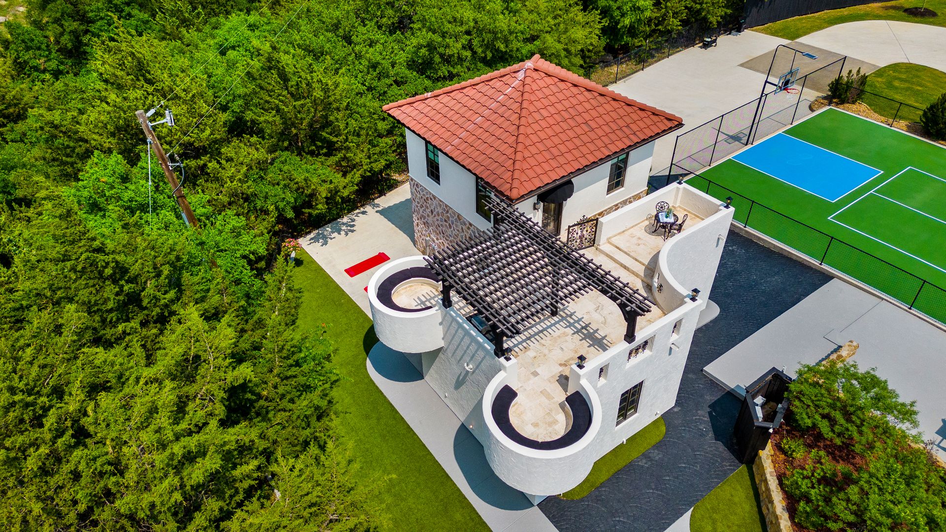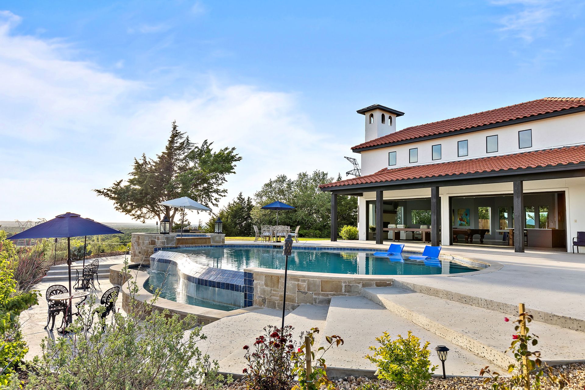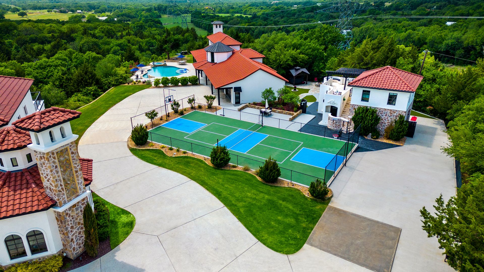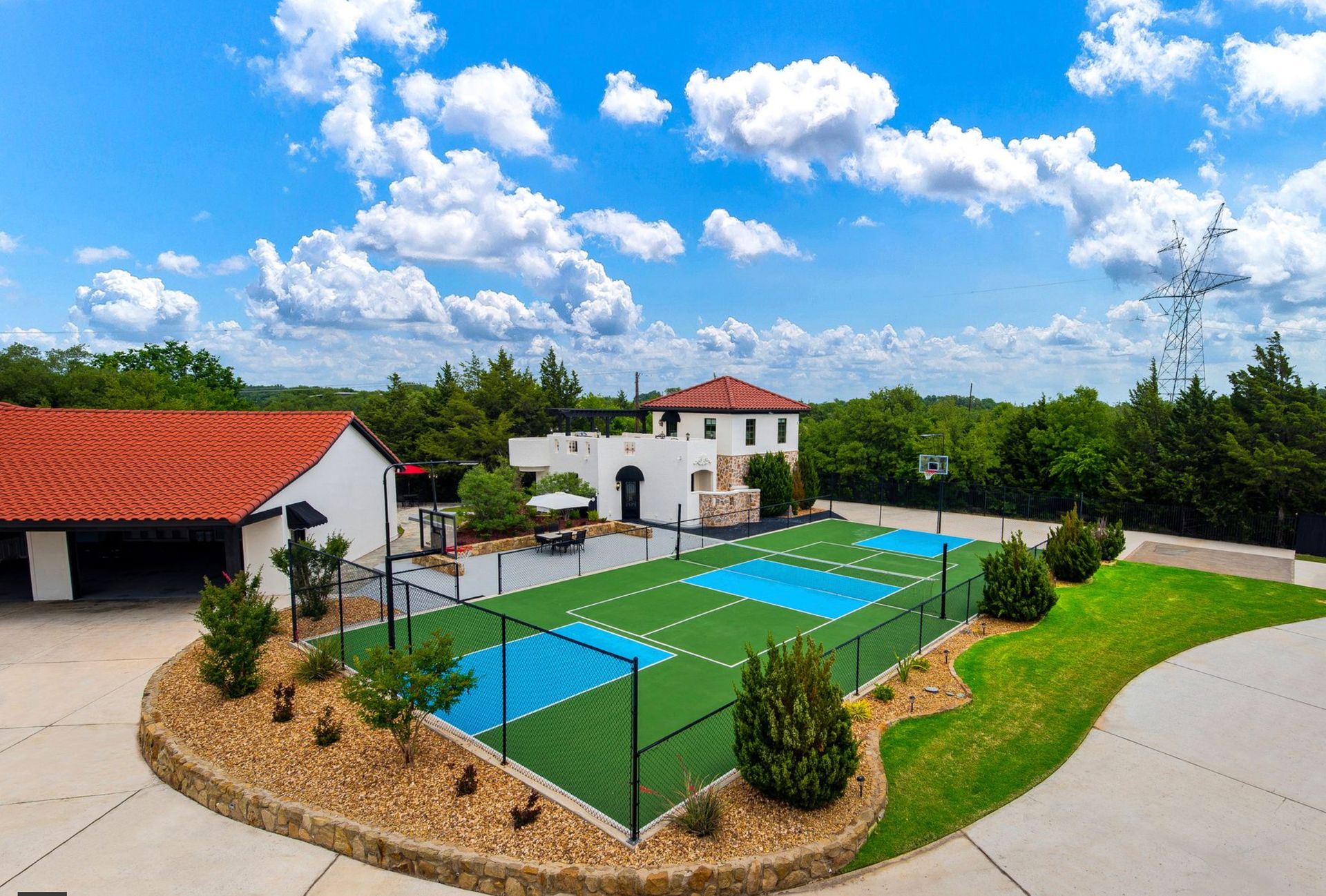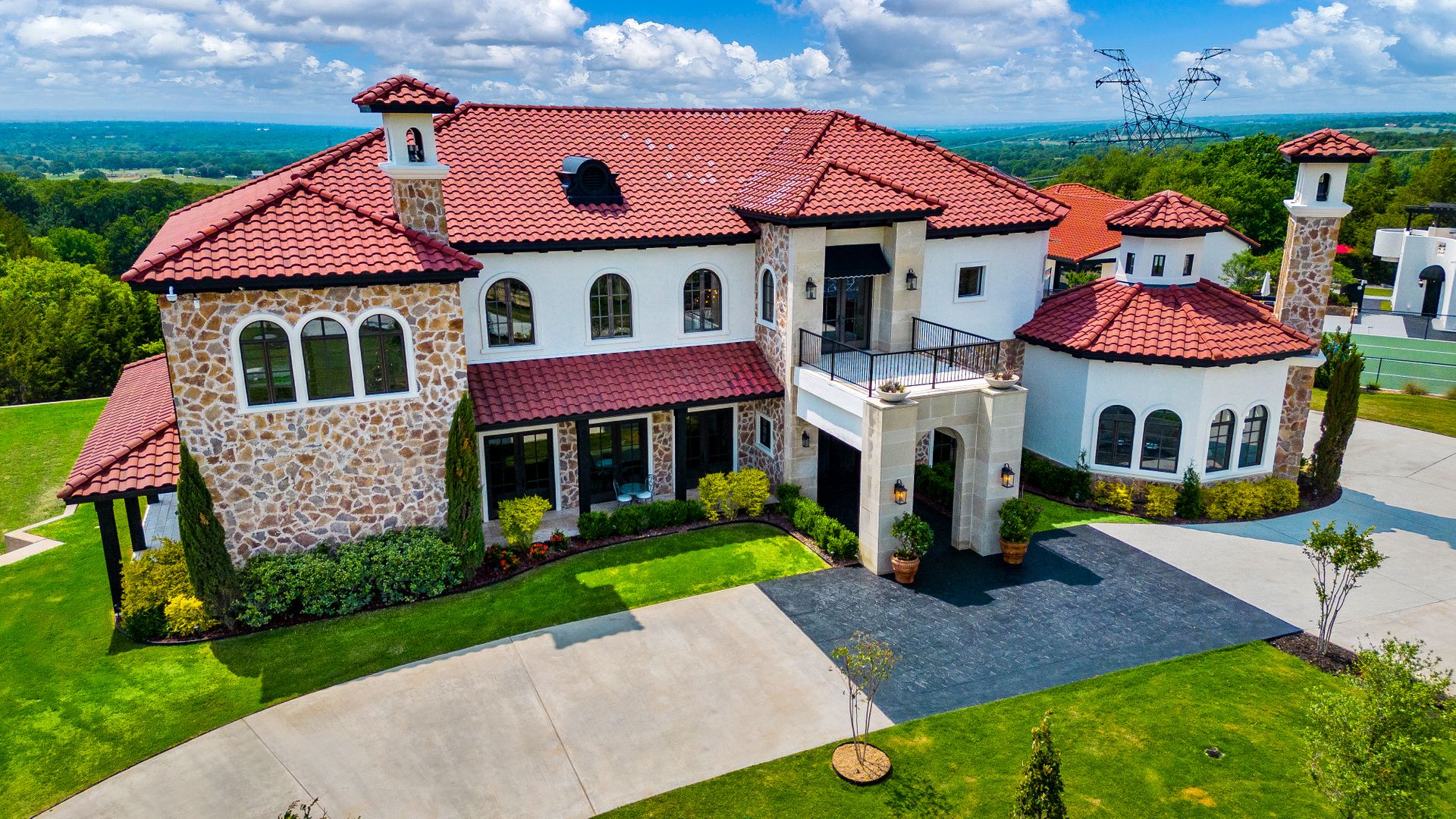 Welcome to La Casa de Fe! This magnificent estate located in the charming city of Decatur, TX. This sprawling property spans an impressive 25 acres, offering an abundance of luxurious amenities and the most breathtaking views you will find in North Texas. This beautiful property presents an incredible opportunity to embrace a serene lifestyle while being conveniently close to urban amenities. The enchanting main house known as "The Spanish Castle" exudes a touch of Old-World charm and elegance, transporting you to a realm of architectural beauty and timeless sophistication. With it's distinctive Spanish-inspired design, this residence offers a truly unique living experience with 5 bedrooms, 8 baths, multiple living and dining areas, cinema room, executive office, resort sized balcony, and resort sized veranda with outdoor commercial grade kitchen and wine bar. The Spanish-style mansion has tastefully appointed interior features such as reclaimed redwood floors, elegant light fixtures, imported tile, and a spectacular view from almost every room. The 3,000-square foot entertainer's dream pool house is flooded with natural light through the custom glass garage doors that open to a resort-style pool with a 32-foot infinity edge and spa area made for relaxing. The pool house also has 2 bedrooms, a loft, and 1 and a half baths, and a 4-car garage with more custom glass doors. The fully equipped Parisian guest villa known as "A Walk in Paris" is ideal for hosting guests in a cozy and intimate space. It will leave your guests feeling like they are on vacation. You will also find a secluded area featuring a putting green, fire pit, and pergola covered custom hot tub. Fitness enthusiasts will appreciate the on-site fitness center, equipped with complete home gym, kitchen, laundry, and half bath. Stay active and maintain a healthy lifestyle day or night on the sports court featuring pickleball, tennis and basketball. Other property amenities include a Helipad situated next to a large hanger or barn ideal for storing helicopters, boats, RVs, or horses. A driving range, hen house, solar farm that produces 74,250 kilowatts of power - the ultimate in energy efficiency, pastures, deck with comfy couch to have a front row seat each day for sunset, multiple outdoor entertaining areas, and a high-flying Texas flag round out this beautiful home. Don't miss the chance to experience the epitome of refined TEXAS living in this exceptional estate!