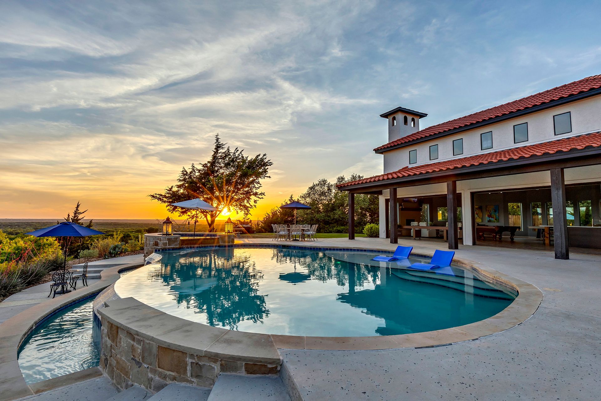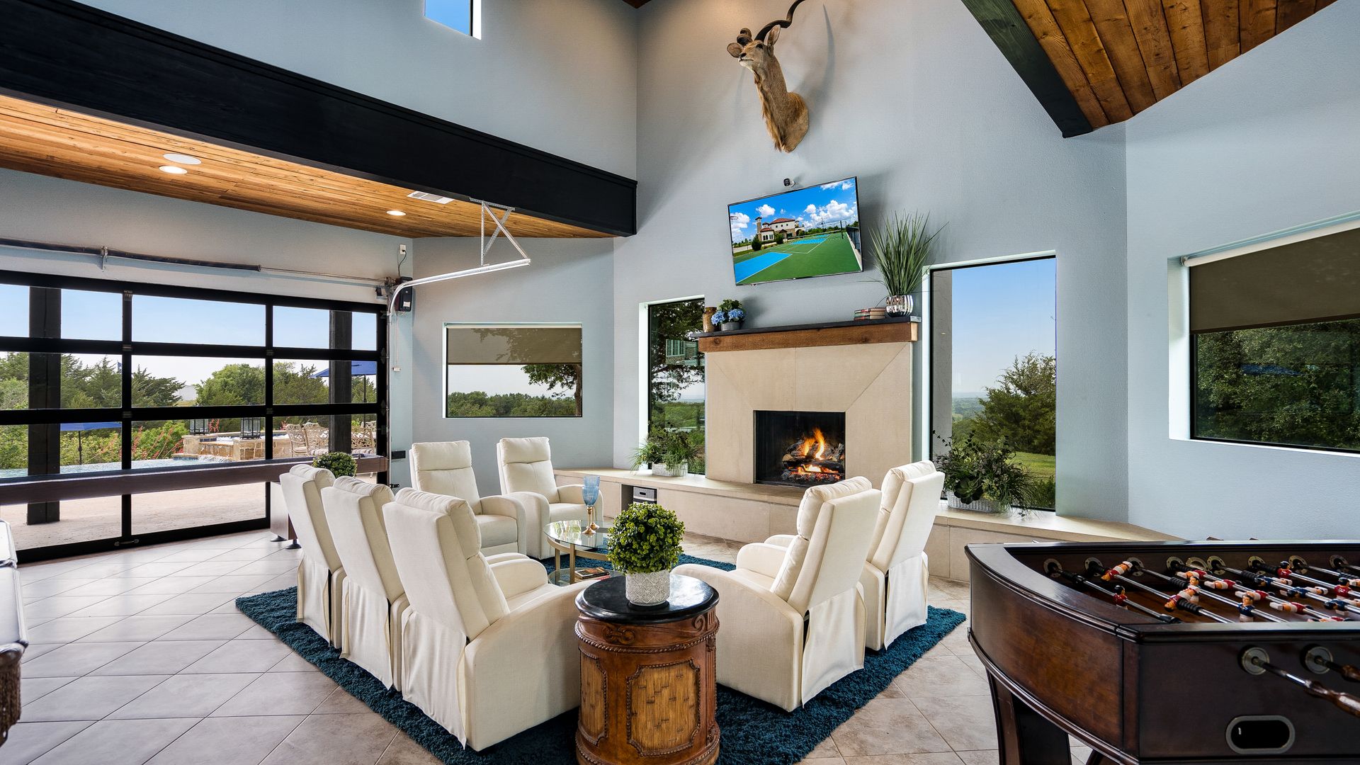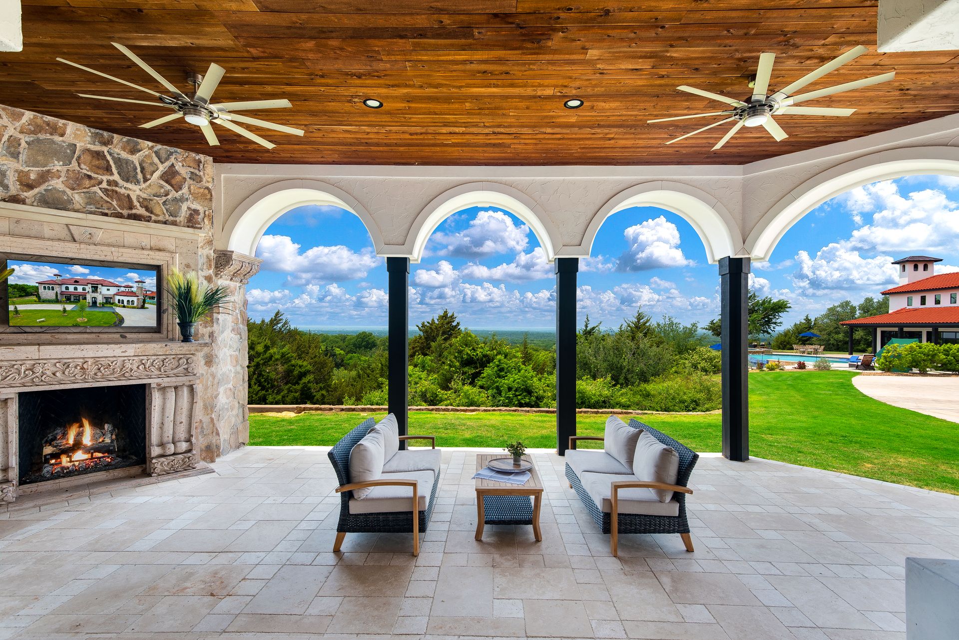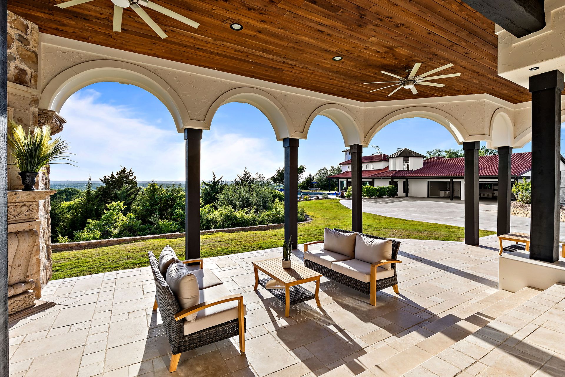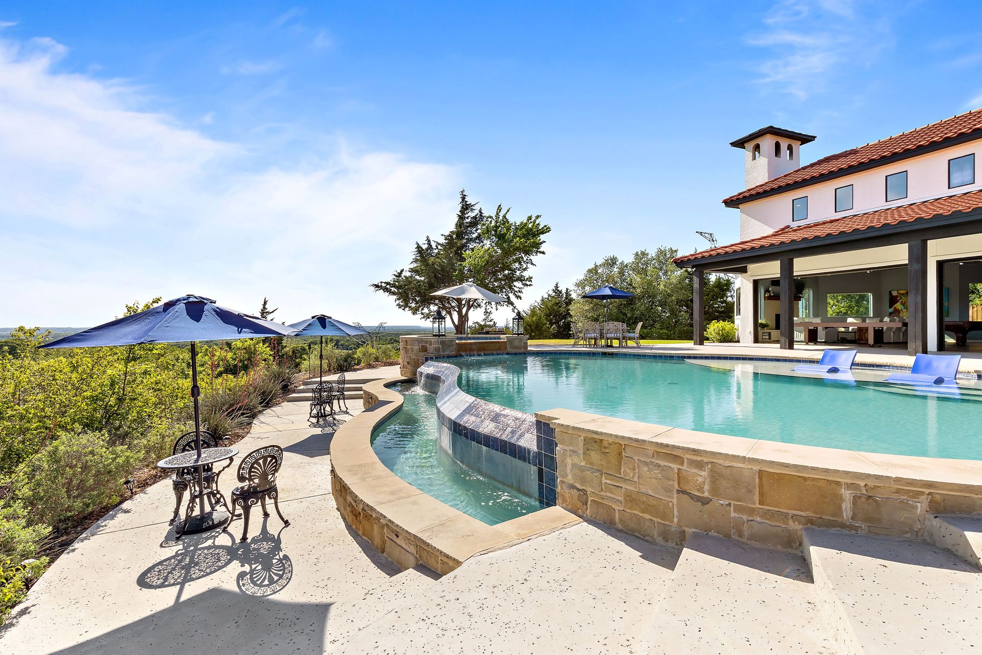 Welcome to La Casa de Fe! This magnificent estate located in the charming city of Decatur, TX. This sprawling property spans an impressive 25 acres, offering an abundance of luxurious amenities and the most breathtaking views you will find in North Texas. This beautiful property presents an incredible opportunity to embrace a serene lifestyle while being conveniently close to urban amenities. The enchanting main house known as "The Spanish Castle" exudes a touch of Old-World charm and elegance, transporting you to a realm of architectural beauty and timeless sophistication. With it's distinctive Spanish-inspired design, this residence offers a truly unique living experience with 5 bedrooms, 8 baths, multiple living and dining areas, cinema room, executive office, resort sized balcony, and resort sized veranda with outdoor commercial grade kitchen and wine bar. The Spanish-style mansion has tastefully appointed interior features such as reclaimed redwood floors, elegant light fixtures, imported tile, and a spectacular view from almost every room. The 3,000-square foot entertainer's dream pool house is flooded with natural light through the custom glass garage doors that open to a resort-style pool with a 32-foot infinity edge and spa area made for relaxing. The pool house also has 2 bedrooms, a loft, and 1 and a half baths, and a 4-car garage with more custom glass doors. The fully equipped Parisian guest villa known as "A Walk in Paris" is ideal for hosting guests in a cozy and intimate space. It will leave your guests feeling like they are on vacation. You will also find a secluded area featuring a putting green, fire pit, and pergola covered custom hot tub. Fitness enthusiasts will appreciate the on-site fitness center, equipped with complete home gym, kitchen, laundry, and half bath. Stay active and maintain a healthy lifestyle day or night on the sports court featuring pickleball, tennis and basketball. Other property amenities include a Helipad situated next to a large hanger or barn ideal for storing helicopters, boats, RVs, or horses. A driving range, hen house, solar farm that produces 74,250 kilowatts of power - the ultimate in energy efficiency, pastures, deck with comfy couch to have a front row seat each day for sunset, multiple outdoor entertaining areas, and a high-flying Texas flag round out this beautiful home. Don't miss the chance to experience the epitome of refined TEXAS living in this exceptional estate!