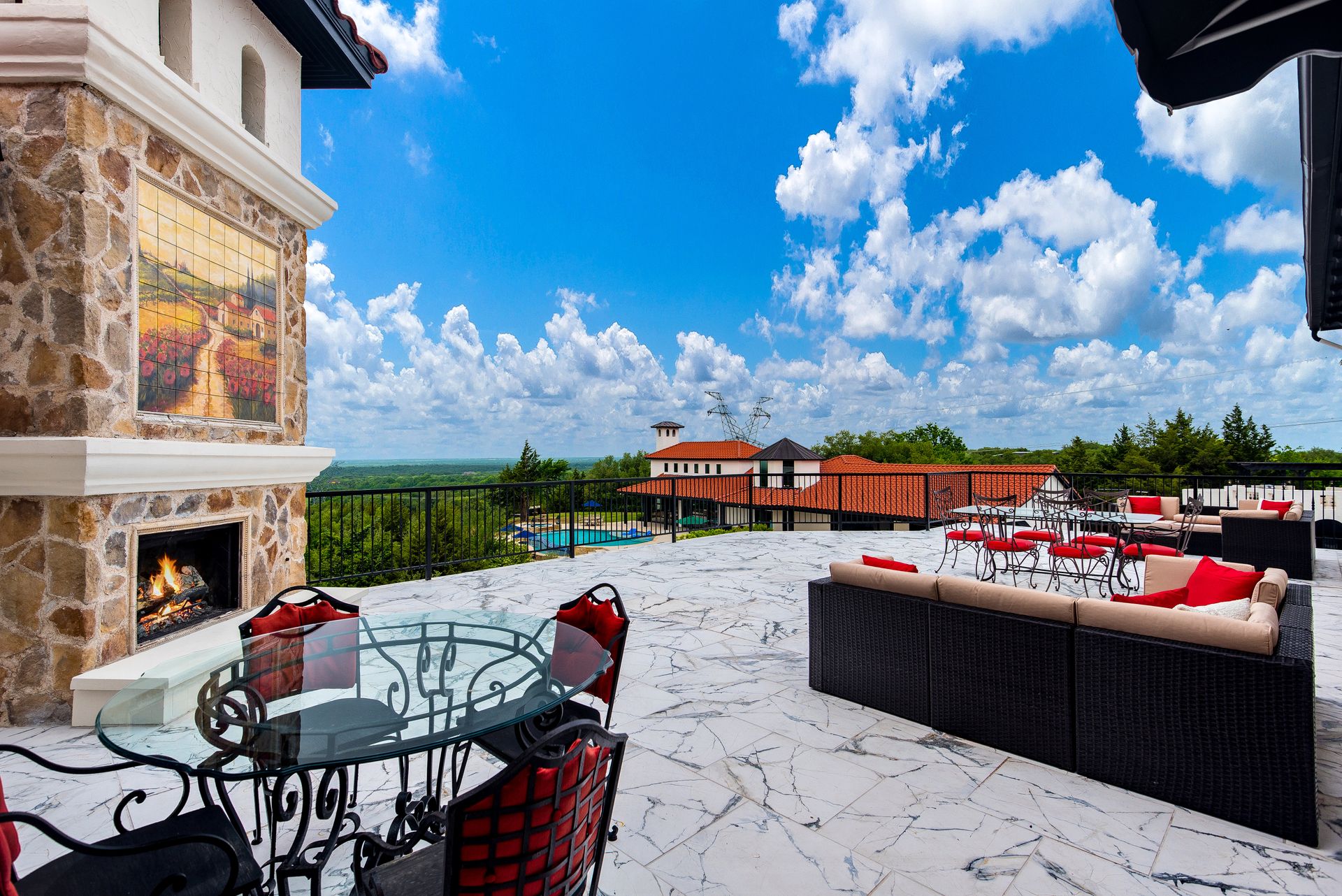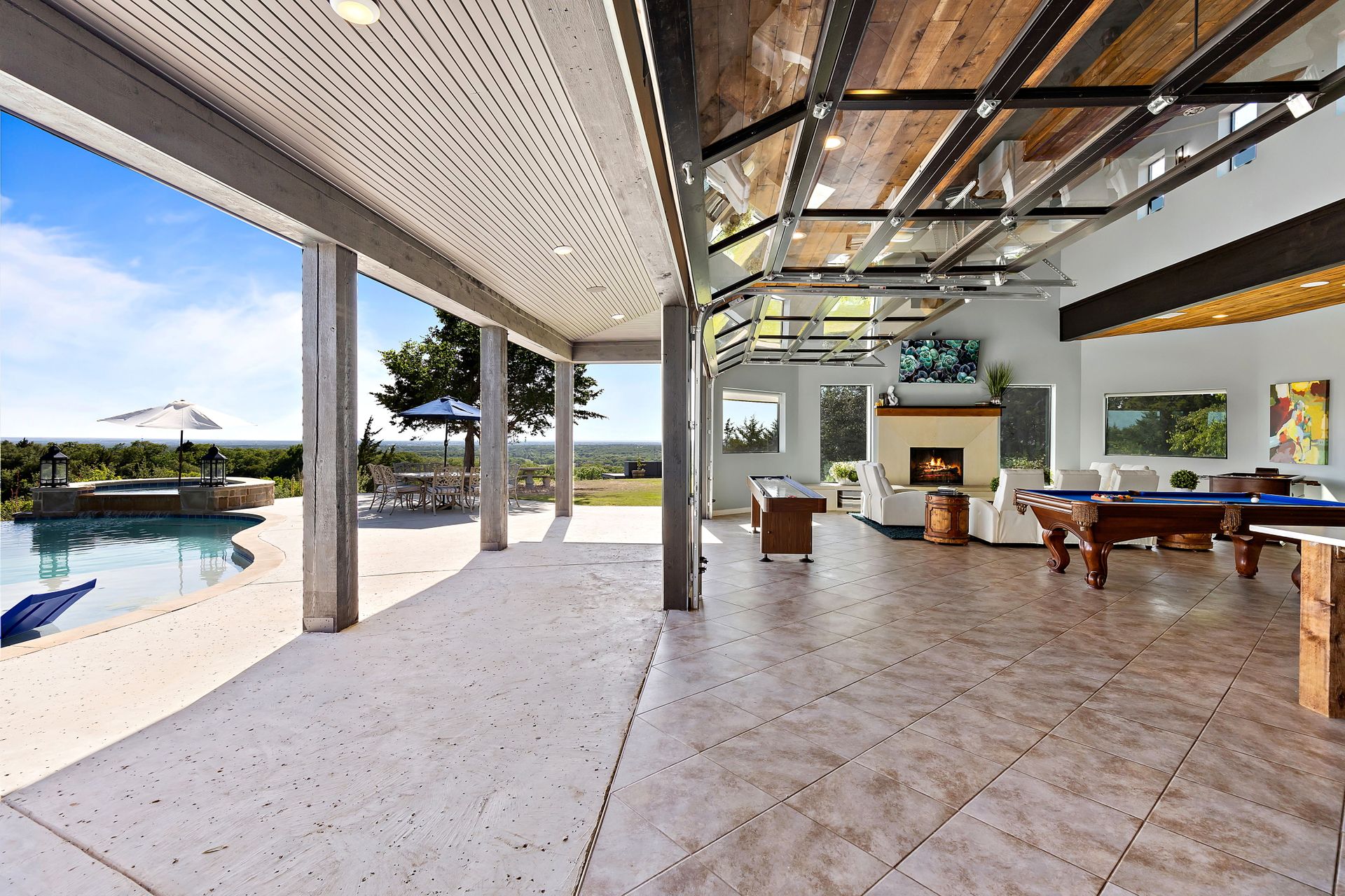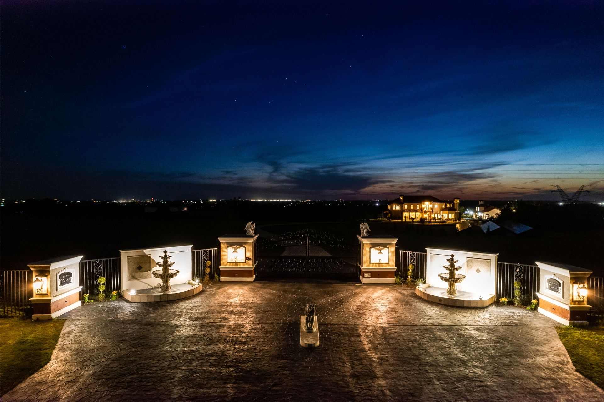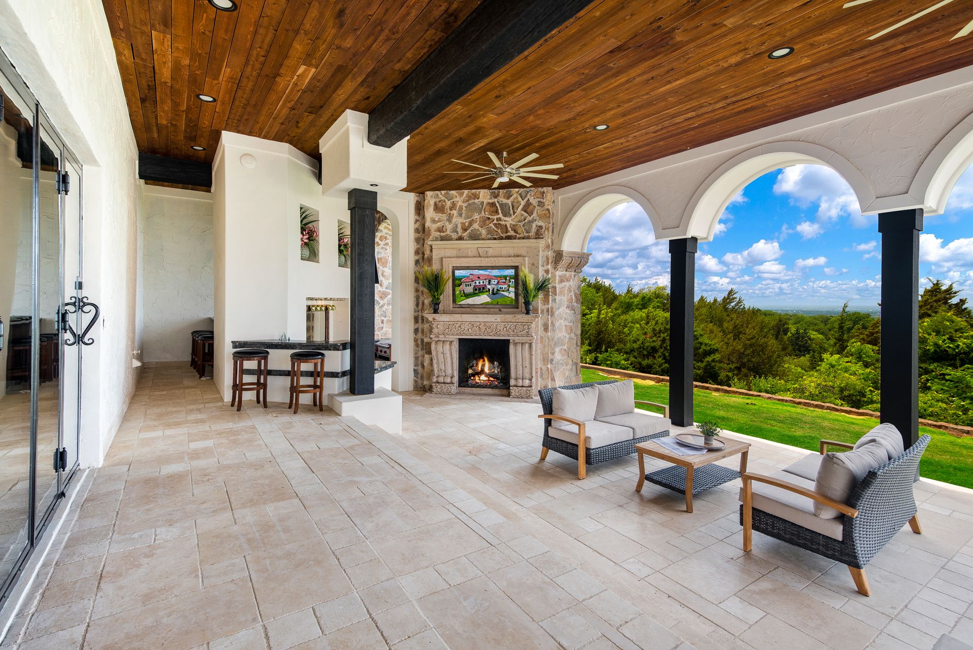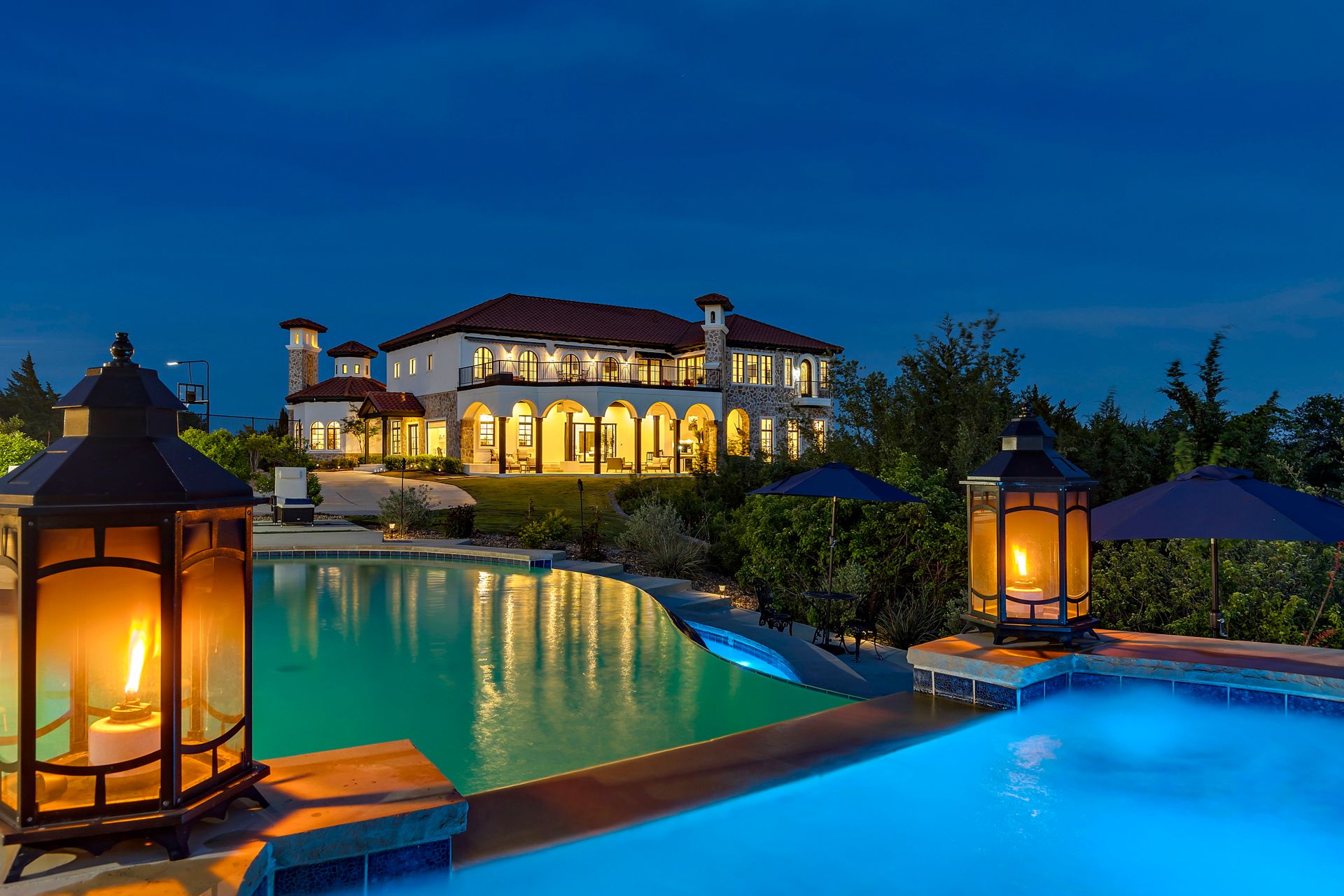 Welcome to La Casa de Fe! This magnificent estate located in the charming city of Decatur, TX. This sprawling property spans an impressive 25 acres, offering an abundance of luxurious amenities and the most breathtaking views you will find in North Texas. This beautiful property presents an incredible opportunity to embrace a serene lifestyle while being conveniently close to urban amenities. The enchanting main house known as "The Spanish Castle" exudes a touch of Old-World charm and elegance, transporting you to a realm of architectural beauty and timeless sophistication. With it's distinctive Spanish-inspired design, this residence offers a truly unique living experience with 5 bedrooms, 8 baths, multiple living and dining areas, cinema room, executive office, resort sized balcony, and resort sized veranda with outdoor commercial grade kitchen and wine bar. The Spanish-style mansion has tastefully appointed interior features such as reclaimed redwood floors, elegant light fixtures, imported tile, and a spectacular view from almost every room. The 3,000-square foot entertainer's dream pool house is flooded with natural light through the custom glass garage doors that open to a resort-style pool with a 32-foot infinity edge and spa area made for relaxing. The pool house also has 2 bedrooms, a loft, and 1 and a half baths, and a 4-car garage with more custom glass doors. The fully equipped Parisian guest villa known as "A Walk in Paris" is ideal for hosting guests in a cozy and intimate space. It will leave your guests feeling like they are on vacation. You will also find a secluded area featuring a putting green, fire pit, and pergola covered custom hot tub. Fitness enthusiasts will appreciate the on-site fitness center, equipped with complete home gym, kitchen, laundry, and half bath. Stay active and maintain a healthy lifestyle day or night on the sports court featuring pickleball, tennis and basketball. Other property amenities include a Helipad situated next to a large hanger or barn ideal for storing helicopters, boats, RVs, or horses. A driving range, hen house, solar farm that produces 74,250 kilowatts of power - the ultimate in energy efficiency, pastures, deck with comfy couch to have a front row seat each day for sunset, multiple outdoor entertaining areas, and a high-flying Texas flag round out this beautiful home. Don't miss the chance to experience the epitome of refined TEXAS living in this exceptional estate!